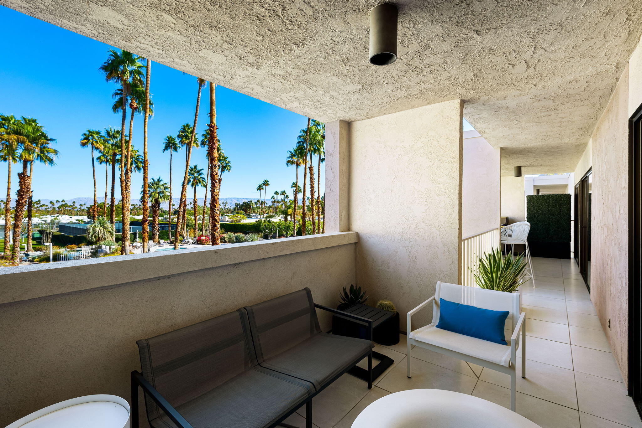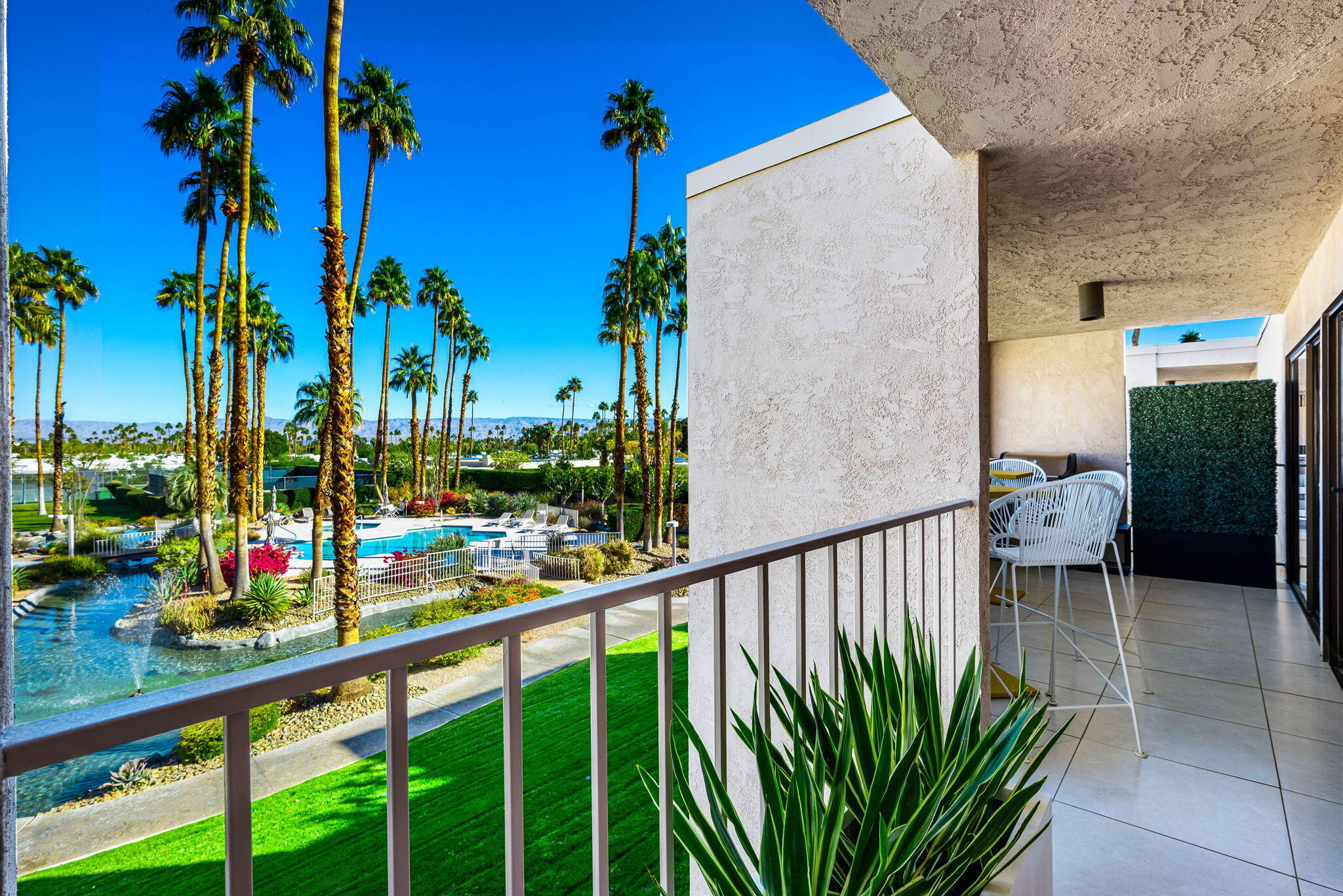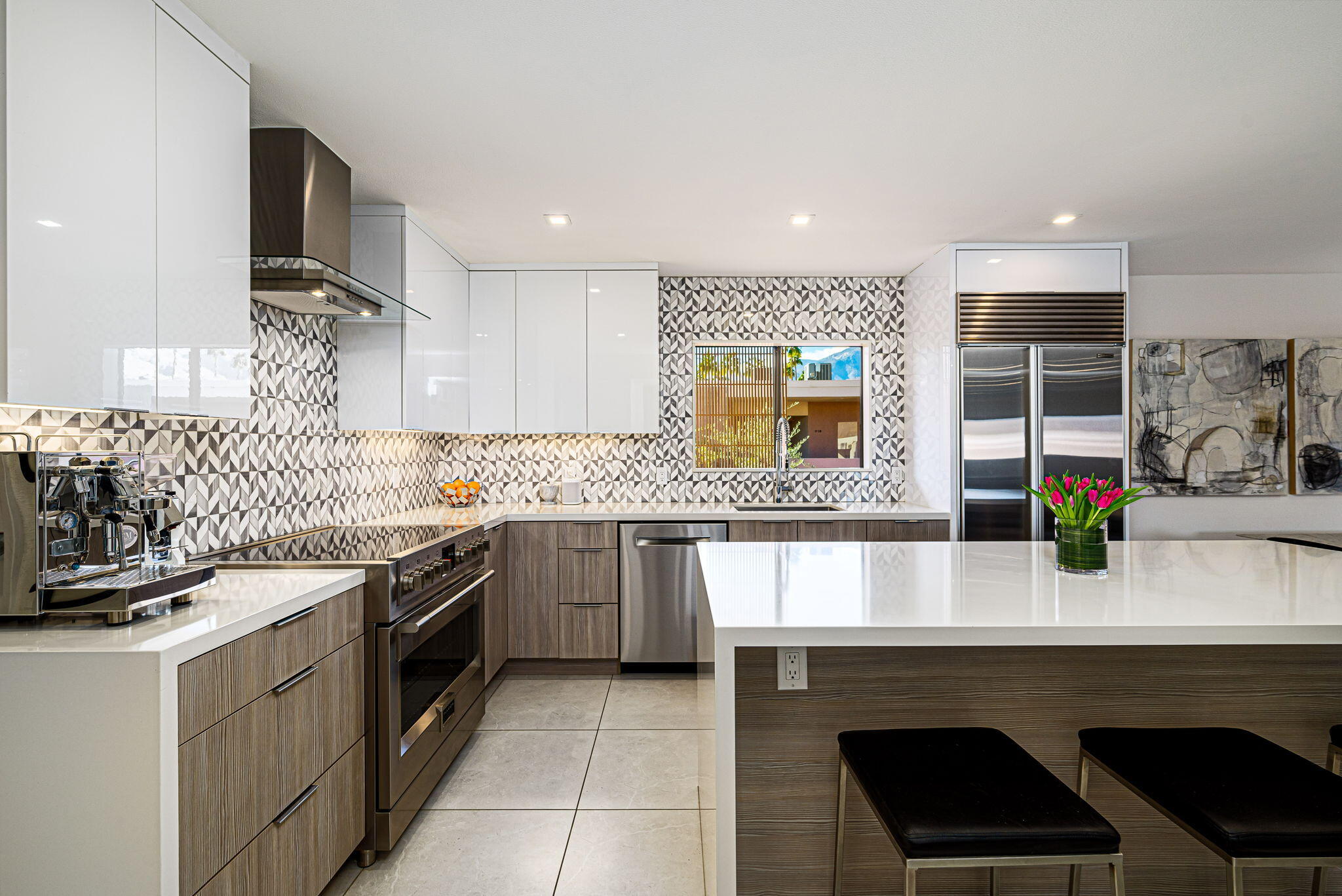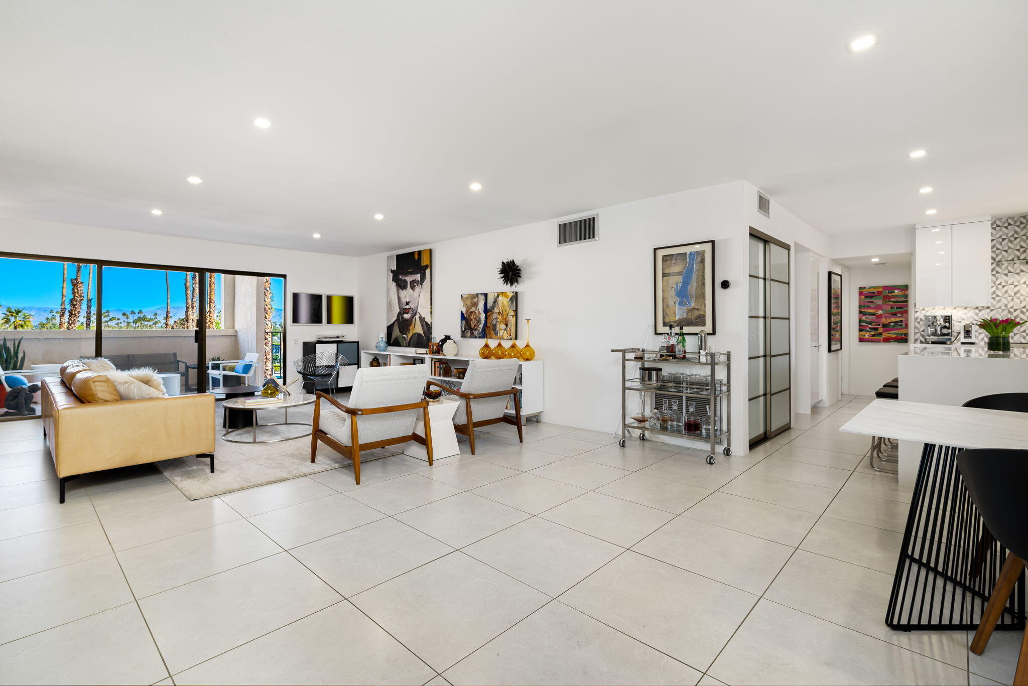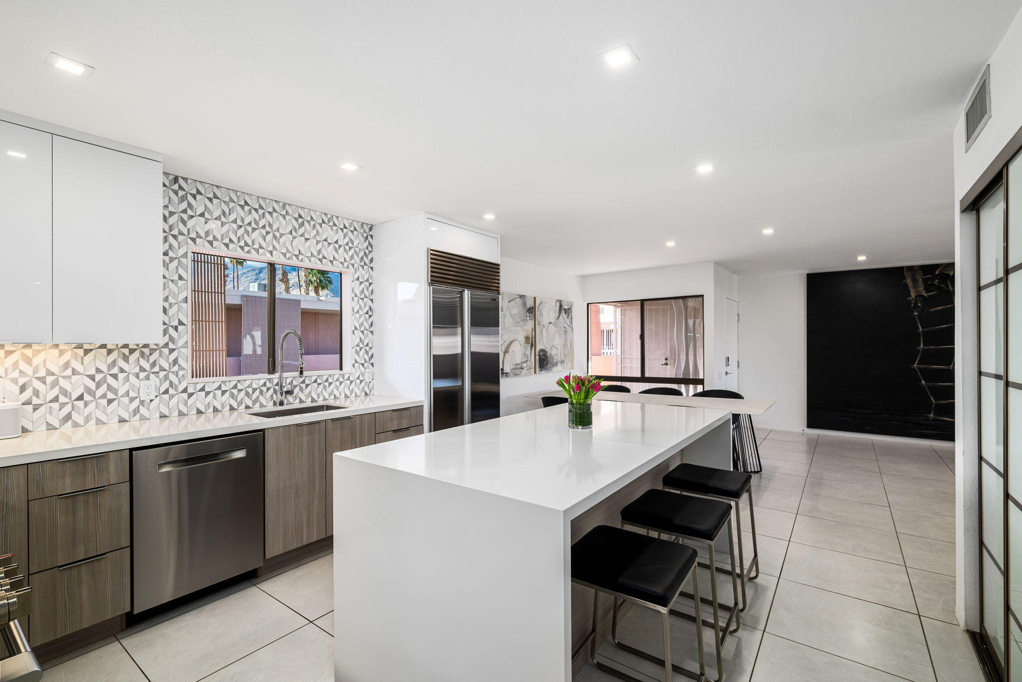 You're gonna love this spectacular mid-century residence. This top-floor unit is extensively remodeled, bringing out the best in modern design. Architect Donald Wexler's talents shine in this historic hidden gem, the Twin Springs community. Feel the clean lines and sleek design from top to bottom. A spacious living room extends onto the large patio area. A chef's ideal space is created in this kitchen with high-gloss cabinetry, full-slab quartz countertops, an oversized island with a microwave drawer and wine/beverage center, Sub-Zero built-in refrigerator, Bosch and Fulgor-Milano appliances and a separate pantry. Large primary suite with custom-built-ins, a walk-in and wardrobe closet, a spa-like bath with a walk-in shower, and a jetted free-standing tub. Additional bedroom, a dedicated office space, and a second full bath. Renovations include imported 24x24 inch porcelain tile floor throughout (with installed sound barrier), custom lighting, Lennox HVAC system, new duct work, and new water heater. Meticulously maintained gated community offers a clubhouse with pool table, sauna, fitness and recreation area, two sparkling pools and spas, tennis/pickleball courts, assigned covered parking, and private storage unit. Featured on the 2025 Modernism Week Home Tour.Interested in this Listing?