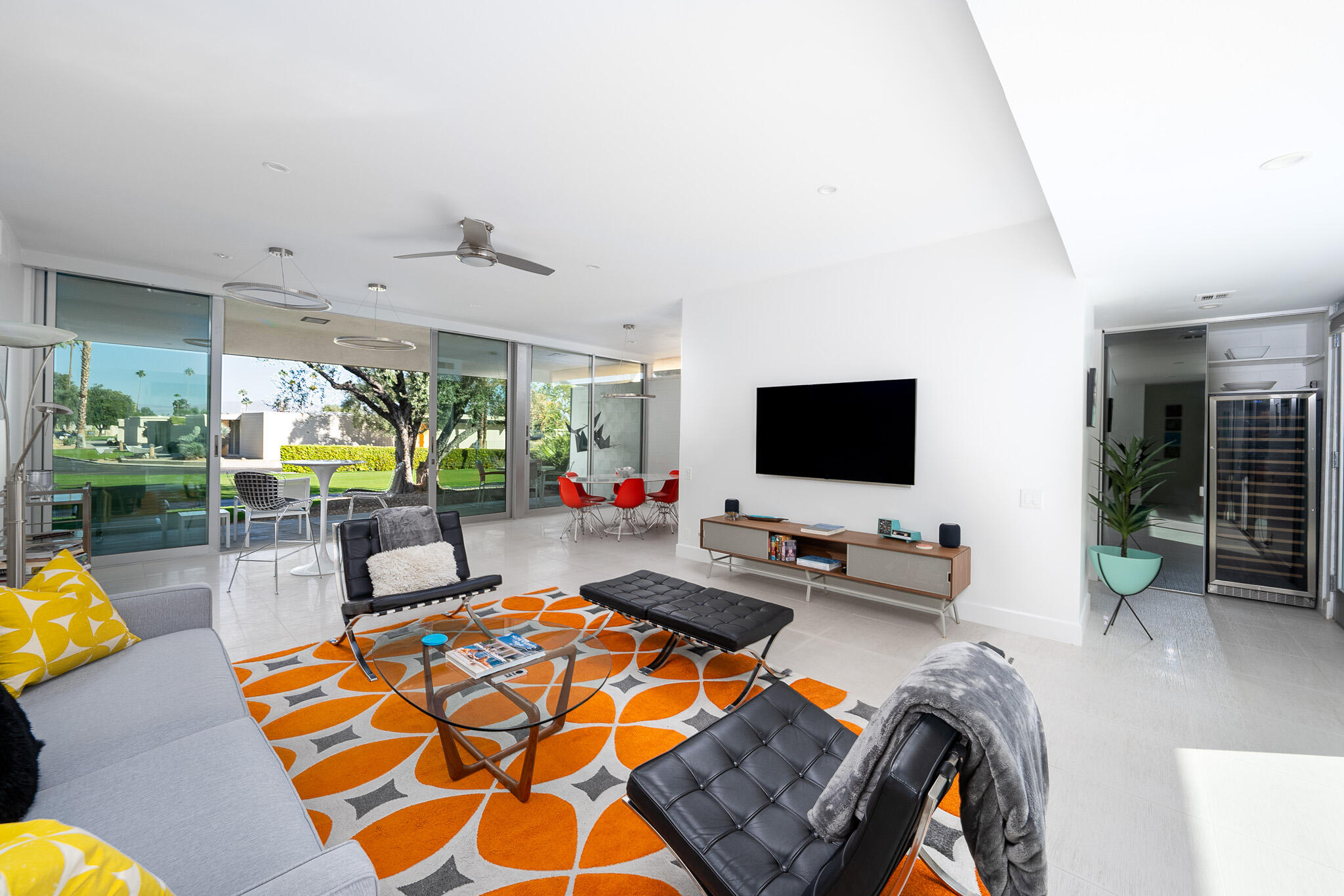 STUNNING VIEWS at the Seven Lakes Golf and Country Club in South Palm Springs await you! This renovated 2 bedroom / 2 bath home features 1,545 sq ft of living space and is positioned along a quiet setting, on the 9th TEE of the Ted Robinson-designed golf course. From the courtyard, favor expansive mountain views from all directions, as well as, the Bob Hope estate. You will also enjoy lakeside and fountain views from the living room. This home has been professionally renovated with ceramic tile flooring throughout. The remodeled kitchen boasts walnut cabinetry, quartz counters, stainless steel appliances. Adjacent to the kitchen, there is a wine cooler for all your entertaining needs. The thoughtfully designed bathrooms are lined with fresh white tile, mosaic accents, along with new cabinetry, sinks and faucets, etc. Newly installed double-panel sliding doors throughout keep the inside temperatures comfortable during summer months. Electric shades and blackout shades in the bedrooms, make it even easier to stay cool in the desert. Known as ''The Gem of the Desert,'' Seven Lakes is a 24/7 guard gated community. Unwind at one of the nearby 15 community pools/spas.Interested in this Listing?