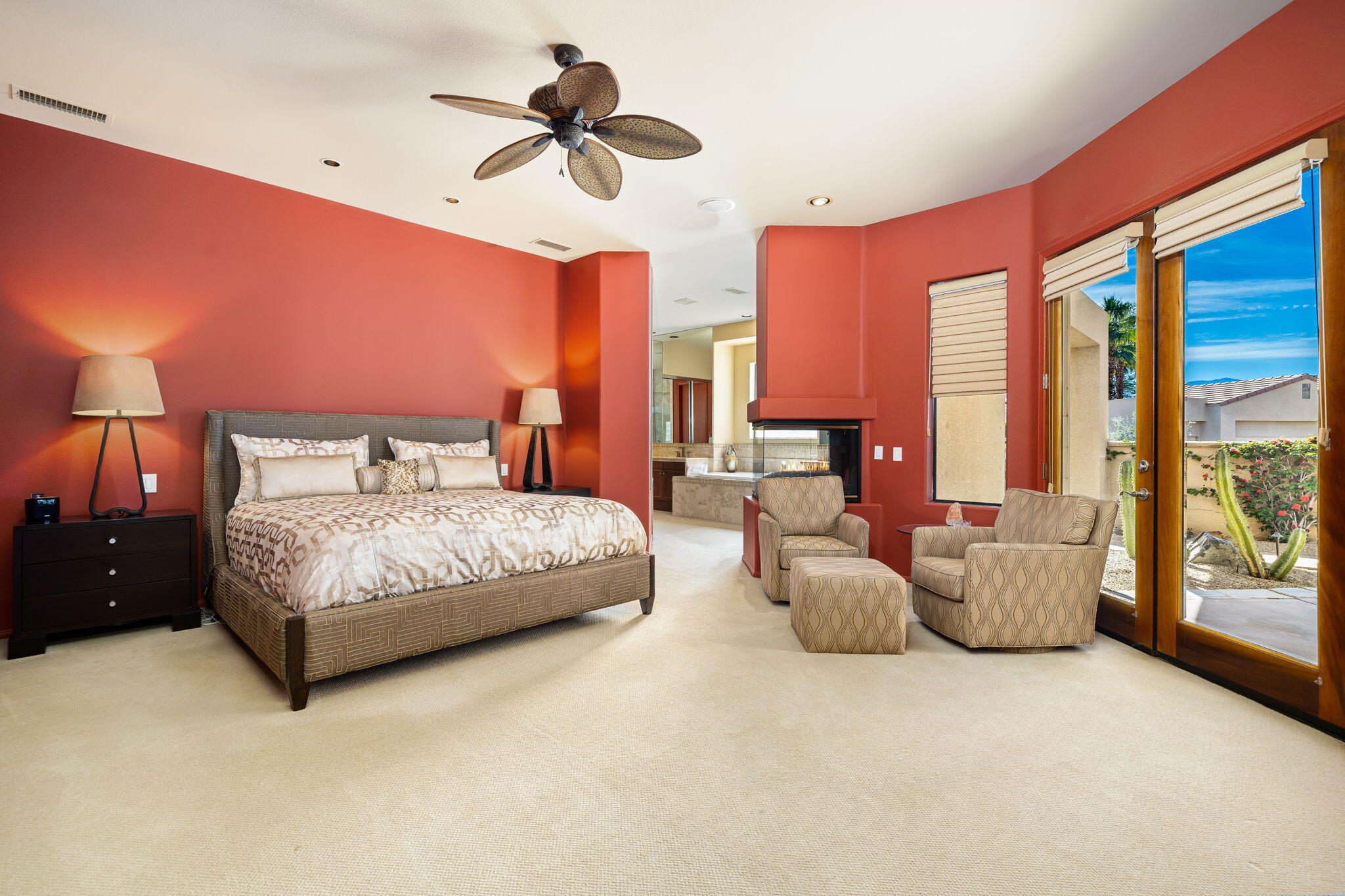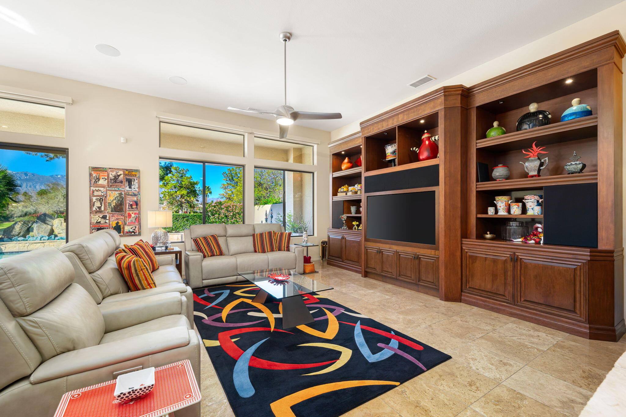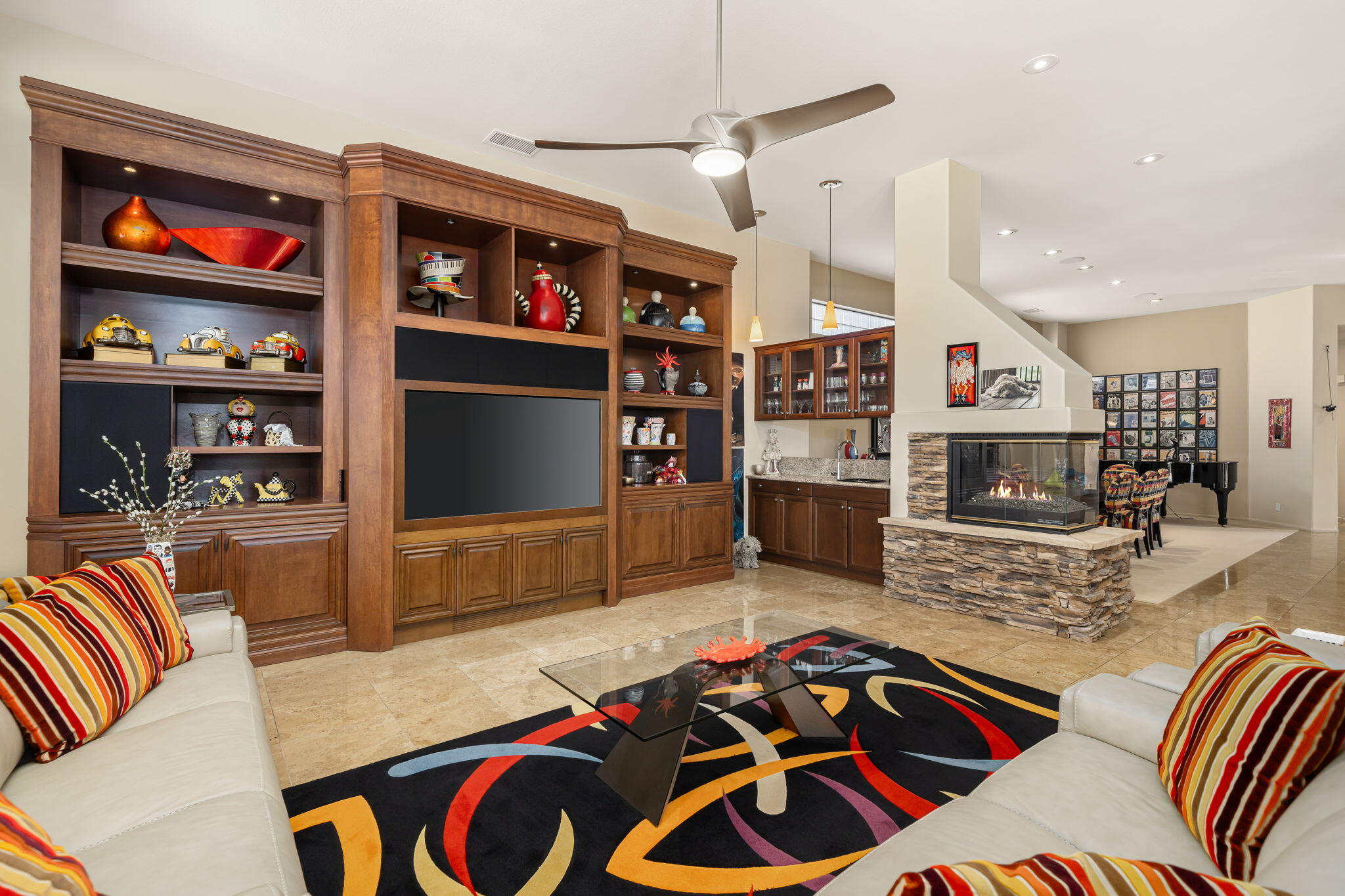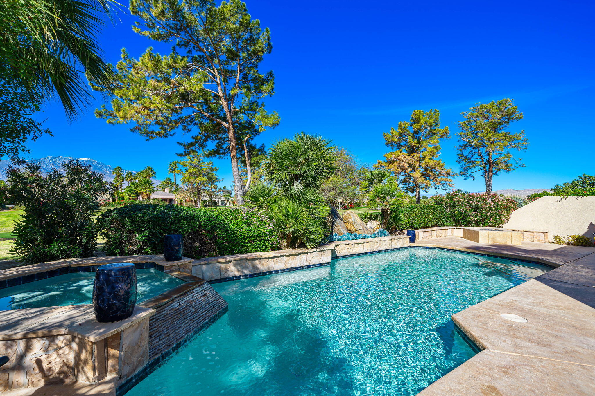 Located on a premium west-facing lot with beautiful mountain views on the 13th tee of the Pete Dye course, this home is loaded with upgrades and lovingly maintained. Sit on the patio and enjoy the Pebble Tec salt water pool with stacked stone spillway with an elevated spa. Turn on the fire pit for evening gatherings with crystals lighting the perimeter or utilize the chef's outdoor cooking area adjacent to the covered patio. Inside, the gourmet kitchen includes a Viking cooktop, Sub-zero refrigerator, wine cooler, center island and elegant dark cherry cabinets. The triple sided glass fireplace separates the living room and great room with built-in entertainment center and high tech sound system. Both kitchen and great room feature electric shades for easy adjusting of the sunshine that radiates the room. The primary suite, with ample room and walk in closet includes a fireplace, to warm you at night or while you enjoy time in the jacuzzi tub. The guest suite has its own outdoor patio and ensuite bath. The third ensuite bedroom is being used as an office with built-in desk and work area. Other notable features are a new tankless water heater, entire home water filtration system, and Leased Solar for lower electric bills. One of the lowest HOA in Mission Hills which includes a social and fitness membership to the club. Call for your private showing.Interested in this Listing?