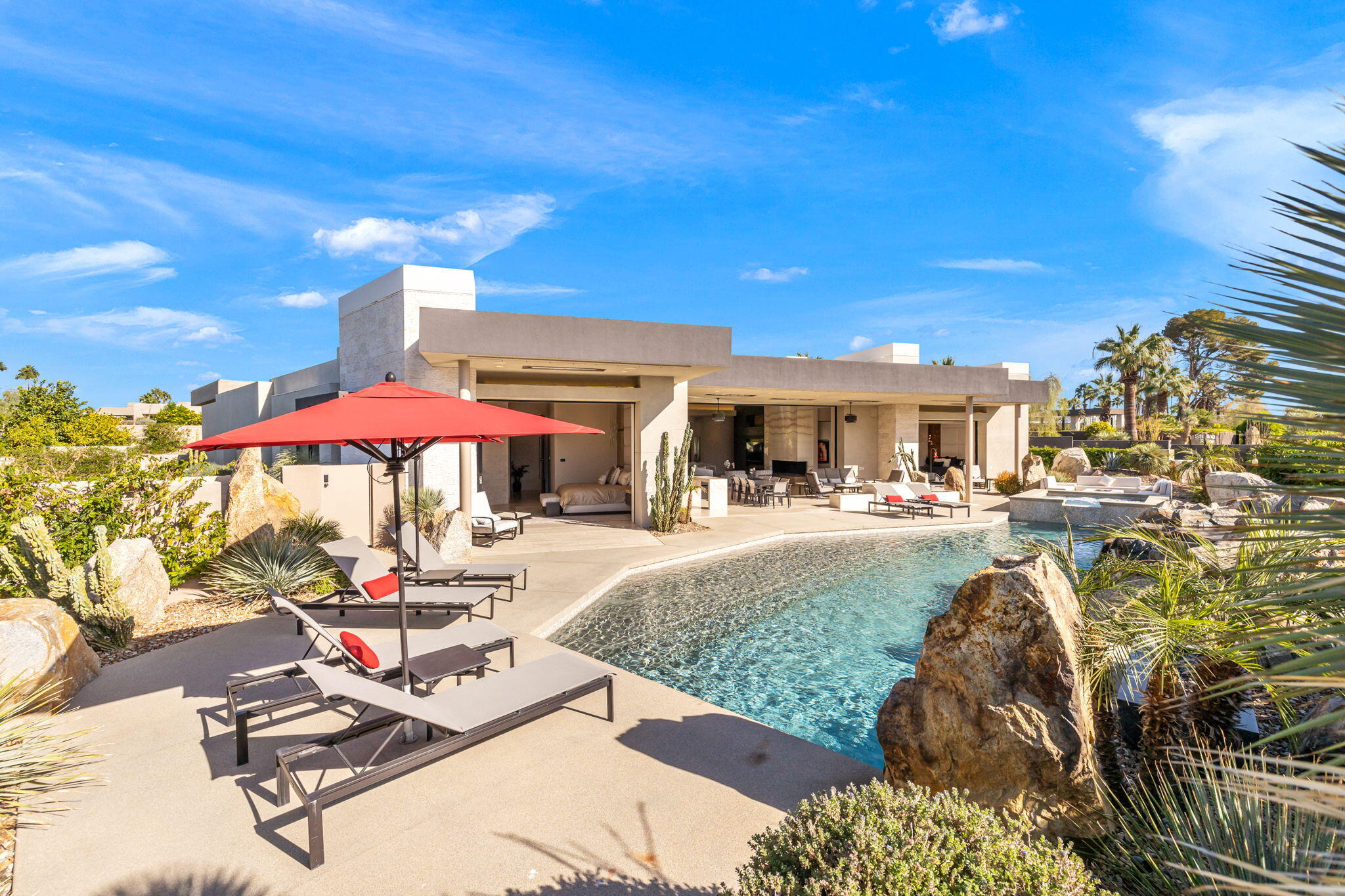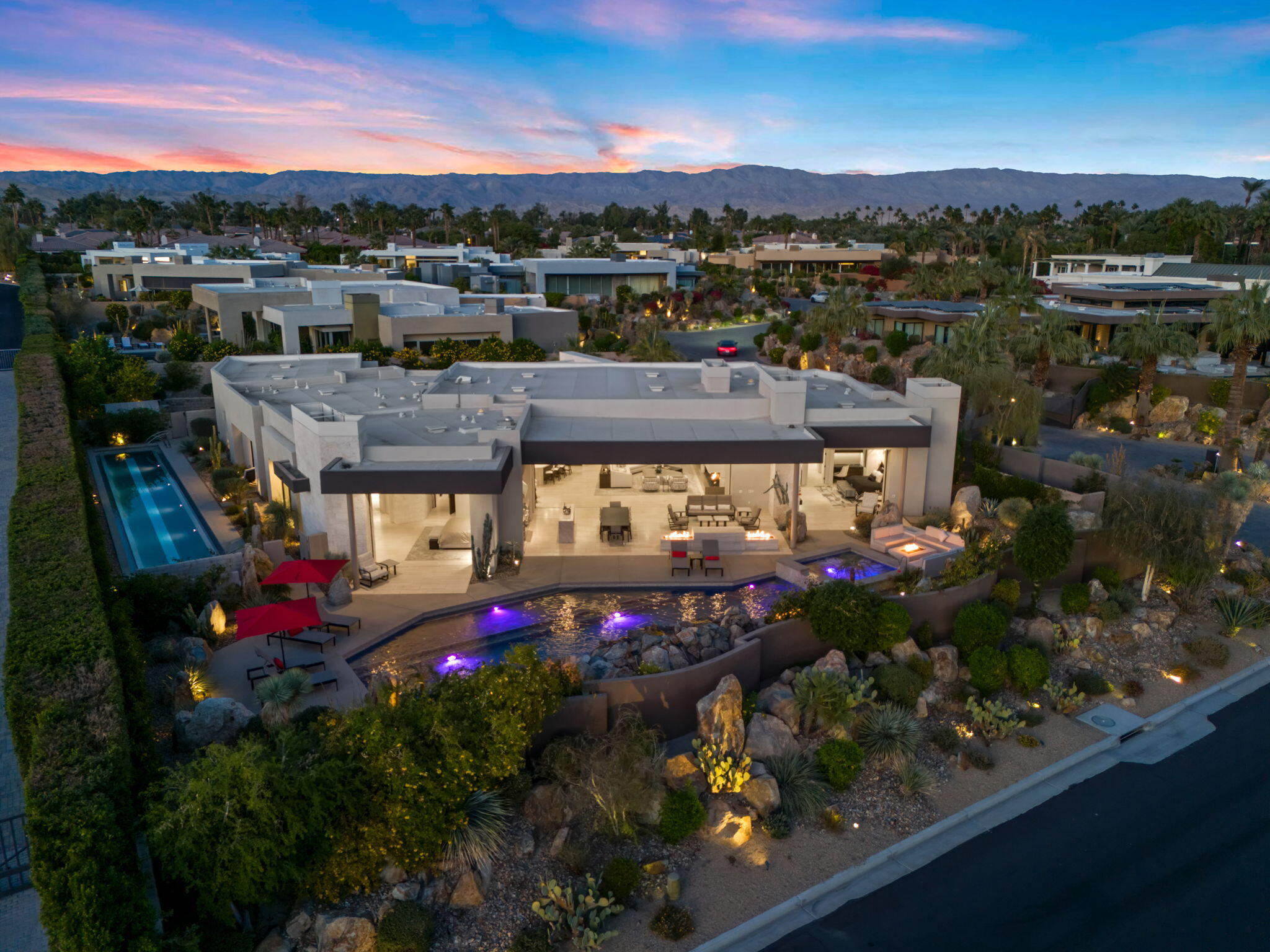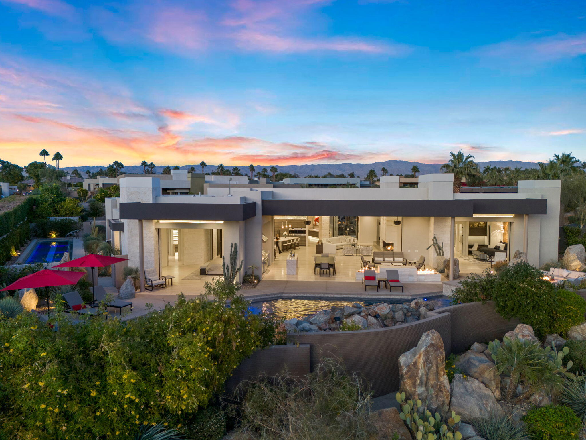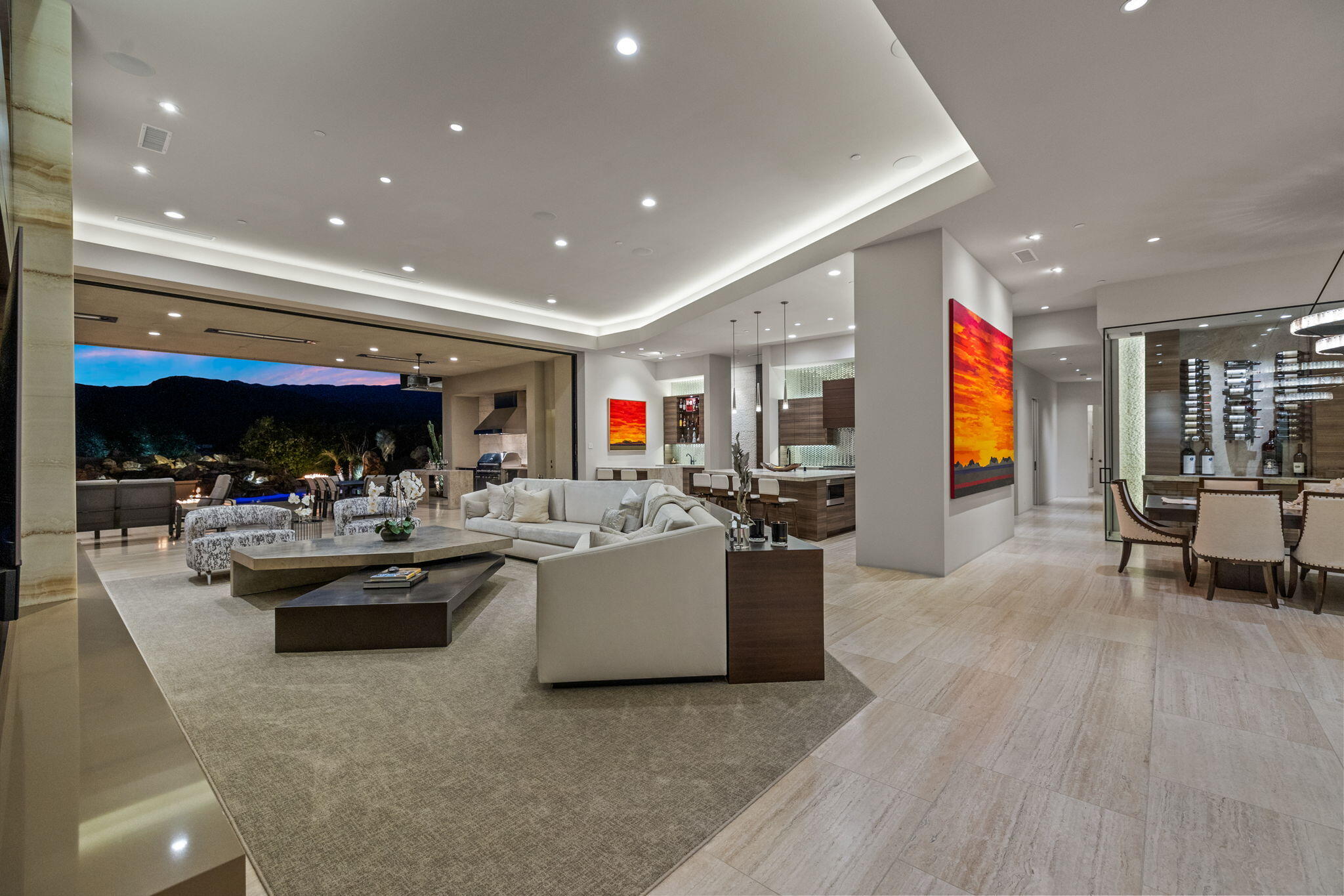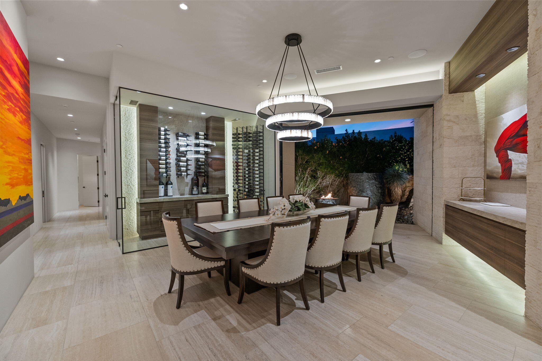 PRICE INCLUDES ALL custom made furniture, patio furniture and audio/video. STERLING RIDGE: Where Luxury Contemporary sophistication meets effortless indoor-outdoor living. This stunning residence offers ultimate privacy, breathtaking mountain views, and is surrounded by majestic boulders and lush landscaping. Just minutes from world-class golf, fine dining, shopping, and more, this home offers the perfect retreat with convenient access to all the best amenities. Designed for elegance and comfort, this meticulously maintained estate features five bedrooms, including two opulent primary suites. With high-end finishes and a Smart Home Crestron automation system, you can control fire & water features, motorized sliding doors, lighting, shades, and more with ease. The professional-grade kitchen is equipped with top-of-the-line Wolf, Sub-Zero, and Miele appliances. Adjacent to the kitchen is a full bar, and bordering the dining room is a glass-enclosed, climate-controlled wine room. The oversized 1,117 sq. ft. garage is outfitted with A/C and custom built-in cabinets. Experience the uninterrupted flow of resort living at the exterior, with an oversized spa, a statement pool with boulder waterfall, along with a private 25-meter lap pool. Whether lounging poolside or warming up by the fire features, every detail has been crafted for ultimate comfort. The covered patio is equipped with mist systems, recessed heaters, a pool bath, a 75' pop-up TV, and a 52' Kalamazoo BBQ station--making it ready for enjoyment all season long. Sterling Ridge Development, embraced environmental stewardship at conception with the use of drought tolerant plantings, boulder accent out-croppings and the use of permeable pavers, which has enabled low HOA fees of only $189/m. Don't miss this rare opportunity to own a private oasis in the heart of Rancho Mirage!Interested in this Listing?