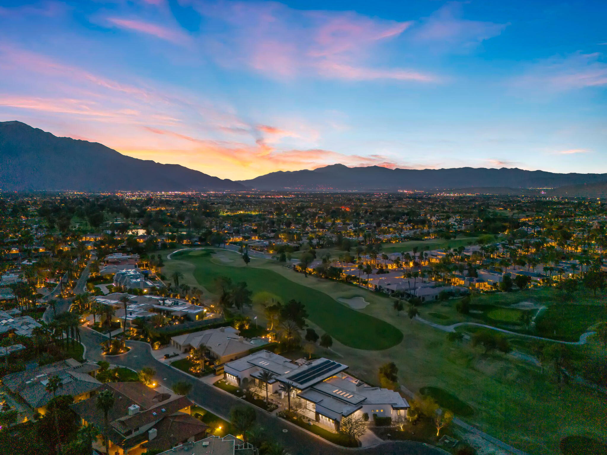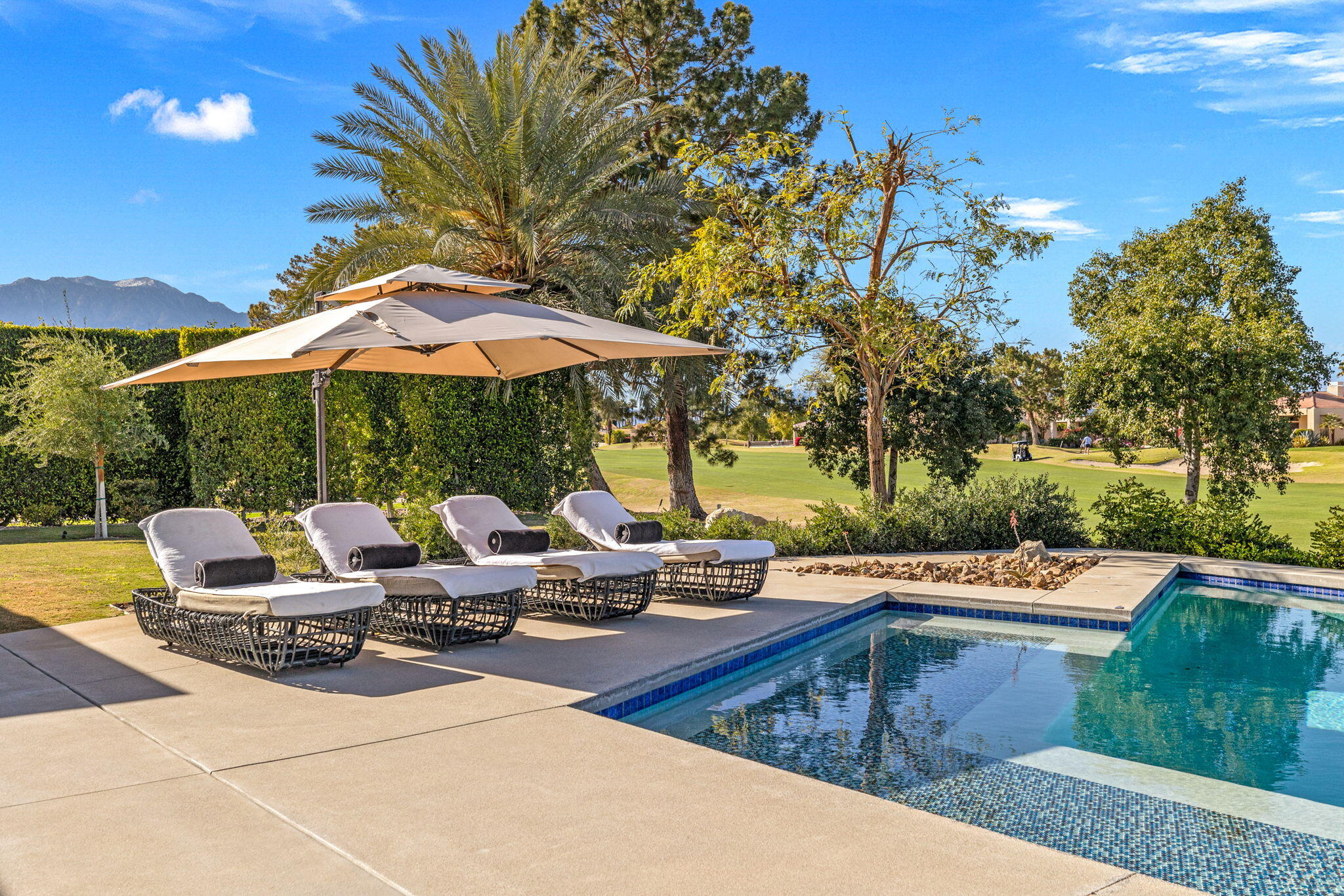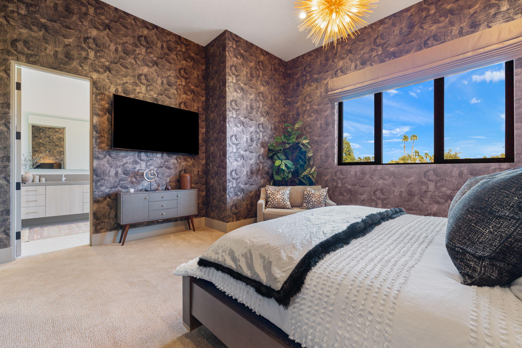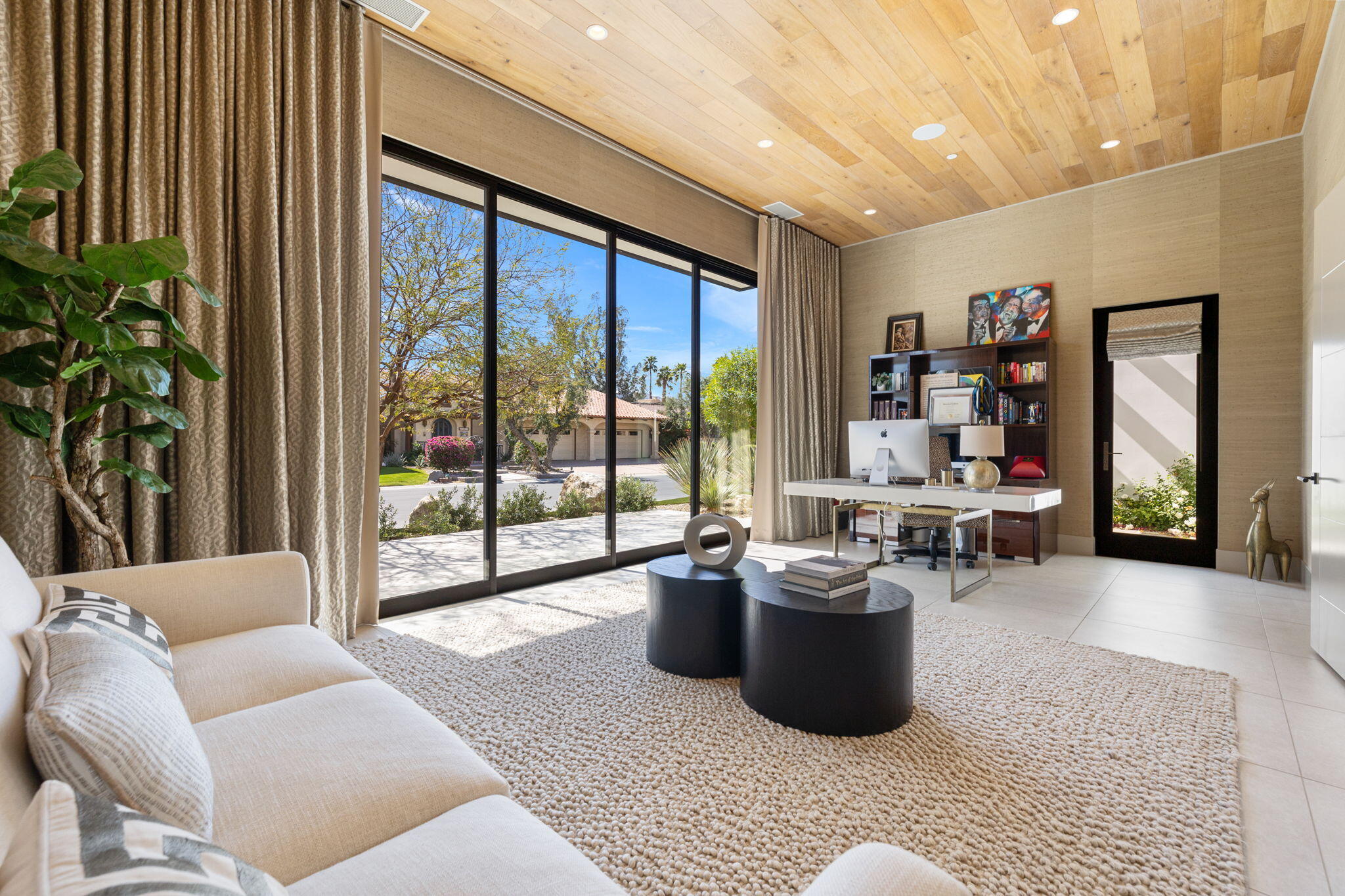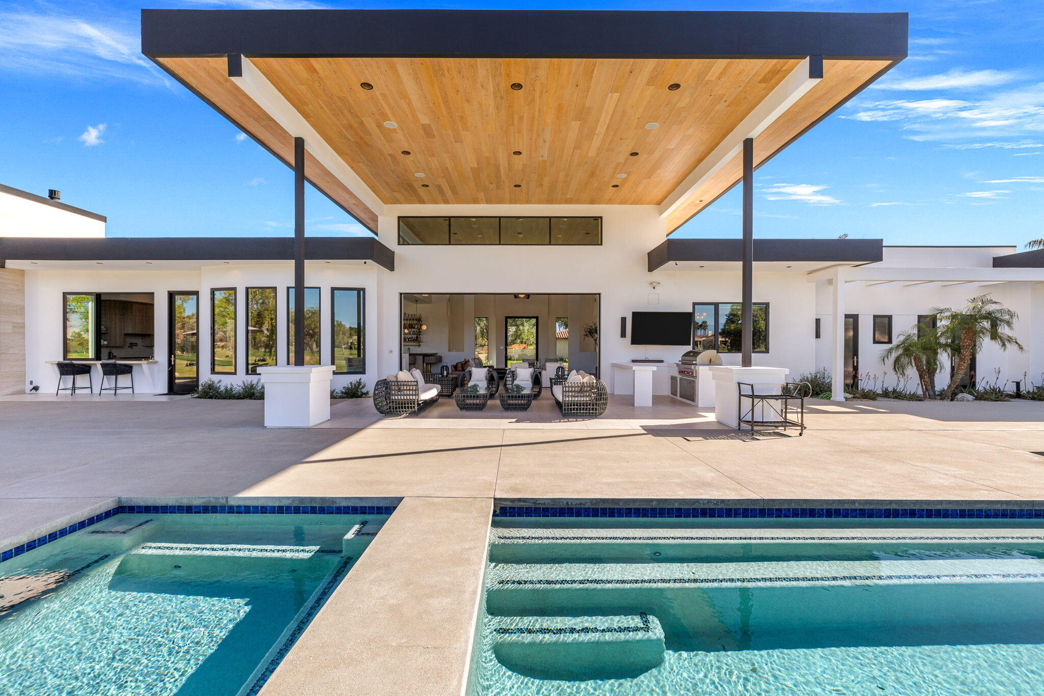 Nestled behind a private gate within the exclusive Mission Hills Country Club, this 6,830 sq. ft. contemporary masterpiece offers unparalleled design and architectural elegance. Every detail has been meticulously crafted to create a seamless blend of indoor and outdoor living. Towering 20-foot wood-lined ceilings and expansive walls of glass invite natural light while framing breathtaking double fairway views from the 12th tee of the Pete Dye course. This exceptional home features four luxurious en-suite bedrooms and five bathrooms, thoughtfully designed for both comfort and flow. The primary suite, positioned at the east end, boasts a spa-like bath with a walk-in shower, dual vanities, separate toilet areas, and a custom walk-in closet. A junior primary suite, complete with a soaking tub, shower, and dual walk-in closets, along with two additional spacious en-suite bedrooms, are located at the opposite end of the home. Art enthusiasts will appreciate the gallery-style hallways, offering ideal niches for curated collections. The home office, surrounded by glass, includes a private entrance, making it perfect for remote work or creative endeavors. Outdoors, a resort-style setting awaits with a large pool and spa, a fire pit, an outdoor kitchen with a TV, and expansive concrete decking--ideal for entertaining. Enjoy breathtaking mountain and golf course views from the covered patio, offering the perfect setting for relaxation. Designed for convenience and security, the estate includes a four-car garage, with two separate two-car garages strategically placed at opposite ends of the home. With a low HOA of just $242, this modern architectural gem is a rare find, ready for the most sophisticated buyer.Interested in this Listing?
