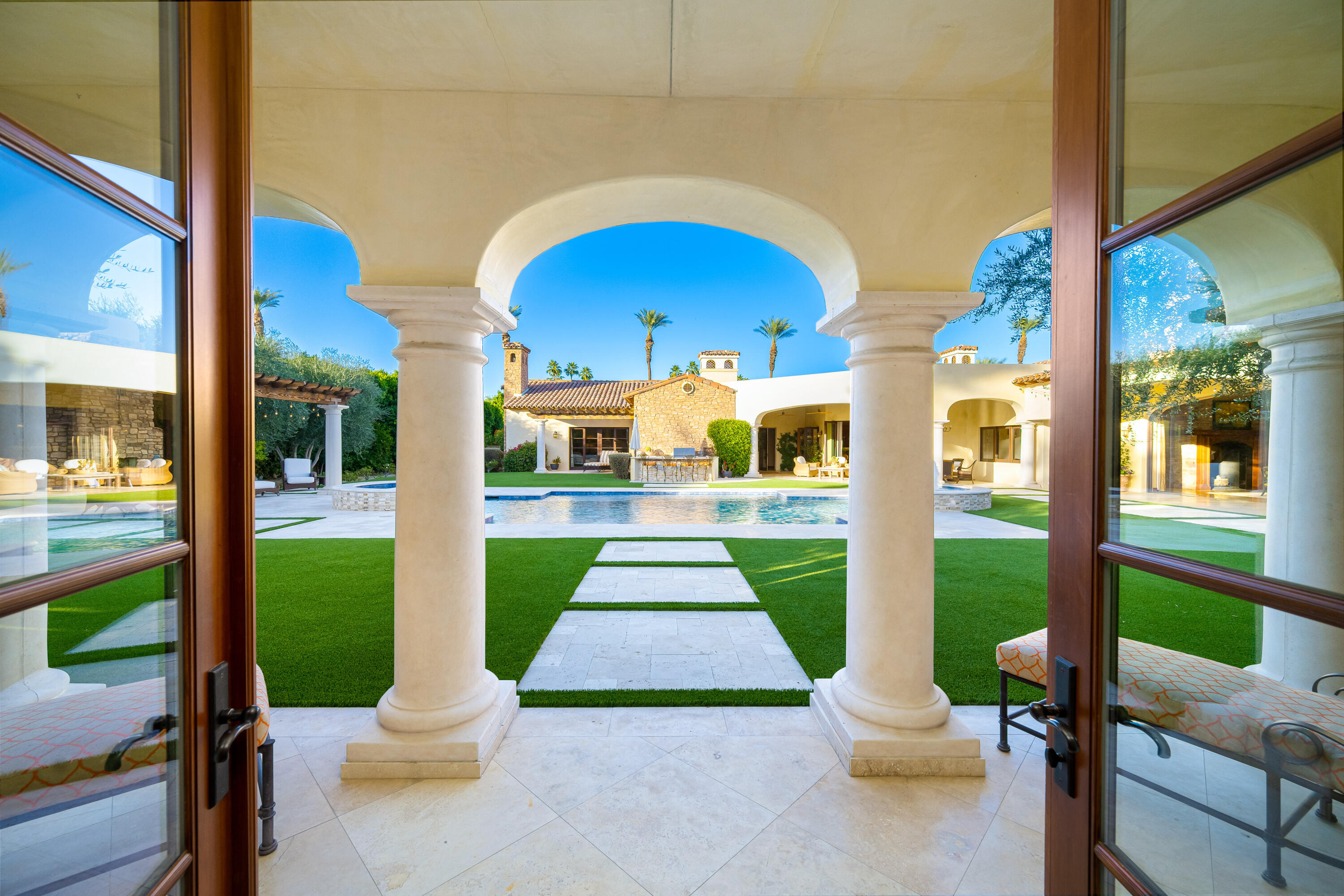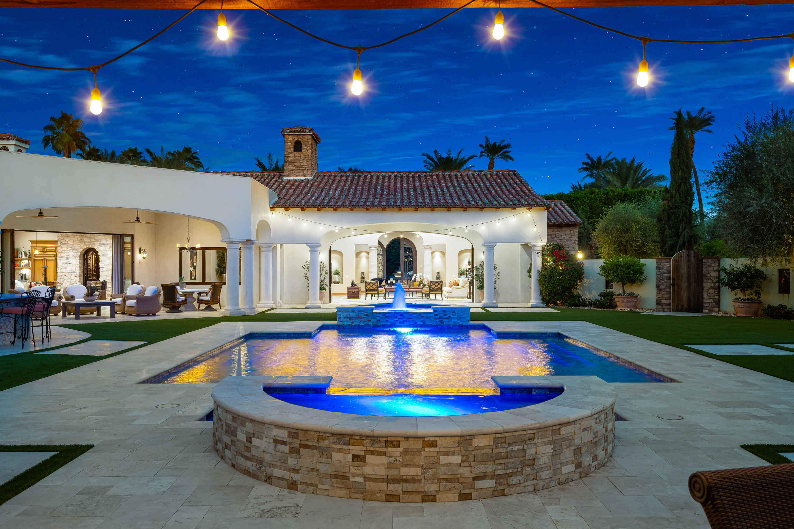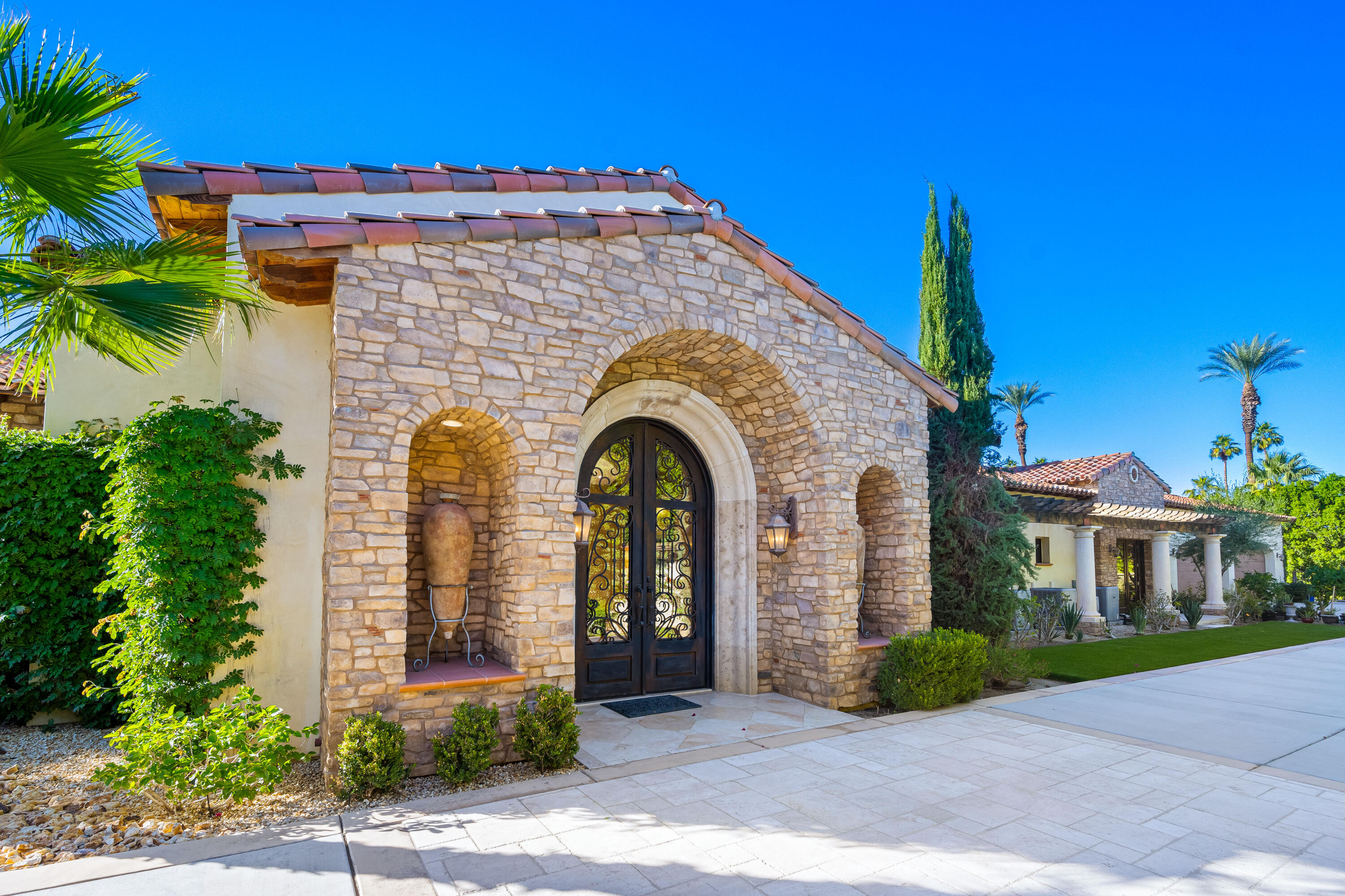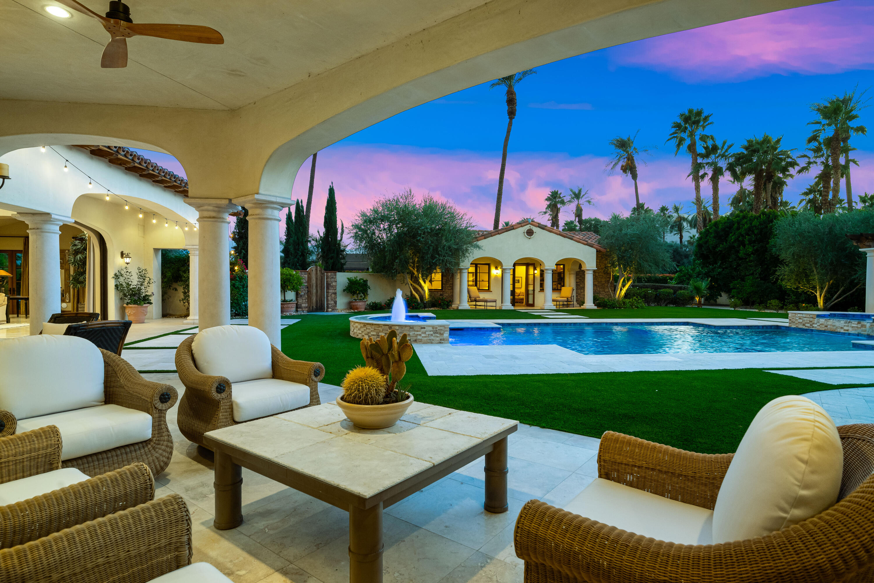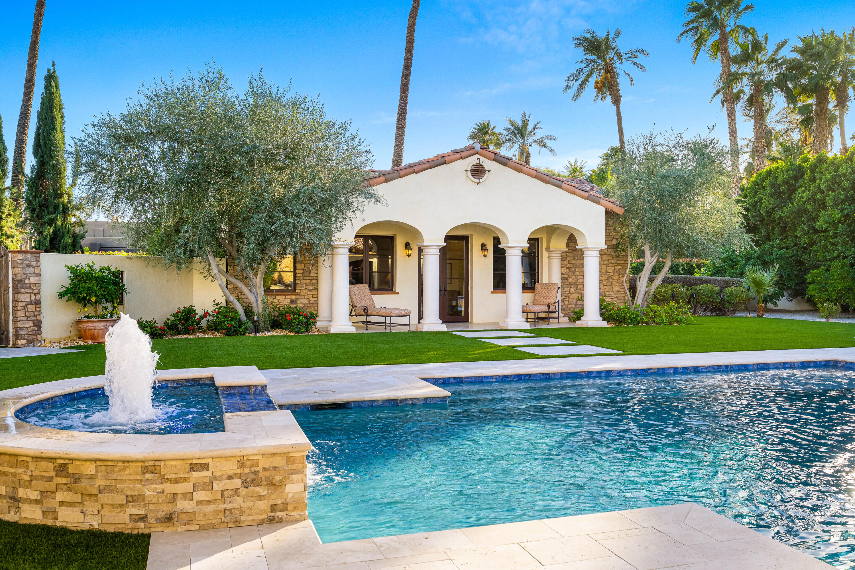 Privately gated estate on over an acre at The Renaissance featuring a private pickleball court! Five bedrooms, seven and a half baths including guest house. Approximately 7,480 sq. ft. on 1.31 acres. Enter through grand foyer to great room with two-way fireplace to formal dining room with custom wet bar. Gourmet kitchen with extended double sink island and counter bar, top-of-the-line appliances, adjacent wine cellar, prep kitchen and family room with media. Gorgeous master retreat with fireplace, sitting area, lavish bath and custom closet. The inviting guest suites include a detached one bedroom guest house. All major rooms open to the outdoor entertainment area with dining and lounging loggia including fireplace. There is another custom stone fireplace under pergola with seating, step down to pickleball court and putting green. Custom pool with waterfall spa and fountain, outdoor bar and BBQ kitchen. Meticulous mature landscaping, four car garage, solar panels and more! Offered furnished per inventory.Interested in this Listing?