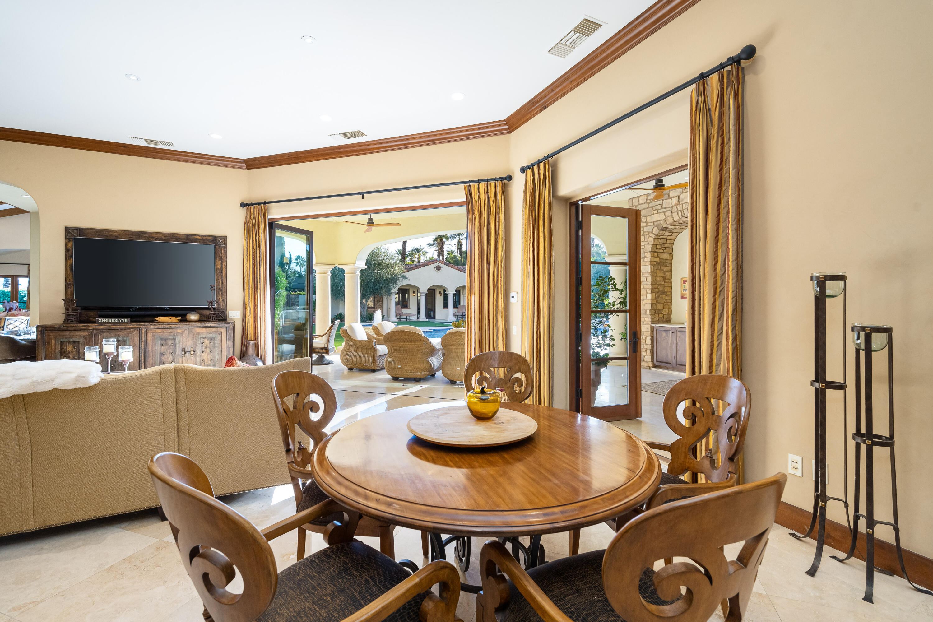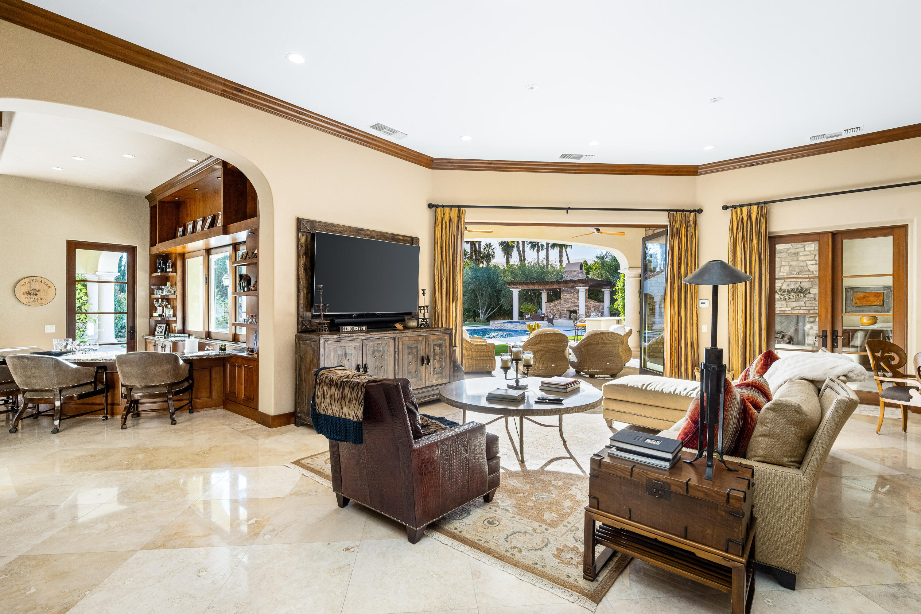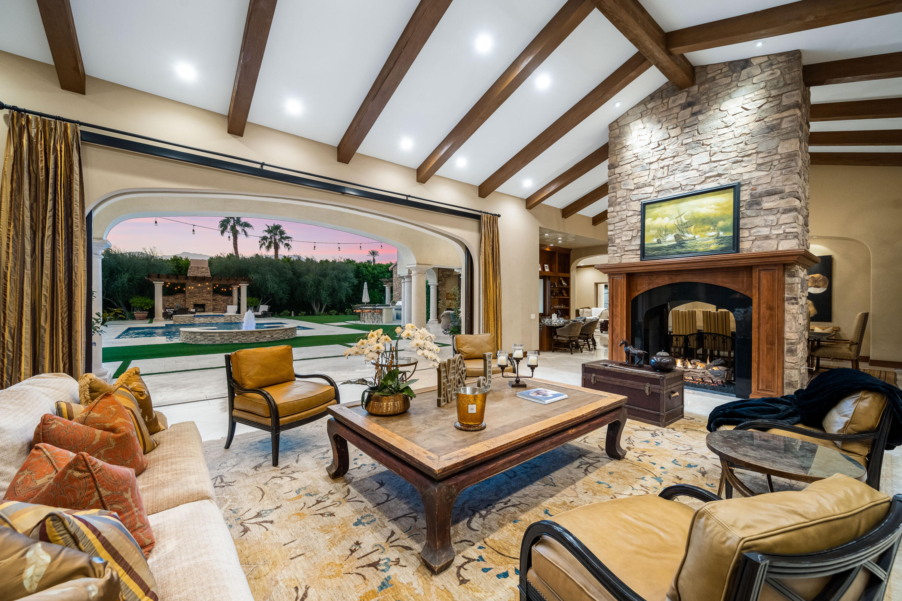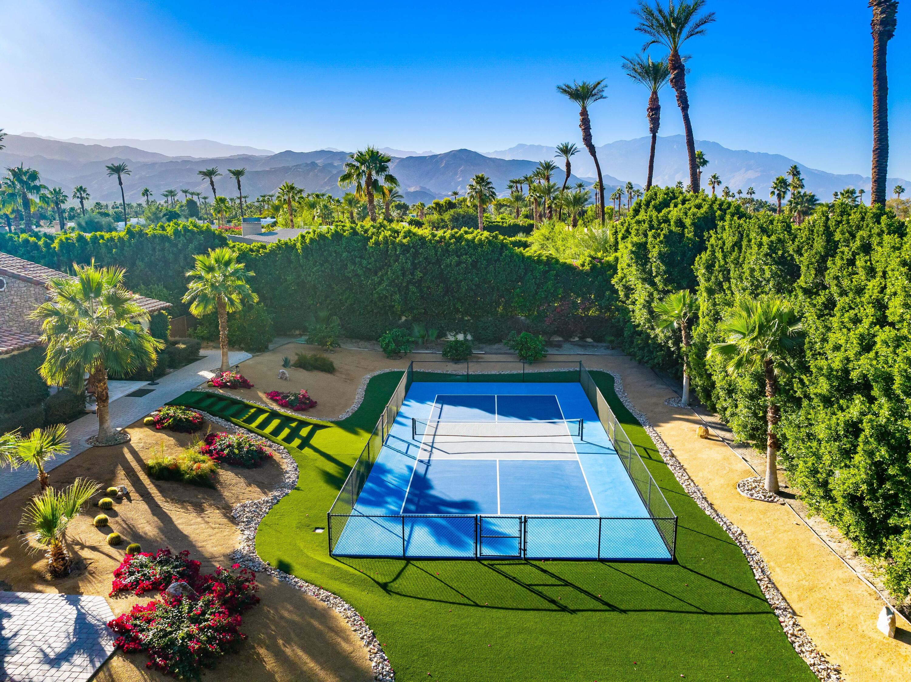 Privately gated estate on over an acre at The Renaissance featuring a private pickleball court! Five bedrooms, seven and a half baths including guest house. Approximately 7,480 sq. ft. on 1.31 acres. Enter through grand foyer to great room with two-way fireplace to formal dining room with custom wet bar. Gourmet kitchen with extended double sink island and counter bar, top-of-the-line appliances, adjacent wine cellar, prep kitchen and family room with media. Gorgeous master retreat with fireplace, sitting area, lavish bath and custom closet. The inviting guest suites include a detached one bedroom guest house. All major rooms open to the outdoor entertainment area with dining and lounging loggia including fireplace. There is another custom stone fireplace under pergola with seating, step down to pickleball court and putting green. Custom pool with waterfall spa and fountain, outdoor bar and BBQ kitchen. Meticulous mature landscaping, four car garage, solar panels and more! Offered furnished per inventory.Interested in this Listing?