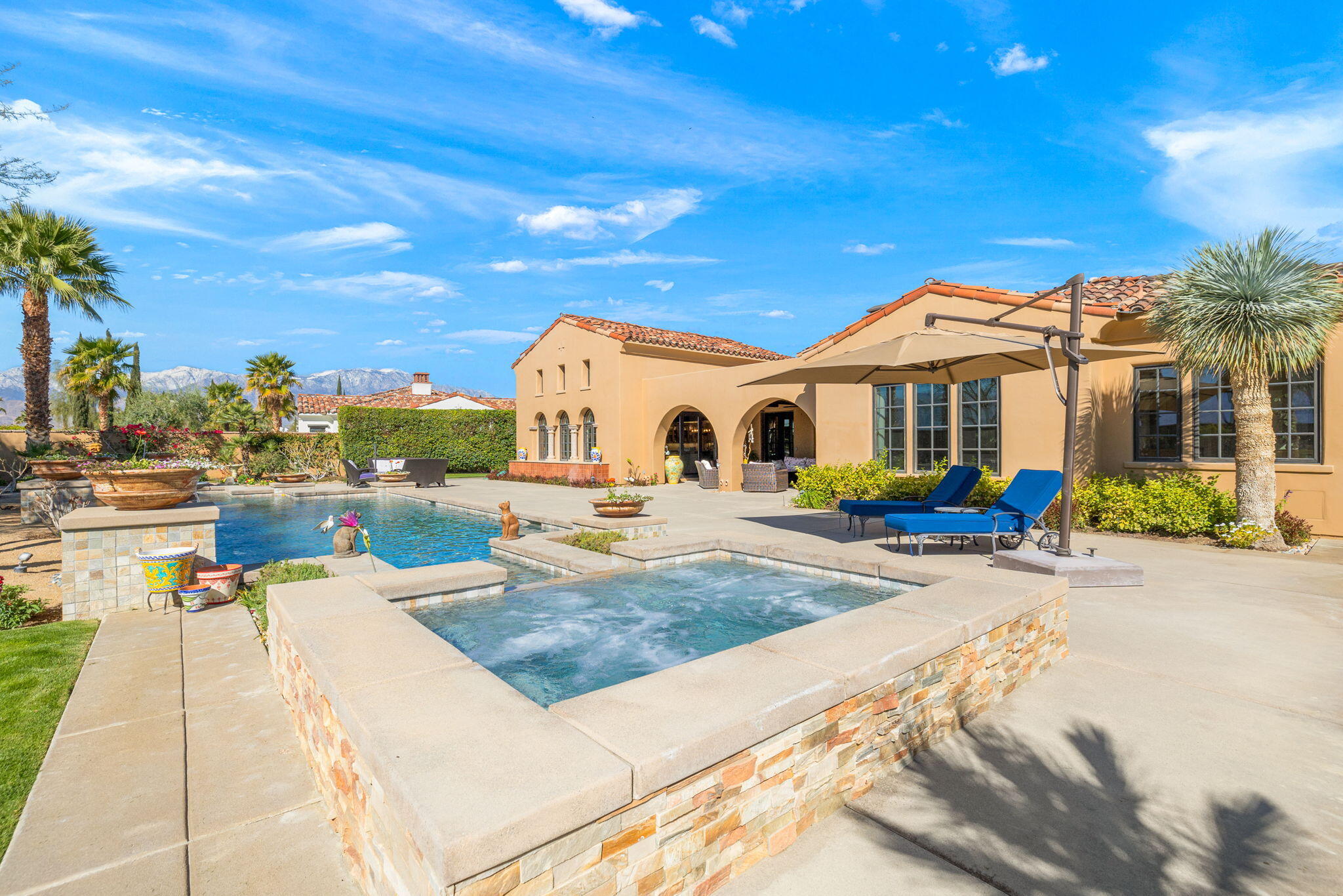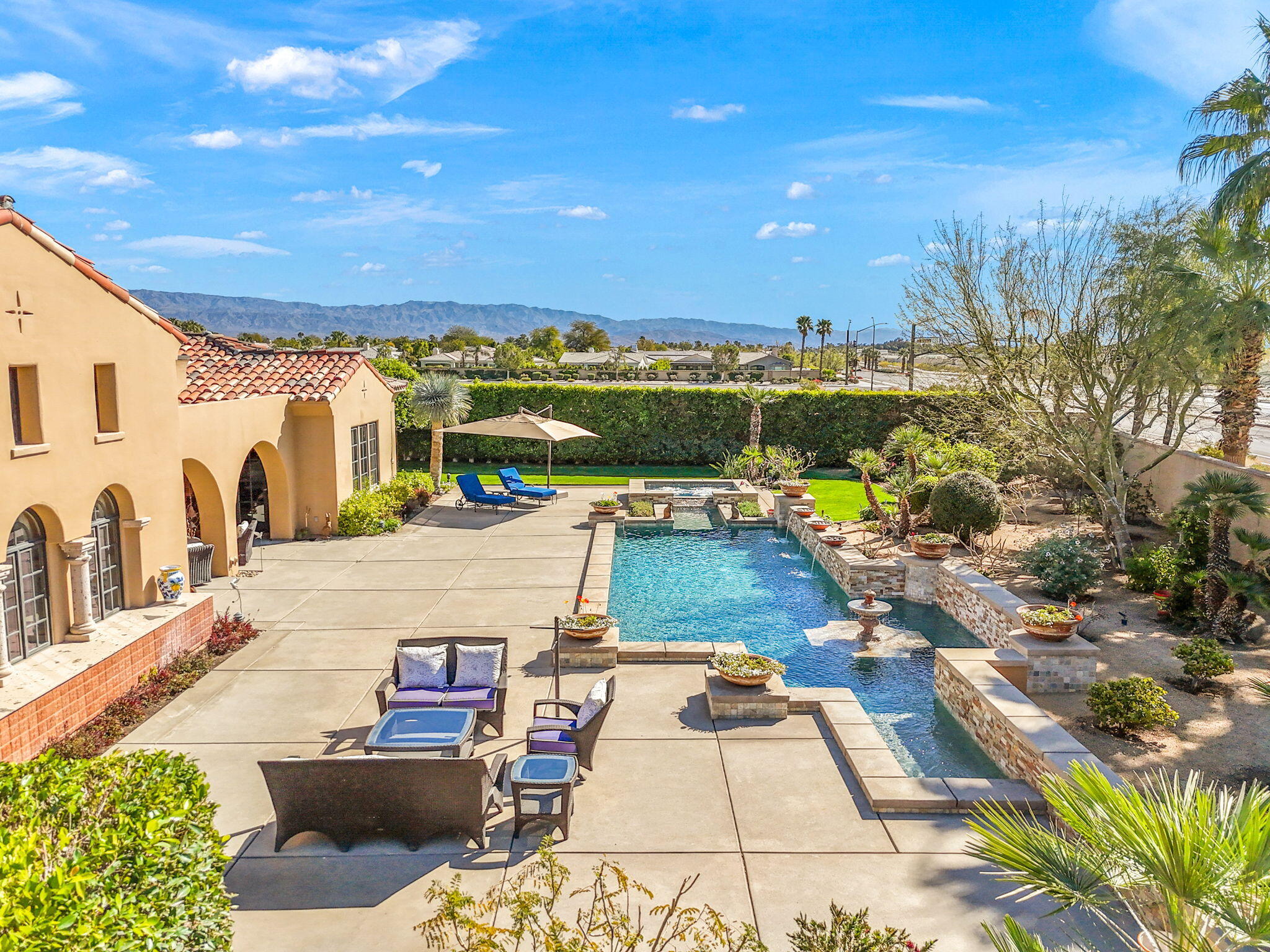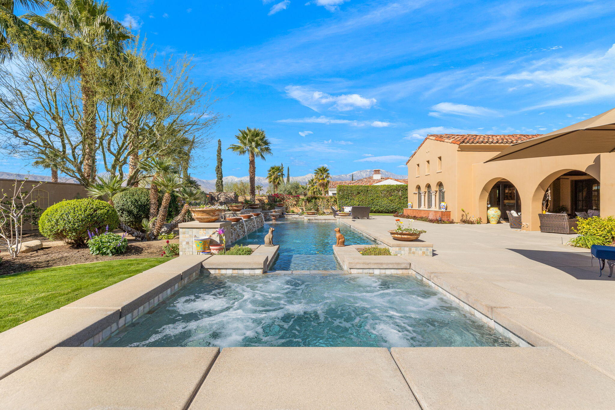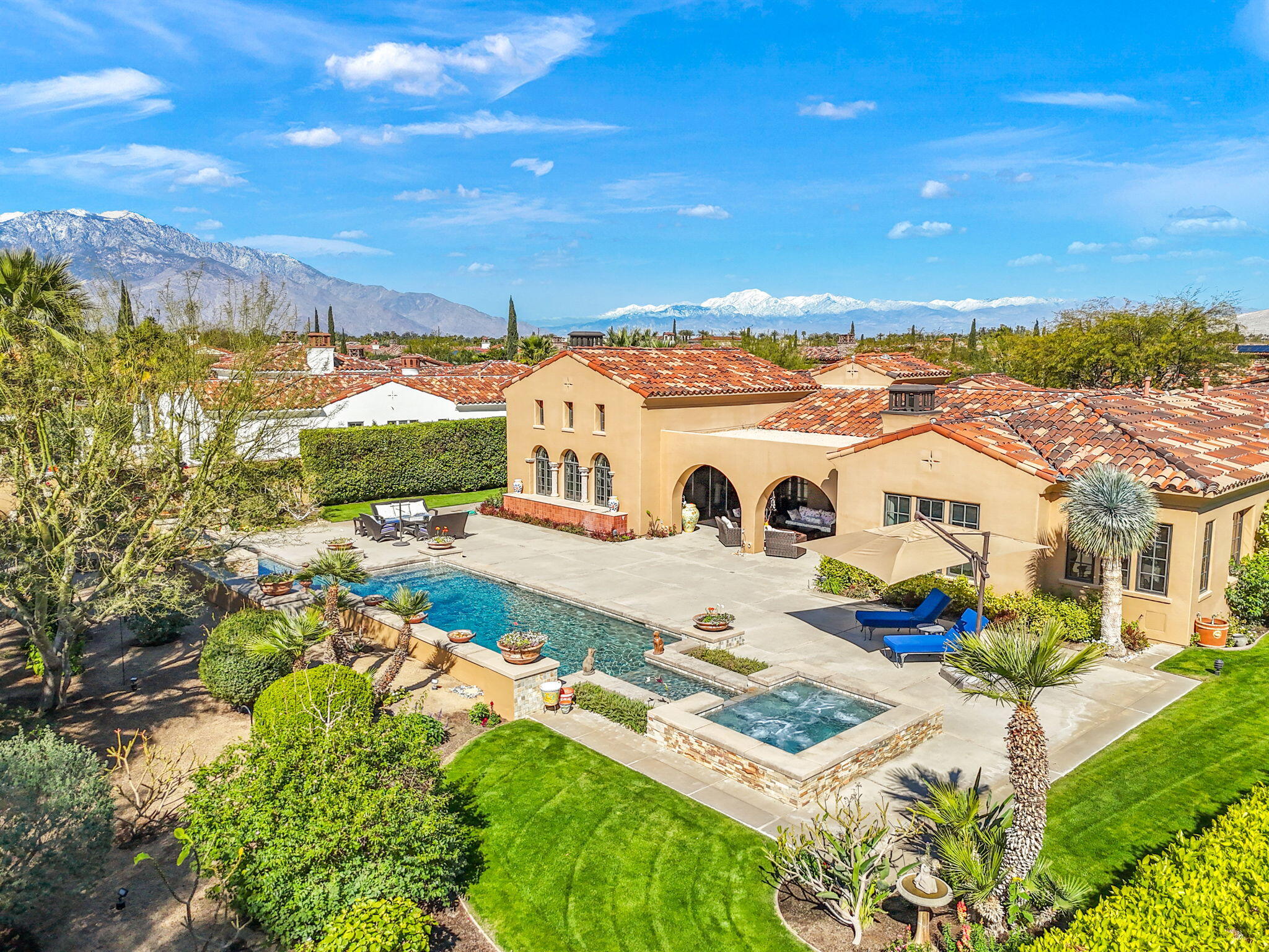 SIGNIFICANT PRICE IMPROVEMENT! Located in the highly desirable city of Rancho Mirage. This home is ready for it's new home owners and it could be you. This Tuscan inspired estate exudes Old World Charm and elegance behind the gates of ESCALA. There are five bedrooms,,that could have mulitiple uses, flex space i.e., office, zen room, art studio, you make it yours. Four bedrooms have ensuites. This residence is a masterpiece of craftsmanship and timeless design. From the moment you arrive you are welcomed by beautifully landscaped entry and your worries could melt away. Walk through the front couryard which features a tiered water fountain that sets the tone for the tranquil ambiance that flows throughout the property. Lush gardens bloom year-round, offering a vibrant display of color and fragrance in every season. Once you step inside you're greeted by soaring ceilings and unparalled mountain views. An expansive floor to ceiling Cantera stone fireplace anchors the great room creating a warm and inviting atmosphere. The formal dining room allows for elegant gatherings. Three sets of French doors open to the covered back patio with fireplace overlooking the saltwater, pebbletech pool and spa and manicured gardens. The heart of the home is the gourmet kitchen, a chef's dream, equipped with a VIKING 6 burner and griddle range with two ovens. In addition two VIKING wall ovens, micro-wave and Sub Zero tower refridgerator and freezer, all Stainless Steel. The design is perfect for culinary creations and enteraining guests. The upgrades continue with custom cabinetry, solid granite counter tops and oversized center island with built in beverage refridgeration drawers, and elegant limestone backsplace. The additional wet bar adjacent to the great room continues the entertainers dream layout. The outdoor oasis is equally impressive with breathtaking mountain views. The home features a resort-style pool and spa, four dramatic water features, providing a traInterested in this Listing?