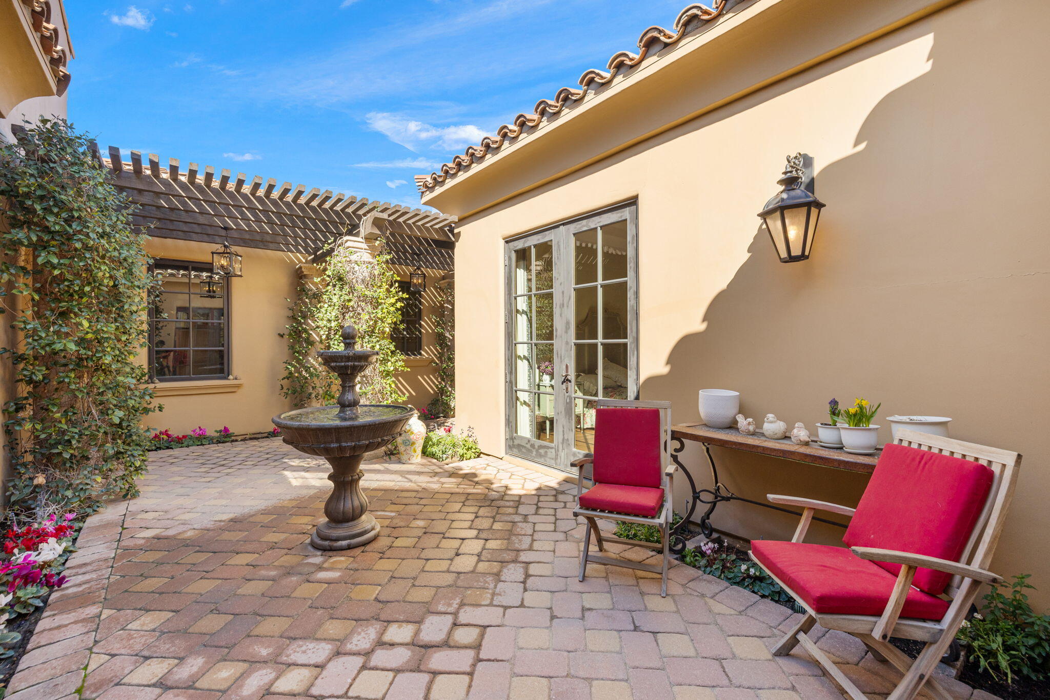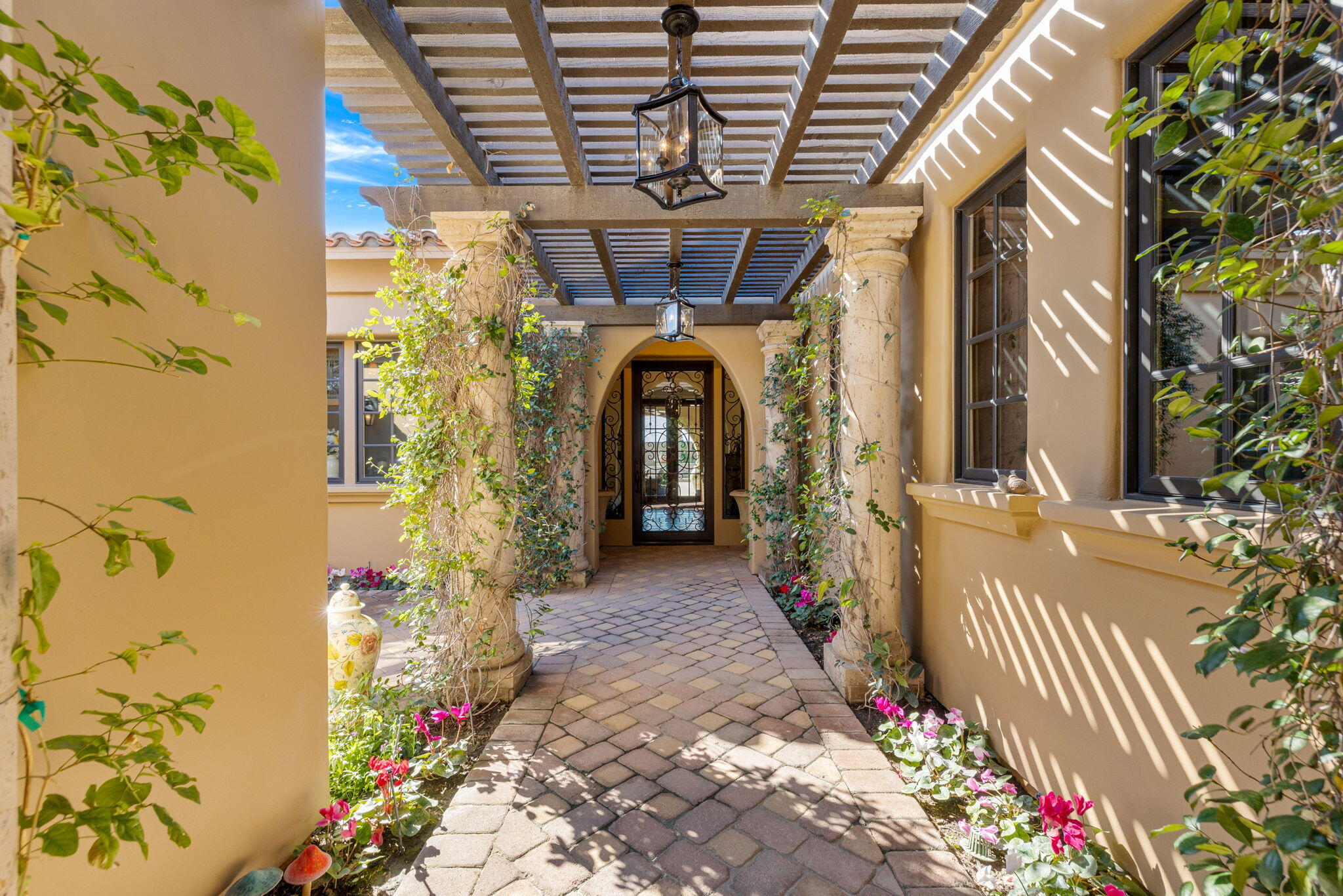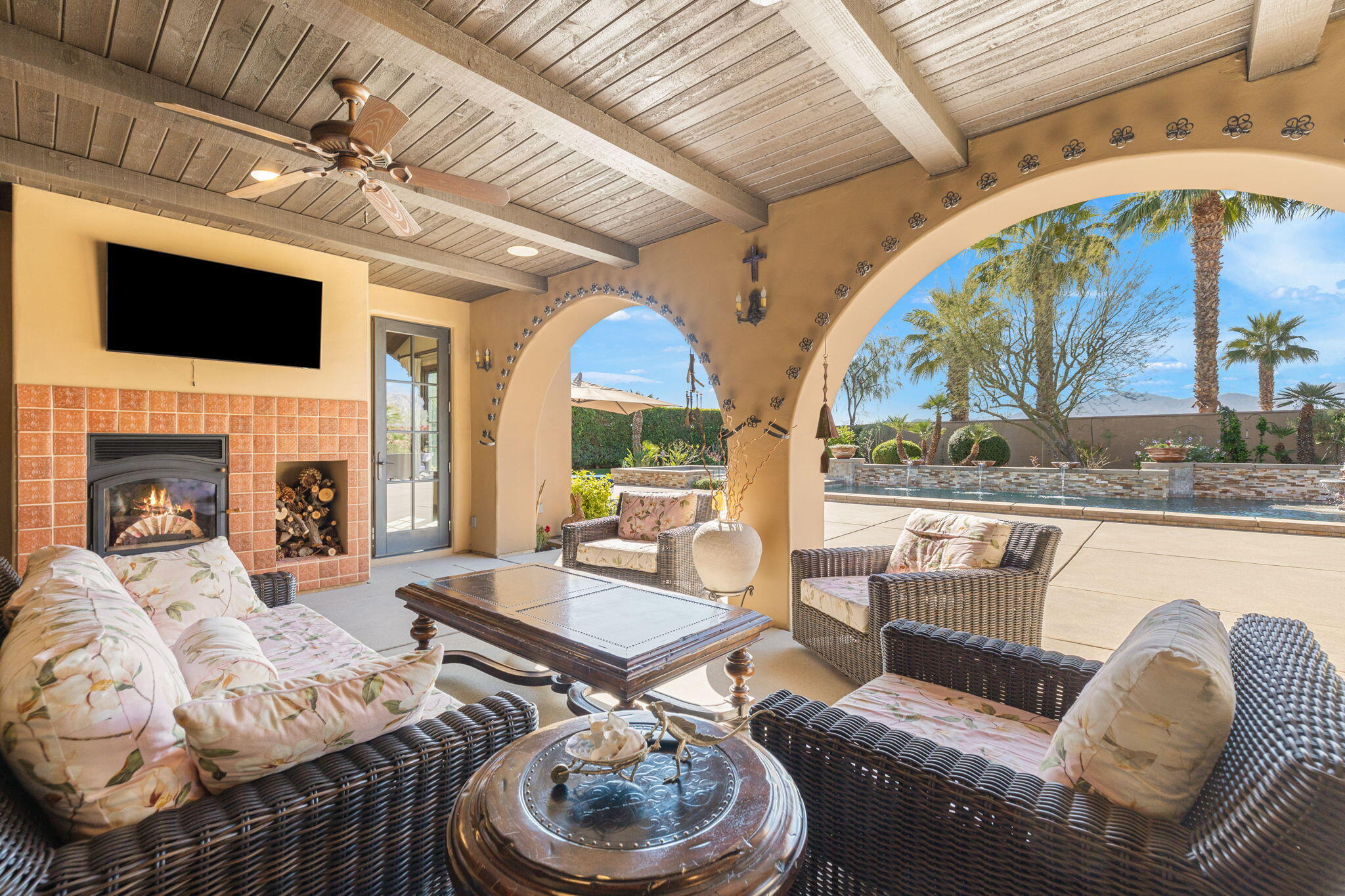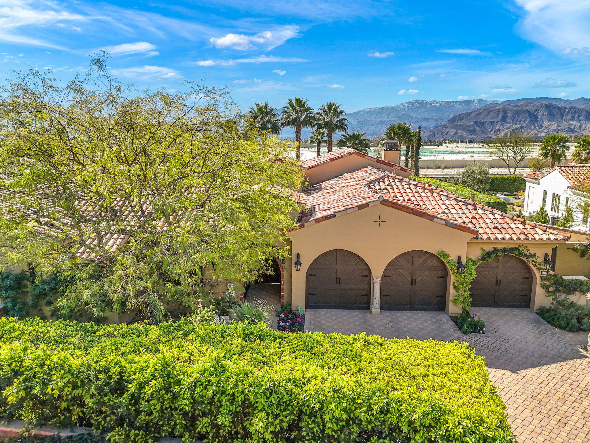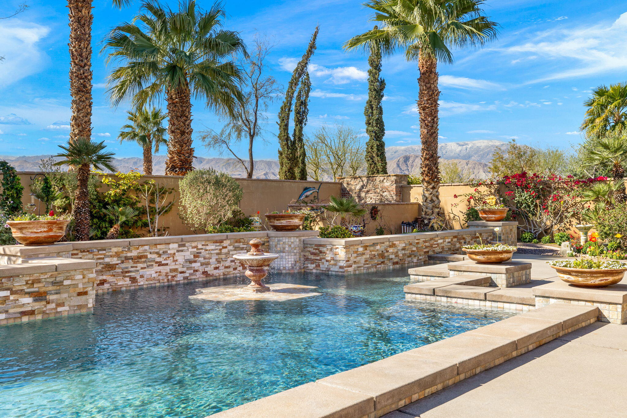 SIGNIFICANT PRICE IMPROVEMENT! Located in the highly desirable city of Rancho Mirage. This home is ready for it's new home owners and it could be you. This Tuscan inspired estate exudes Old World Charm and elegance behind the gates of ESCALA. There are five bedrooms,,that could have mulitiple uses, flex space i.e., office, zen room, art studio, you make it yours. Four bedrooms have ensuites. This residence is a masterpiece of craftsmanship and timeless design. From the moment you arrive you are welcomed by beautifully landscaped entry and your worries could melt away. Walk through the front couryard which features a tiered water fountain that sets the tone for the tranquil ambiance that flows throughout the property. Lush gardens bloom year-round, offering a vibrant display of color and fragrance in every season. Once you step inside you're greeted by soaring ceilings and unparalled mountain views. An expansive floor to ceiling Cantera stone fireplace anchors the great room creating a warm and inviting atmosphere. The formal dining room allows for elegant gatherings. Three sets of French doors open to the covered back patio with fireplace overlooking the saltwater, pebbletech pool and spa and manicured gardens. The heart of the home is the gourmet kitchen, a chef's dream, equipped with a VIKING 6 burner and griddle range with two ovens. In addition two VIKING wall ovens, micro-wave and Sub Zero tower refridgerator and freezer, all Stainless Steel. The design is perfect for culinary creations and enteraining guests. The upgrades continue with custom cabinetry, solid granite counter tops and oversized center island with built in beverage refridgeration drawers, and elegant limestone backsplace. The additional wet bar adjacent to the great room continues the entertainers dream layout. The outdoor oasis is equally impressive with breathtaking mountain views. The home features a resort-style pool and spa, four dramatic water features, providing a traInterested in this Listing?