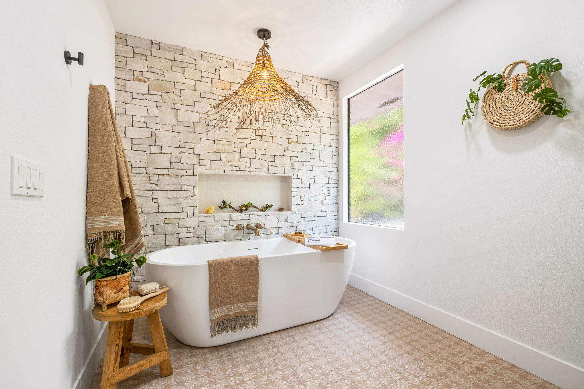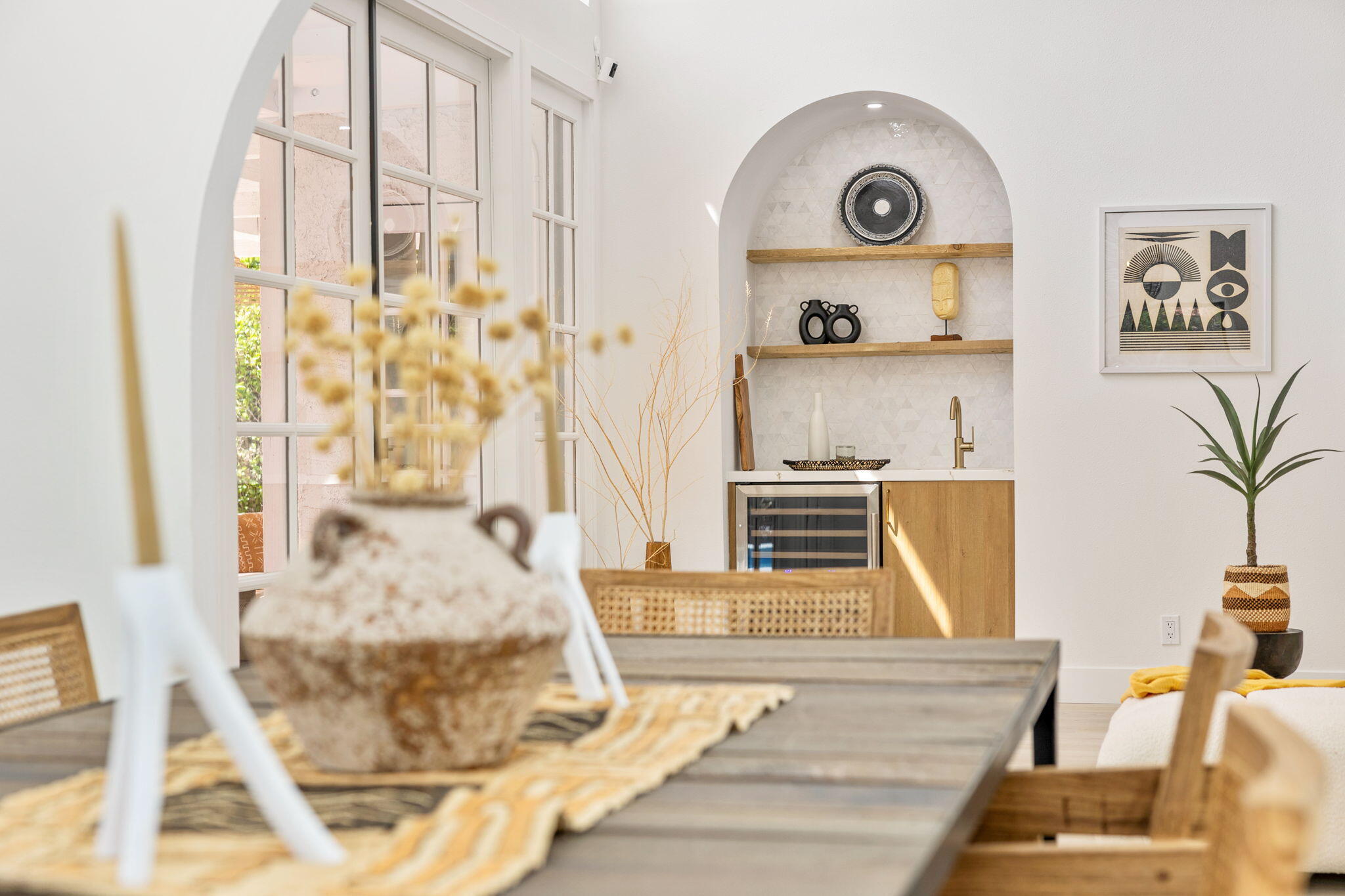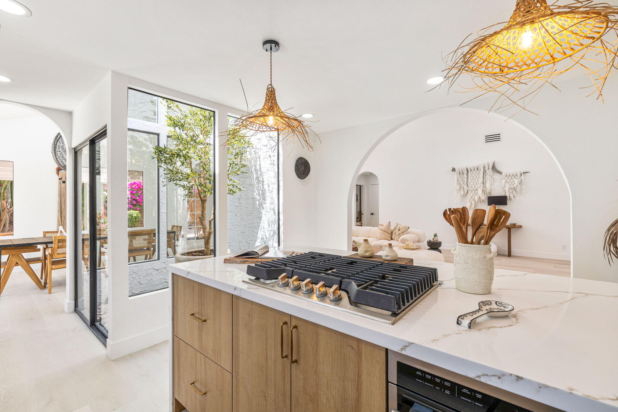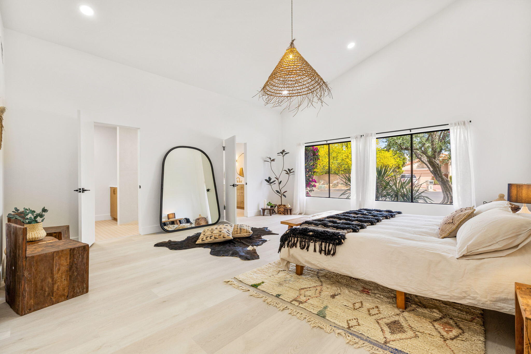 Tulum-Inspired Remodel in the Heart of Rancho Mirage with Incredible West-Facing Mountain Views!Step into resort-style living with this breathtaking, one-of-a-kind renovation in Presidential Estates--an exclusive, quiet, gated community in Rancho Mirage featuring tennis courts and a community pool.This Tulum-inspired masterpiece has been thoughtfully reimagined from top to bottom by a professional designer and team. From the moment you arrive, the brand-new concrete driveway and walkway, fresh exterior paint, new lighting, and lush landscaping set the tone for what's inside. Every detail was carefully curated to create a serene, modern oasis with an effortless indoor-outdoor flow.Inside, soaring ceilings with refinished beams and mood-lit atrium draw you into a space that feels open, airy, and welcoming. With specialty light fixtures and custom-created arches throughout, you will feel like you are on vacation every day. Other updates include premium stone composite LVP flooring, sleek new baseboards, and the removal of all popcorn ceilings which lends the home a clean, contemporary feel. The stunning kitchen features custom wood cabinetry, lovely hardware, high-end quartz countertops with waterfall edge and full backsplash, and stainless appliances including double ovens, custom stove and vent, drawer microwave, dishwasher, refrigerator, and a custom pass-through kitchen window making entertaining effortless. The formal dining room offers views of the expansive, mosaic-tiled pool and spa surrounded by lush landscaping--your own private backyard retreat. A large, covered patio offers plenty of entertaining space but also shade to cool off.The primary suite is a true sanctuary, featuring a spacious walk-in closet and a luxurious en-suite bathroom with dual vanities, a floating soaking tub, and a stunning pass-through shower, custom rock wall and high-end finishes. Two generous guest bedrooms share a beautifully redesigned Jack-and-Jill bathroom with elegant zellige tiInterested in this Listing?