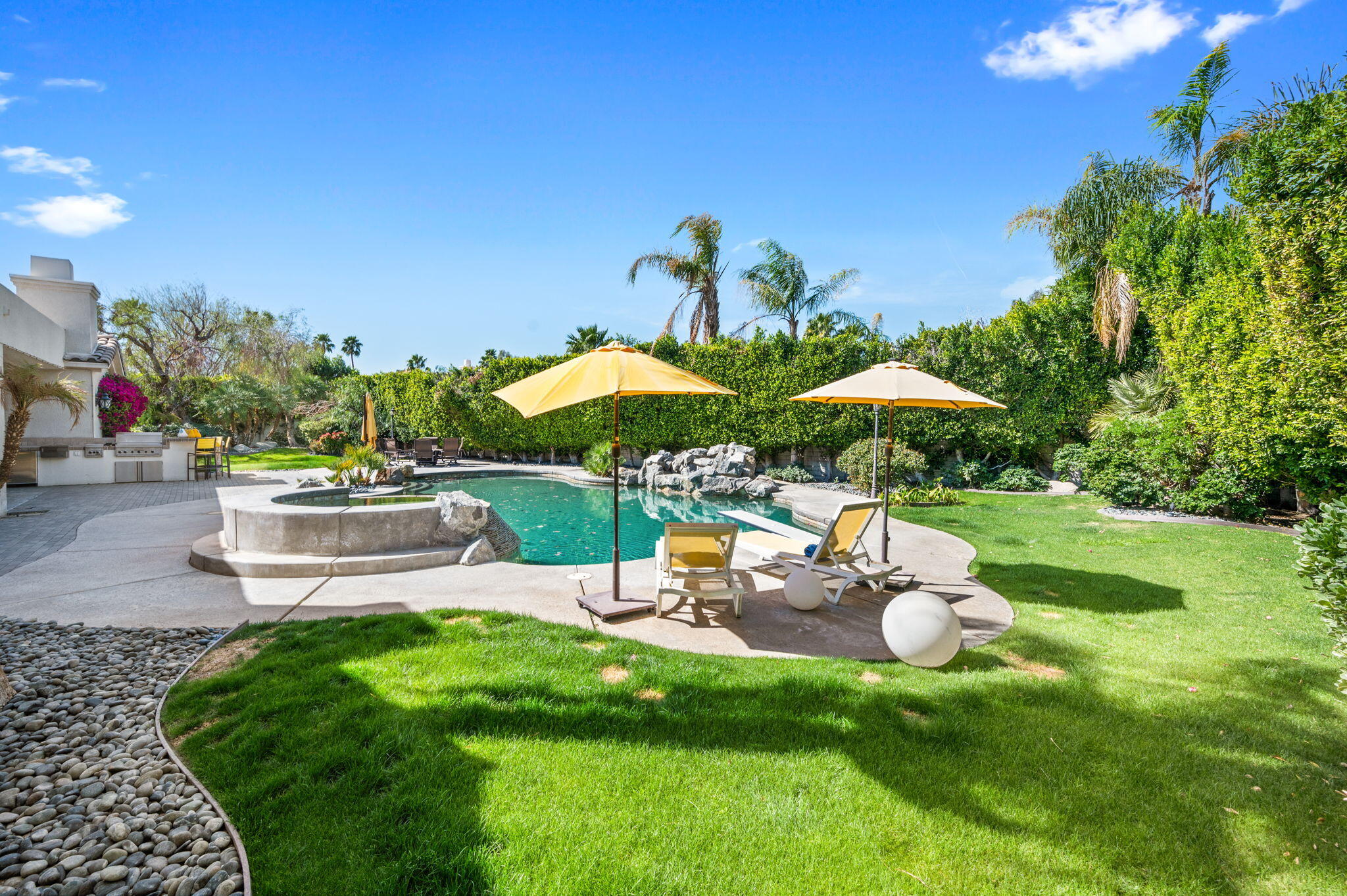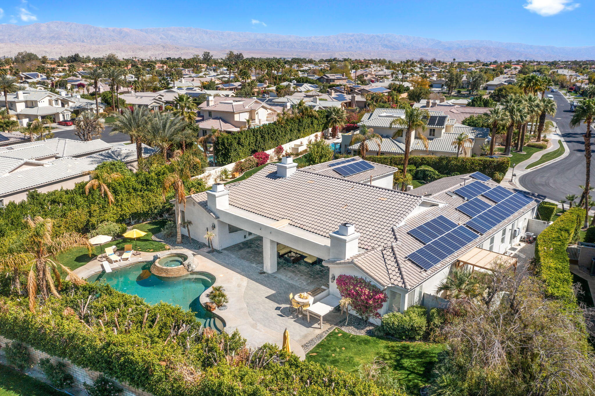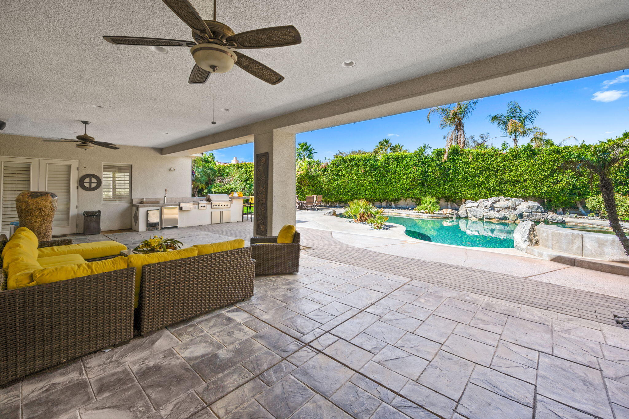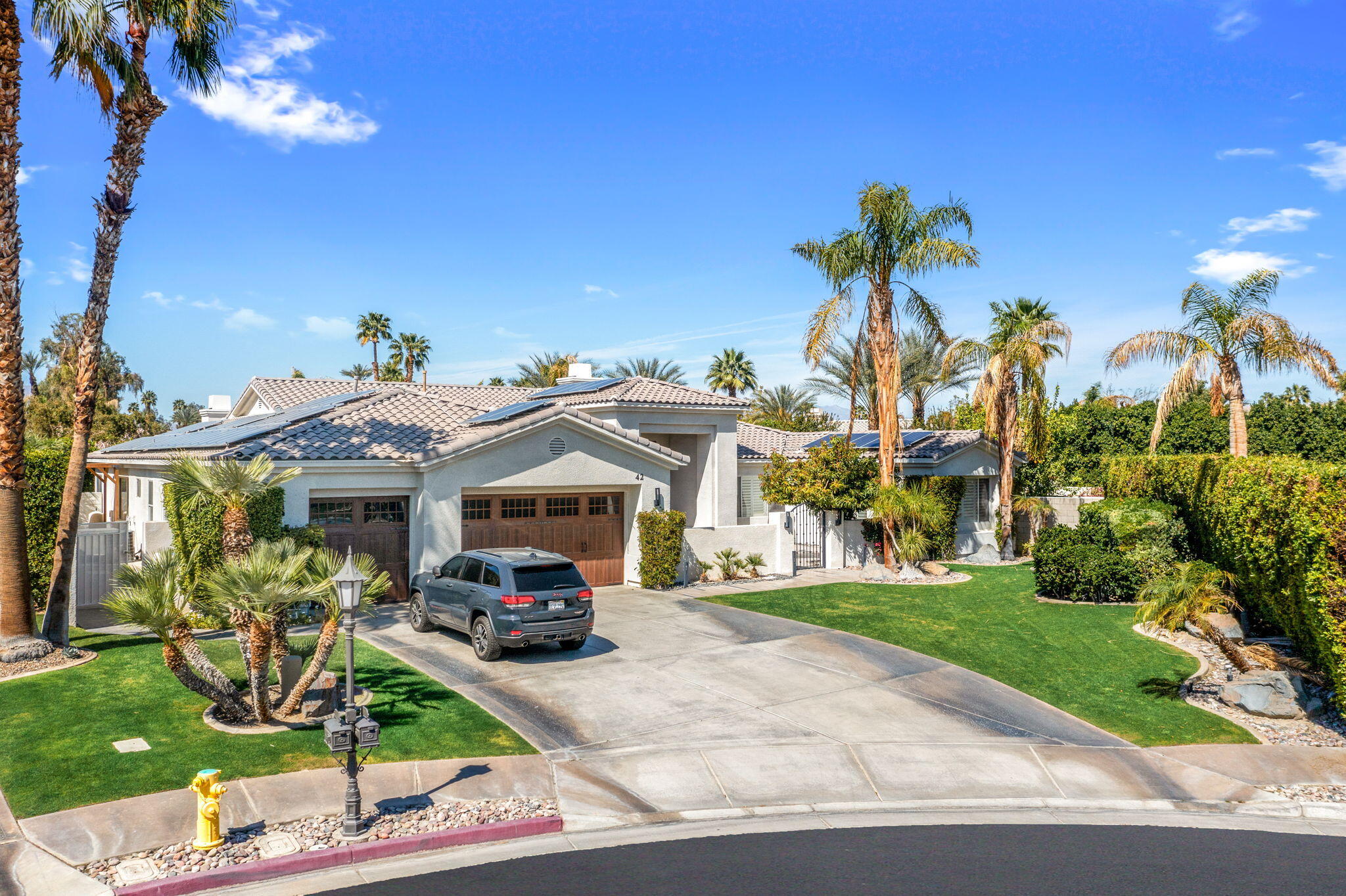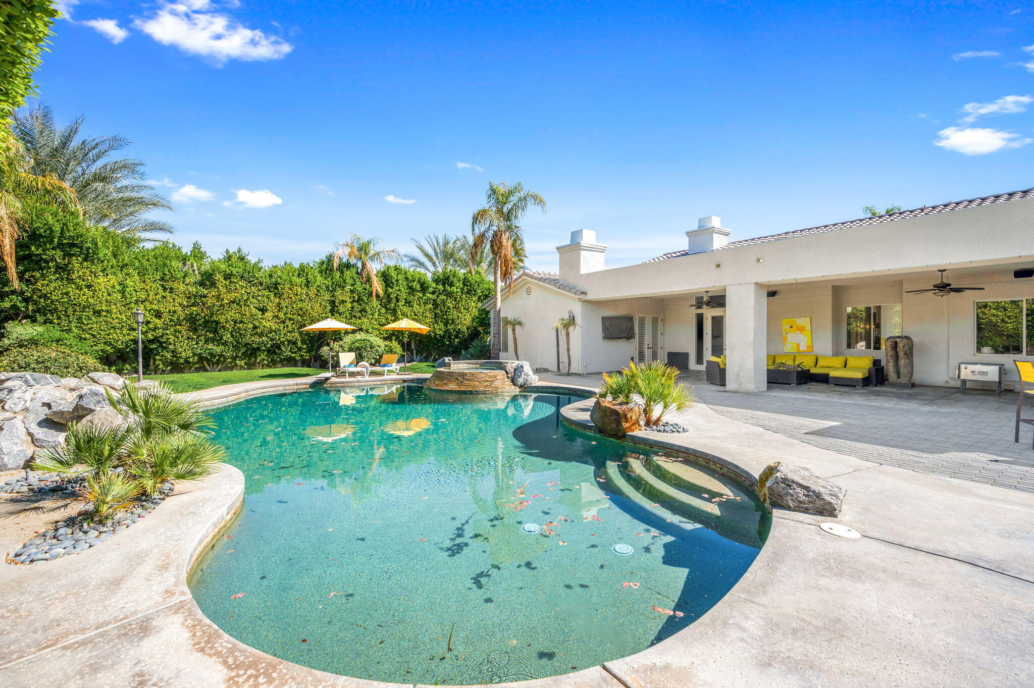 Exquisite home located in the heart of Rancho Mirage behind the prestigious gates of Victoria Falls. This oversized lot sits on a quiet cul-de-sac. An elegantly tiled courtyard welcomes you into the grand entrance of an open and spacious floor plan. The interior has been stylishly upgraded throughout, featuring wood like tile flooring, custom cabinetry, ceiling fans, custom lighting, and much more. The grand wet bar, complete with a walk-in 400-bottle wine fridge, is an entertainer's dream. The master suite includes a cozy fireplace and a large, sophisticated walk-in closet. Additionally, there are three more suites, each with a private full bathroom. An attached casita with a separate entrance is perfect for guests. The lush backyard offers mature landscaping, stone pavers, a misting system, a private pool and spa, a waterfall feature, and a built-in BBQ with a kitchen and a beer tap. Buyer to assume the solar loan. This home is move-in ready!Interested in this Listing?