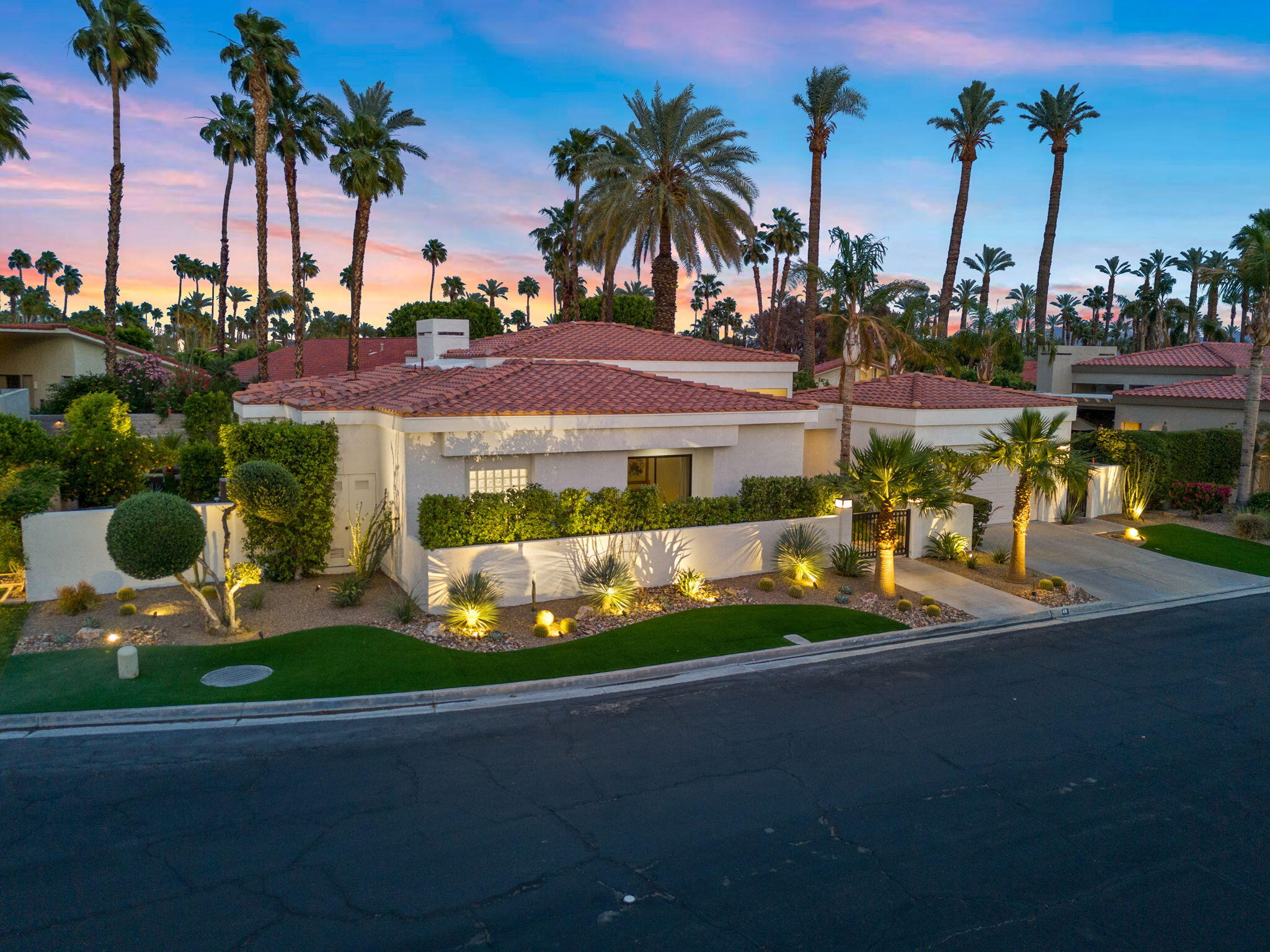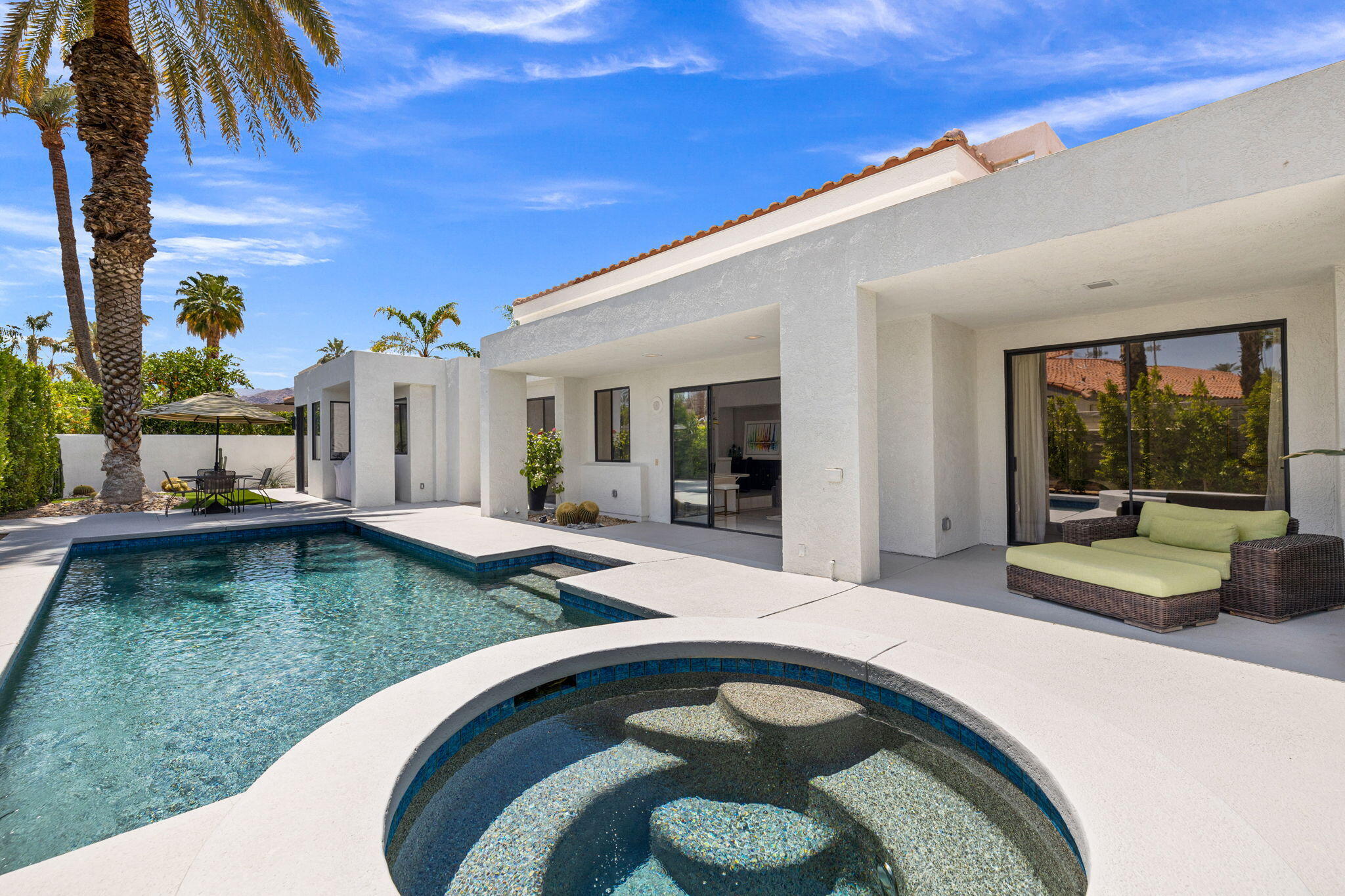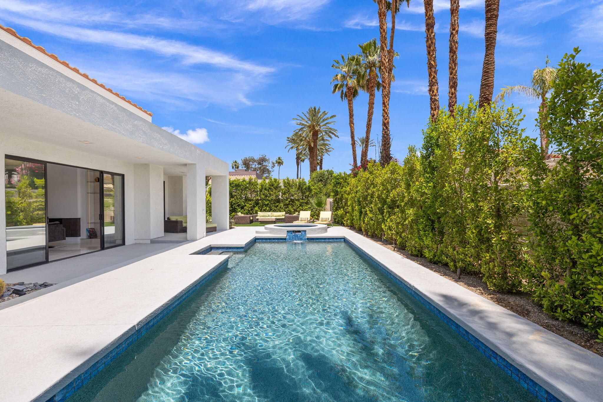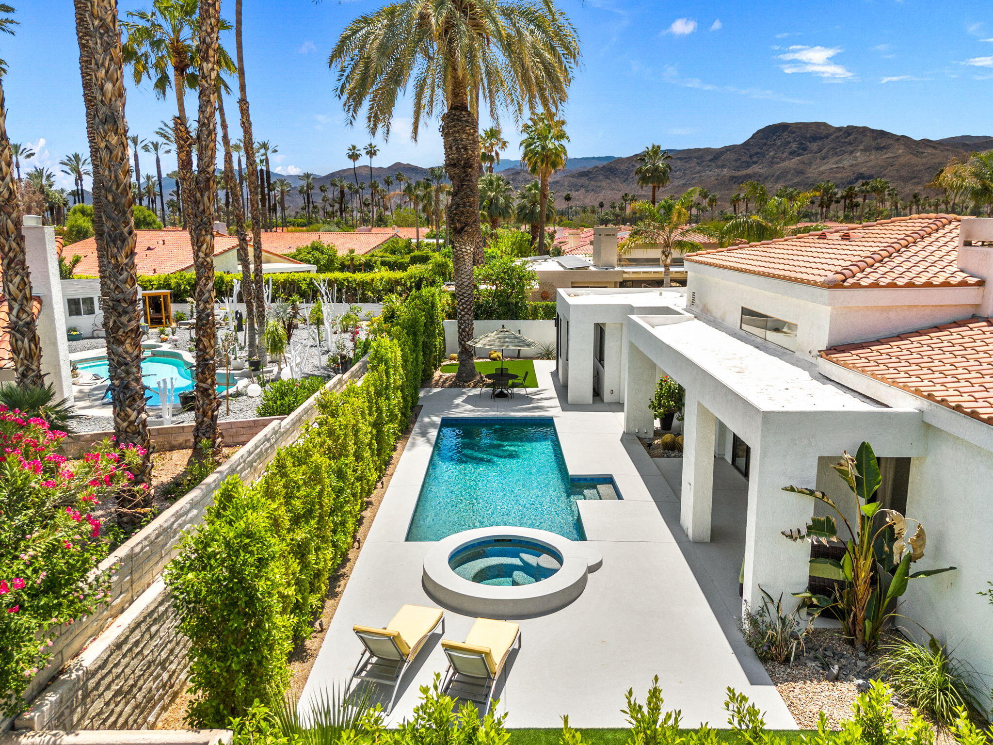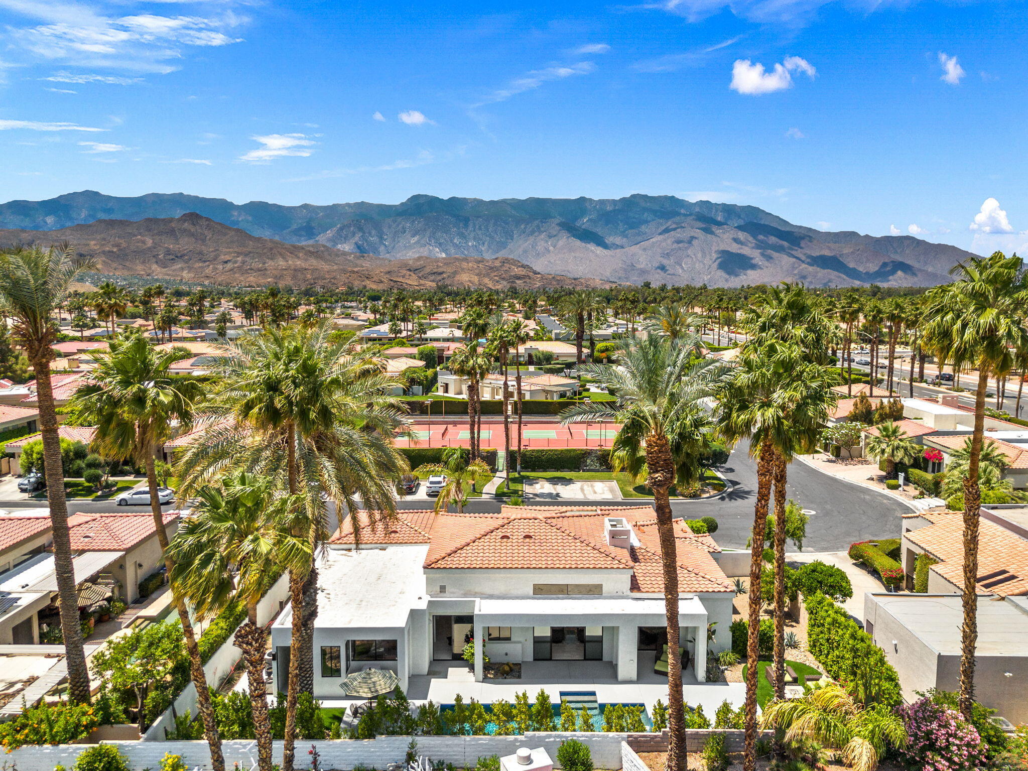 Architectural Luxury in the Heart of Rancho Mirage. Welcome to your private designer retreat in the exclusive gated enclave of Mission Pointe--a rare opportunity to own the original model home, architecturally distinct and meticulously reimagined for modern luxury living.Set on a generous 10,000+ sq ft lot, this 3-bedroom, 4-bath residence blends dramatic contemporary design with refined sophistication. A private courtyard entry opens to stunning interiors anchored by Italian 24'' x 48'' porcelain tile and soaring ceilings that amplify light and space throughout. Every room connects seamlessly to the outdoors via oversized sliders, creating a harmonious indoor-outdoor flow ideal for desert living.The open-concept living and dining gallery is enhanced by a custom sunken bar--a nod to classic Palm Springs entertaining--while a sculptural fireplace adorned with handcrafted tile adds a focal point of artistry and warmth. Curated LED lighting, bespoke wall textures, designer wallpapers, and custom millwork elevate each space with effortless style.The gourmet island kitchen is a chef's dream, featuring leathered stone countertops, premium Italian appliances, Monogram refrigeration, Bosch speed oven, and a cozy breakfast lounge with garden views.All three-bedroom suites offer private luxury, including spacious closets and spa-inspired baths. The main primary suite features a California Closet system with integrated lighting and the junior primary has a stunning mountain view--a true retreat.Outside, professionally designed landscaping frames the sparkling Pebble Tec pool and spa, complete with integrated lighting and multiple lounging areas--surrounded by mature palms and lush greenery for ultimate privacy.Additional features include an epoxy-finished two-car garage with custom storage and pet wash station, indoor laundry, and a low HOA offering access to a private gym, tennis, and pickleball courts.This one-of-a-kind residence offers a rare combination of architectural diInterested in this Listing?