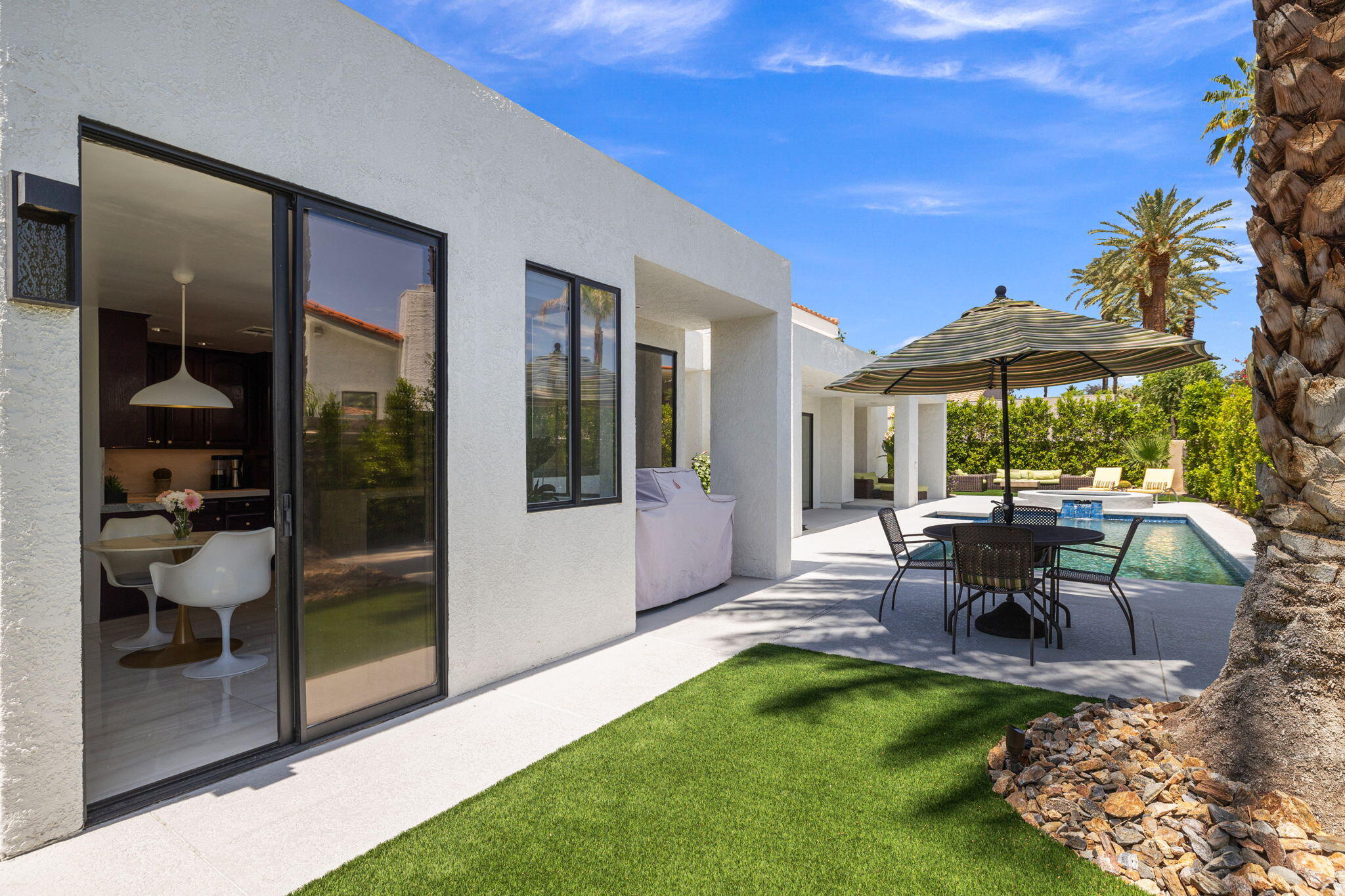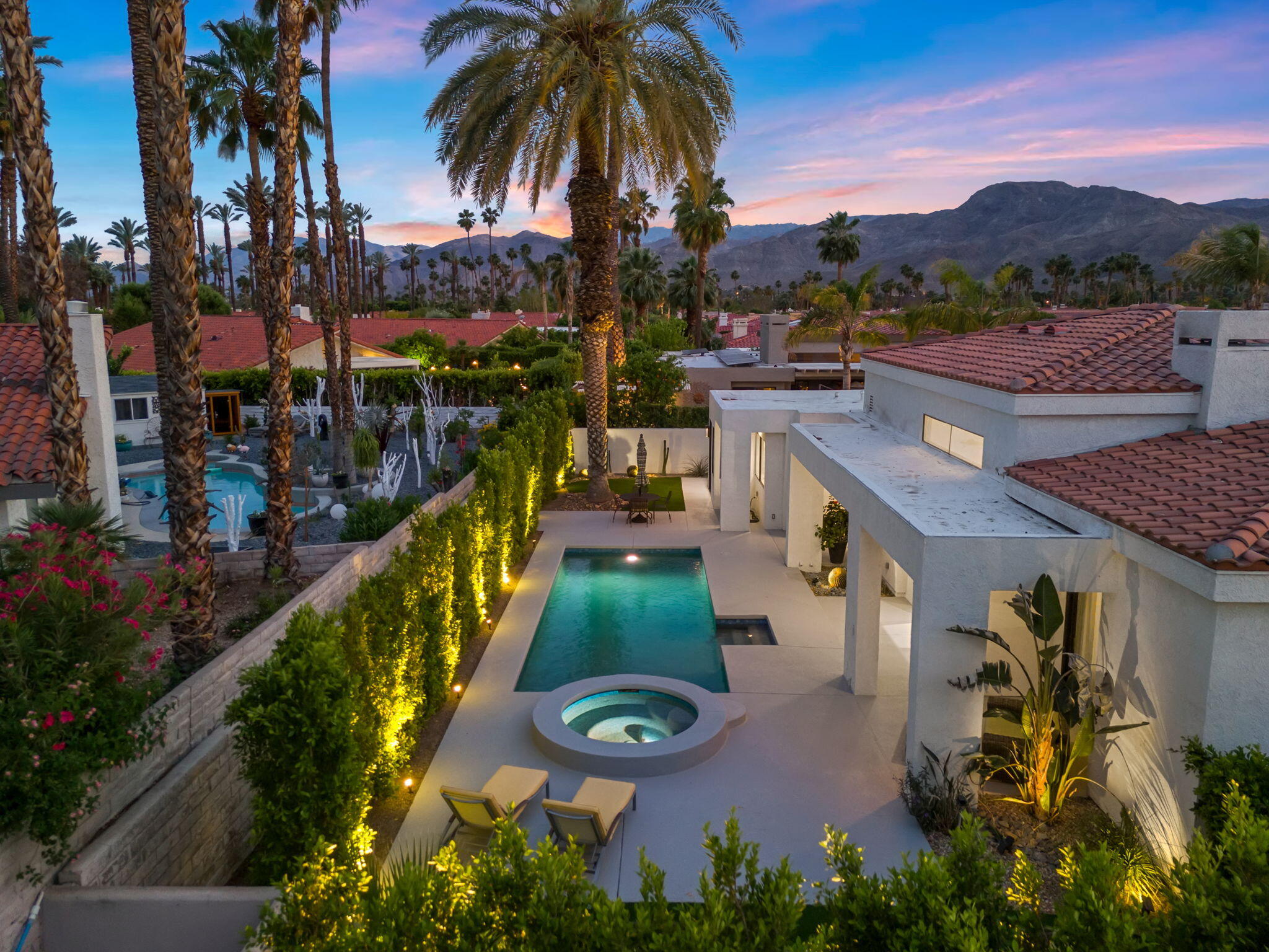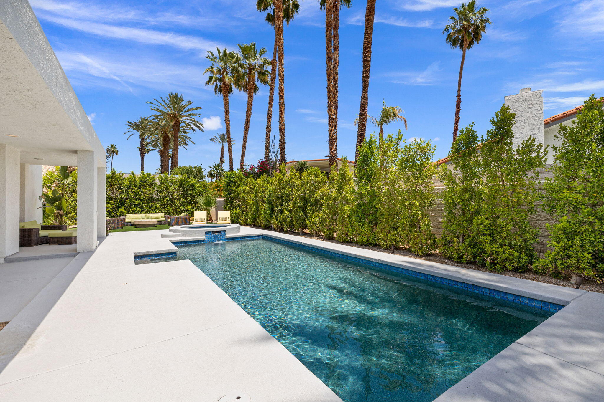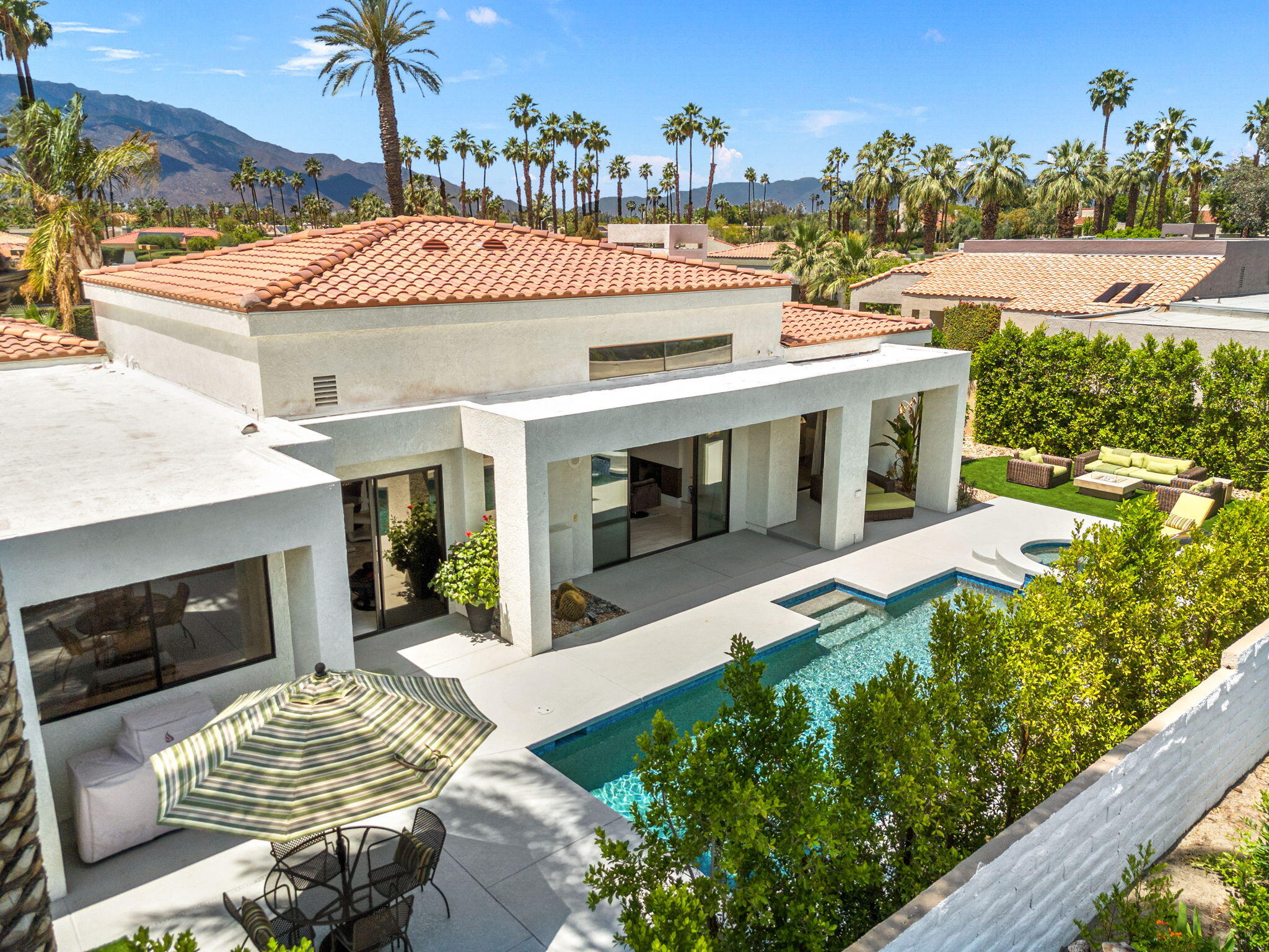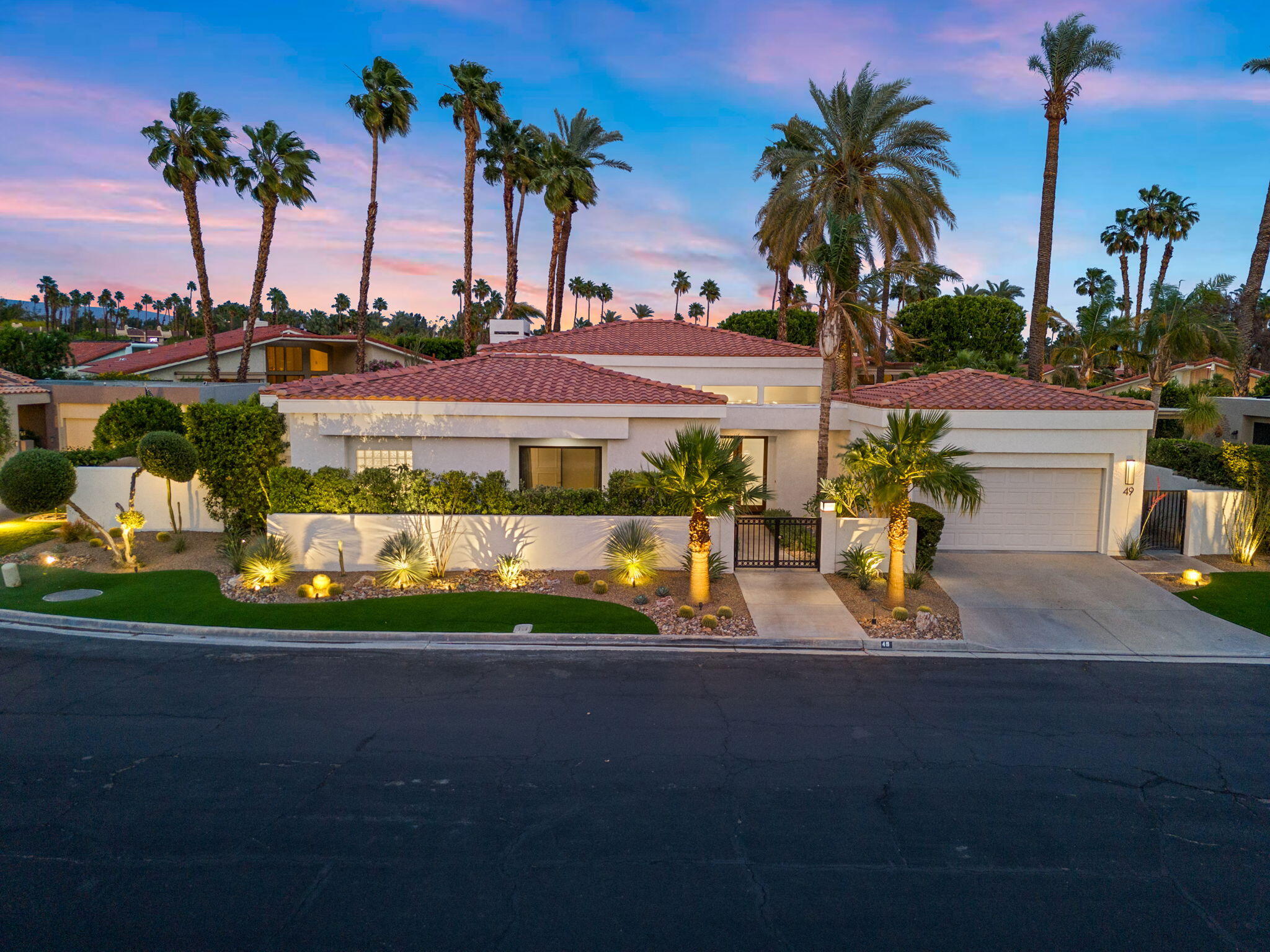 Architectural Luxury in the Heart of Rancho Mirage. Welcome to your private designer retreat in the exclusive gated enclave of Mission Pointe--a rare opportunity to own the original model home, architecturally distinct and meticulously reimagined for modern luxury living.Set on a generous 10,000+ sq ft lot, this 3-bedroom, 4-bath residence blends dramatic contemporary design with refined sophistication. A private courtyard entry opens to stunning interiors anchored by Italian 24'' x 48'' porcelain tile and soaring ceilings that amplify light and space throughout. Every room connects seamlessly to the outdoors via oversized sliders, creating a harmonious indoor-outdoor flow ideal for desert living.The open-concept living and dining gallery is enhanced by a custom sunken bar--a nod to classic Palm Springs entertaining--while a sculptural fireplace adorned with handcrafted tile adds a focal point of artistry and warmth. Curated LED lighting, bespoke wall textures, designer wallpapers, and custom millwork elevate each space with effortless style.The gourmet island kitchen is a chef's dream, featuring leathered stone countertops, premium Italian appliances, Monogram refrigeration, Bosch speed oven, and a cozy breakfast lounge with garden views.All three-bedroom suites offer private luxury, including spacious closets and spa-inspired baths. The main primary suite features a California Closet system with integrated lighting and the junior primary has a stunning mountain view--a true retreat.Outside, professionally designed landscaping frames the sparkling Pebble Tec pool and spa, complete with integrated lighting and multiple lounging areas--surrounded by mature palms and lush greenery for ultimate privacy.Additional features include an epoxy-finished two-car garage with custom storage and pet wash station, indoor laundry, and a low HOA offering access to a private gym, tennis, and pickleball courts.This one-of-a-kind residence offers a rare combination of architectural diInterested in this Listing?