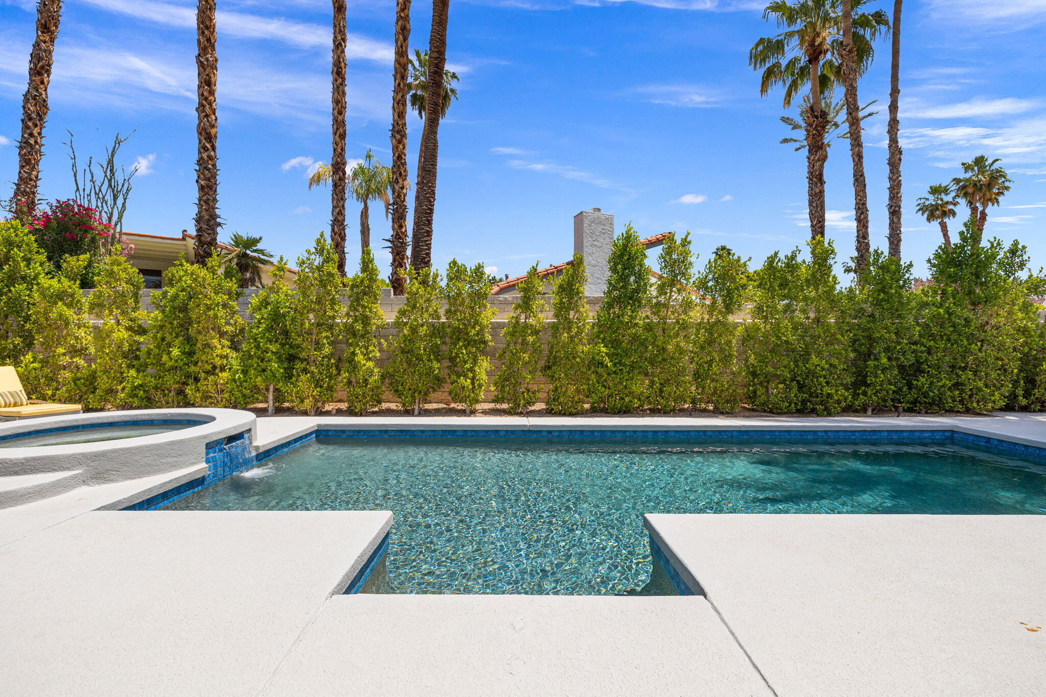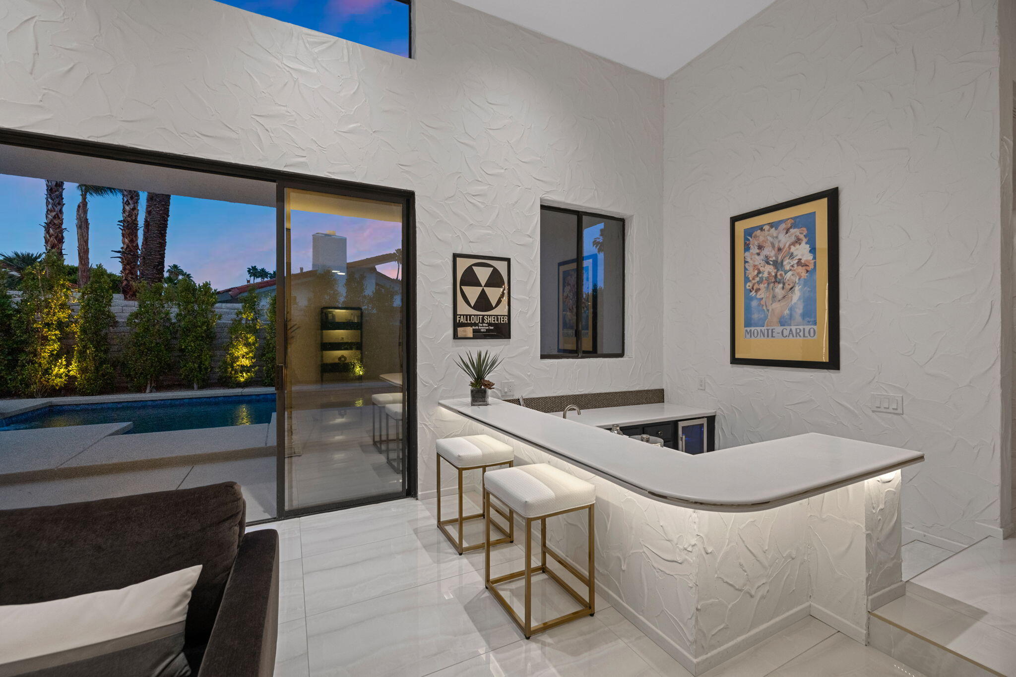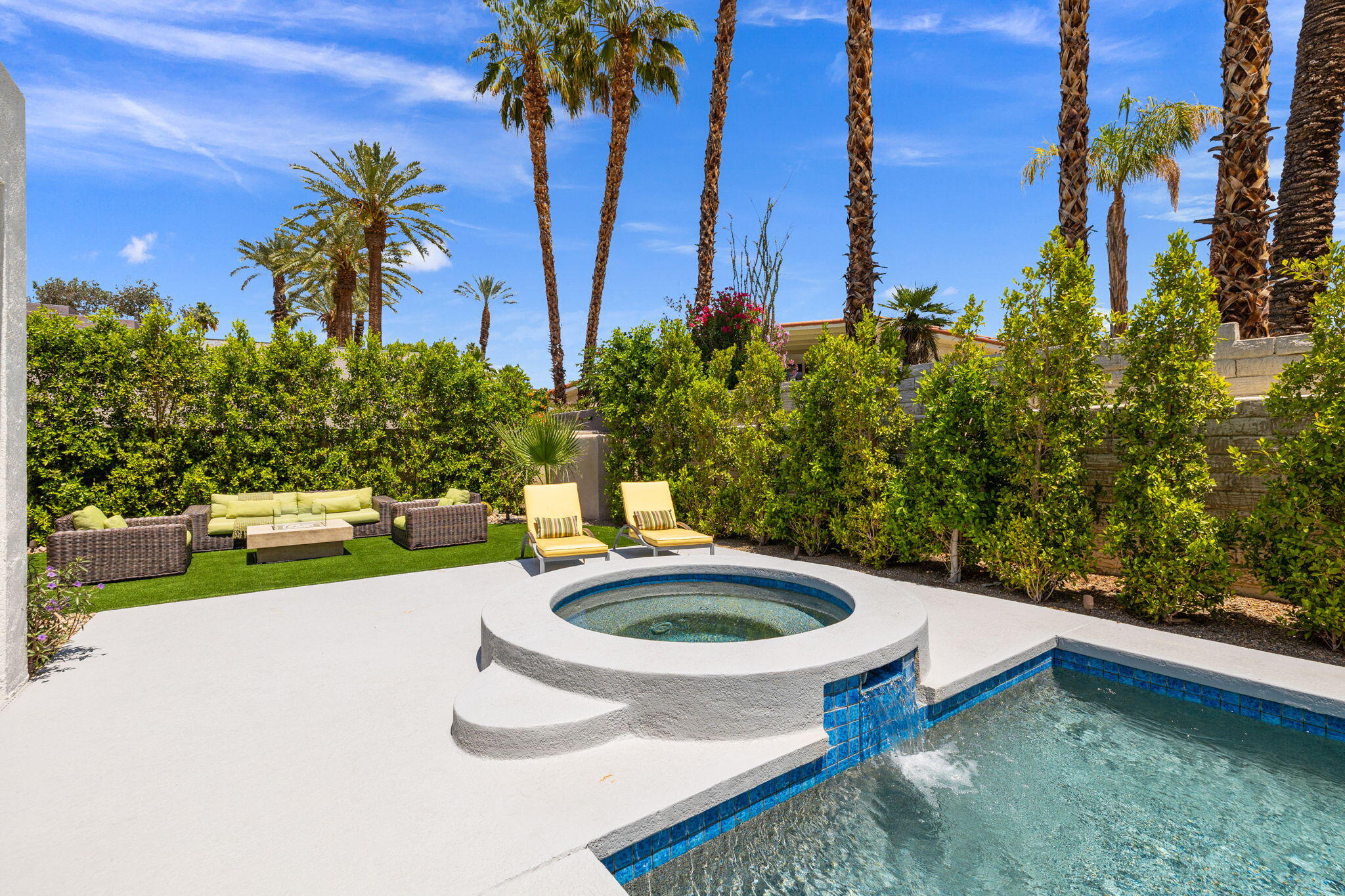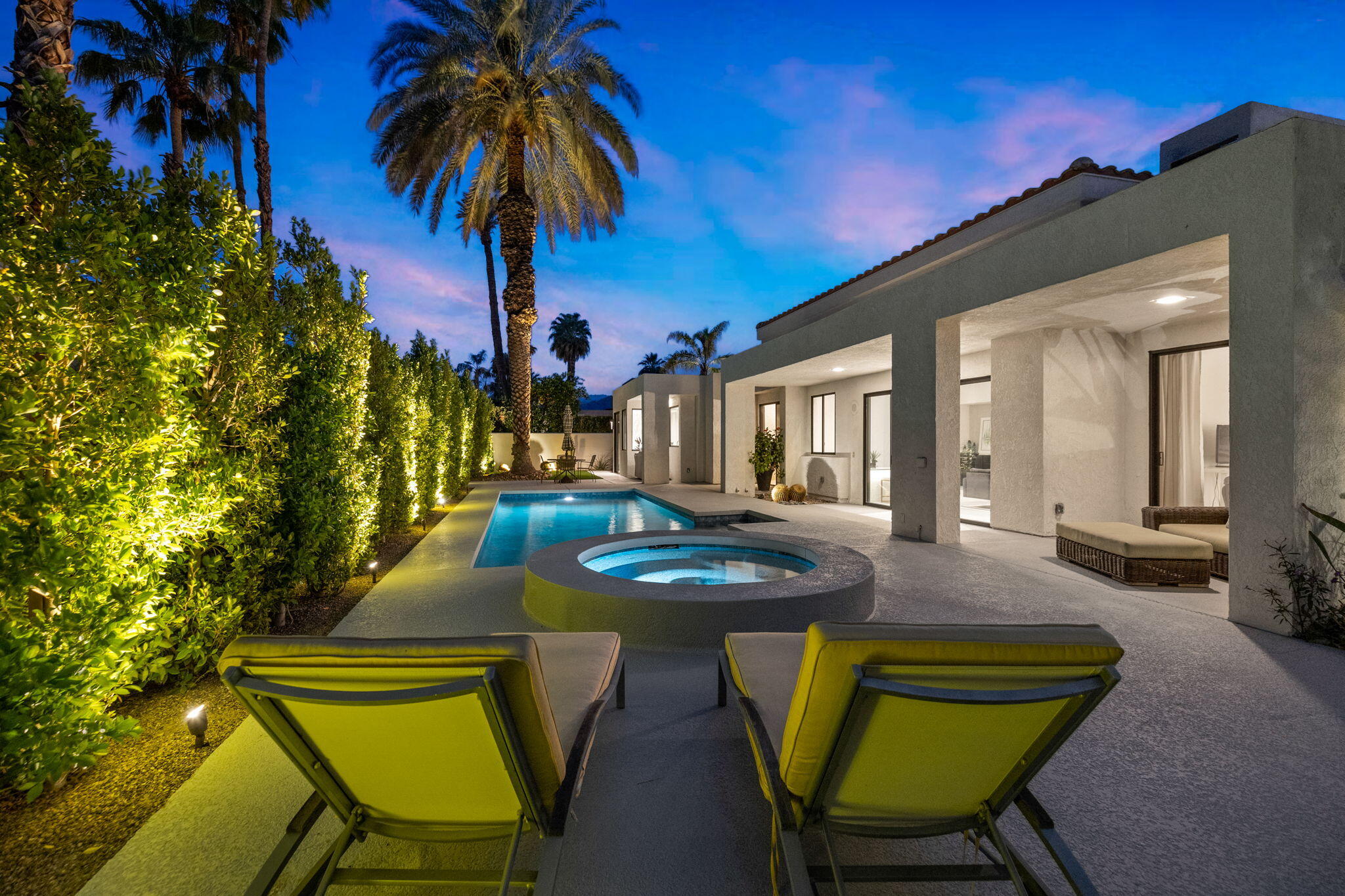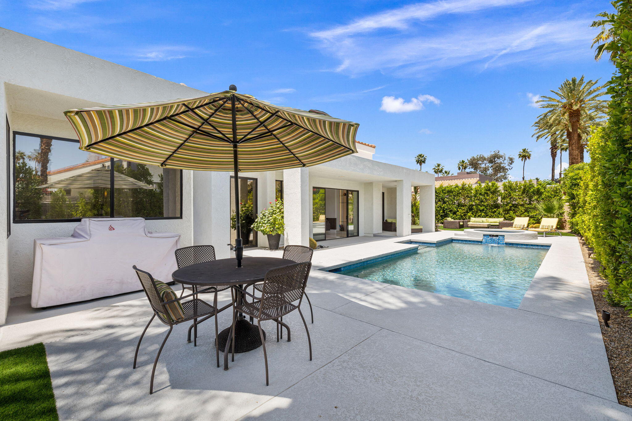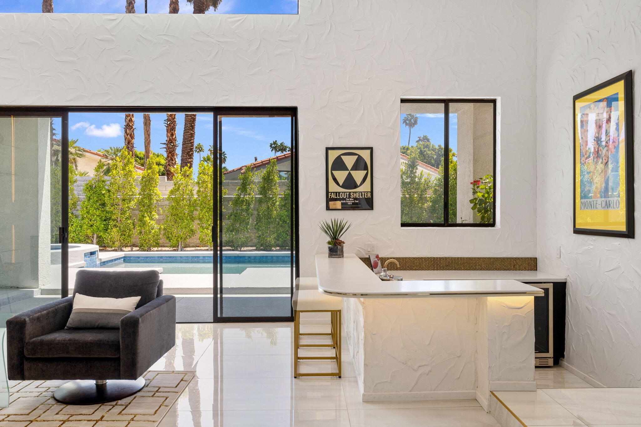 Architectural Luxury in the Heart of Rancho Mirage. Welcome to your private designer retreat in the exclusive gated enclave of Mission Pointe--a rare opportunity to own the original model home, architecturally distinct and meticulously reimagined for modern luxury living.Set on a generous 10,000+ sq ft lot, this 3-bedroom, 4-bath residence blends dramatic contemporary design with refined sophistication. A private courtyard entry opens to stunning interiors anchored by Italian 24'' x 48'' porcelain tile and soaring ceilings that amplify light and space throughout. Every room connects seamlessly to the outdoors via oversized sliders, creating a harmonious indoor-outdoor flow ideal for desert living.The open-concept living and dining gallery is enhanced by a custom sunken bar--a nod to classic Palm Springs entertaining--while a sculptural fireplace adorned with handcrafted tile adds a focal point of artistry and warmth. Curated LED lighting, bespoke wall textures, designer wallpapers, and custom millwork elevate each space with effortless style.The gourmet island kitchen is a chef's dream, featuring leathered stone countertops, premium Italian appliances, Monogram refrigeration, Bosch speed oven, and a cozy breakfast lounge with garden views.All three-bedroom suites offer private luxury, including spacious closets and spa-inspired baths. The main primary suite features a California Closet system with integrated lighting and the junior primary has a stunning mountain view--a true retreat.Outside, professionally designed landscaping frames the sparkling Pebble Tec pool and spa, complete with integrated lighting and multiple lounging areas--surrounded by mature palms and lush greenery for ultimate privacy.Additional features include an epoxy-finished two-car garage with custom storage and pet wash station, indoor laundry, and a low HOA offering access to a private gym, tennis, and pickleball courts.This one-of-a-kind residence offers a rare combination of architectural diInterested in this Listing?