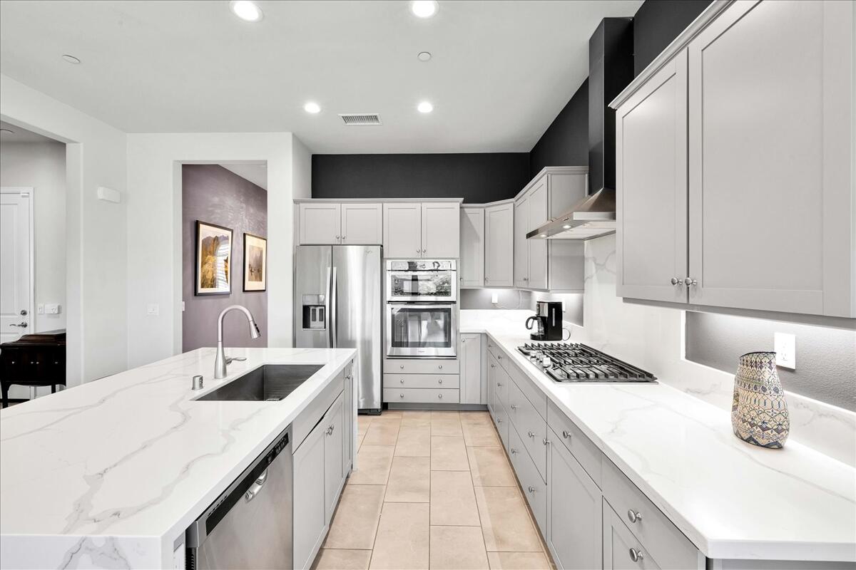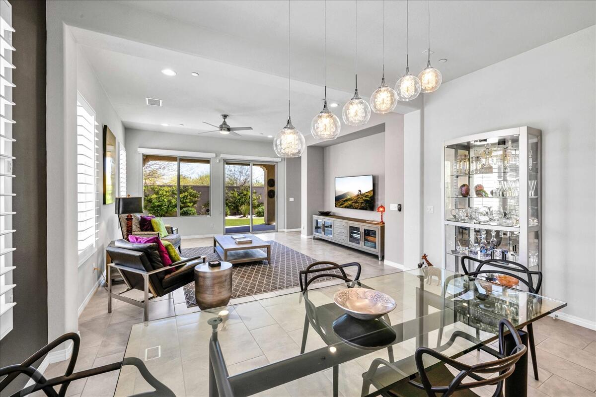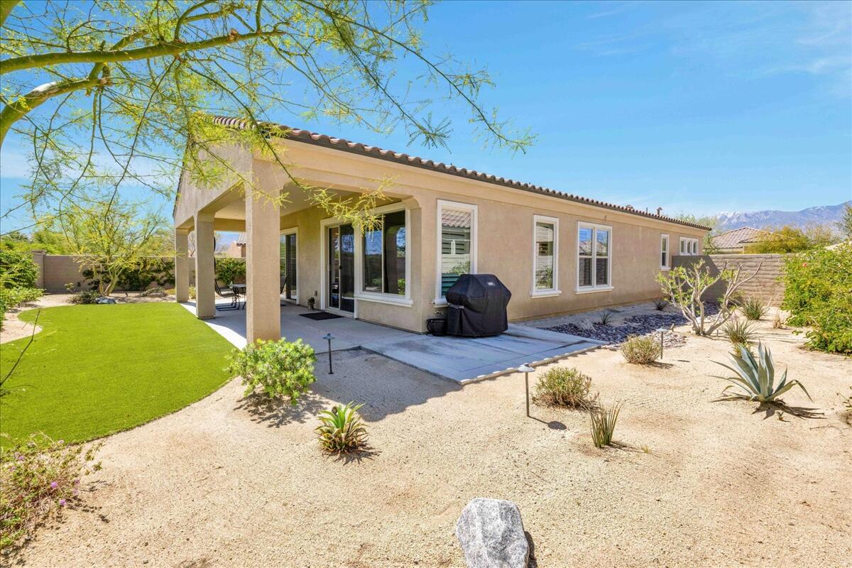 Embrace the Desert's upscale 55+ active adult community--Del Webb at Rancho Mirage. Your own 'SOLITUDE' model home awaits. Premium location on oversized lot featuring extended rear patio cover with lush desert curb appeal. OWNED solar. Refreshed contemporary style home with modern clean lines & bright interior. High ceilings and oversize windows frame picturesque desert views. Private enclosed backyard overlooks expansive open space. Low maintenance landscape feels lush with synthetic turf and mature trees. Gourmet kitchen features 6-burner cooktop, wall oven microwave combo. Tasteful gray cabinetry, gorgeous oversize quartz waterfall island, quartz counters and backsplash, large pantry. Stunning pendant chandelier lights adjacent dining. Spacious primary suite with slider to back patio, spa-like bath and walk-in closet. Layout inviting for guests--2nd bedroom and bath PLUS den. Modern ceiling fans, easy-care plank-style tile flooring, carpet in bedrooms. Custom window shades & shutters. Eye-catching accent walls, designer wallpaper & tile. Newer Toto toilets. So many upgrades to fixtures & finishes! Laundry boasts added storage cabinetry. Gated community offers world-class amenities to enjoy: 24-hr guard gate entrance, miles of meandering pathways, Outlook Community Center, resort-style pool & spa, tennis, pickleball, bocce, fitness center and more. Enjoy gorgeous interior, lounge outdoors, stargaze--this property is the IDEAL place to call HOME! Stop searching and START living!Interested in this Listing?