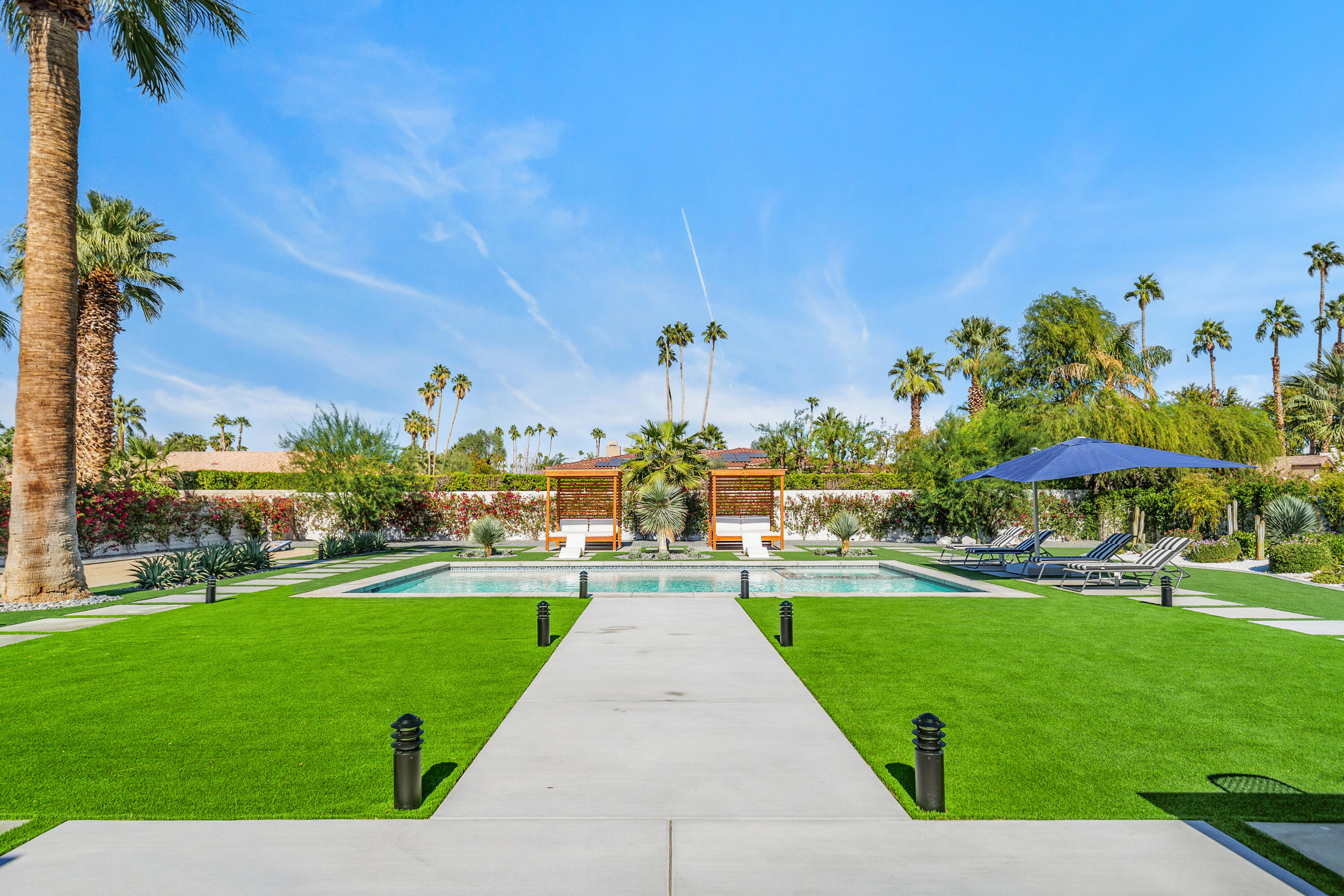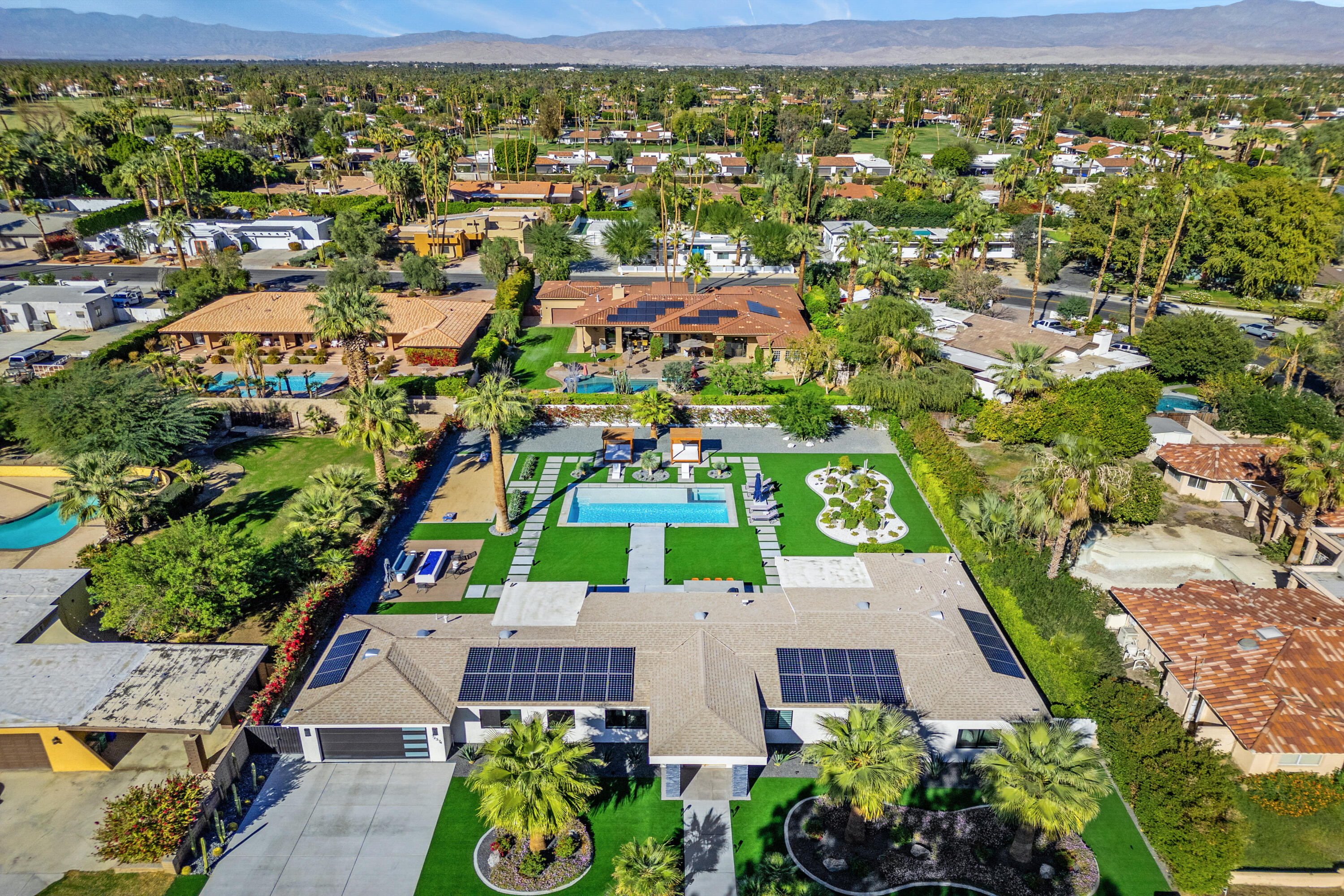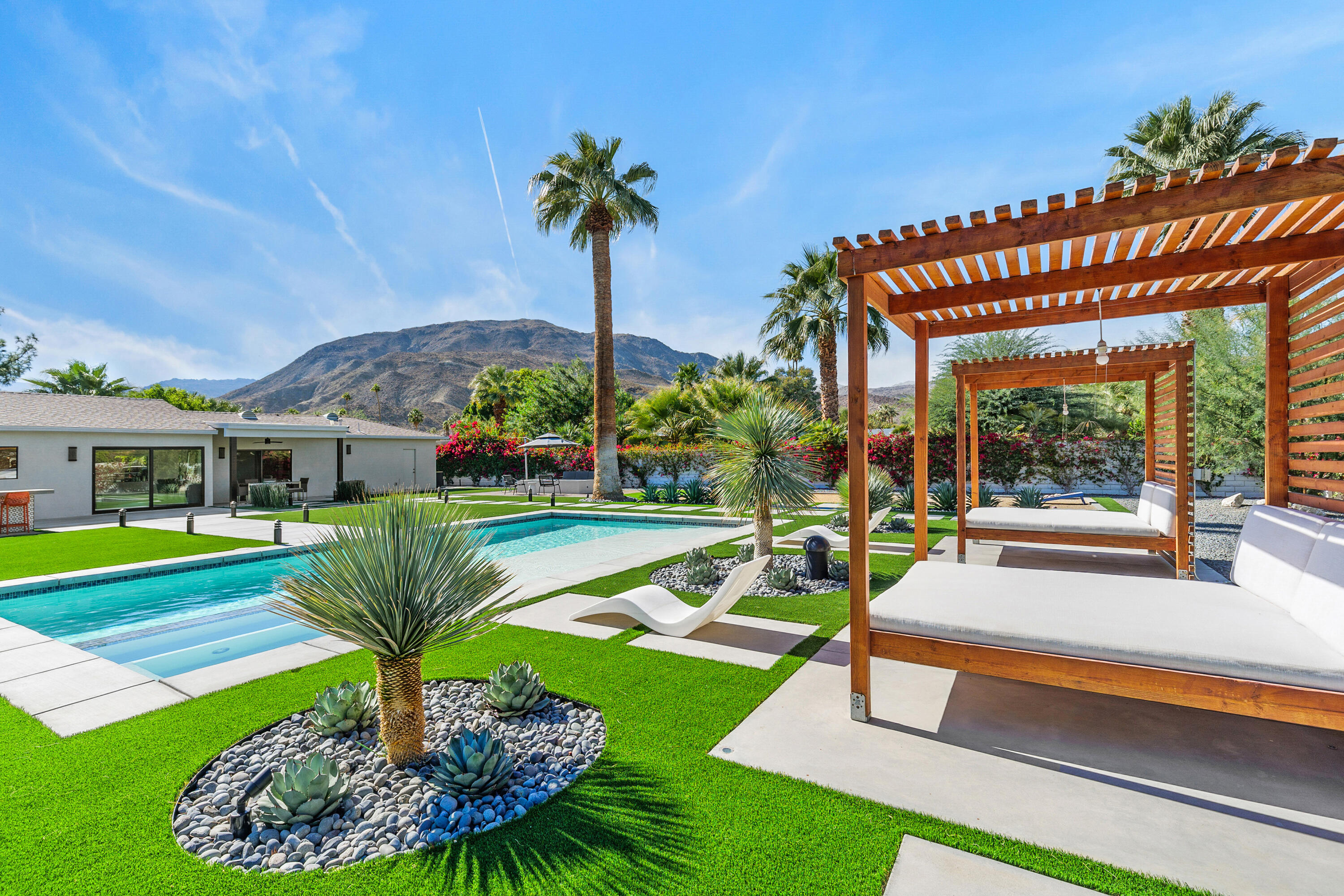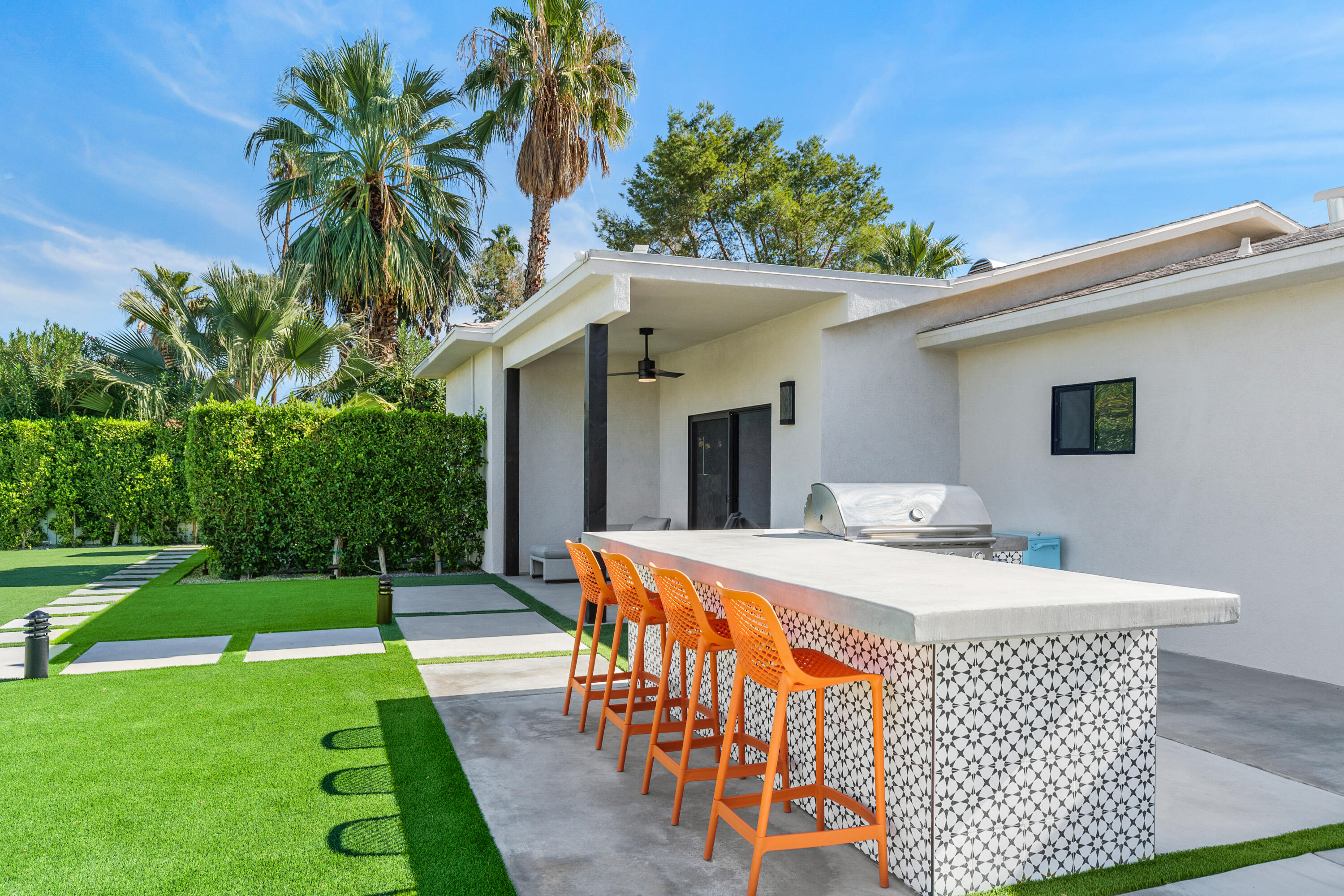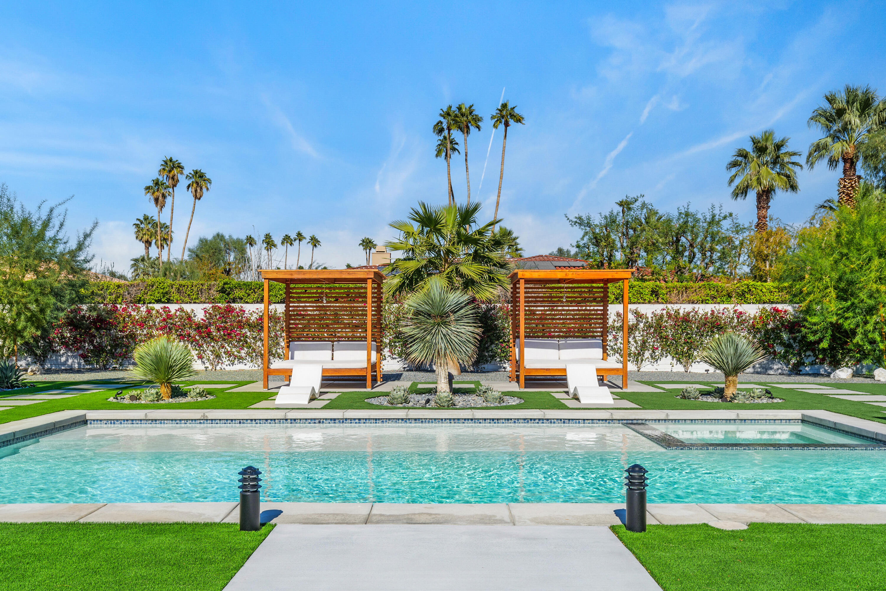 Welcome to a beautiful modern retreat in Rancho Mirage, where luxury and timeless design meet. This 4-bedroom, 3-bathroom home, set on a private .42-acre lot, captures the essence of resort-like living with sweeping mountain views and sophisticated indoor-outdoor spaces. The light-filled Great Room greets you with floor-to-ceiling windows, vaulted wood plank ceilings, and contemporary light fixtures. Concrete-look porcelain tile flooring and a sleek electric fireplace add a touch of refined elegance. The gourmet kitchen features Viking appliances, a wine fridge, waterfall quartz countertops, and a spacious breakfast bar. The primary suite is a true sanctuary with custom finishes, a walk-in shower, dual sinks, and a well-organized closet. An additional suite with a private entrance and kitchenette offers a versatile casita option. A leased solar system ensures energy efficiency. Outside, this home is an entertainer's dream. Privacy walls surround the backyard's custom pool, spa, tanning shelf, two luxury cabanas, a fire pit, a bocce ball court, and BBQ. Landscape lighting enhances the space, creating a stunning desert oasis. Situated in the heart of Rancho Mirage, this property is minutes from Palm Springs, Palm Desert, and the famed El Paseo shopping district, with easy access to golf courses, hiking, and top dining. This home offers a blend of privacy, elegance, and modern desert living in one of the Coachella Valley's most desirable locations.Interested in this Listing?