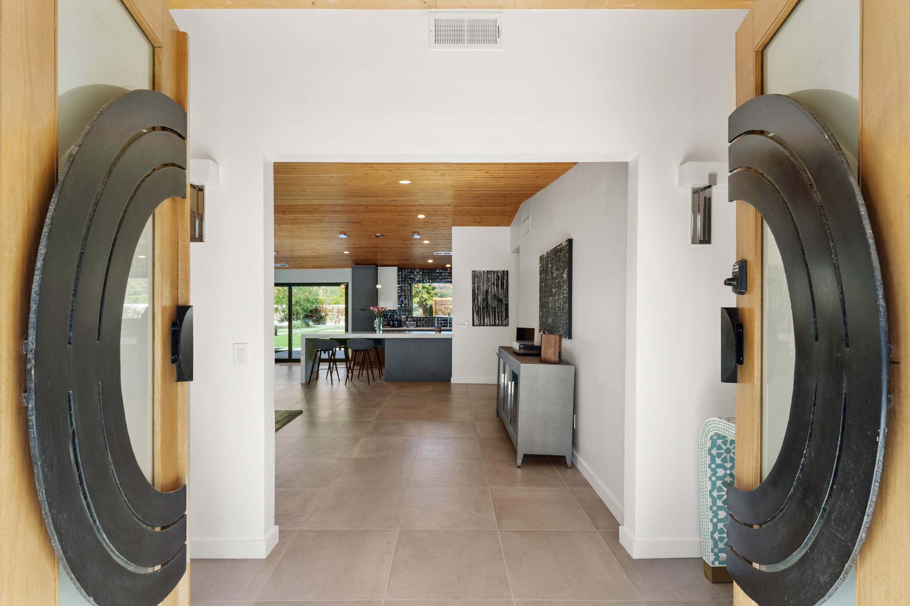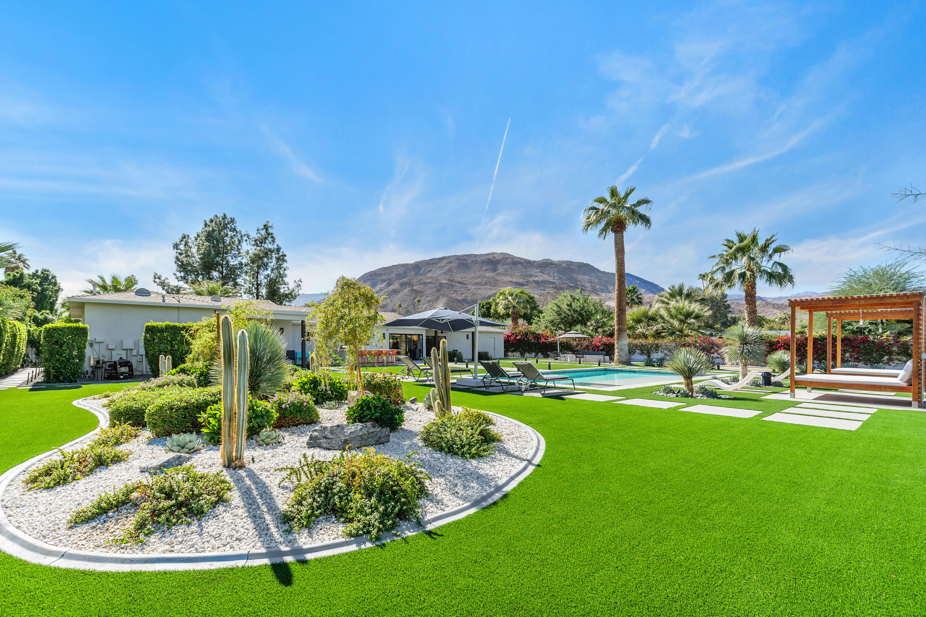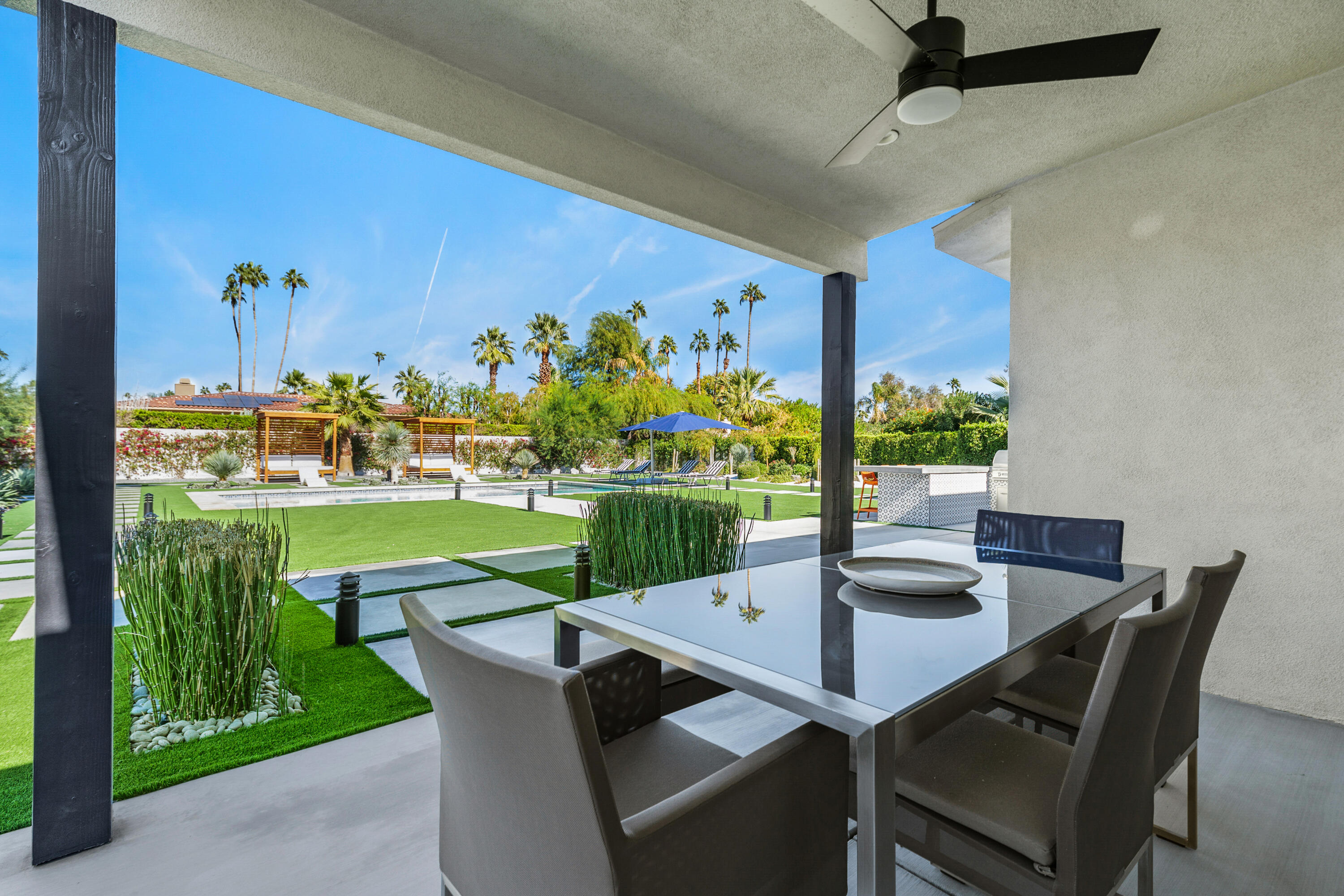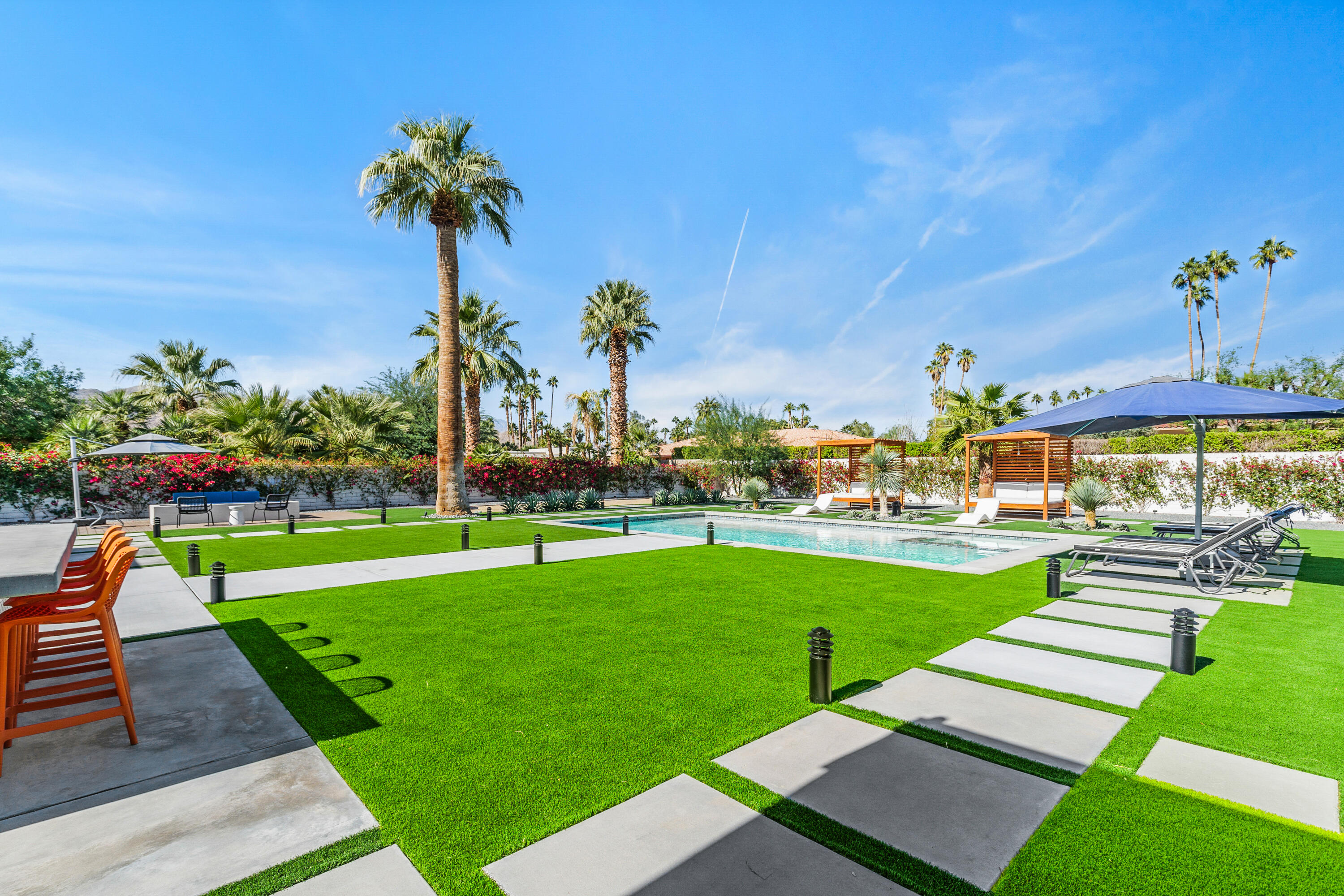 Welcome to a beautiful modern retreat in Rancho Mirage, where luxury and timeless design meet. This 4-bedroom, 3-bathroom home, set on a private .42-acre lot, captures the essence of resort-like living with sweeping mountain views and sophisticated indoor-outdoor spaces. The light-filled Great Room greets you with floor-to-ceiling windows, vaulted wood plank ceilings, and contemporary light fixtures. Concrete-look porcelain tile flooring and a sleek electric fireplace add a touch of refined elegance. The gourmet kitchen features Viking appliances, a wine fridge, waterfall quartz countertops, and a spacious breakfast bar. The primary suite is a true sanctuary with custom finishes, a walk-in shower, dual sinks, and a well-organized closet. An additional suite with a private entrance and kitchenette offers a versatile casita option. A leased solar system ensures energy efficiency. Outside, this home is an entertainer's dream. Privacy walls surround the backyard's custom pool, spa, tanning shelf, two luxury cabanas, a fire pit, a bocce ball court, and BBQ. Landscape lighting enhances the space, creating a stunning desert oasis. Situated in the heart of Rancho Mirage, this property is minutes from Palm Springs, Palm Desert, and the famed El Paseo shopping district, with easy access to golf courses, hiking, and top dining. This home offers a blend of privacy, elegance, and modern desert living in one of the Coachella Valley's most desirable locations.Interested in this Listing?