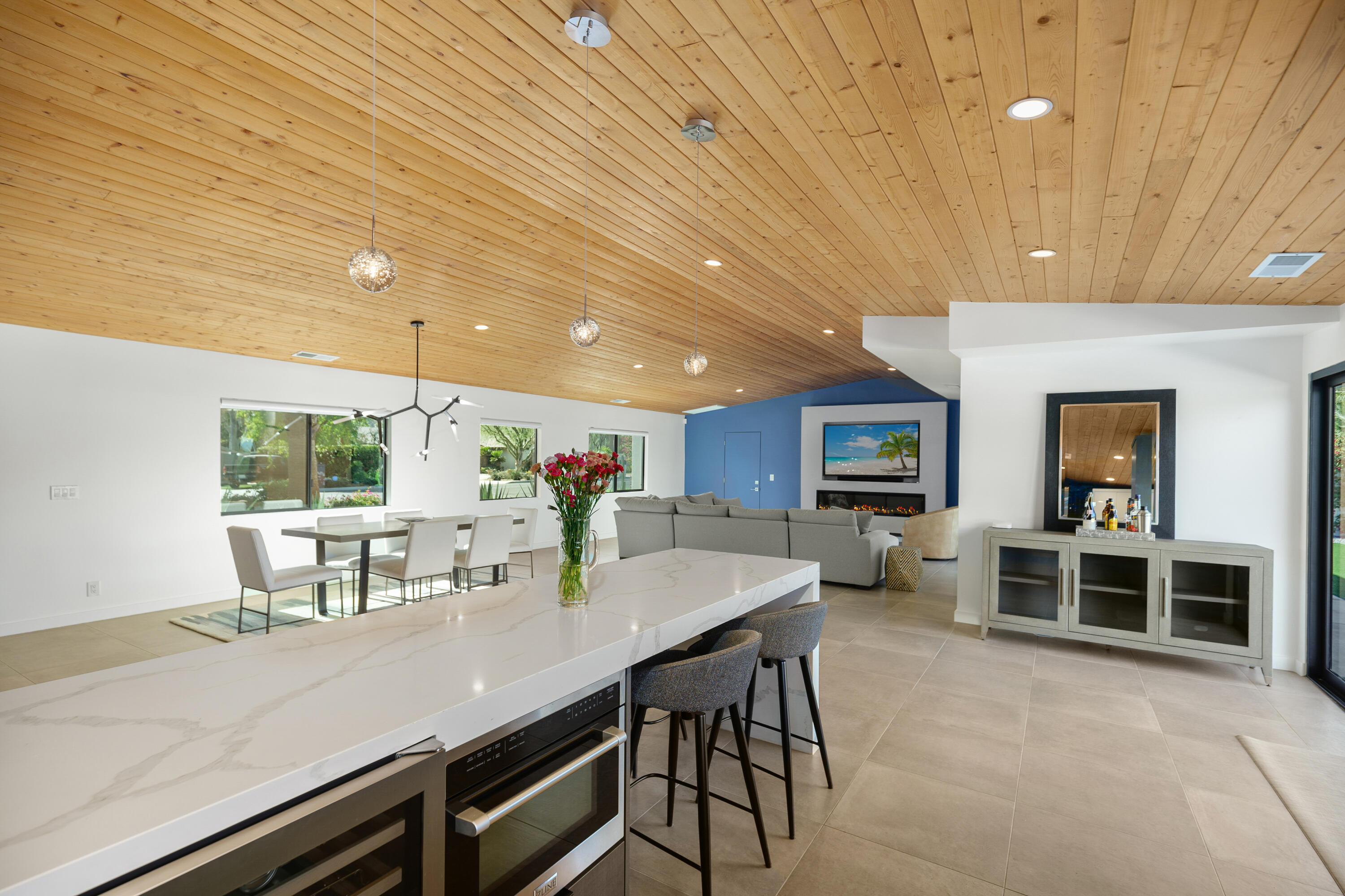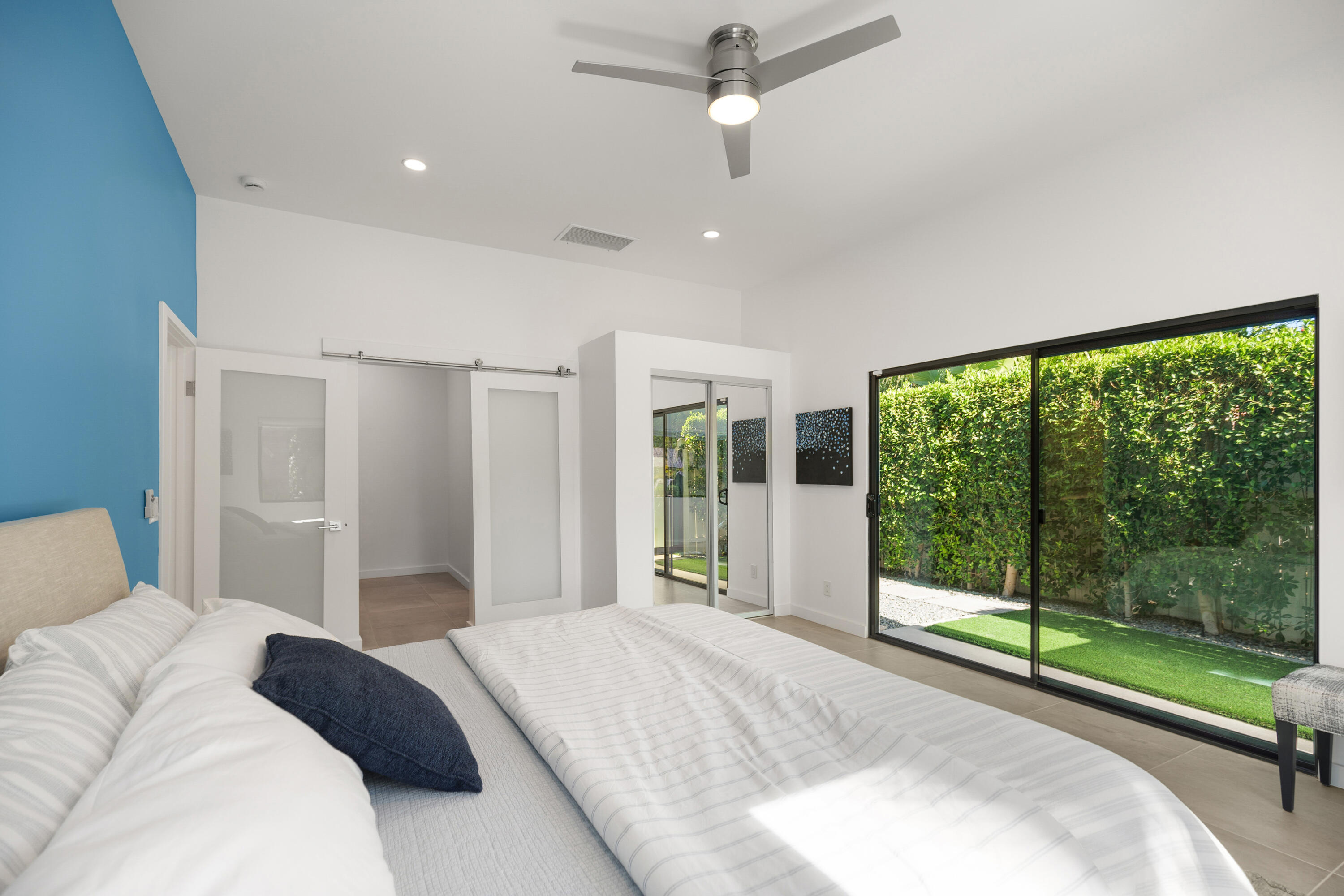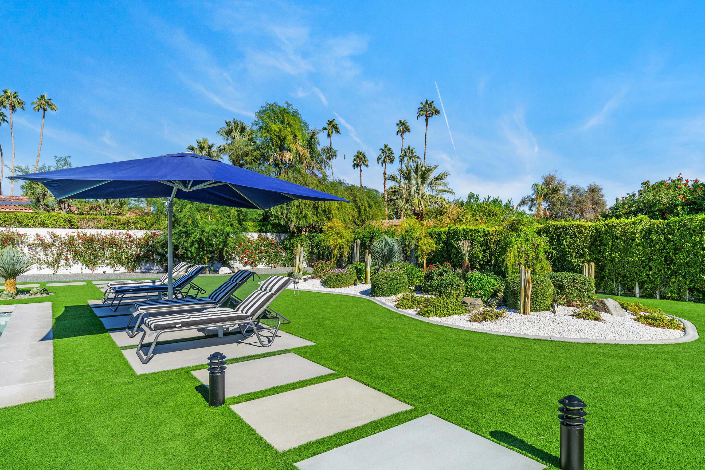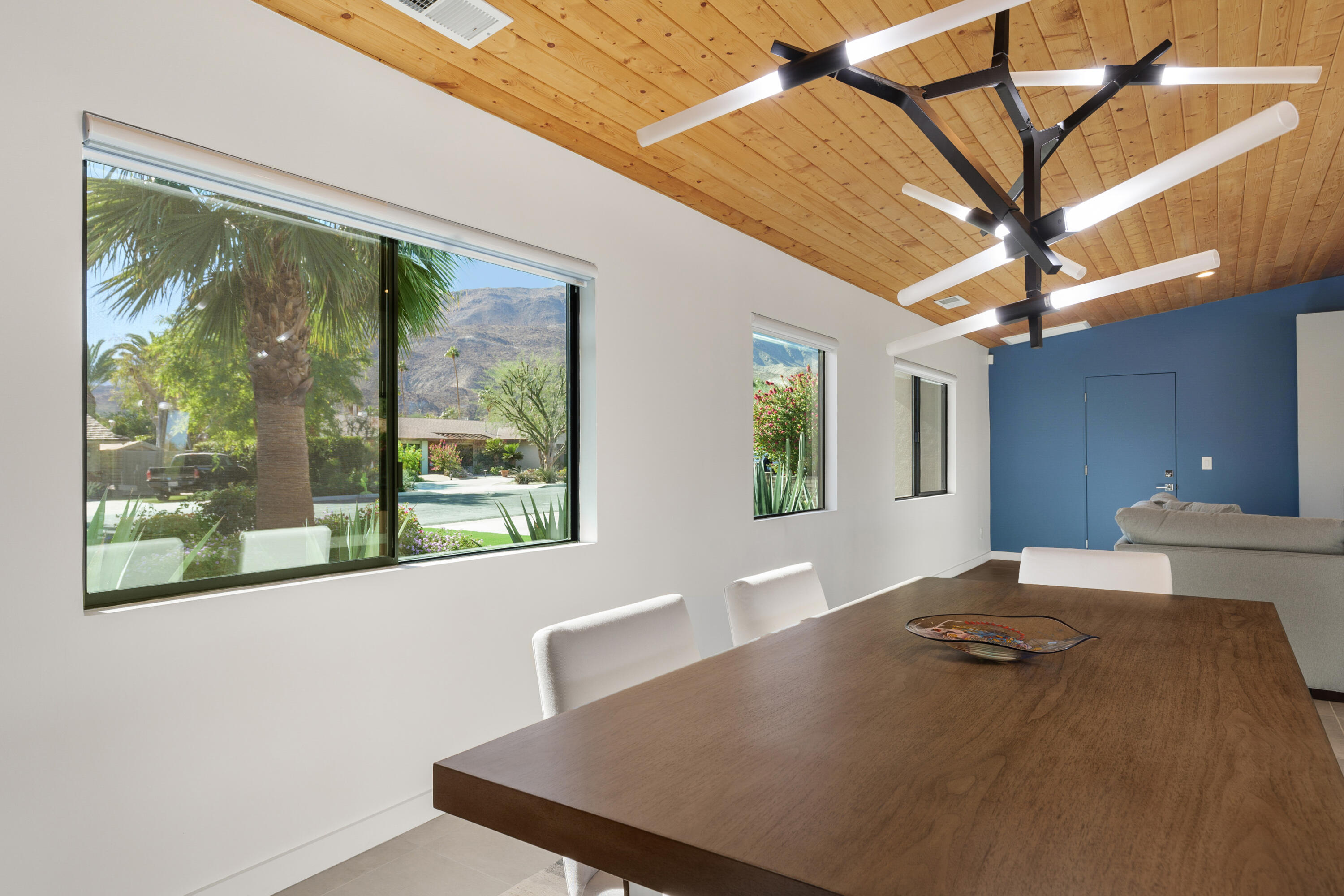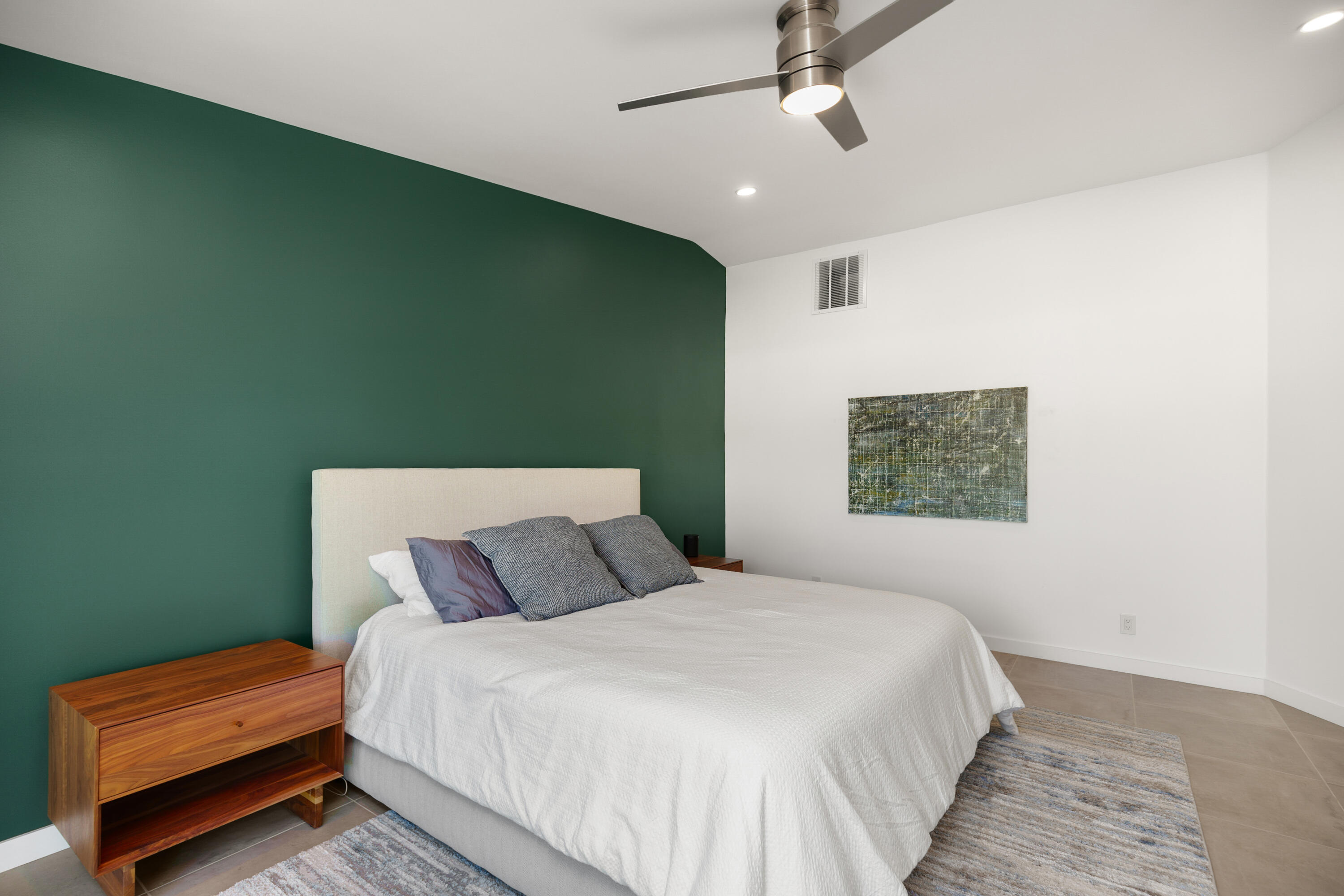 Welcome to a beautiful modern retreat in Rancho Mirage, where luxury and timeless design meet. This 4-bedroom, 3-bathroom home, set on a private .42-acre lot, captures the essence of resort-like living with sweeping mountain views and sophisticated indoor-outdoor spaces. The light-filled Great Room greets you with floor-to-ceiling windows, vaulted wood plank ceilings, and contemporary light fixtures. Concrete-look porcelain tile flooring and a sleek electric fireplace add a touch of refined elegance. The gourmet kitchen features Viking appliances, a wine fridge, waterfall quartz countertops, and a spacious breakfast bar. The primary suite is a true sanctuary with custom finishes, a walk-in shower, dual sinks, and a well-organized closet. An additional suite with a private entrance and kitchenette offers a versatile casita option. A leased solar system ensures energy efficiency. Outside, this home is an entertainer's dream. Privacy walls surround the backyard's custom pool, spa, tanning shelf, two luxury cabanas, a fire pit, a bocce ball court, and BBQ. Landscape lighting enhances the space, creating a stunning desert oasis. Situated in the heart of Rancho Mirage, this property is minutes from Palm Springs, Palm Desert, and the famed El Paseo shopping district, with easy access to golf courses, hiking, and top dining. This home offers a blend of privacy, elegance, and modern desert living in one of the Coachella Valley's most desirable locations.Interested in this Listing?