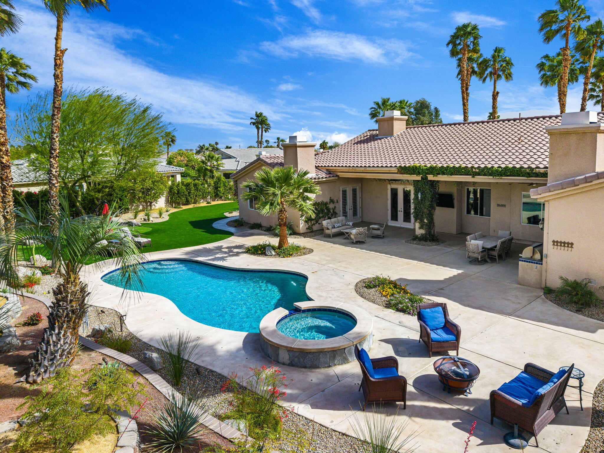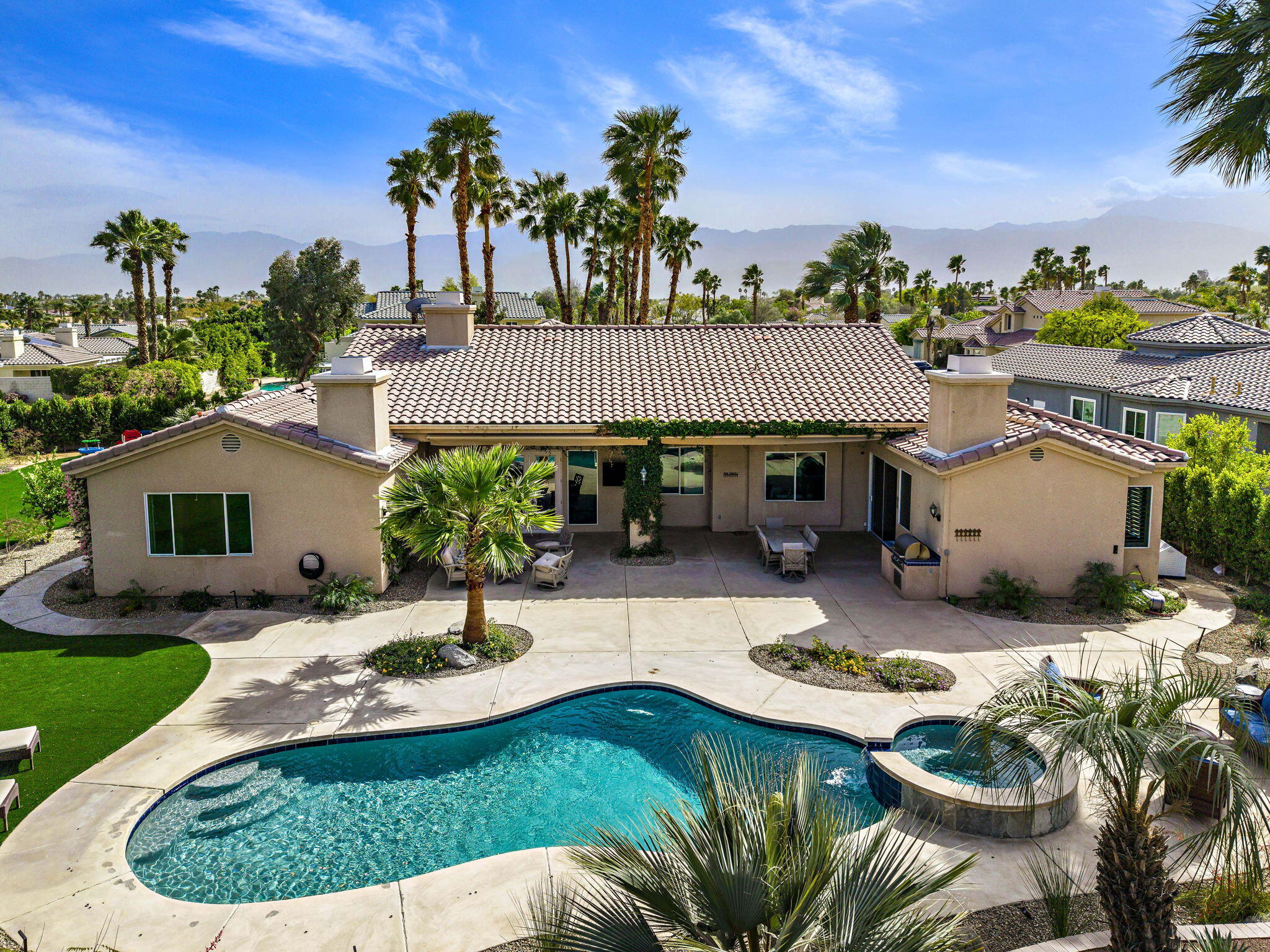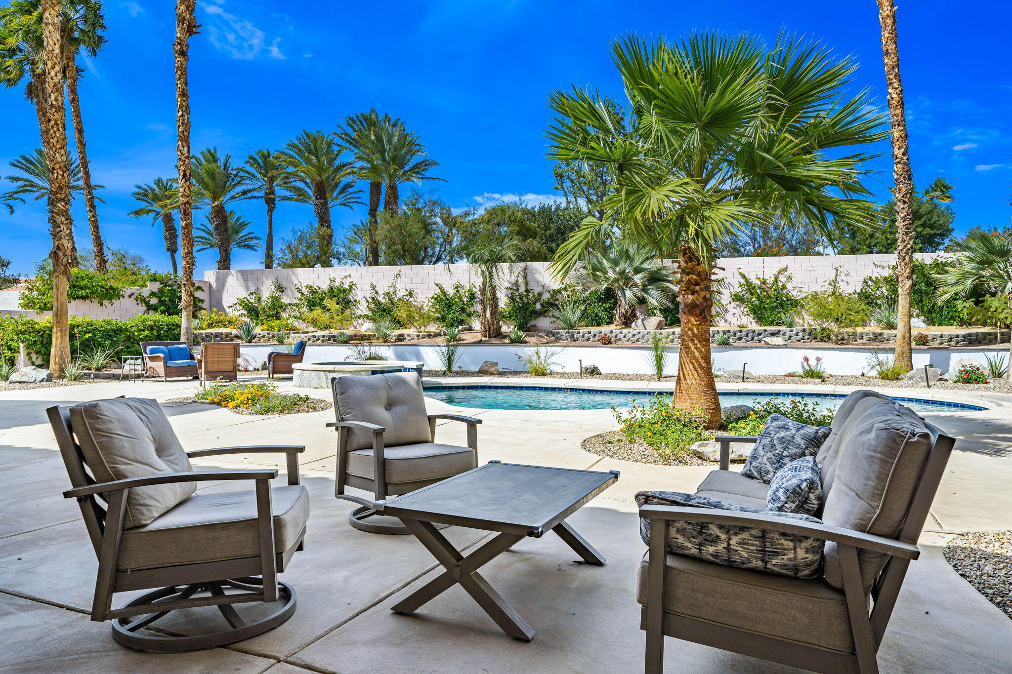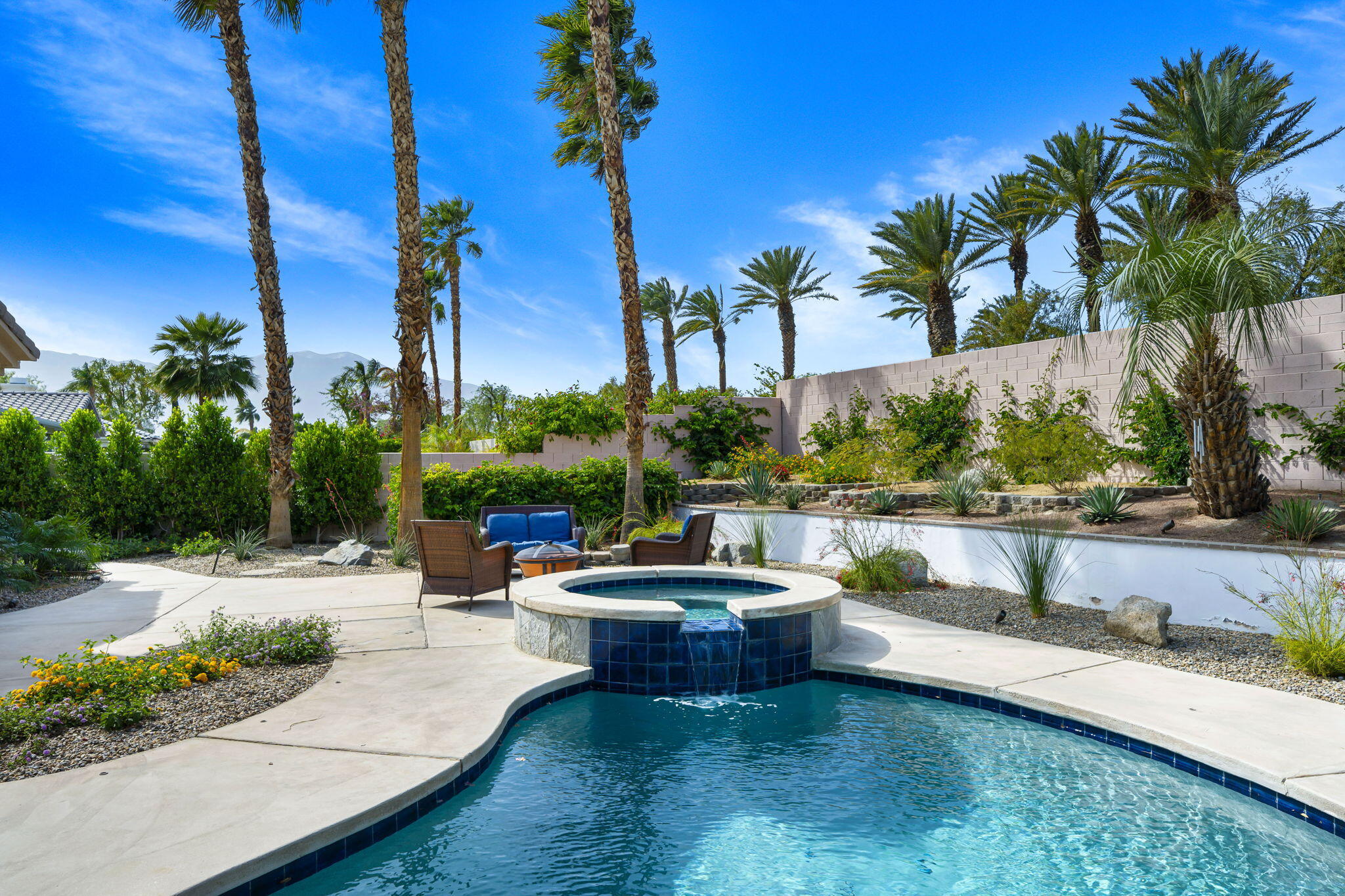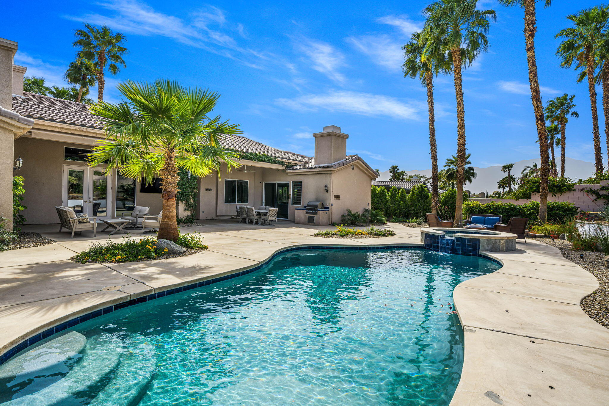 Nestled at the end of a quiet Col-De-Sac, situated on nearly Half an Acre, this elegant Five Bedroom, Five Bathroom home is Ideal for a large family looking for a home in the heart of Rancho Mirage. Enter the home from the charming courtyard into a large circular entryway, leading to the Formal Living Room with Travertine Tiled Flooring and step down bar, with Walls of Glass over looking the backyard with Sparkling Pool. Off the living room is situated the Formal Dining room, perfect for entertaining friends and family. The Kitchen with Granite Countertops, white cabinetry and appliances, with under counter seating. A Cozy Family Room off the kitchen with Fireplace and sliding glass door that leads out to the Back Patio and Built in Barbeque. Four ample sized bedrooms. A Detached Casita with its Own Entry. The Primary bedroom suit with Fireplace and sliding glass door out to the patio. A Large Primary Bathroom with Soaking Tub and sizeable shower with travertine Tiled Walls. A Substantial Walk in Closet with built in dresser and plenty of hanging space. The large back and side yard with patio over hang and electric awning for Alfresco Living and Dining with views of the San Jacinto Mountain. Victoria Falls amenities included Tennis, Pickleball and Basketball. Come home to your own, private desert retreat!Interested in this Listing?