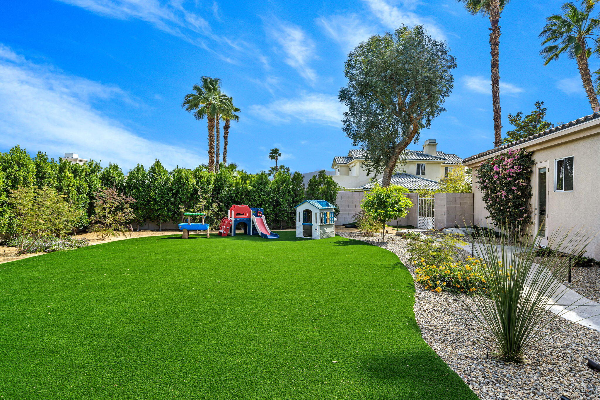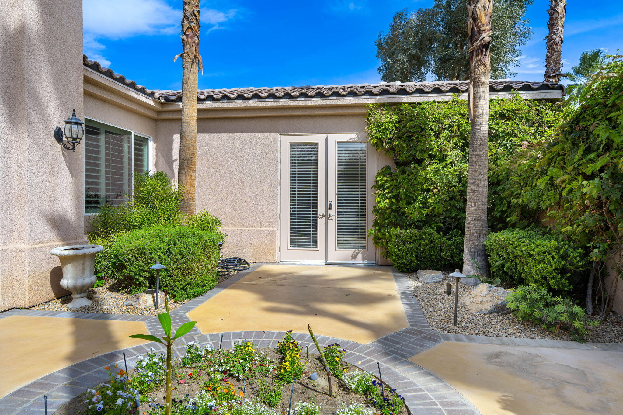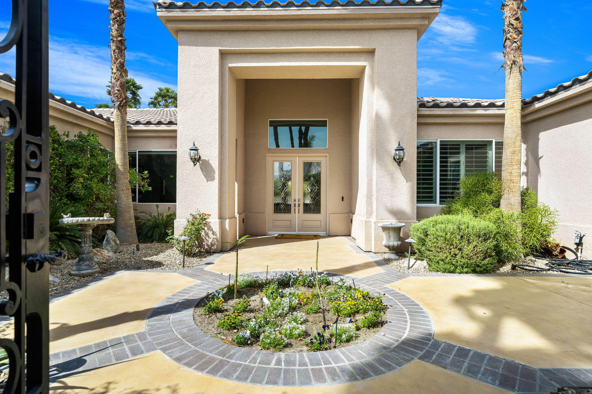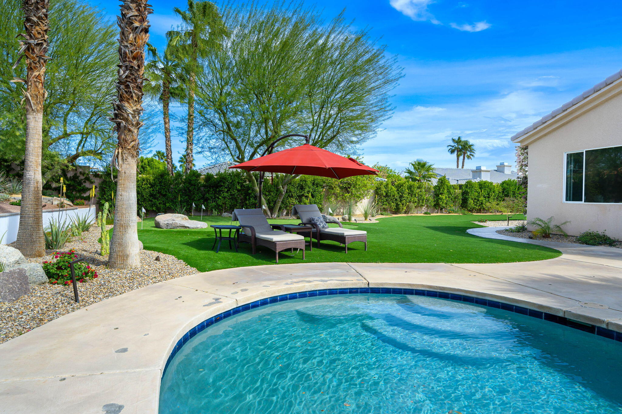 Nestled at the end of a quiet Col-De-Sac, situated on nearly Half an Acre, this elegant Five Bedroom, Five Bathroom home is Ideal for a large family looking for a home in the heart of Rancho Mirage. Enter the home from the charming courtyard into a large circular entryway, leading to the Formal Living Room with Travertine Tiled Flooring and step down bar, with Walls of Glass over looking the backyard with Sparkling Pool. Off the living room is situated the Formal Dining room, perfect for entertaining friends and family. The Kitchen with Granite Countertops, white cabinetry and appliances, with under counter seating. A Cozy Family Room off the kitchen with Fireplace and sliding glass door that leads out to the Back Patio and Built in Barbeque. Four ample sized bedrooms. A Detached Casita with its Own Entry. The Primary bedroom suit with Fireplace and sliding glass door out to the patio. A Large Primary Bathroom with Soaking Tub and sizeable shower with travertine Tiled Walls. A Substantial Walk in Closet with built in dresser and plenty of hanging space. The large back and side yard with patio over hang and electric awning for Alfresco Living and Dining with views of the San Jacinto Mountain. Victoria Falls amenities included Tennis, Pickleball and Basketball. Come home to your own, private desert retreat!Interested in this Listing?
