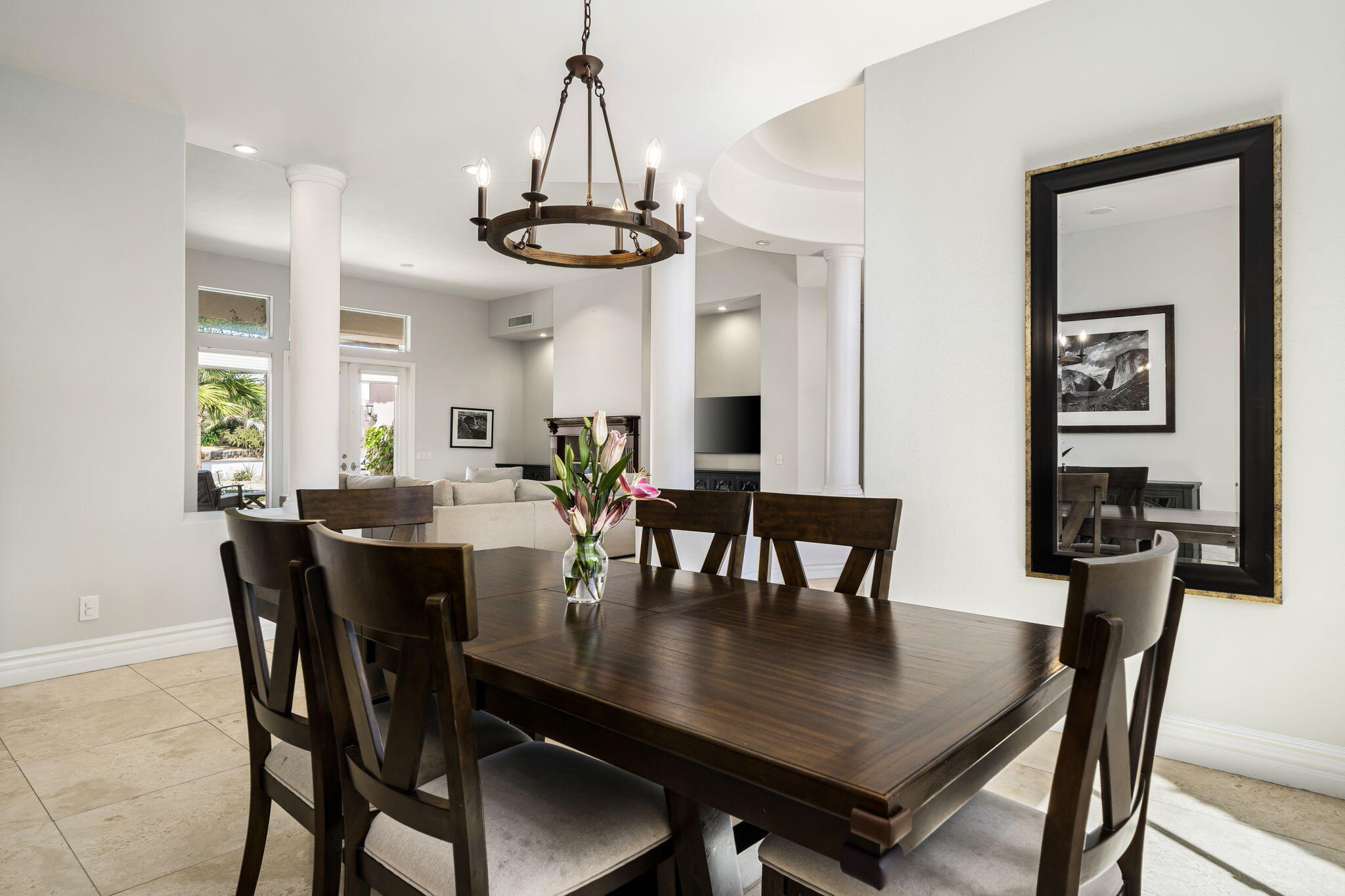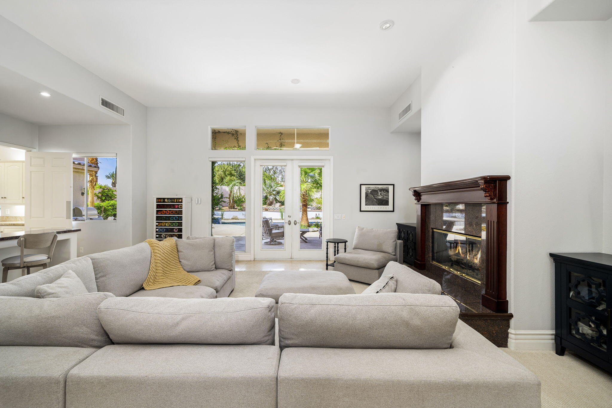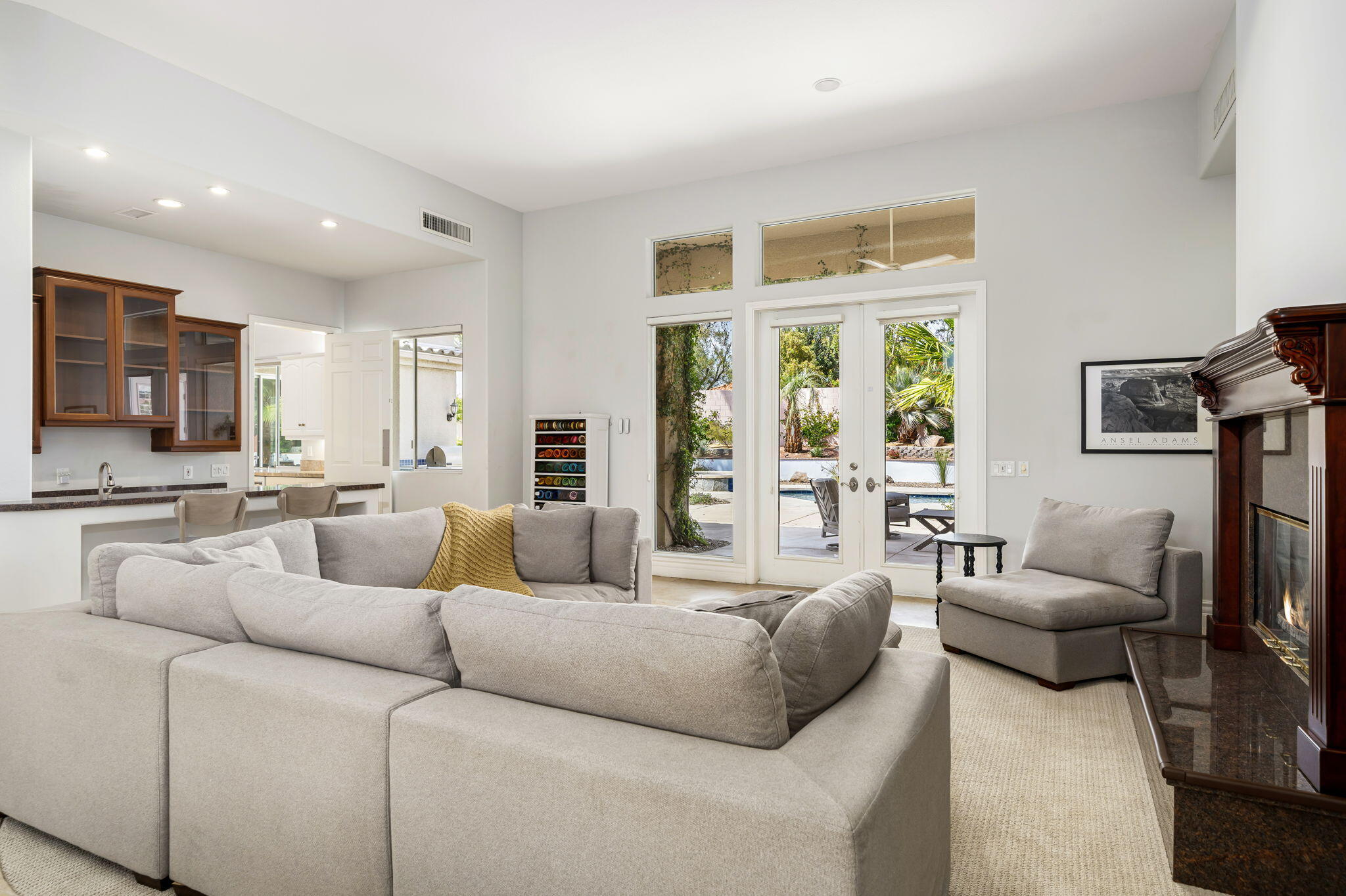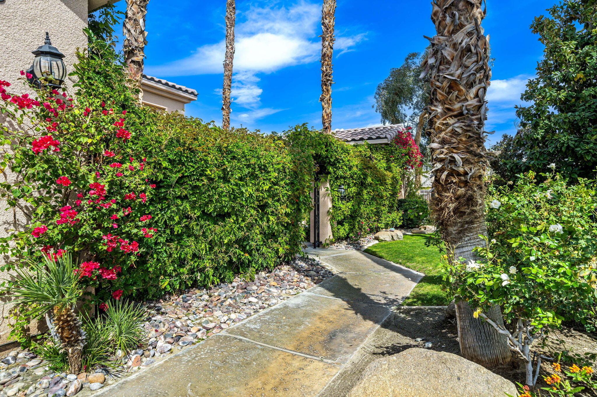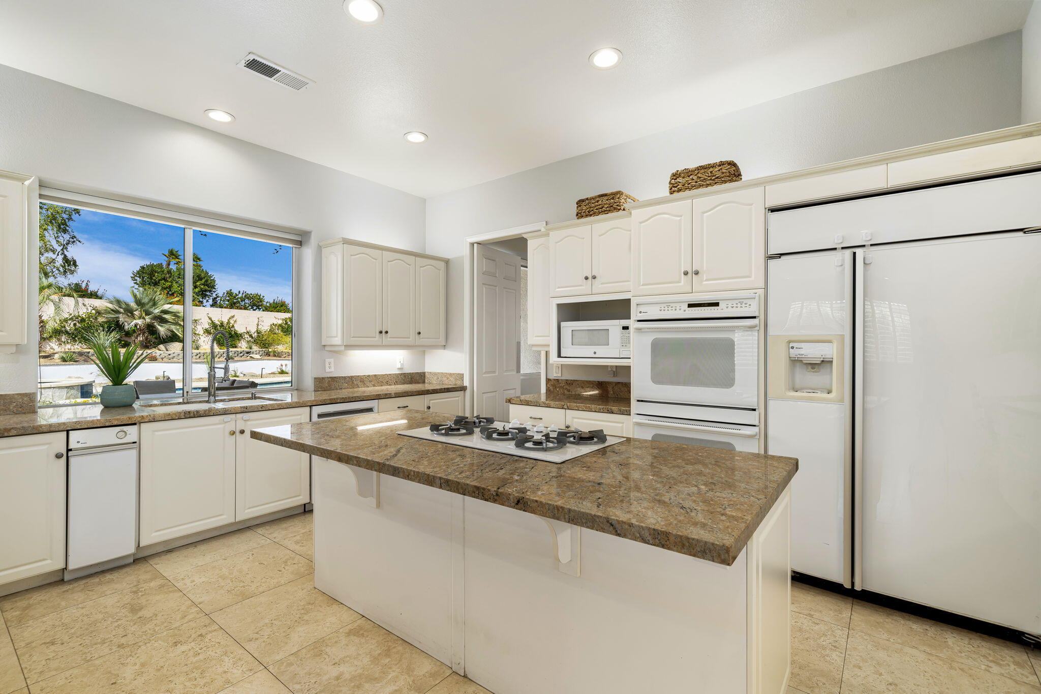 Nestled at the end of a quiet Col-De-Sac, situated on nearly Half an Acre, this elegant Five Bedroom, Five Bathroom home is Ideal for a large family looking for a home in the heart of Rancho Mirage. Enter the home from the charming courtyard into a large circular entryway, leading to the Formal Living Room with Travertine Tiled Flooring and step down bar, with Walls of Glass over looking the backyard with Sparkling Pool. Off the living room is situated the Formal Dining room, perfect for entertaining friends and family. The Kitchen with Granite Countertops, white cabinetry and appliances, with under counter seating. A Cozy Family Room off the kitchen with Fireplace and sliding glass door that leads out to the Back Patio and Built in Barbeque. Four ample sized bedrooms. A Detached Casita with its Own Entry. The Primary bedroom suit with Fireplace and sliding glass door out to the patio. A Large Primary Bathroom with Soaking Tub and sizeable shower with travertine Tiled Walls. A Substantial Walk in Closet with built in dresser and plenty of hanging space. The large back and side yard with patio over hang and electric awning for Alfresco Living and Dining with views of the San Jacinto Mountain. Victoria Falls amenities included Tennis, Pickleball and Basketball. Come home to your own, private desert retreat!Interested in this Listing?