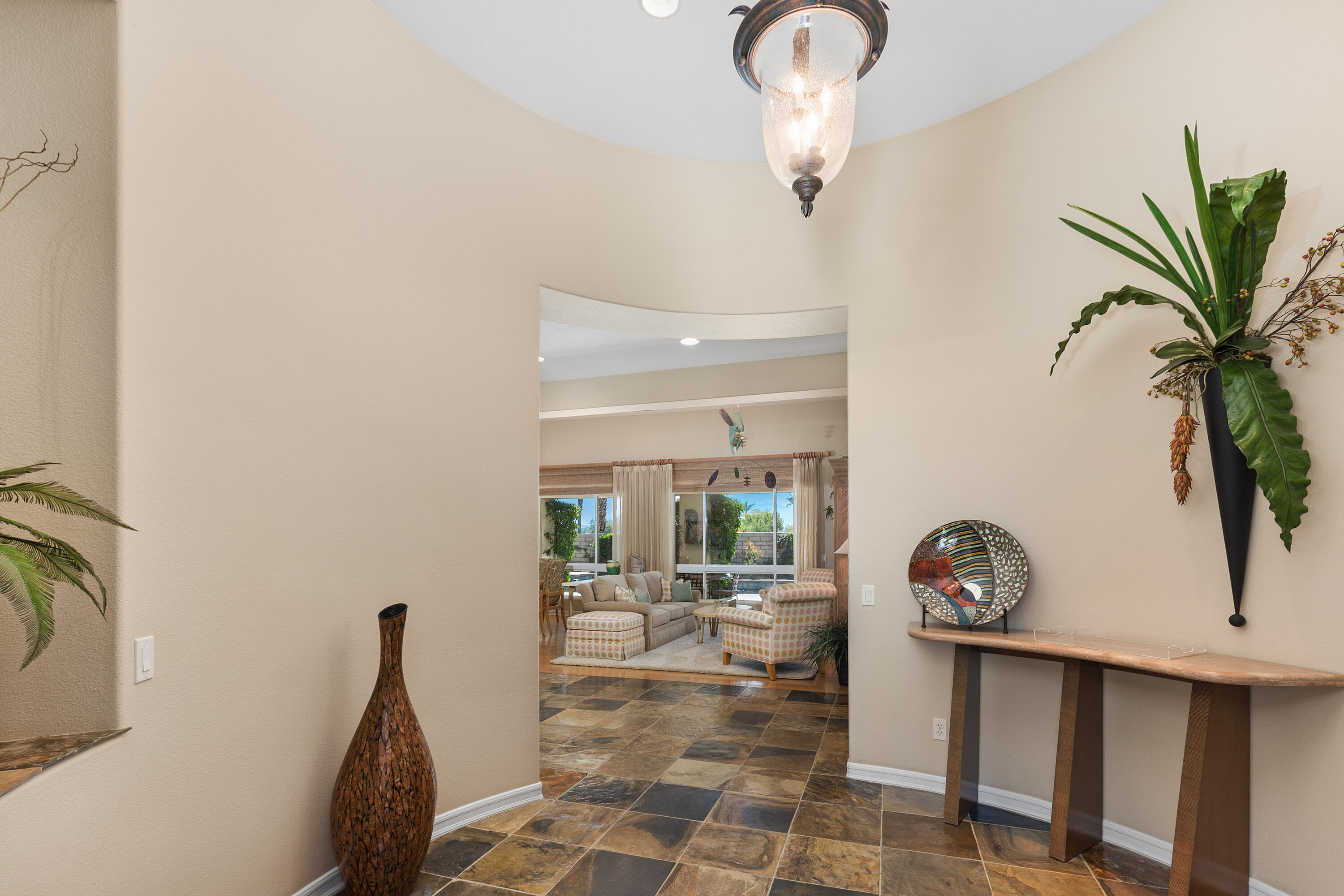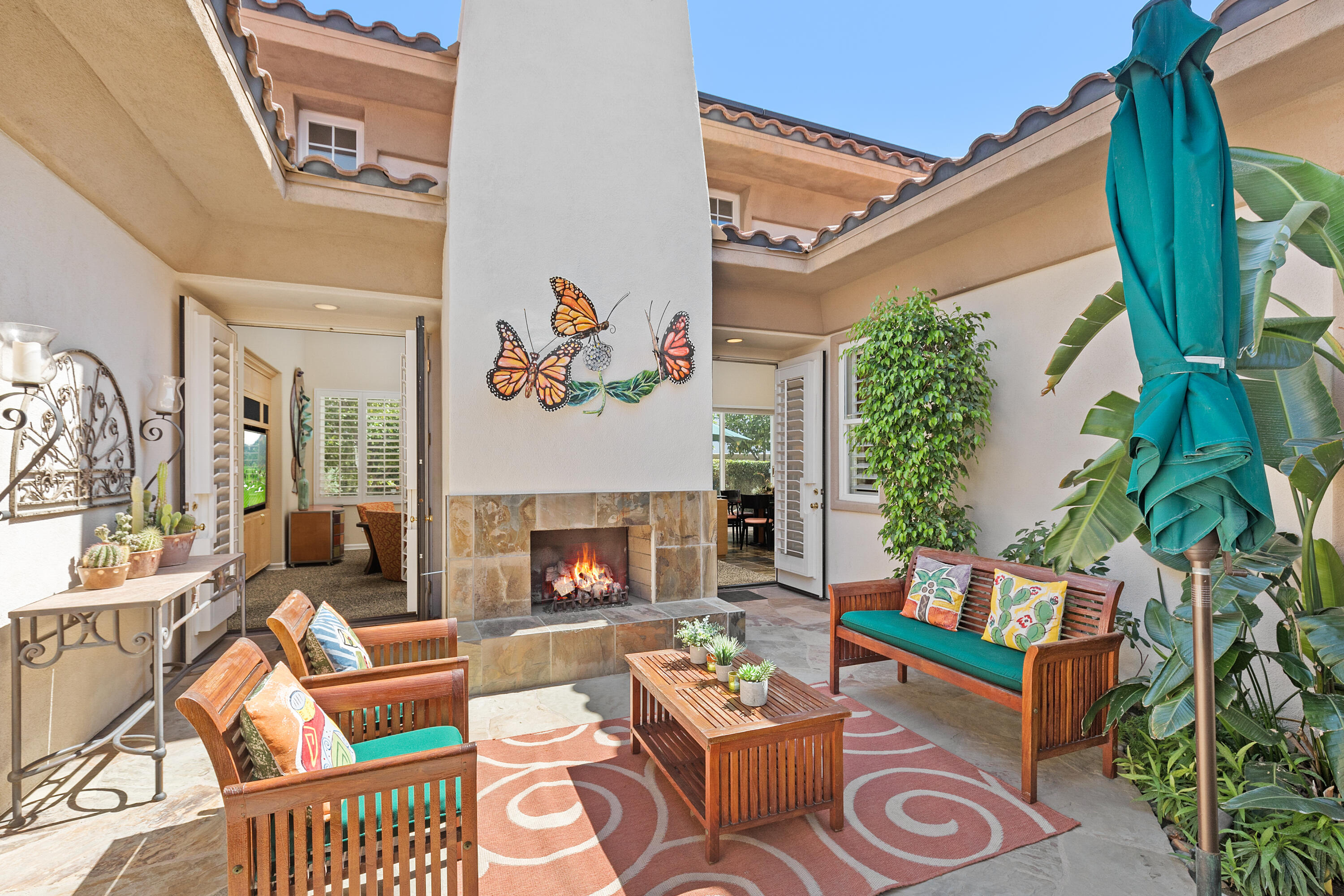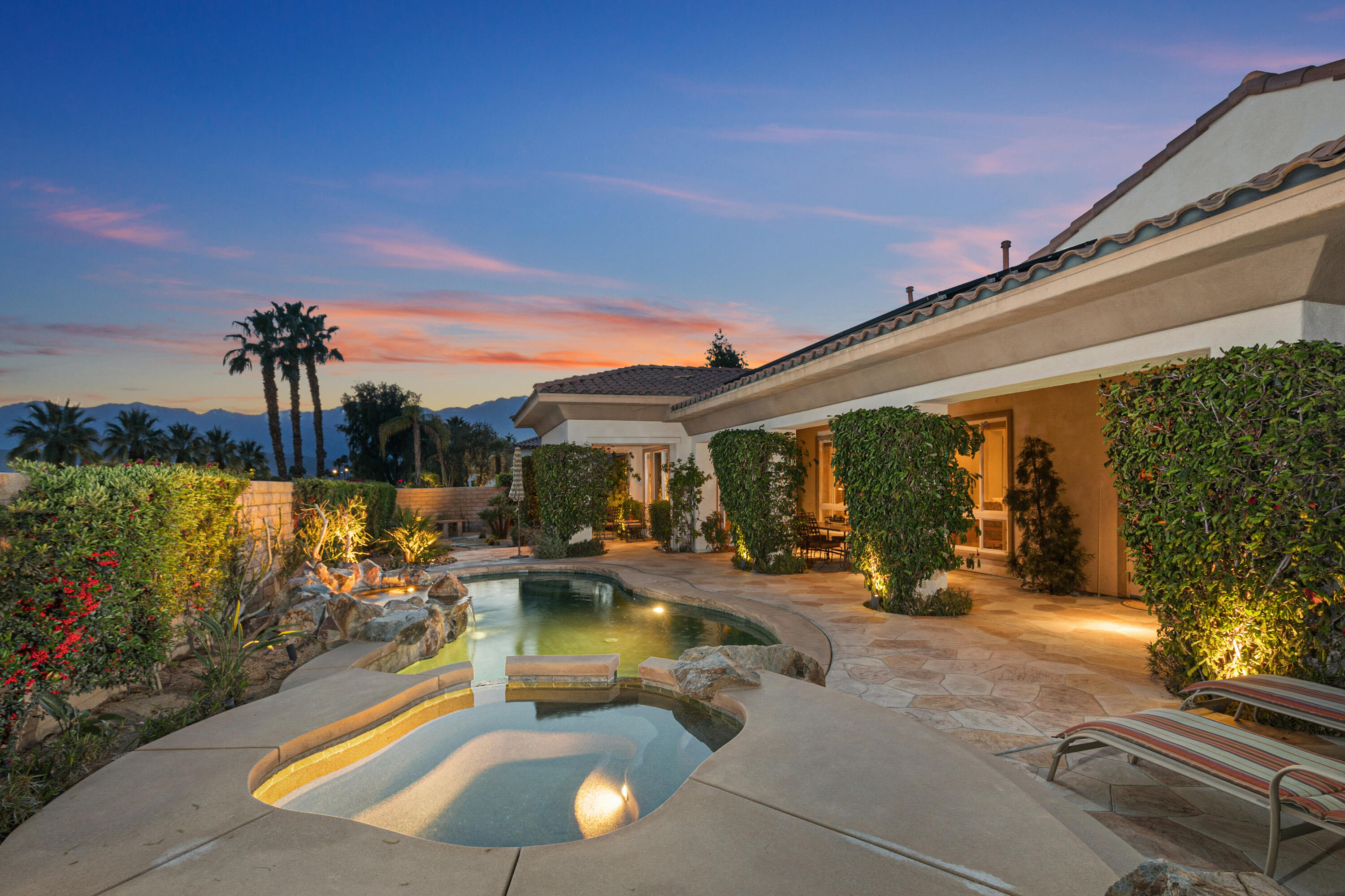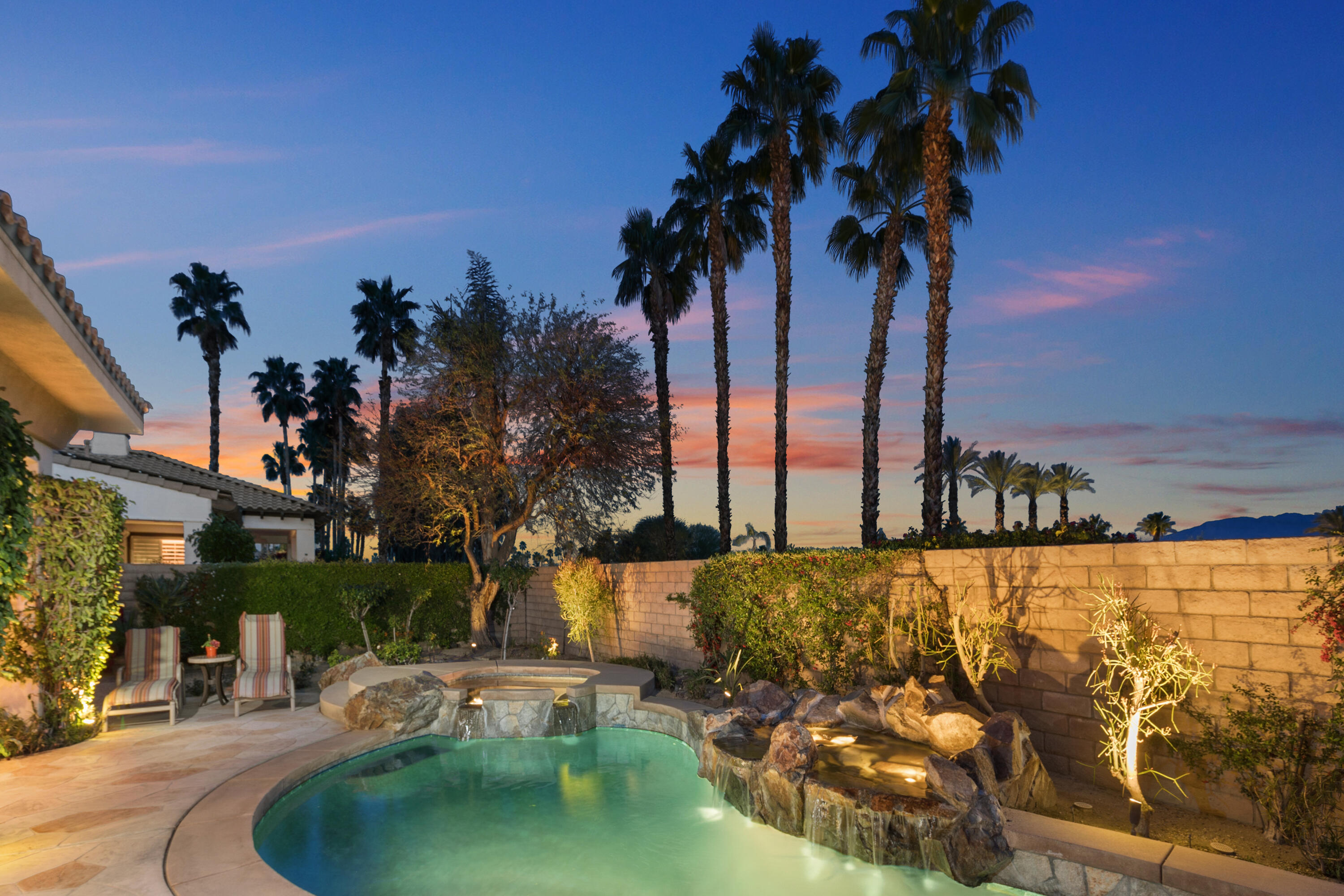 South & West mountain vistas await from this meticulously maintained Mission Hills Country Club Oakmont Estates home. Extensive desert landscaping surrounds all sides of the home. This contemporary gem boasts an energy efficient PREPAID solar lease until 2030. (42 panels), tankless water heater and drip outside irrigation result in low utility costs. The entry courtyard and pool area are completely private to passersby. Enter front courtyard, revealing a delightful alfresco setting with a gas fireplace and fountain. Slate accents adorn the entrance and foyer, extending throughout the home. Within the last 18 months the following has been remodeled: all bathrooms, powder room, laundry room (w free standing wine cooler), 3 bedrooms/3.5 baths, living room, dining room, great room with fireplace, wet bar, and island kitchen featuring solid surface countertops. There are also slate floors, alongside a casual dining space. The Primary Suite provides convenient access to the modern pool/spa with mountain views, oversized walk-in closet, an office/bonus room, plus an office/library, and a lavish bath with dual sinks. Primary also has a luxurious spa tub, separate large shower with dramatic high ceilings and doorways. You will enjoy relaxing in your private front courtyard patio with fireplace. The garage has convenient direct access. HOA dues are only a modest $300/mo.Interested in this Listing?