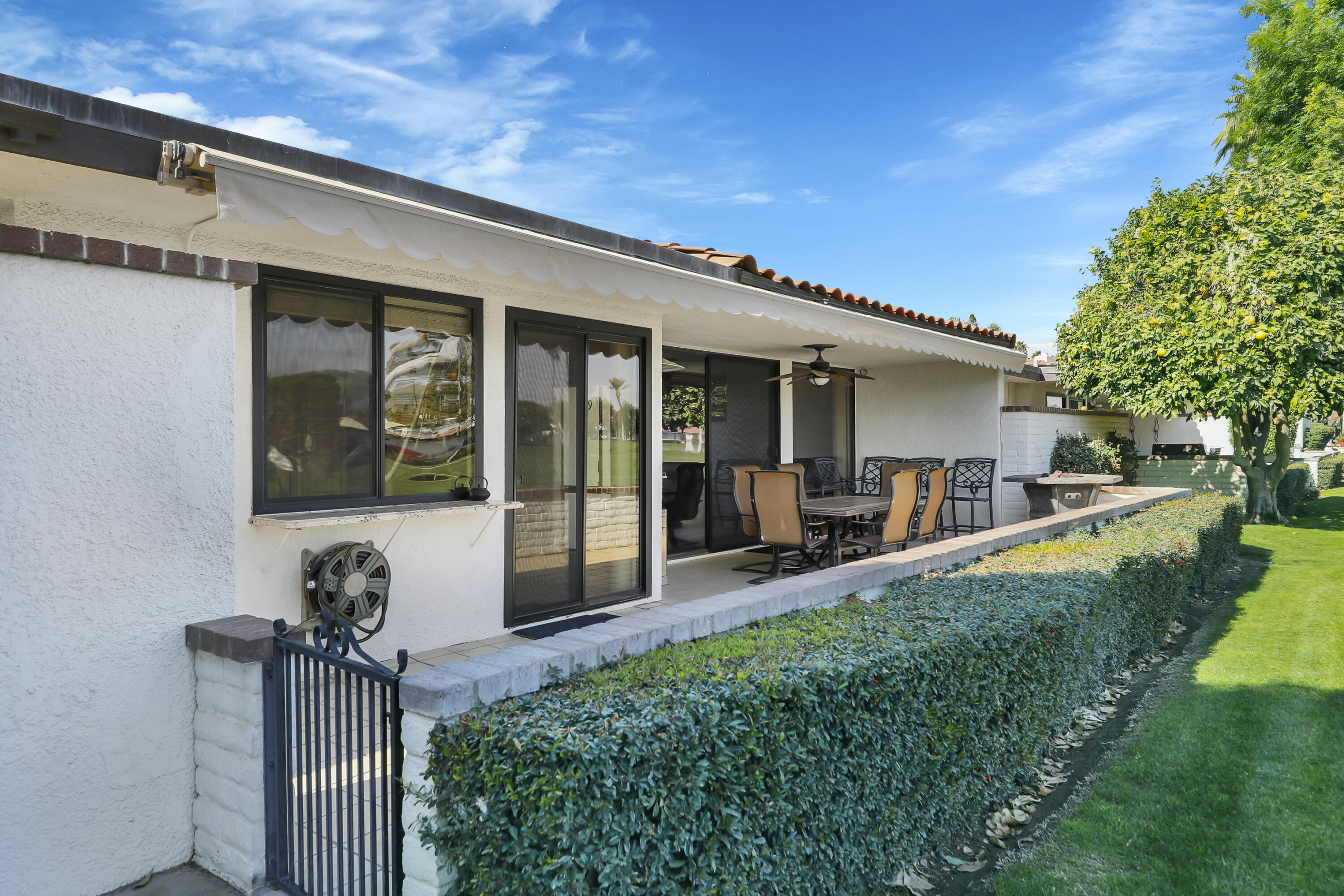 Open house Saturday and Sunday the 24th and 25th of May from 10AM to 2PM . This home is among only 20 in Rancho Las Palmas Country club that are larger 3 bedroom 2 bath homes with an adjoining private side yard and with the utmost privacy and an additional extended patio facing the #2 hole of the North golf course. The atrium has been converted to a TV room, the Master bedroom has been enlarged and a large walk in closet has been added to make this home one of the largest in the complex at 2,478 sq. ft. The kitchen has been remodeled and the side yard includes a very large BBQ area a shaded portico, and a play area. There is also an added cart barn storage area outside the 2 car garage. This home comes completely furnished as seen, and is available to be seen from now to Jan 31 when it will be under rental contract for most of the next 2 months except for 6 days in March. This home has served as a fantastic 2nd home and rental for the owners over the last 20 years and has been very well maintained. It is a must see if you are looking for privacy, a yard and location on the golf course.Interested in this Listing?
