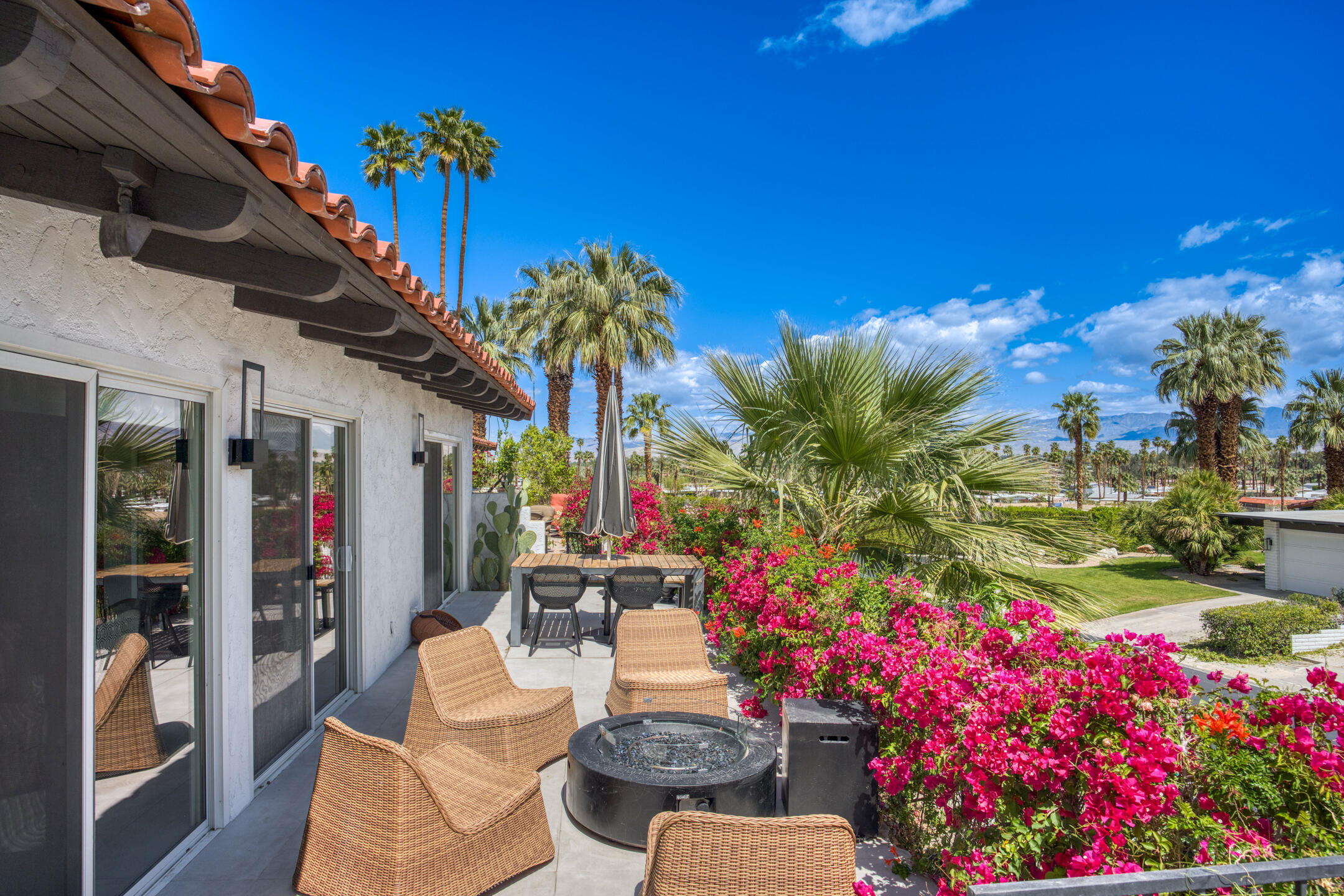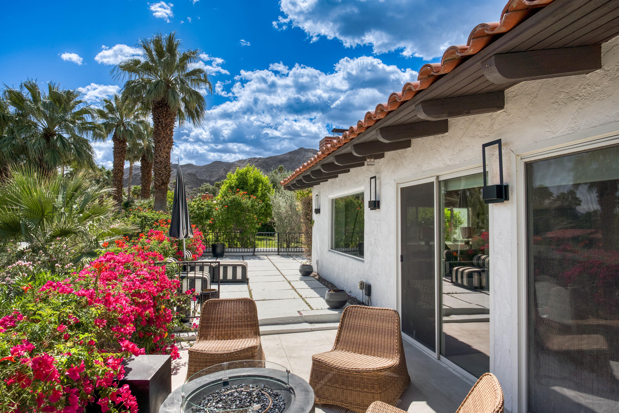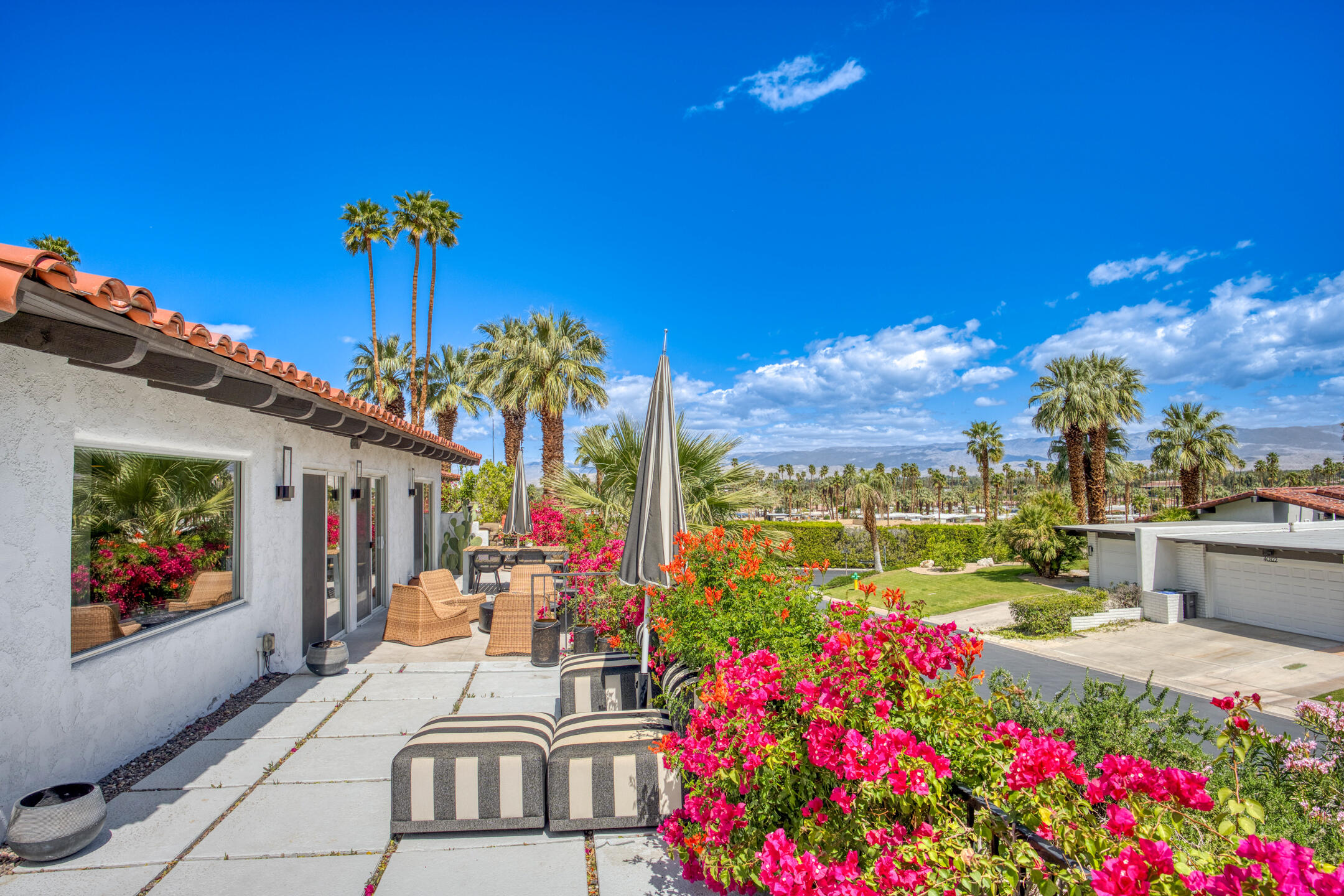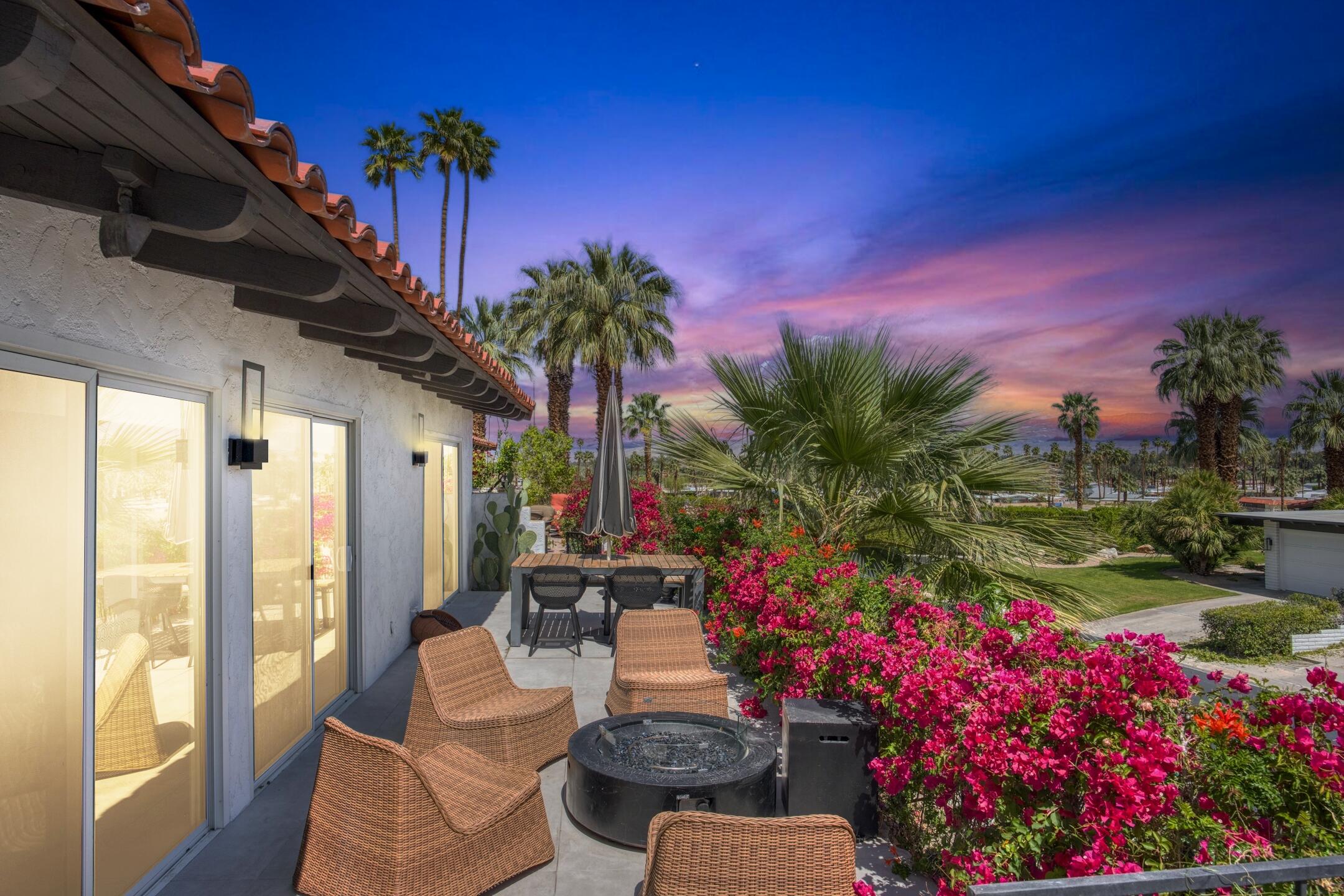 Stunning 3 bed, 2.5 bath home in Thunderbird Villas gated community set above the valley floor, this beautiful home offers panoramic mountain views and exceptional curb appeal, featuring drought-resistant landscaping and a private courtyard. The spacious living room is designed with open beams, vaulted wood ceilings and an adobe-style fireplace, creating a welcoming atmosphere. It seamlessly flows into the kitchen, which is equipped with slab granite countertops, a breakfast bar, updated fixtures, stainless steel appliances, and an under-counter mounted stainless steel sink. The home includes three generously sized bedrooms, each with open beam ceilings. The primary bedroom offers a spa-like en-suite bathroom and access to a private patio. The additional bathrooms are modern and thoughtfully designed for comfort and convenience. Exit outside to the private rear patio and beautifully landscaped backyard, perfect for outdoor dining, entertaining, or relaxing while enjoying stunning views. The community pool is close by, and the HOA covers 24 hour guard-gated entry, cable, trash, landscaping, and access to community pools. This exceptional property offers a perfect blend of luxury, comfort, and convenience ideal for those seeking an elevated lifestyle.Home is close to Disneyland's Cotina Resort and Sunnylands garden. Adjacent to the famous Thunderbird Country Club. Net tiled floor, designer kitchen and shower room, new HVAC and furnace , open plan living space , vaulted ceilings, Landscaper gardens with landscaping built into HOA fee. Access to Thunderbird Heights and club through private path. Adjacent to stunning Abraham Hicks Trail. ***Furnishings available outside of escrow.***Interested in this Listing?