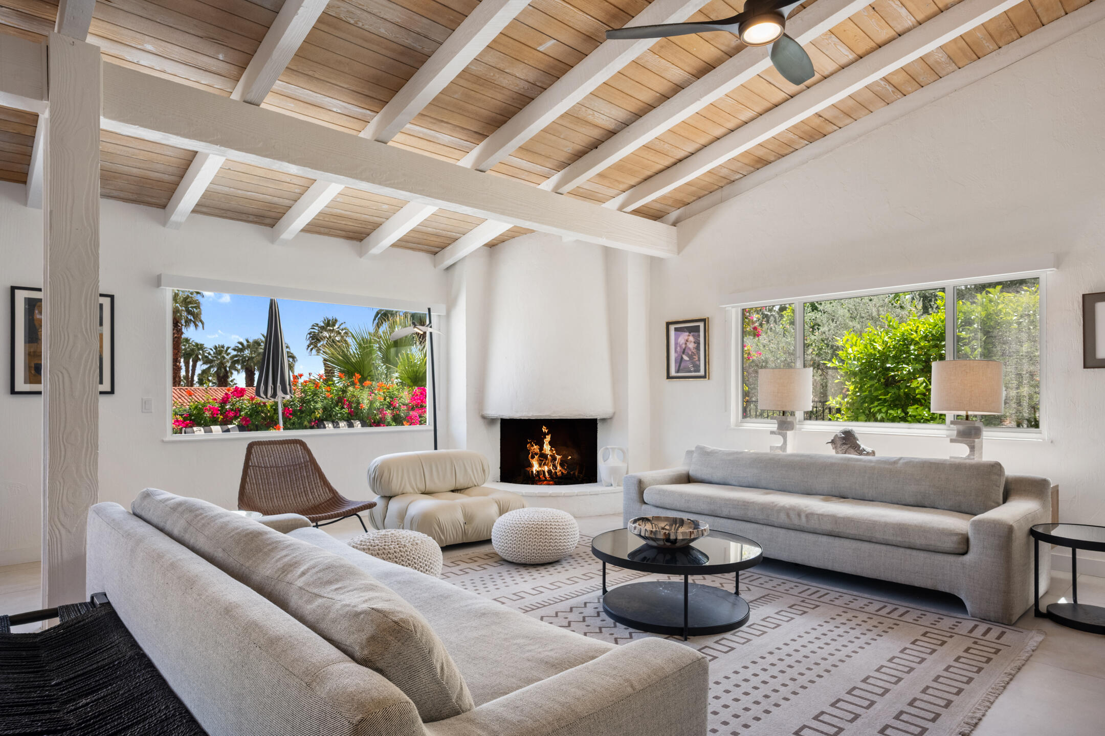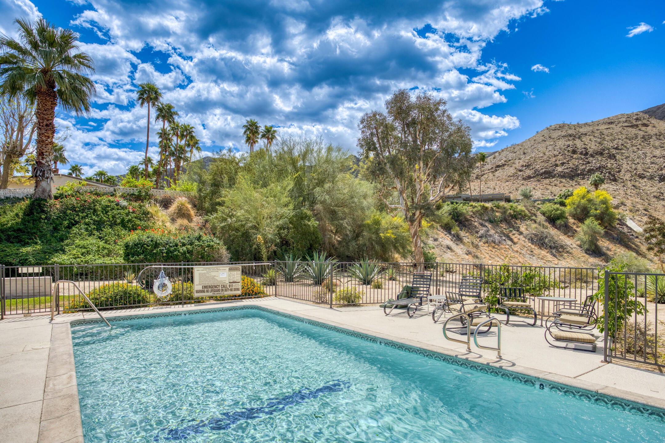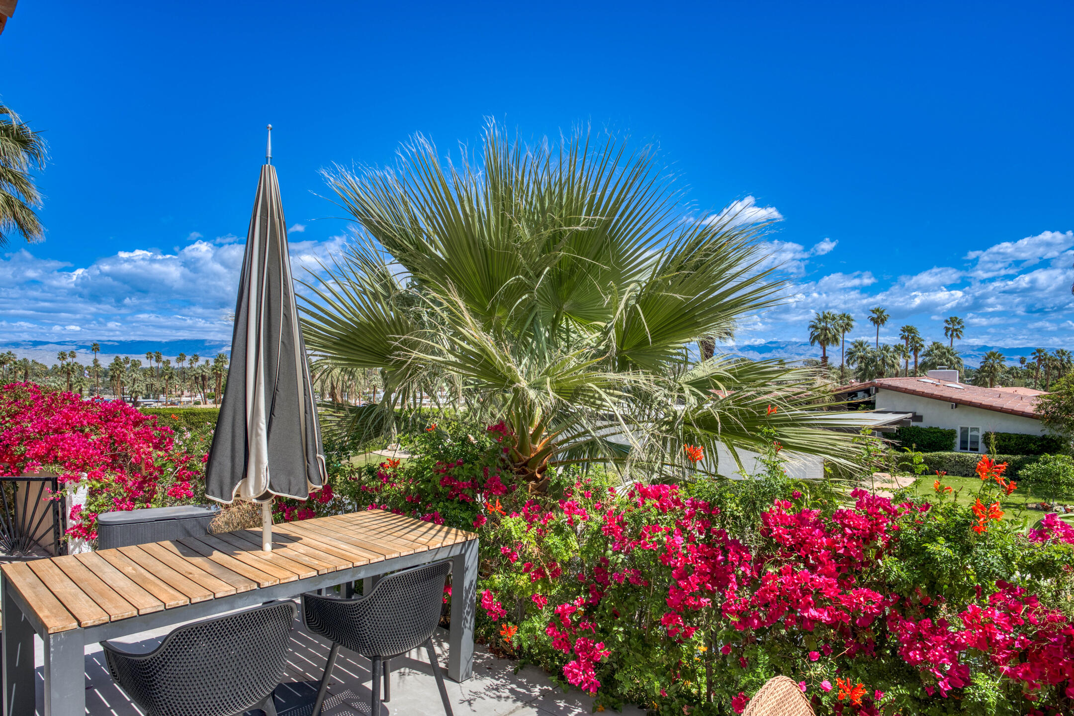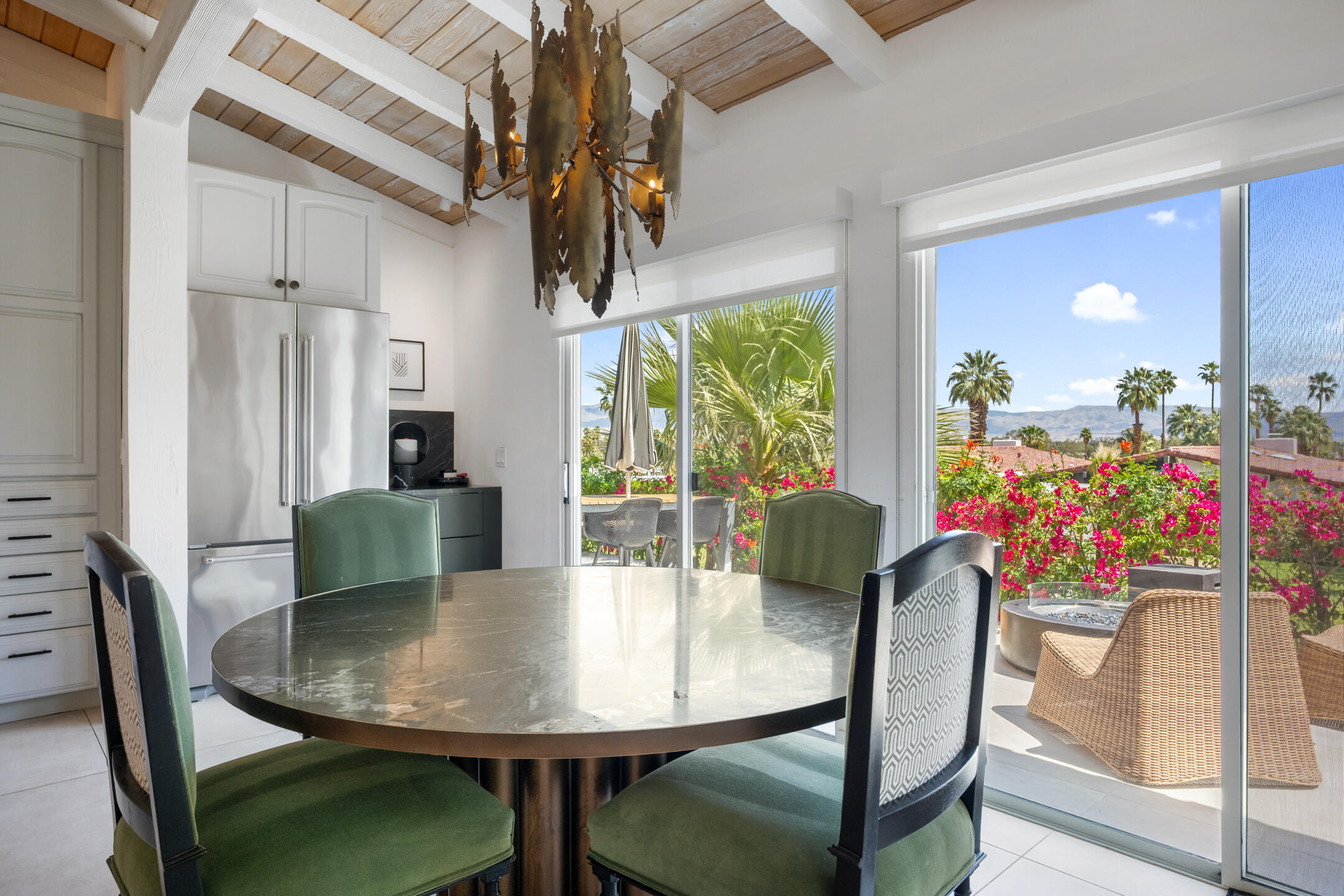 Stunning 3 bed, 2.5 bath home in Thunderbird Villas gated community set above the valley floor, this beautiful home offers panoramic mountain views and exceptional curb appeal, featuring drought-resistant landscaping and a private courtyard. The spacious living room is designed with open beams, vaulted wood ceilings and an adobe-style fireplace, creating a welcoming atmosphere. It seamlessly flows into the kitchen, which is equipped with slab granite countertops, a breakfast bar, updated fixtures, stainless steel appliances, and an under-counter mounted stainless steel sink. The home includes three generously sized bedrooms, each with open beam ceilings. The primary bedroom offers a spa-like en-suite bathroom and access to a private patio. The additional bathrooms are modern and thoughtfully designed for comfort and convenience. Exit outside to the private rear patio and beautifully landscaped backyard, perfect for outdoor dining, entertaining, or relaxing while enjoying stunning views. The community pool is close by, and the HOA covers 24 hour guard-gated entry, cable, trash, landscaping, and access to community pools. This exceptional property offers a perfect blend of luxury, comfort, and convenience ideal for those seeking an elevated lifestyle.Home is close to Disneyland's Cotina Resort and Sunnylands garden. Adjacent to the famous Thunderbird Country Club. Net tiled floor, designer kitchen and shower room, new HVAC and furnace , open plan living space , vaulted ceilings, Landscaper gardens with landscaping built into HOA fee. Access to Thunderbird Heights and club through private path. Adjacent to stunning Abraham Hicks Trail. ***Furnishings available outside of escrow.***Interested in this Listing?