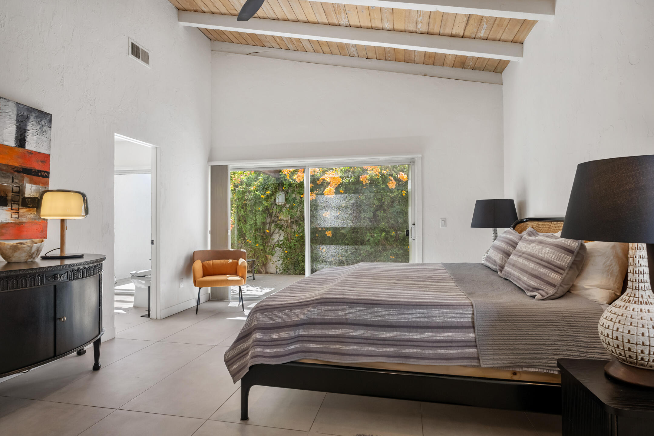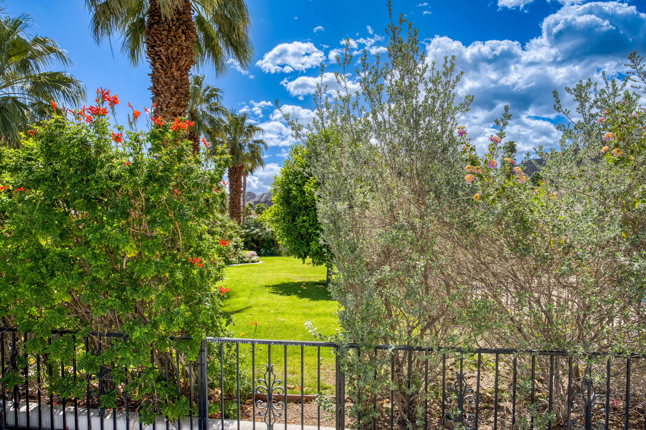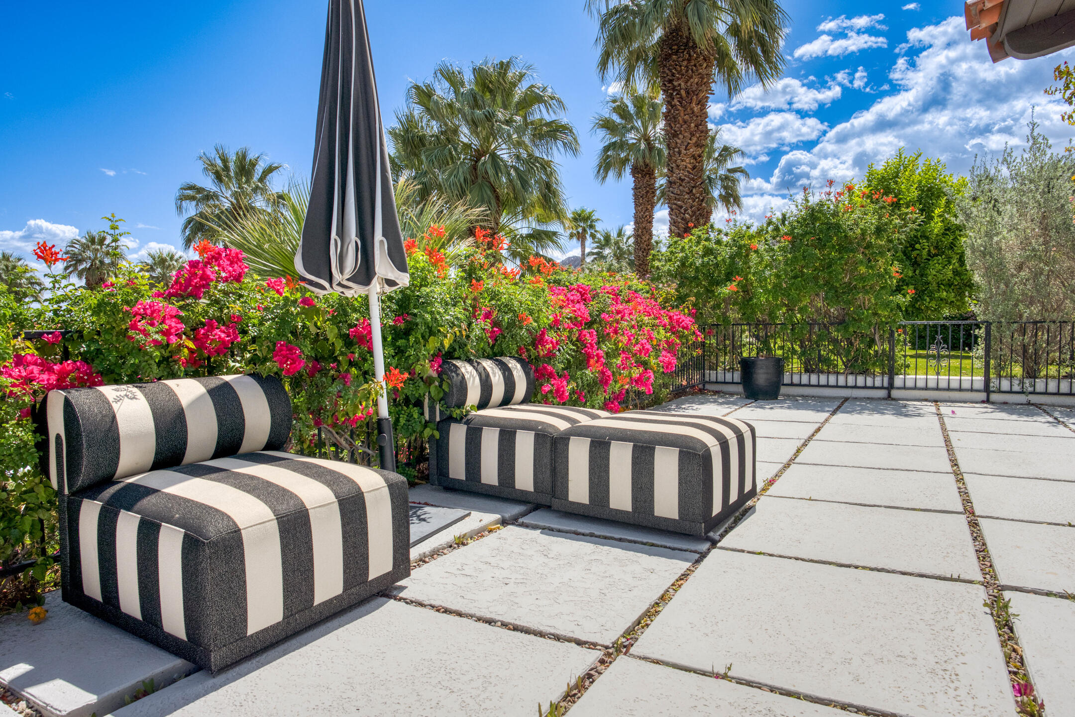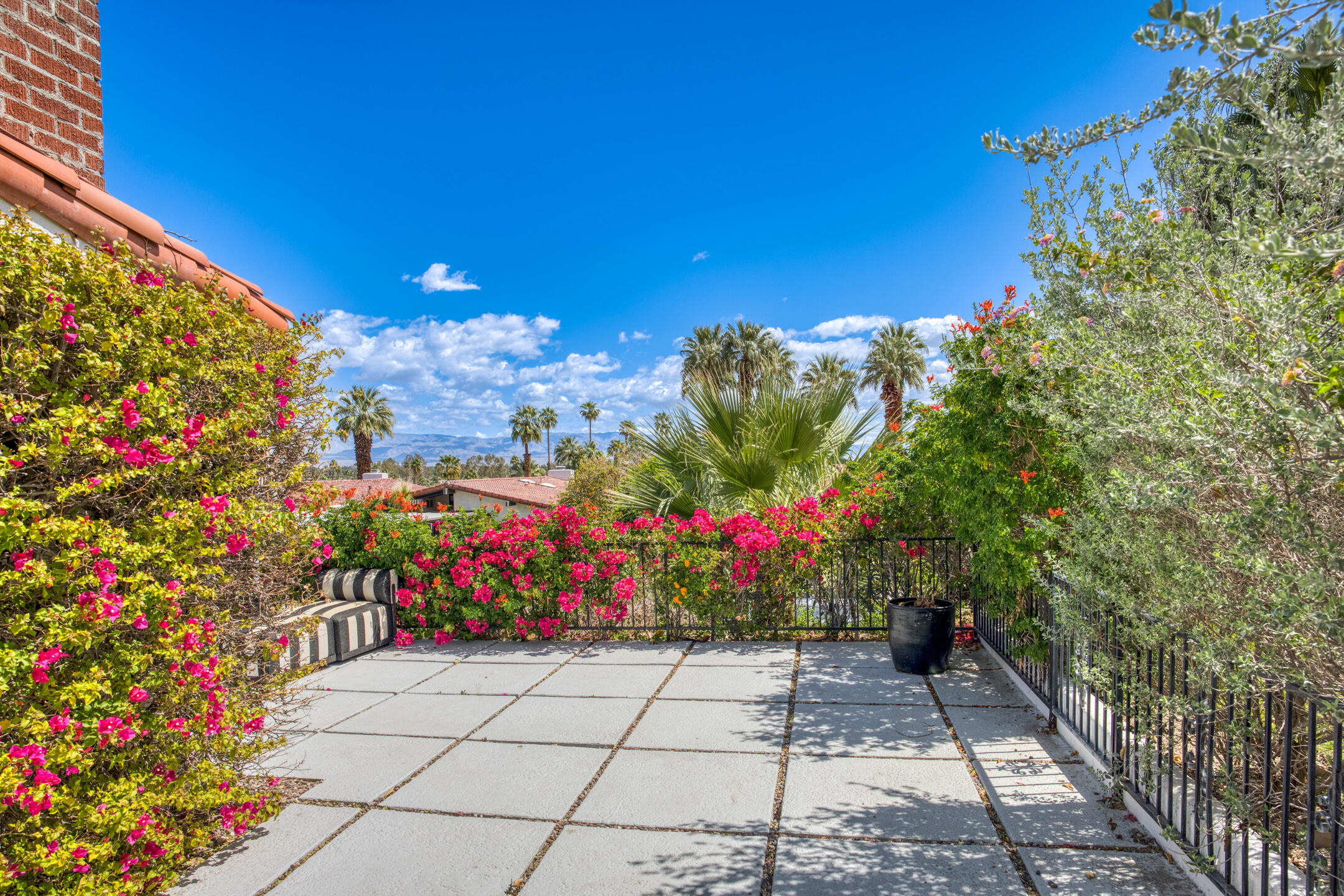 Stunning 3 bed, 2.5 bath home in Thunderbird Villas gated community set above the valley floor, this beautiful home offers panoramic mountain views and exceptional curb appeal, featuring drought-resistant landscaping and a private courtyard. The spacious living room is designed with open beams, vaulted wood ceilings and an adobe-style fireplace, creating a welcoming atmosphere. It seamlessly flows into the kitchen, which is equipped with slab granite countertops, a breakfast bar, updated fixtures, stainless steel appliances, and an under-counter mounted stainless steel sink. The home includes three generously sized bedrooms, each with open beam ceilings. The primary bedroom offers a spa-like en-suite bathroom and access to a private patio. The additional bathrooms are modern and thoughtfully designed for comfort and convenience. Exit outside to the private rear patio and beautifully landscaped backyard, perfect for outdoor dining, entertaining, or relaxing while enjoying stunning views. The community pool is close by, and the HOA covers 24 hour guard-gated entry, cable, trash, landscaping, and access to community pools. This exceptional property offers a perfect blend of luxury, comfort, and convenience ideal for those seeking an elevated lifestyle.Home is close to Disneyland's Cotina Resort and Sunnylands garden. Adjacent to the famous Thunderbird Country Club. Net tiled floor, designer kitchen and shower room, new HVAC and furnace , open plan living space , vaulted ceilings, Landscaper gardens with landscaping built into HOA fee. Access to Thunderbird Heights and club through private path. Adjacent to stunning Abraham Hicks Trail. ***Furnishings available outside of escrow.***Interested in this Listing?