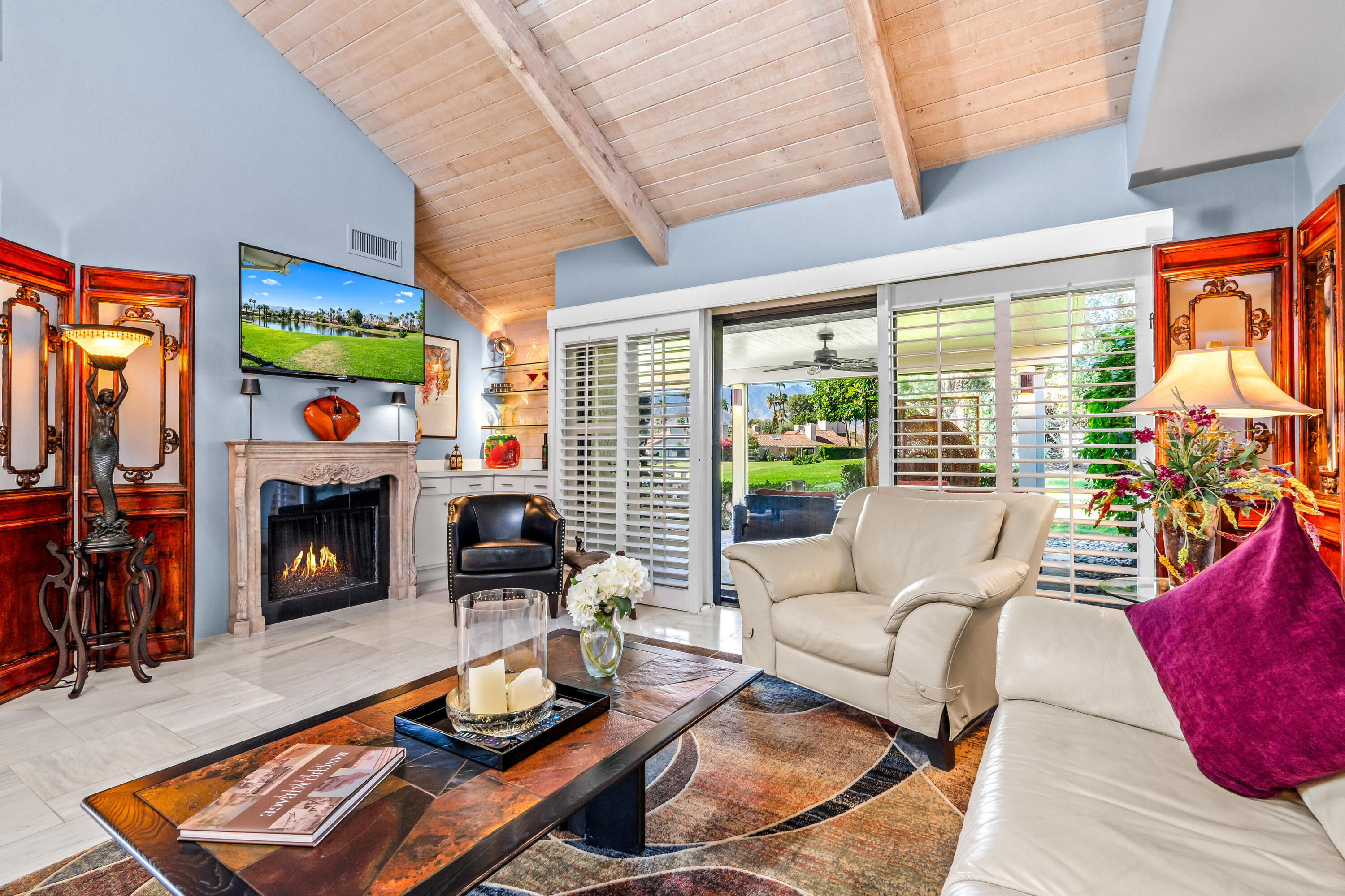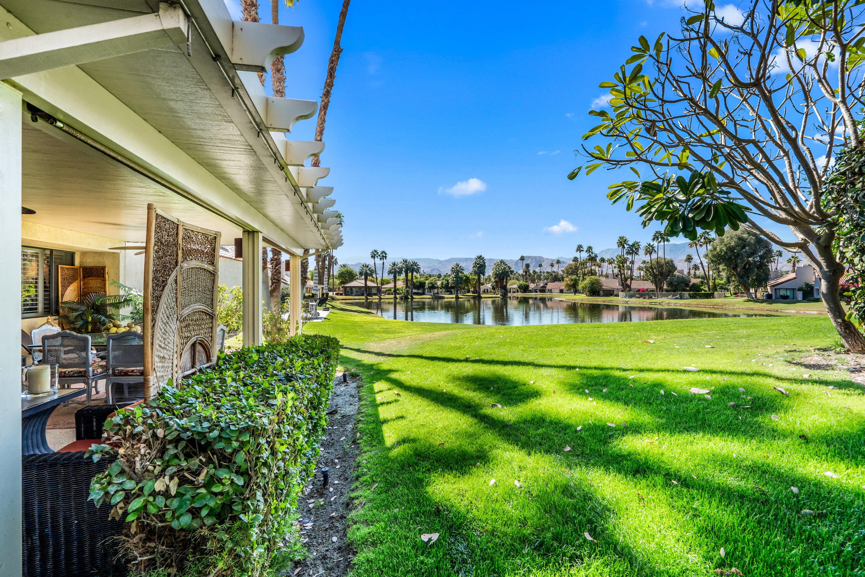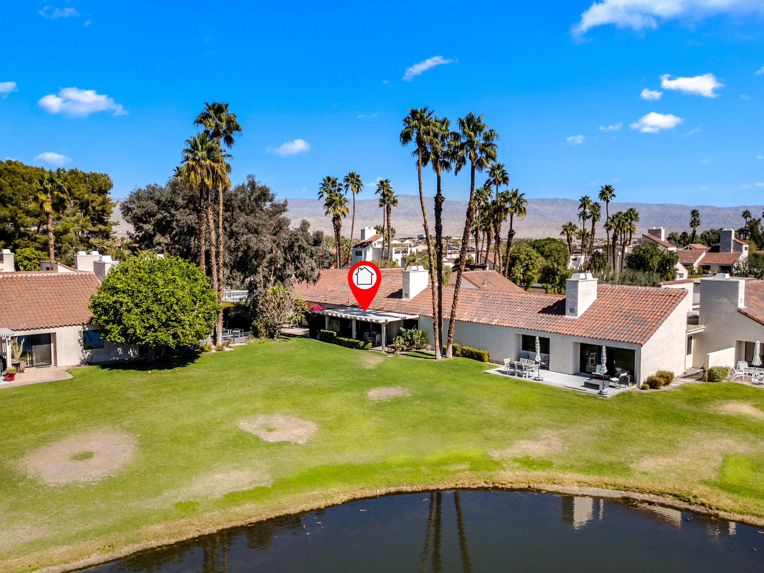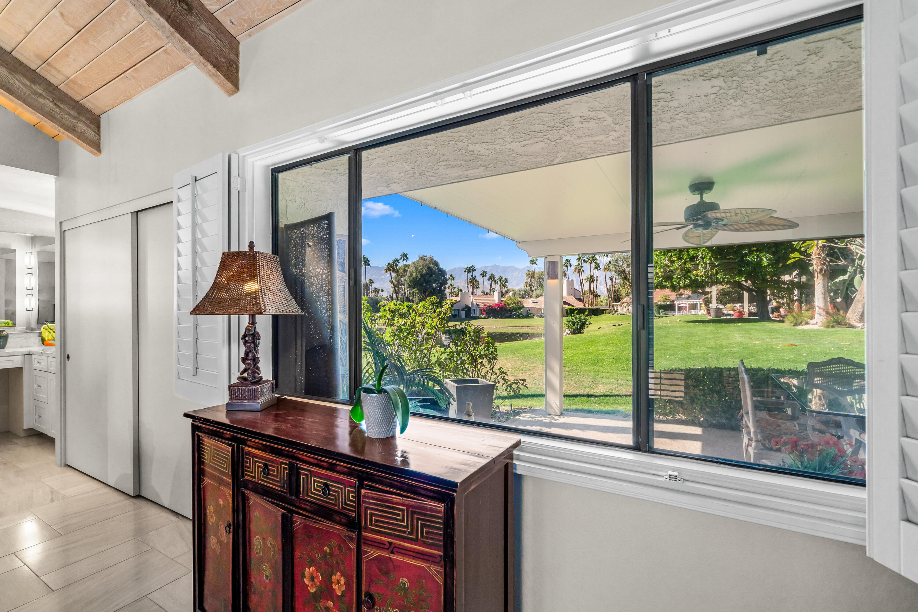 Meticulously cared for by full-time homeowner, this residence showcases exceptional pride of ownership and a sense of warmth and elegance that's felt throughout. Rare & Unmatched Lake and Mountain Views | Mission Hills Country Club | Now $480,000!An incredible opportunity awaits! This highly sought-after Tennis Villa at Mission Hills Country Club has just been attractively repriced to $480,000, offering outstanding value for one of the community's most scenic locations. Originally listed at $550,000, the motivated seller is relocating out of the area, creating a unique chance for a savvy buyer.Set against a backdrop of rare, breathtaking lake and mountain views, this peaceful retreat showcases custom brushed marble floors in an elegant Leon pattern, soaring vaulted wood ceilings, and a dual-sided fireplace in the spacious open-concept great room. The primary suite offers a spa-like experience with marble countertops, floating mirrors, a soaking tub, an easy-entry rain shower with mosaic tile flooring, and a dramatic floor-to-ceiling marble accent wall.Additional upgrades include newer fixtures, faucets, and lighting, plus a 4-year-old HVAC system for added comfort. Outdoor living shines on the oversized private patio, featuring a custom alumawood pergola with dimmable lighting, shades, and misters, perfect for relaxing and taking in the remarkable views.Residents enjoy five pools and spas with updated furnishings, and the two-car garage is just steps away.HOA dues include cable and Wi-Fi through Spectrum, and the land lease has been extended through 2121 a significant added value. The home is offered furnished per inventory, providing an easy, turnkey transition.Rarely does a villa in such a prime location come available at this price don't miss this exceptional offering in Mission Hills Country Club!Interested in this Listing?