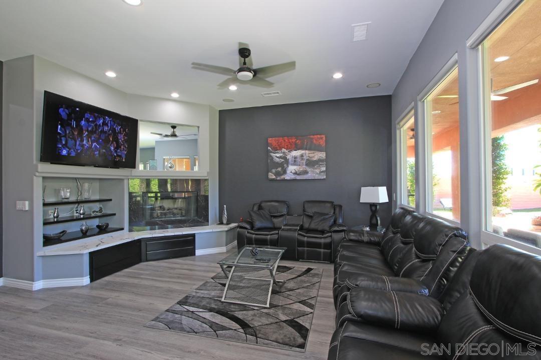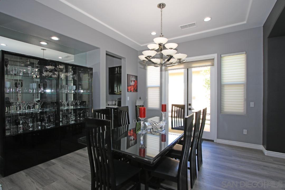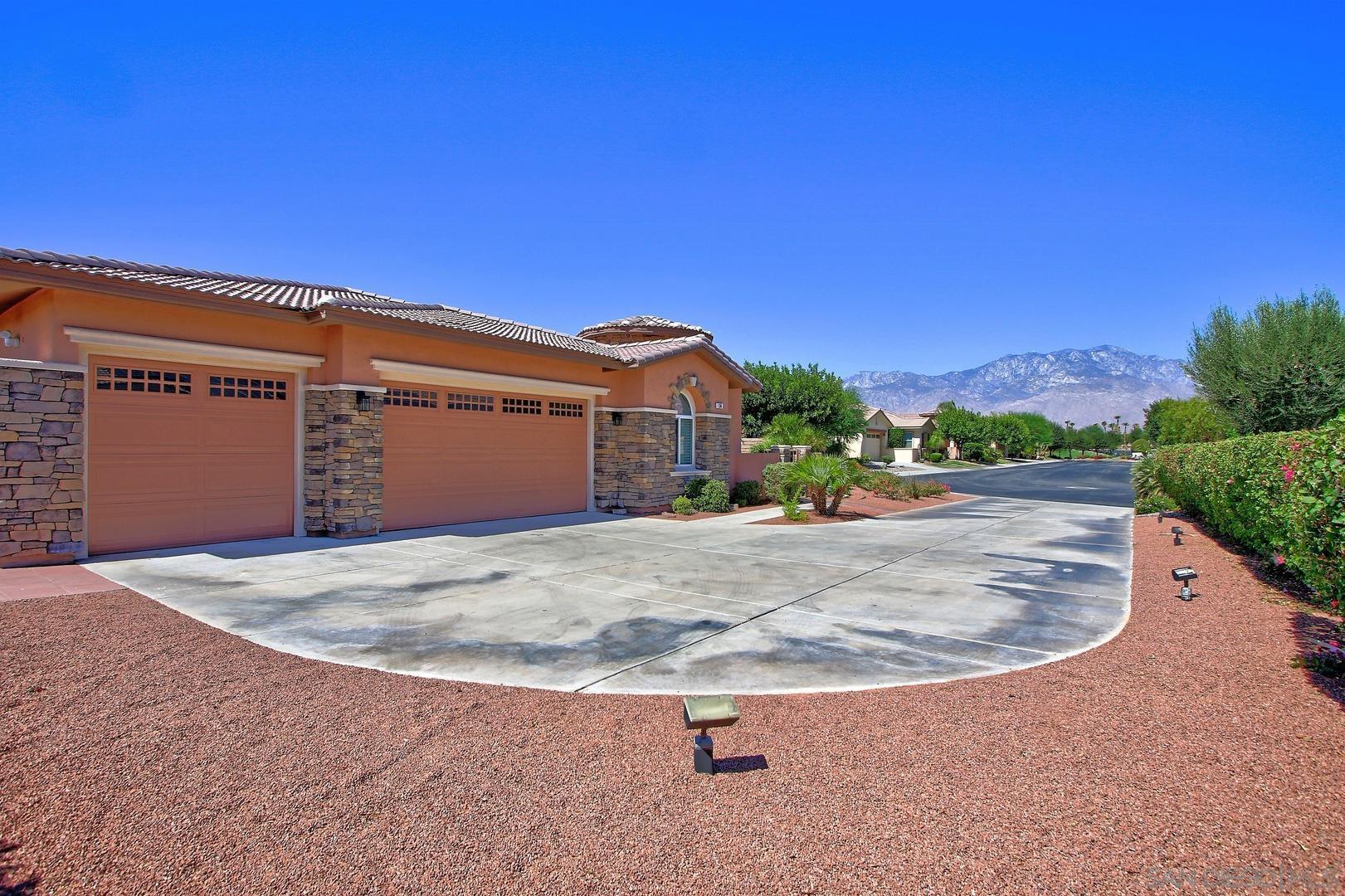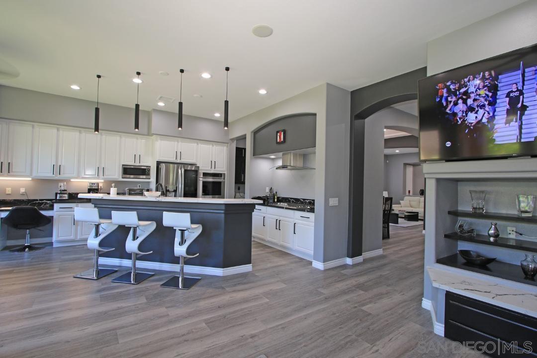 This is an absolutely gorgeous recently (2022) tastefully renovated home in the Tuscany Private Gated community of large lot homes in Rancho Mirage. This highly renovated four bedroom, 3.5 bath home w/10' ceiling has 2,803s of living space indoors, 3 car garage w/ large driveway room for 4 more cars and a large very private backyard with saltwater pool and spa on a huge 12,632sf lot. This fully furnished home has beautiful high-quality vinyl plank flooring, 10' high ceilings, and windows everywhere letting in sunshine all day! The dcor is high polished, modern Italian in blacks, whites, greys and touches of red. It is elegant yet comfortable, dramatic yet simple and uncluttered and .. squeaky clean! Entering the home, one steps into a small foyer leading to a formal living and dining room, perfect for entertaining. But the very ''heart'' of the home is the beautiful great room with kitchen, casual dining, and TV room. The TV room has been furnished with six theater quality easy chairs and a huge ''smart" TV ready for streaming, mounted over a gas fireplace. gourmet delight ....top quality appliances, gas range, double oven and the cooking gadgets you'll enjoy! This kitchen is chef's dream. Cabinets are filled with supplies for cooking...also a butler's pantry between kitchen and formal dinning Room.