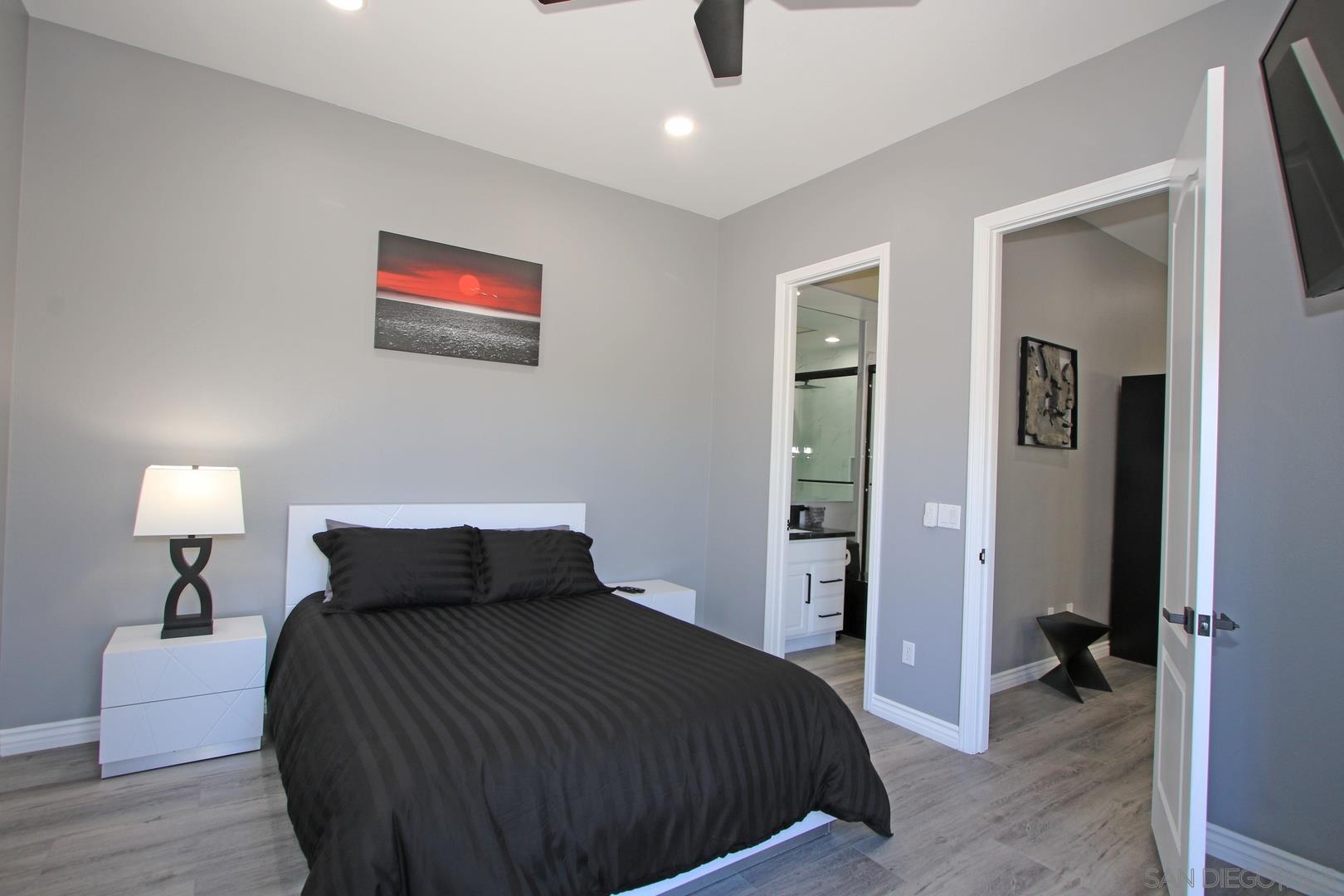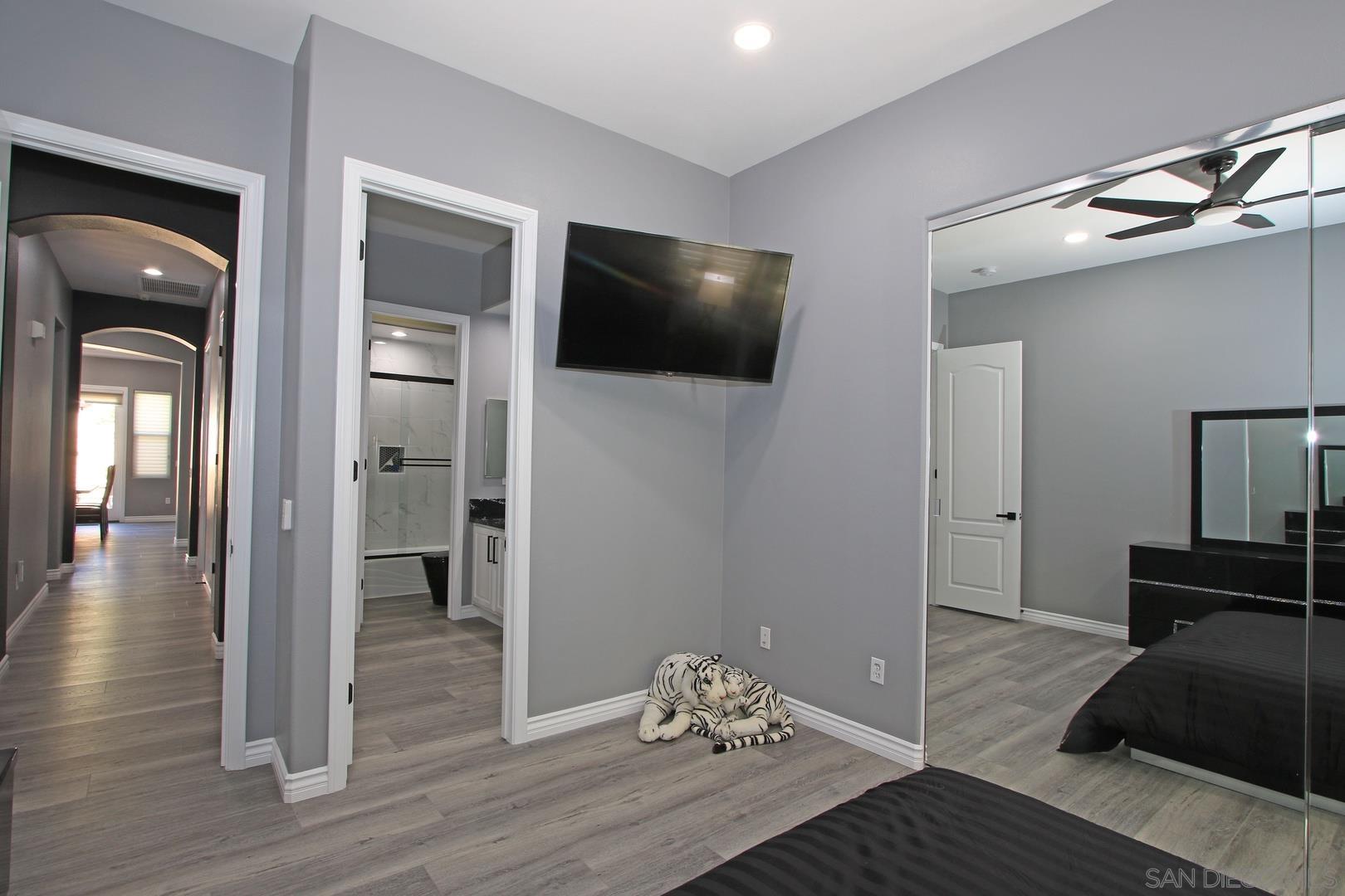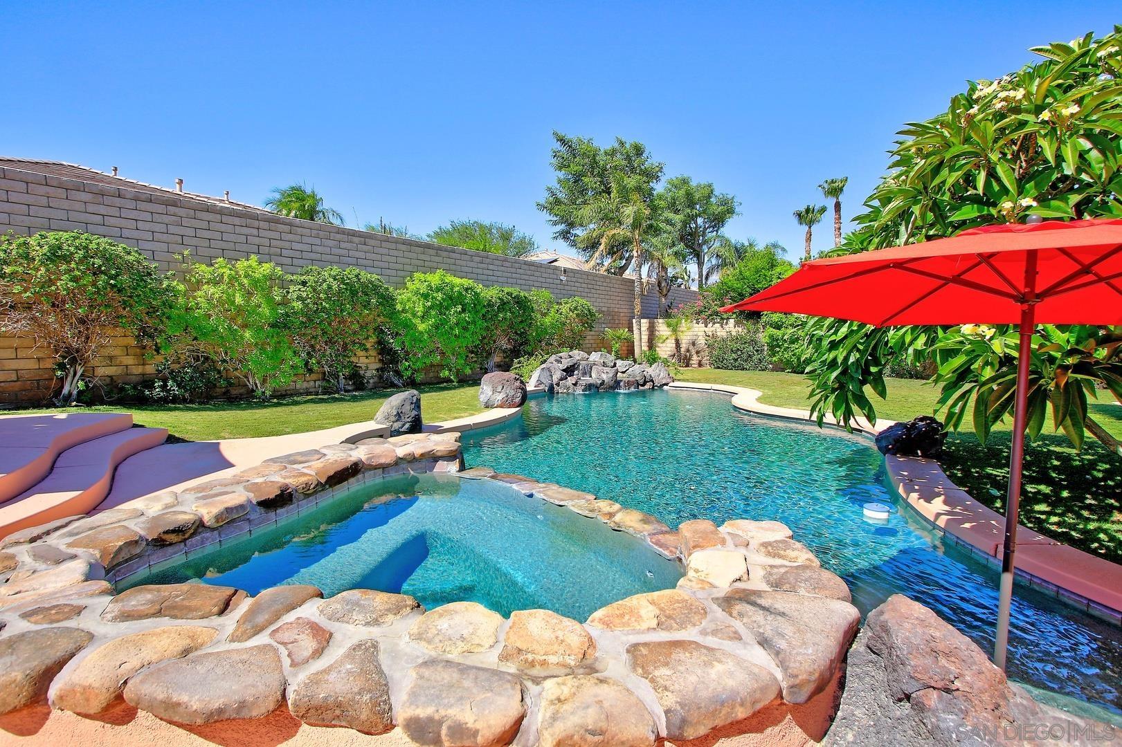 This is an absolutely gorgeous recently (2022) tastefully renovated home in the Tuscany Private Gated community of large lot homes in Rancho Mirage. This highly renovated four bedroom, 3.5 bath home w/10' ceiling has 2,803s of living space indoors, 3 car garage w/ large driveway room for 4 more cars and a large very private backyard with saltwater pool and spa on a huge 12,632sf lot. This fully furnished home has beautiful high-quality vinyl plank flooring, 10' high ceilings, and windows everywhere letting in sunshine all day! The dcor is high polished, modern Italian in blacks, whites, greys and touches of red. It is elegant yet comfortable, dramatic yet simple and uncluttered and .. squeaky clean! Entering the home, one steps into a small foyer leading to a formal living and dining room, perfect for entertaining. But the very ''heart'' of the home is the beautiful great room with kitchen, casual dining, and TV room. The TV room has been furnished with six theater quality easy chairs and a huge ''smart" TV ready for streaming, mounted over a gas fireplace. gourmet delight ....top quality appliances, gas range, double oven and the cooking gadgets you'll enjoy! This kitchen is chef's dream. Cabinets are filled with supplies for cooking...also a butler's pantry between kitchen and formal dinning Room.