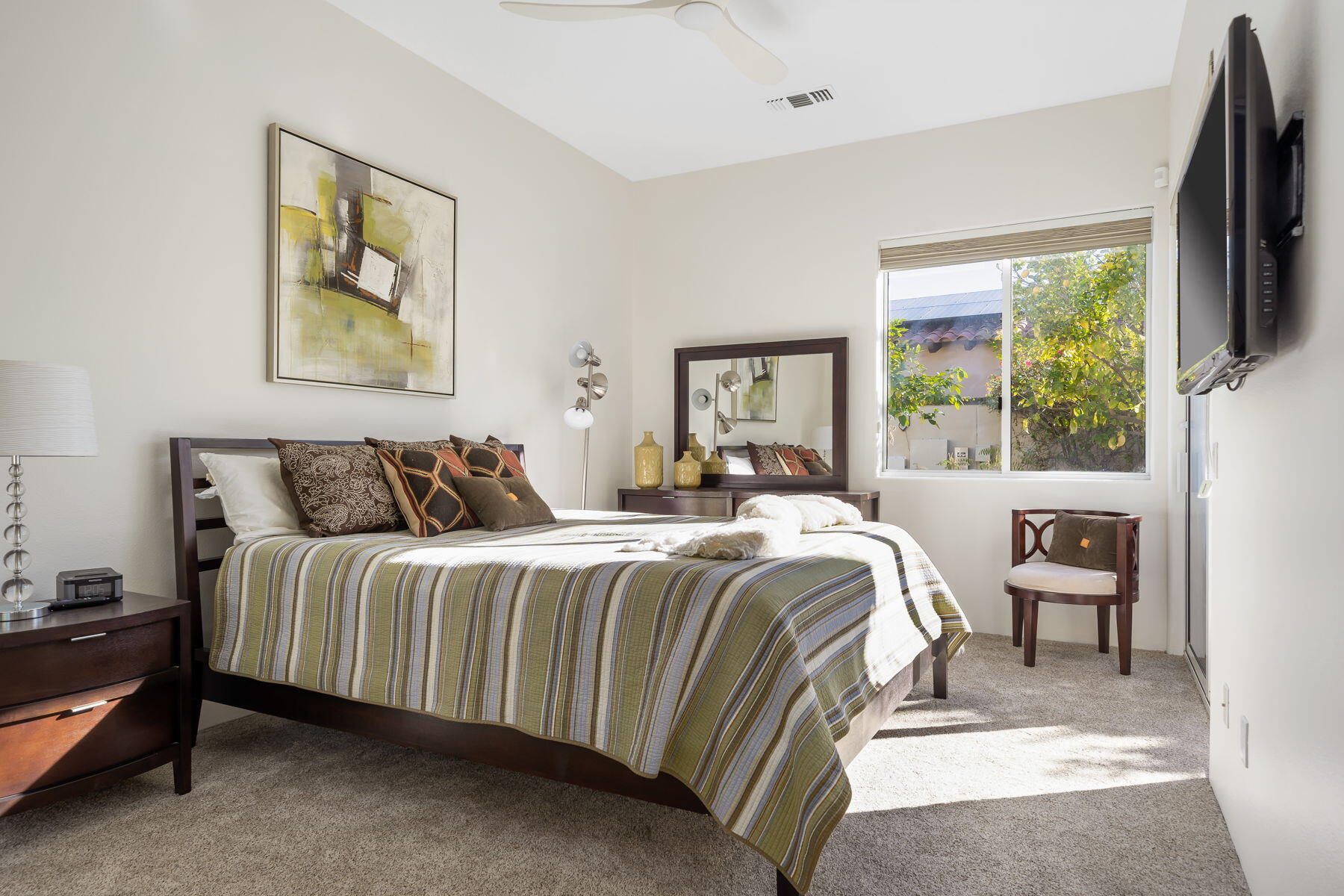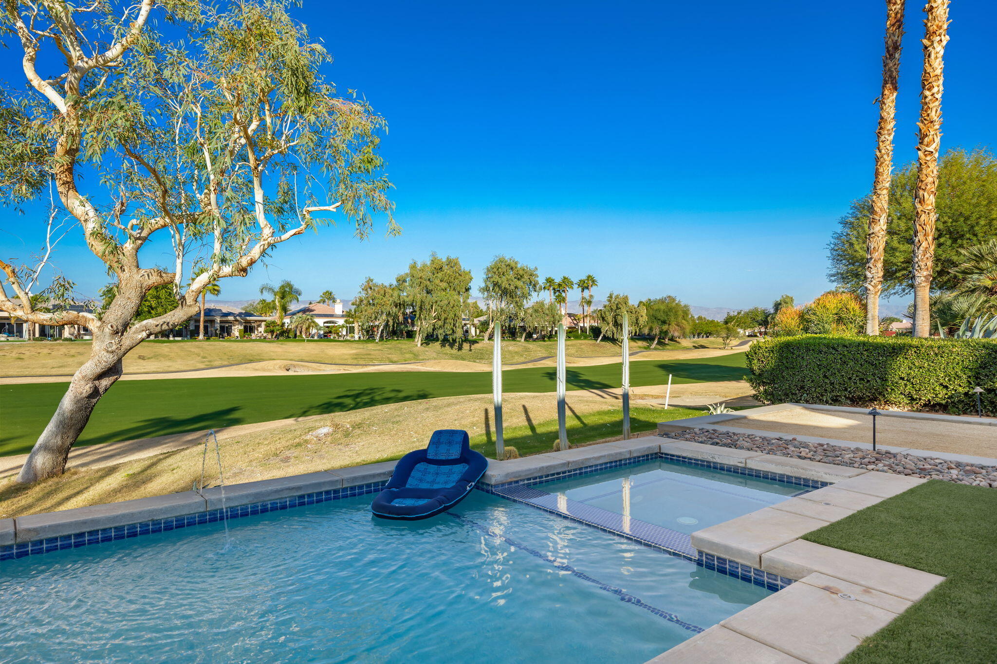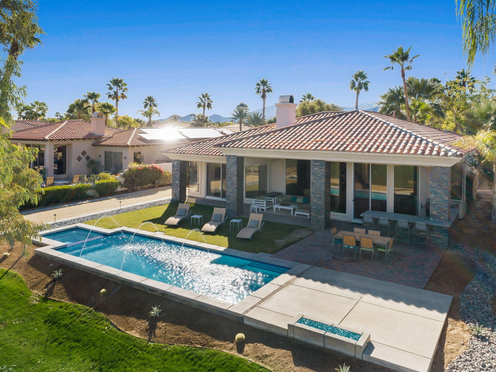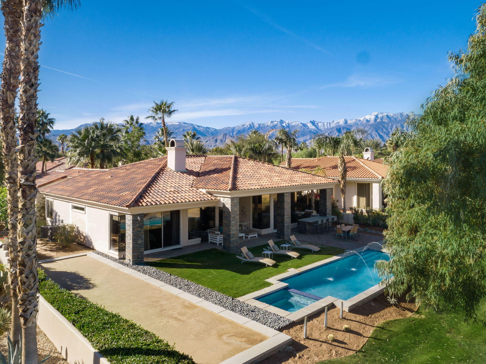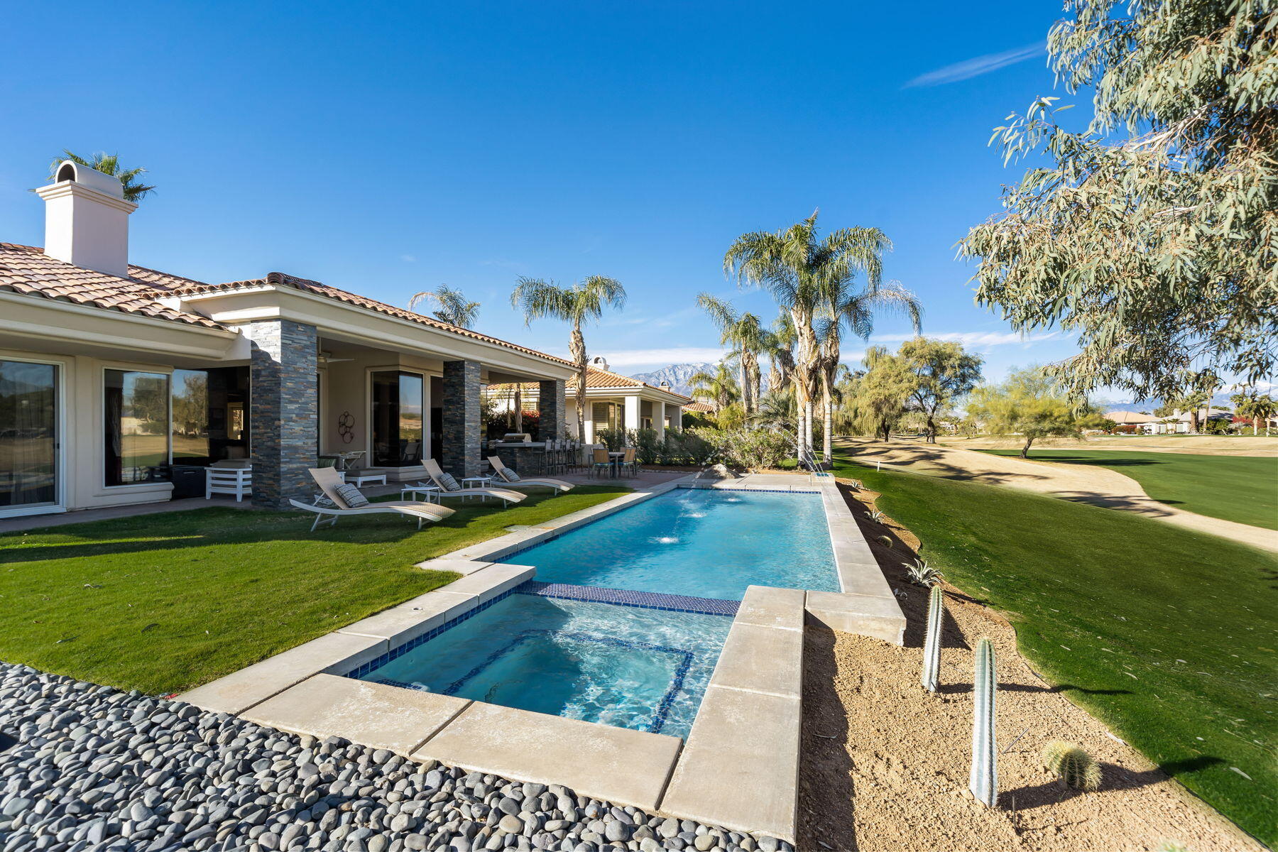 Available for next season! SPECTACULAR LUXURY HOME BEHIND THE GATES OF MISSION HILLS CC-3 BR + Den (can be 4th BR) includes DETACHED huge beautifully appointed CASITA on the Gary Player Course, 17th hole, private pool/spa, Fire Pit, Bocce Ball Court, Outdoor BBQ/entertainment area, Chef's Kitchen, Wet Bar, Great Room w/custom stack stone around fireplace & walls, contemporary high-end furnishings. All 3 beds are California Kings. Main home has 2 En-Suite bedrooms + Den w/foldout bed & closet & Extra Bath which can act as 4th Bedroom. HUGE detached comfy and elegant CASITA is 3rd BR. Sit in the private front courtyard with a ZEN-like water feature. 2022 Aetrix Golf cart for rent at extra fee (4 seater, lithium ion battery, tops out at 25 mph, Bluetooth sound bar, headlights, blinkers, horn & digital dashboard. Can carry 2 golf bags). Bicycles available at no charge. Dine al fresco & enjoy the serene views or be entertained by golfers as they pass by. Pay to Play golf at Mission Hills North Country Club but is not required. Sorry, no pets. Includes internet, cable, water. SOLAR! Gas & Electric to be put in tenant name for term. JAN-MAR 2026 $12500. Next available July 1 June-Aug $7,000, Sept $8,000, Oct $9,000. Nov $10,000, Dec $11,000, April $10,000Interested in this Listing?