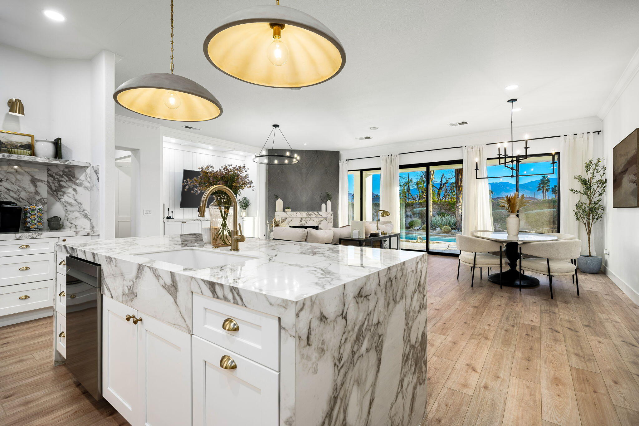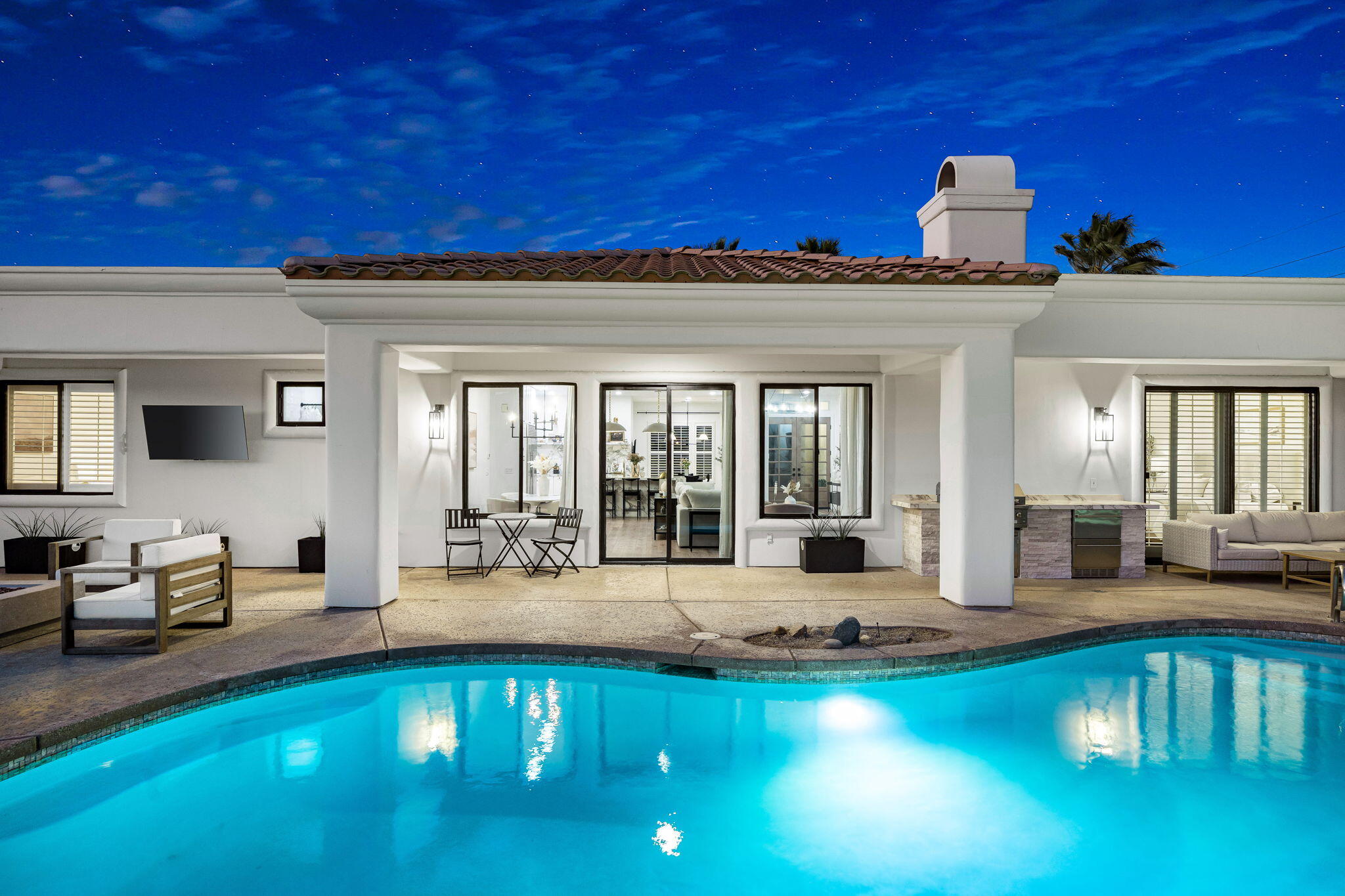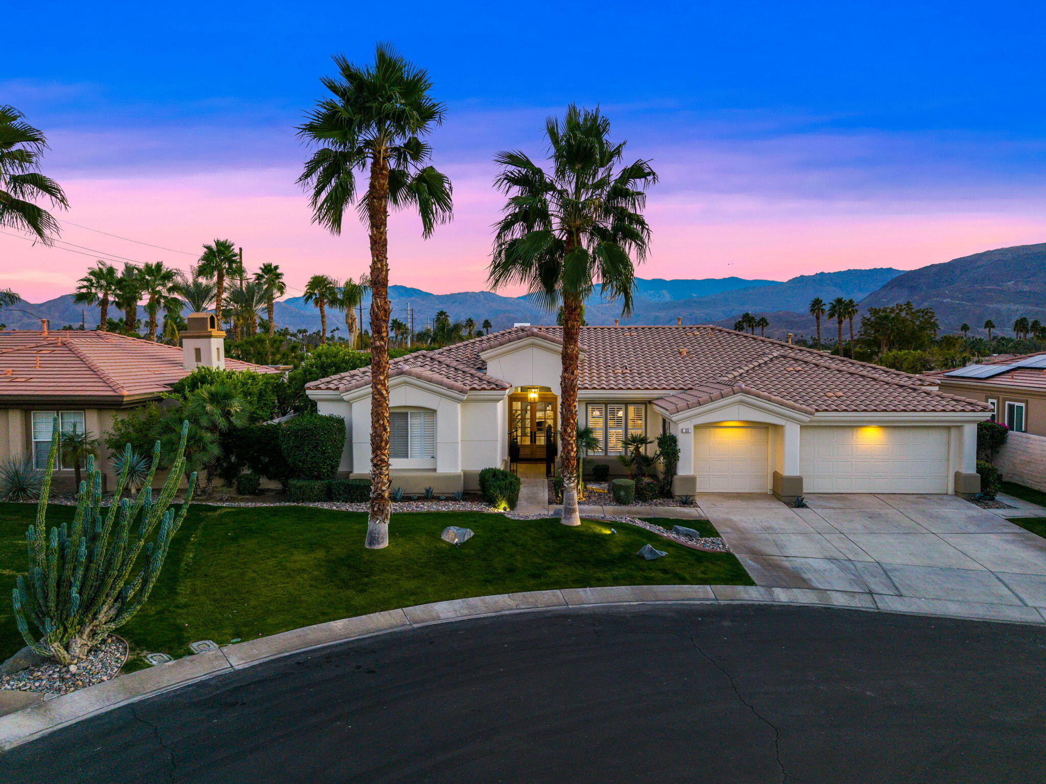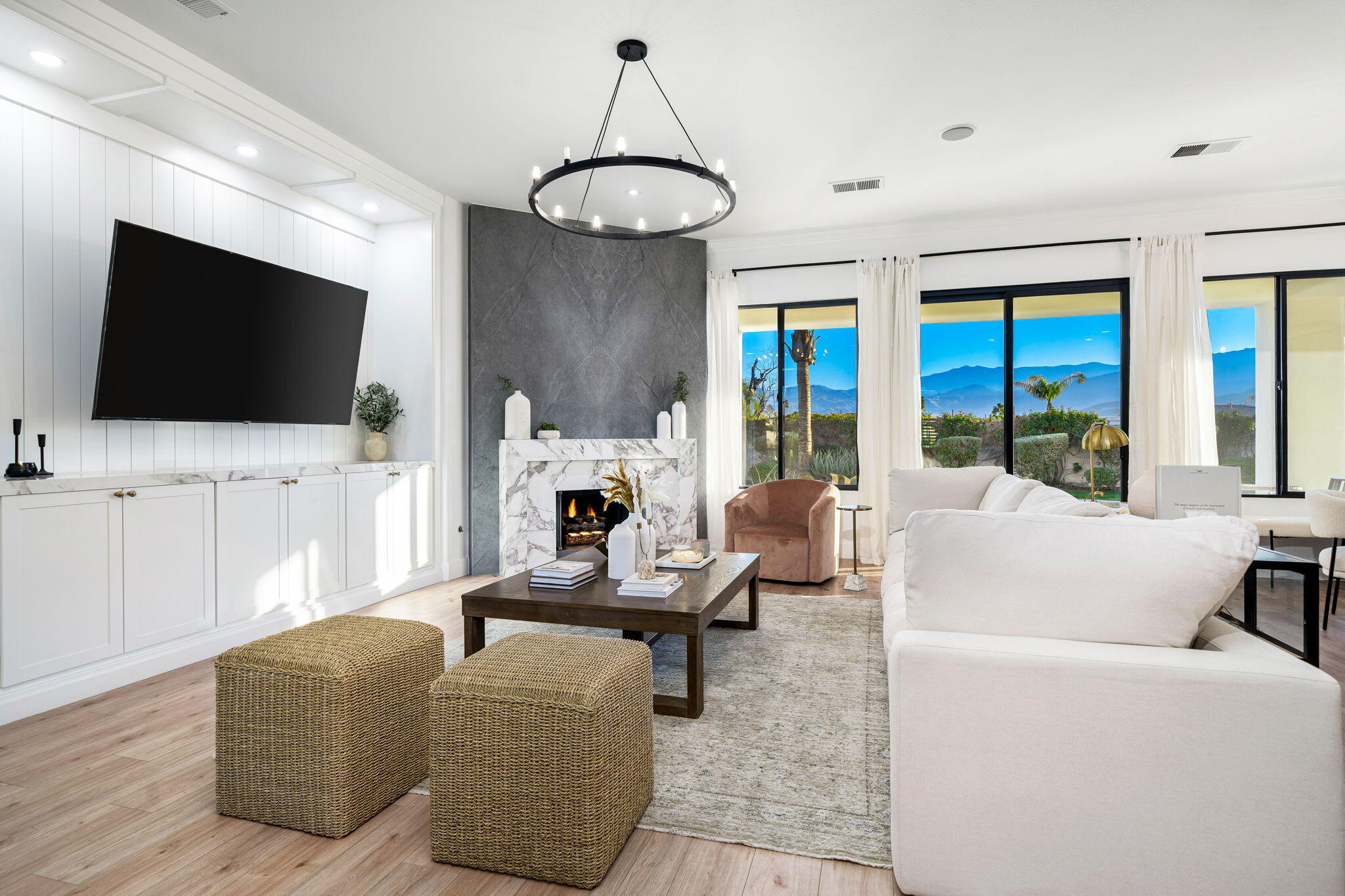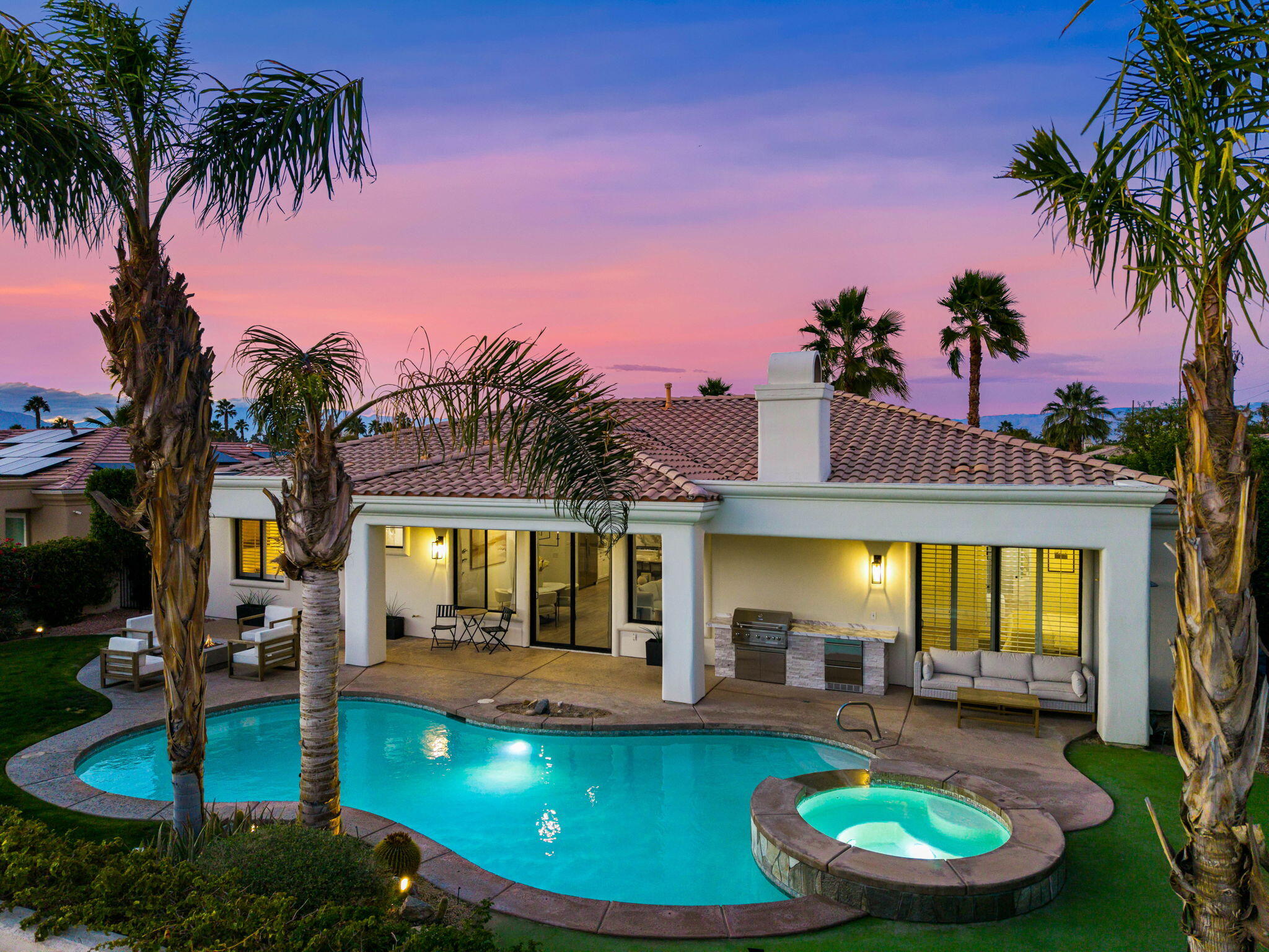 NOW AVAILABLE ALL MONTHS!!!Discover this newly remodeled luxury home nestled within the gated community of La Terraza in Rancho Mirage. Once the model for the community's most desirable floorplan, this spacious single-level residence features 4 bedrooms, including a detached casita with a private entrance, and 3.5 baths, along with a 3-car garage. Set on an expansive nearly 10,019 square foot lot, the home boasts breathtaking mountain views.Spanning approximately 2,362 square feet, this thoughtfully designed property includes a primary suite with backyard access, a double-tray ceiling, a walk-in closet, and a luxurious spa-inspired bath. Every detail has been meticulously crafted, from the high-end luxury vinyl plank flooring to stylish LED lighting fixtures, new millwork, remodeled baths, and a new laundry room equipped with an LG washer and dryer set.As you enter through custom French-style doors, you'll be welcomed by high ceilings and abundant natural light, creating an inviting atmosphere perfect for entertaining or everyday living. The open living and dining area features a stunning custom fireplace, adorned with floor-to-ceiling book-matched porcelain slabs and an elegant full-frame porcelain mantle.The chef's kitchen serves as a true centerpiece, showcasing a custom dual-waterfall island illuminated by premium Visual Comfort pendants, solid birch Shaker cabinetry, polished porcelain countertops with a matching backsplash, a custom porcelain hood, a cozy breakfast nook, and stainless steel appliances, including a 48'' built-in commercial-grade Sub-Zero refrigerator.Step outside to enjoy the expansive pool and spa, a putting green for leisurely activities, and a built-in BBQ station complete with a two-drawer beverage refrigerator--perfect for hosting gatherings. Guests will appreciate the separate casita, which offers a kitchenette with a new under-counter refrigerator and an ensuite bath with a modern vanity. This space also includes a custom-built cabinet wInterested in this Listing?
