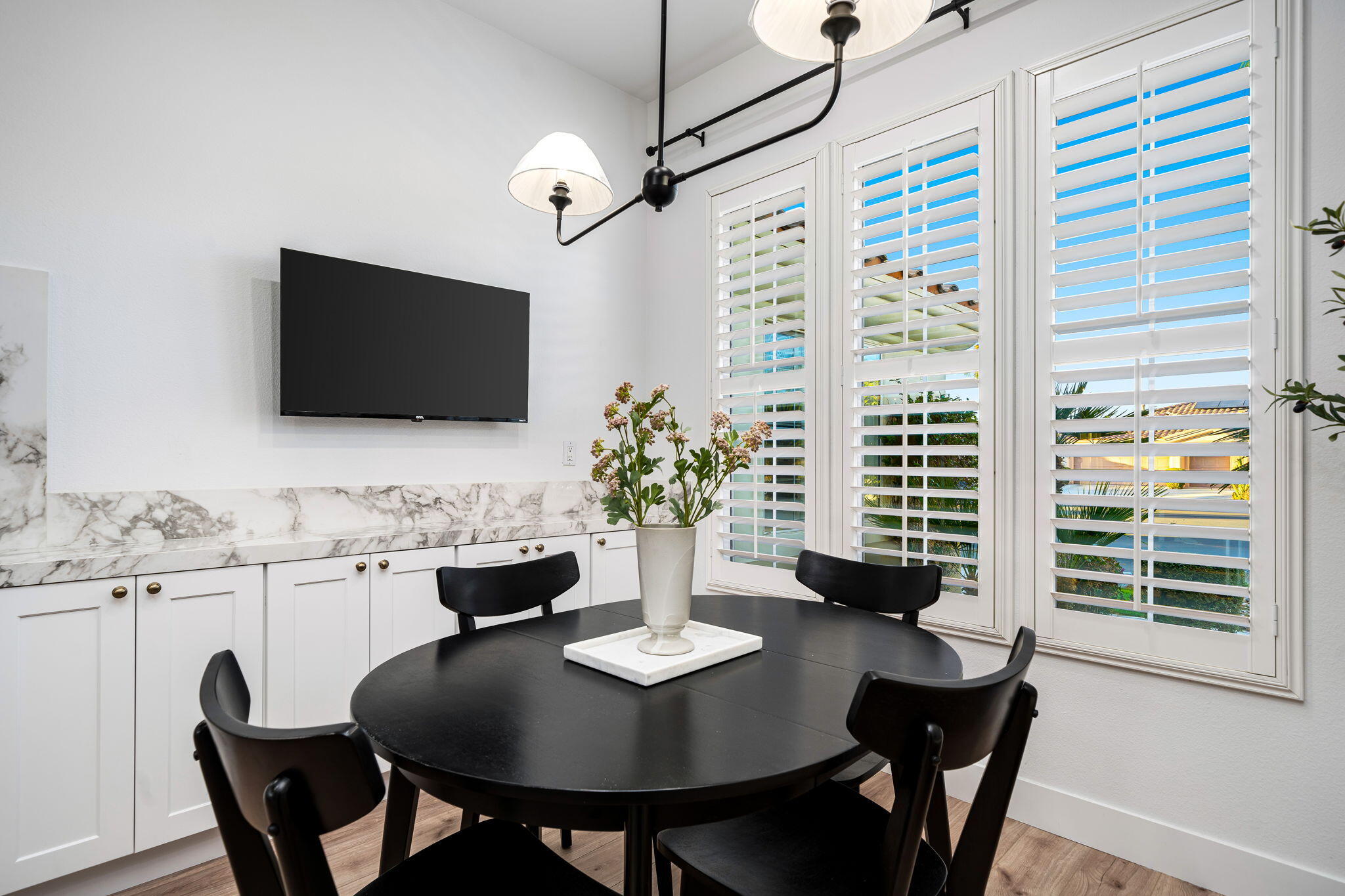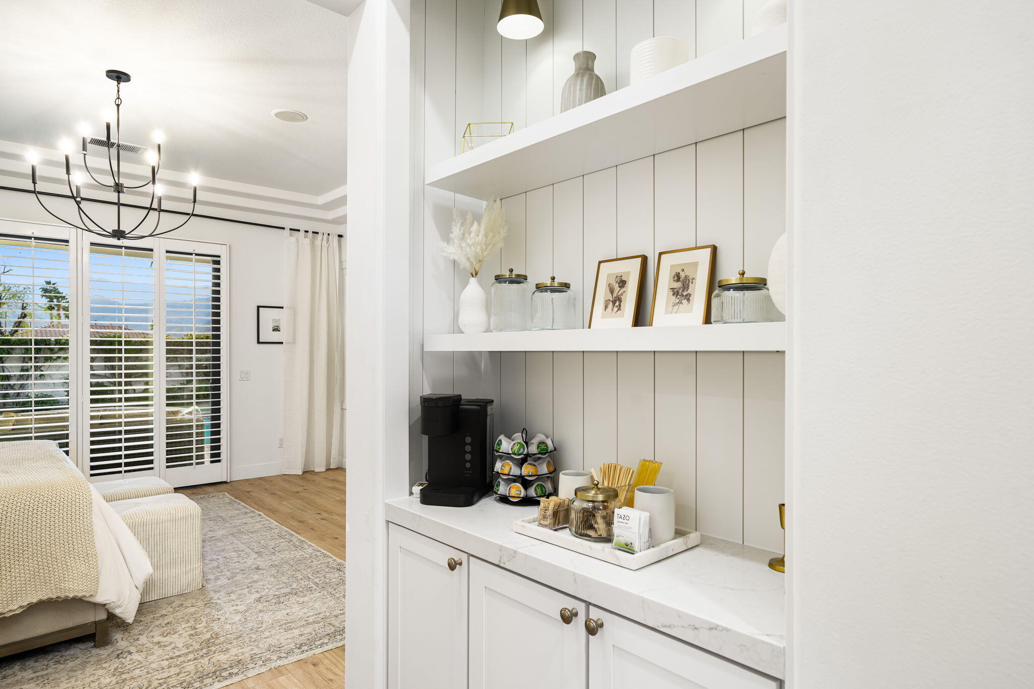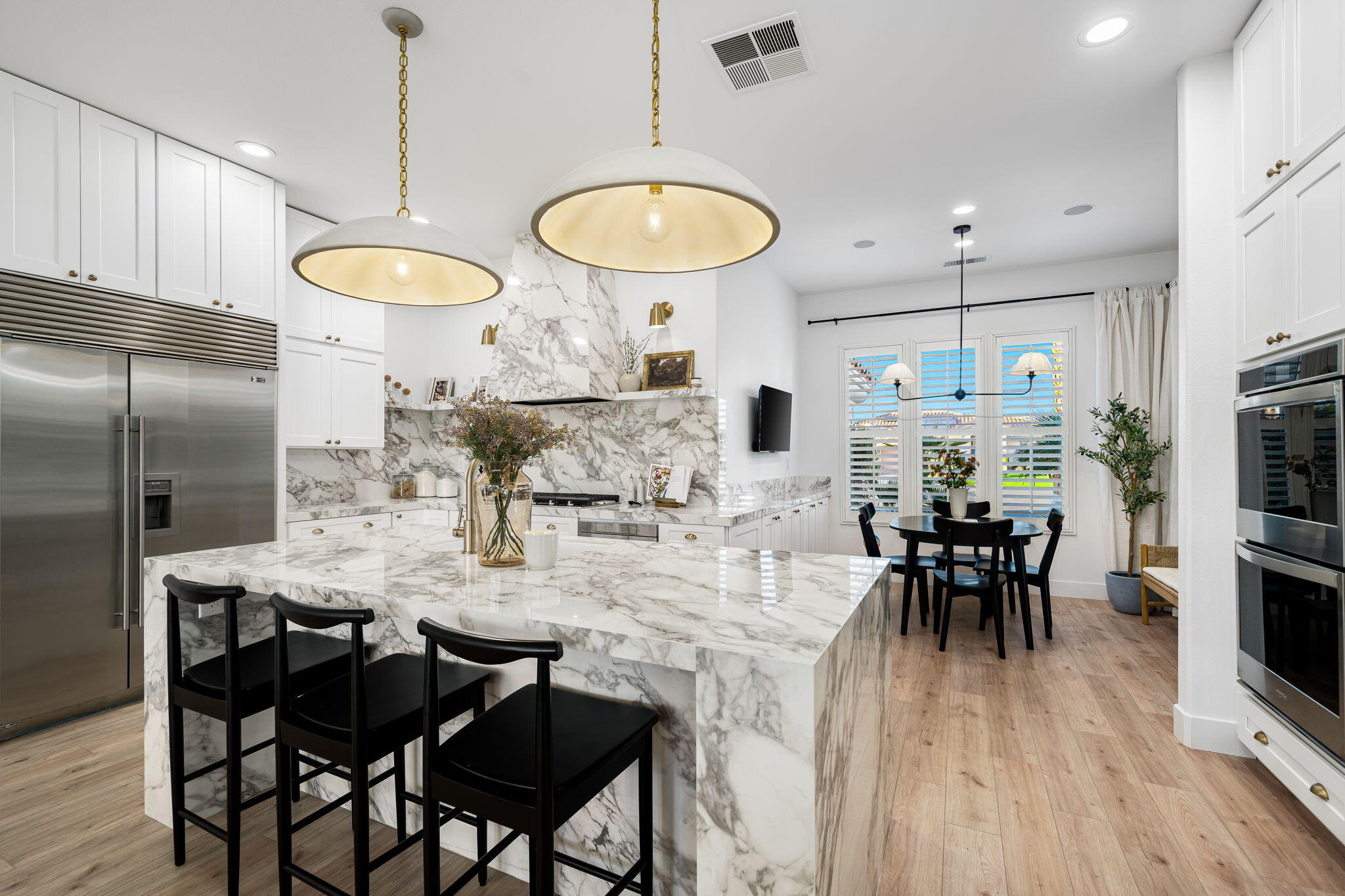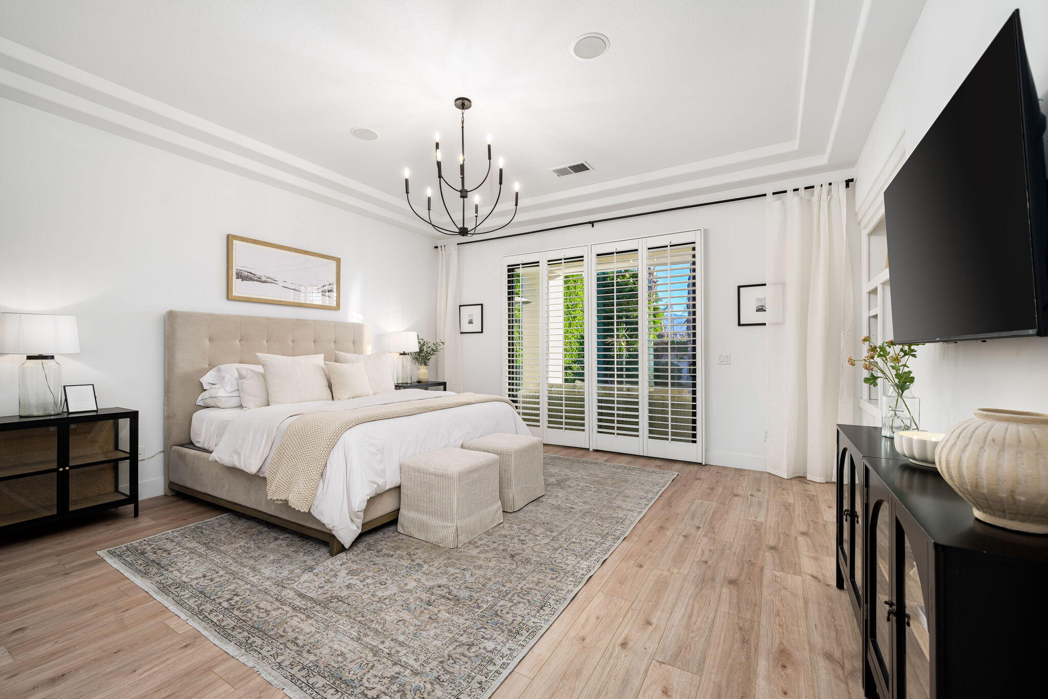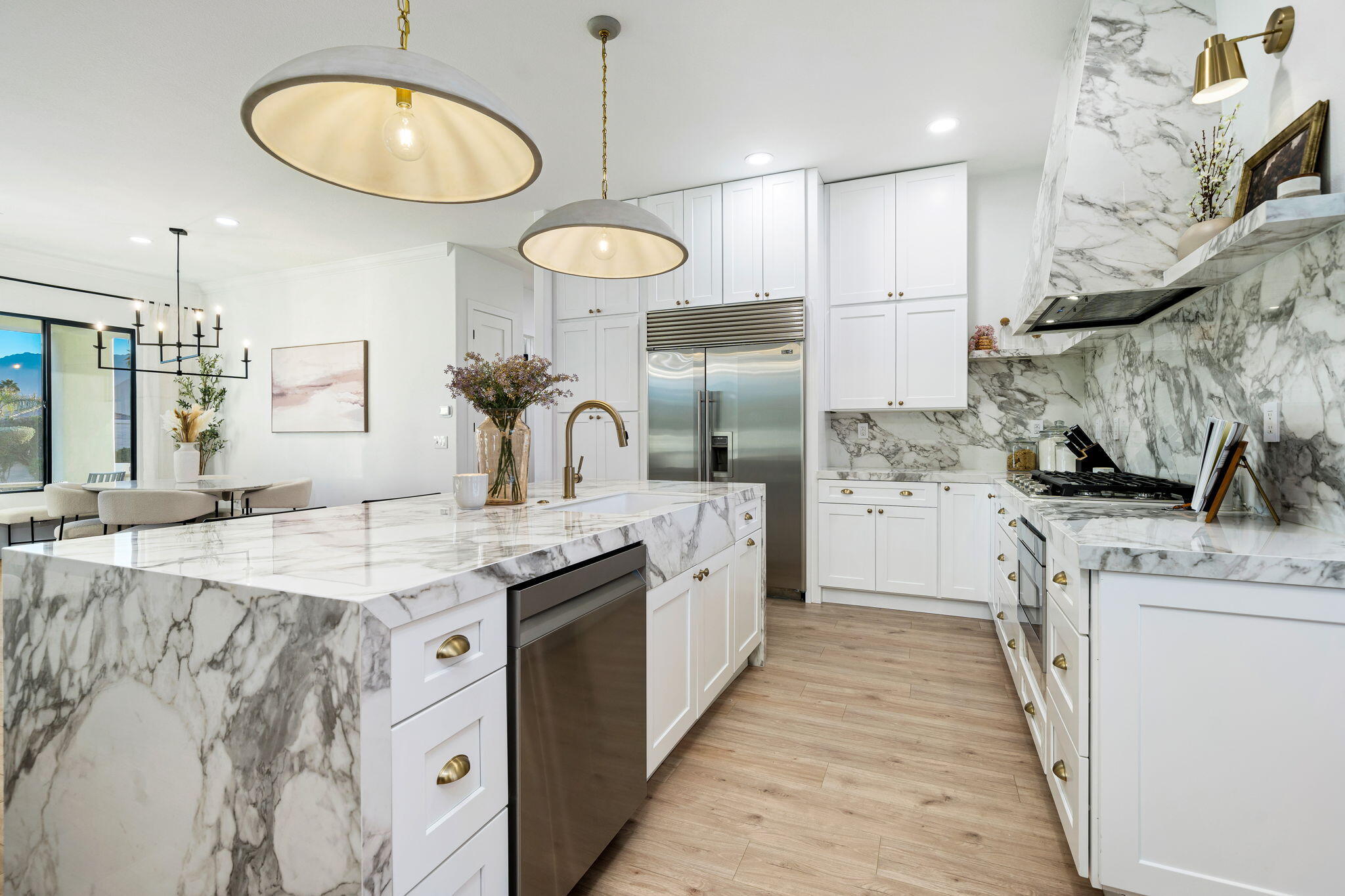 NOW AVAILABLE ALL MONTHS!!!Discover this newly remodeled luxury home nestled within the gated community of La Terraza in Rancho Mirage. Once the model for the community's most desirable floorplan, this spacious single-level residence features 4 bedrooms, including a detached casita with a private entrance, and 3.5 baths, along with a 3-car garage. Set on an expansive nearly 10,019 square foot lot, the home boasts breathtaking mountain views.Spanning approximately 2,362 square feet, this thoughtfully designed property includes a primary suite with backyard access, a double-tray ceiling, a walk-in closet, and a luxurious spa-inspired bath. Every detail has been meticulously crafted, from the high-end luxury vinyl plank flooring to stylish LED lighting fixtures, new millwork, remodeled baths, and a new laundry room equipped with an LG washer and dryer set.As you enter through custom French-style doors, you'll be welcomed by high ceilings and abundant natural light, creating an inviting atmosphere perfect for entertaining or everyday living. The open living and dining area features a stunning custom fireplace, adorned with floor-to-ceiling book-matched porcelain slabs and an elegant full-frame porcelain mantle.The chef's kitchen serves as a true centerpiece, showcasing a custom dual-waterfall island illuminated by premium Visual Comfort pendants, solid birch Shaker cabinetry, polished porcelain countertops with a matching backsplash, a custom porcelain hood, a cozy breakfast nook, and stainless steel appliances, including a 48'' built-in commercial-grade Sub-Zero refrigerator.Step outside to enjoy the expansive pool and spa, a putting green for leisurely activities, and a built-in BBQ station complete with a two-drawer beverage refrigerator--perfect for hosting gatherings. Guests will appreciate the separate casita, which offers a kitchenette with a new under-counter refrigerator and an ensuite bath with a modern vanity. This space also includes a custom-built cabinet wInterested in this Listing?