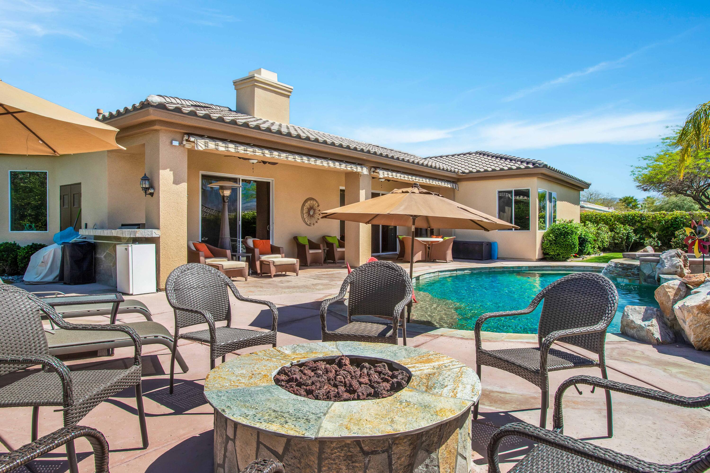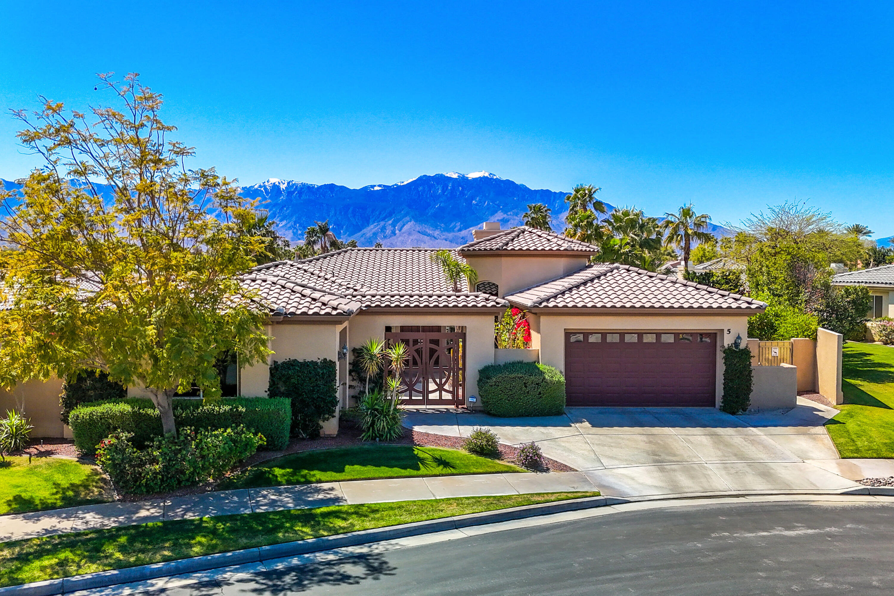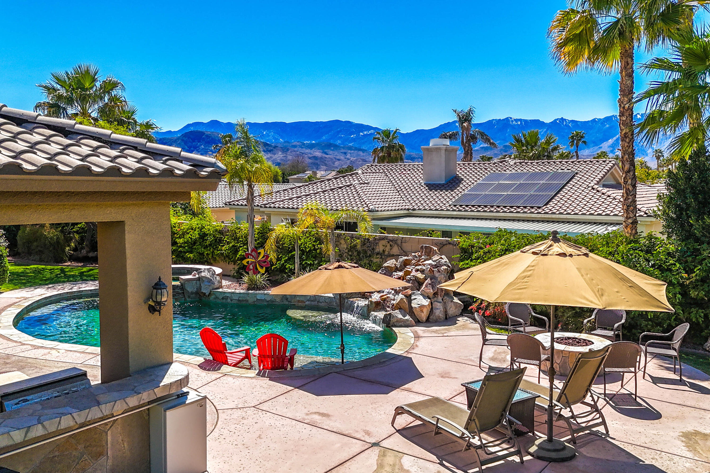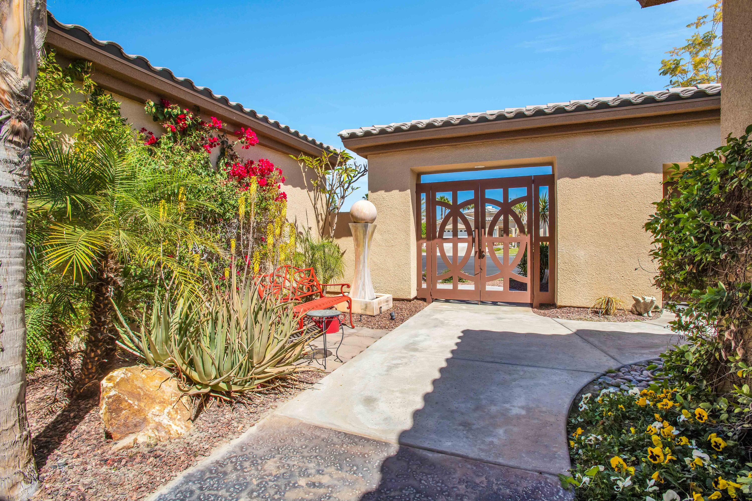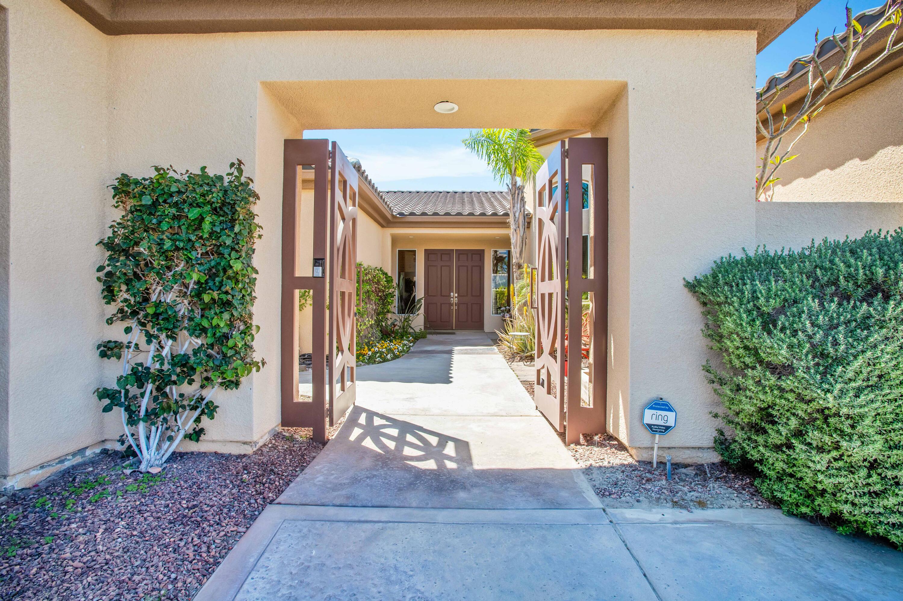 3 months minimum furnished rental available until Jan 15th, 2026. Turnkey furnished, totally remodeled, resort style, saltwater pool w/waterfall home, in super secure, quiet, gated, prestigious neighborhood, located at the end of a quiet cul de sac. Massive security gate into gorgeous courtyard entry. Open floor plan as you enter showcases high-end furnishings like Kreiss, Brown Jordan, Bernhardt, etc. Gorgeous, totally private fenced yard with 8' tall block walls! Outside area encompasses all Palm Springs in known for. Luxury pool and spa, fire pit area, built in BBQ and bar area, plus of course the requisite tangelo and Meyers lemon fruit trees. Inside is equipped for the professional chef or entertainer with every imaginable item a gourmet cook could possibly need in this fully equipped kitchen. The open family and living rooms, plus the primary suite, all feature 55'' TV's. The 3-bedroom suites feature king size, deluxe comfort beds. The community is located mid valley and is extremely convenient to everything, wherever you want to go, and offers Pickleball, Tennis, and basketball courts. West facing rear yard has beautiful views of the San Jacinto mountains.Interested in this Listing?