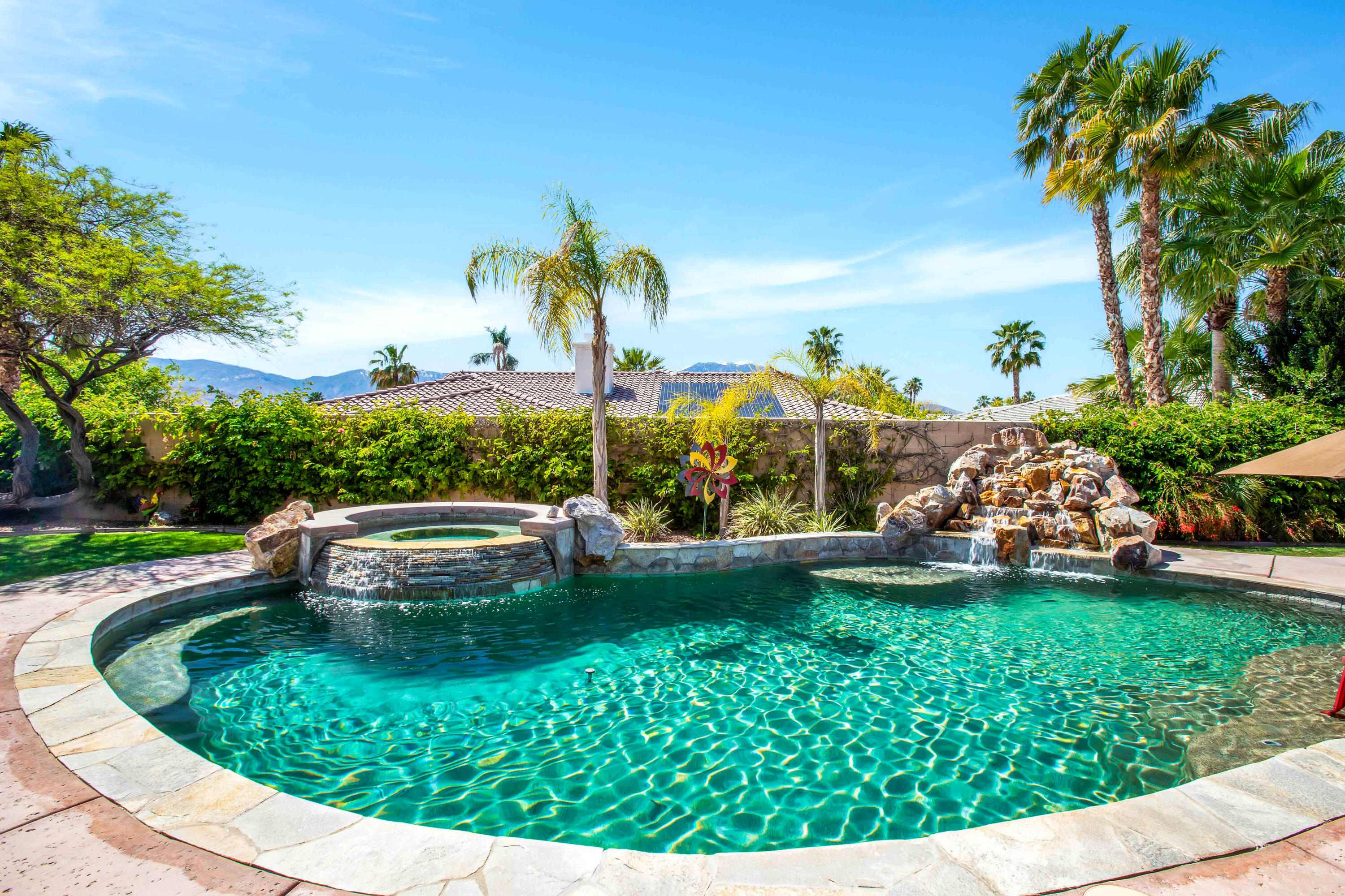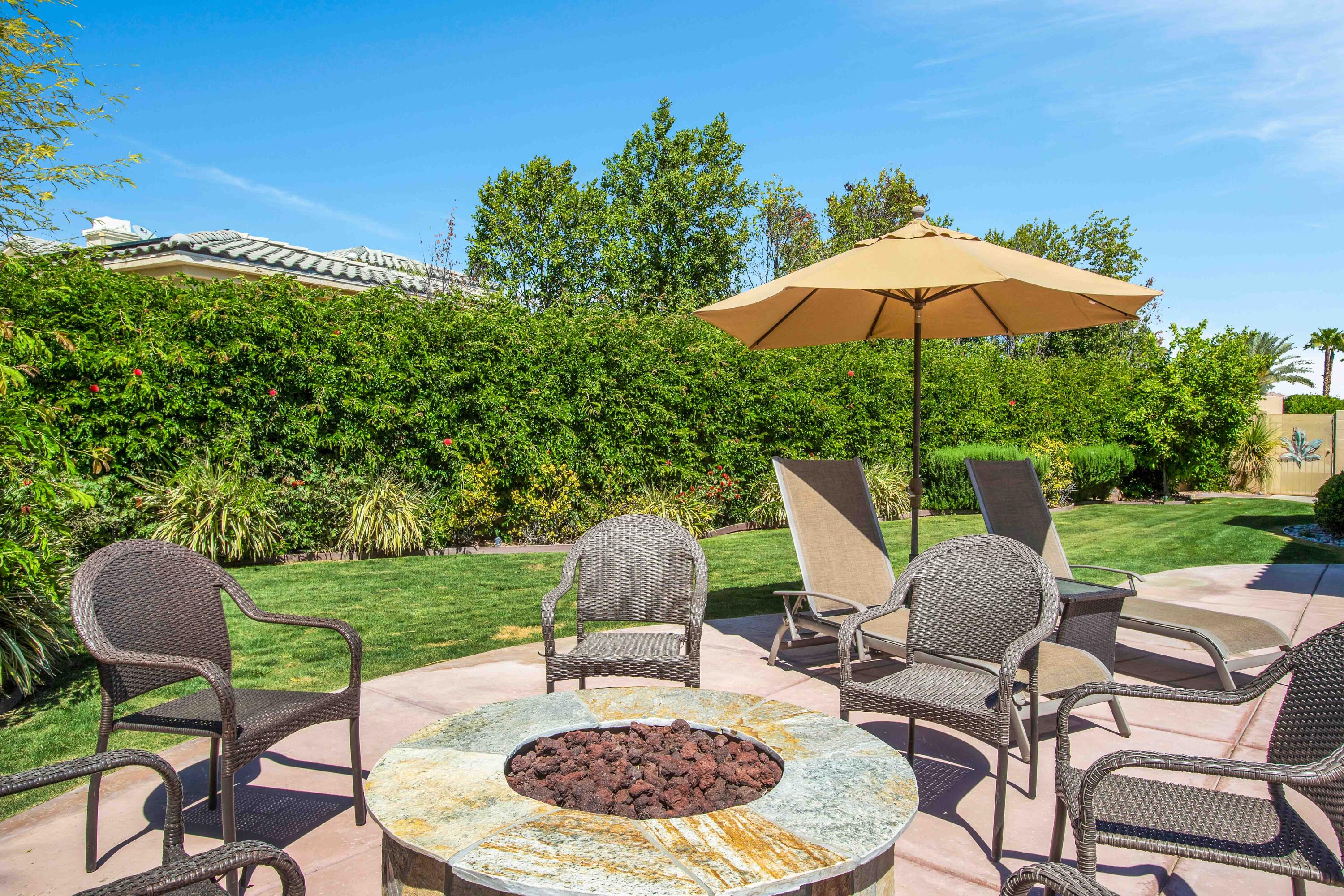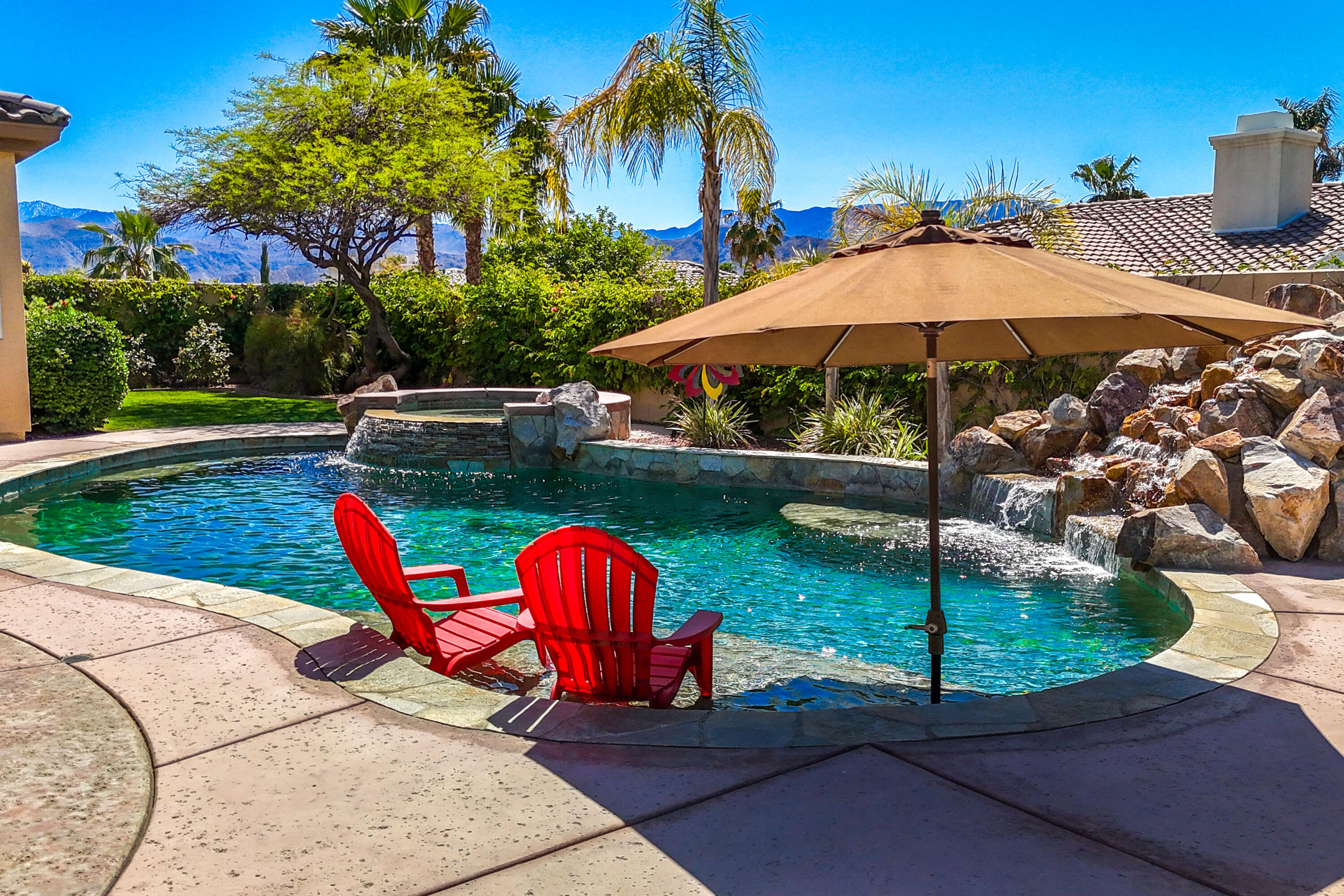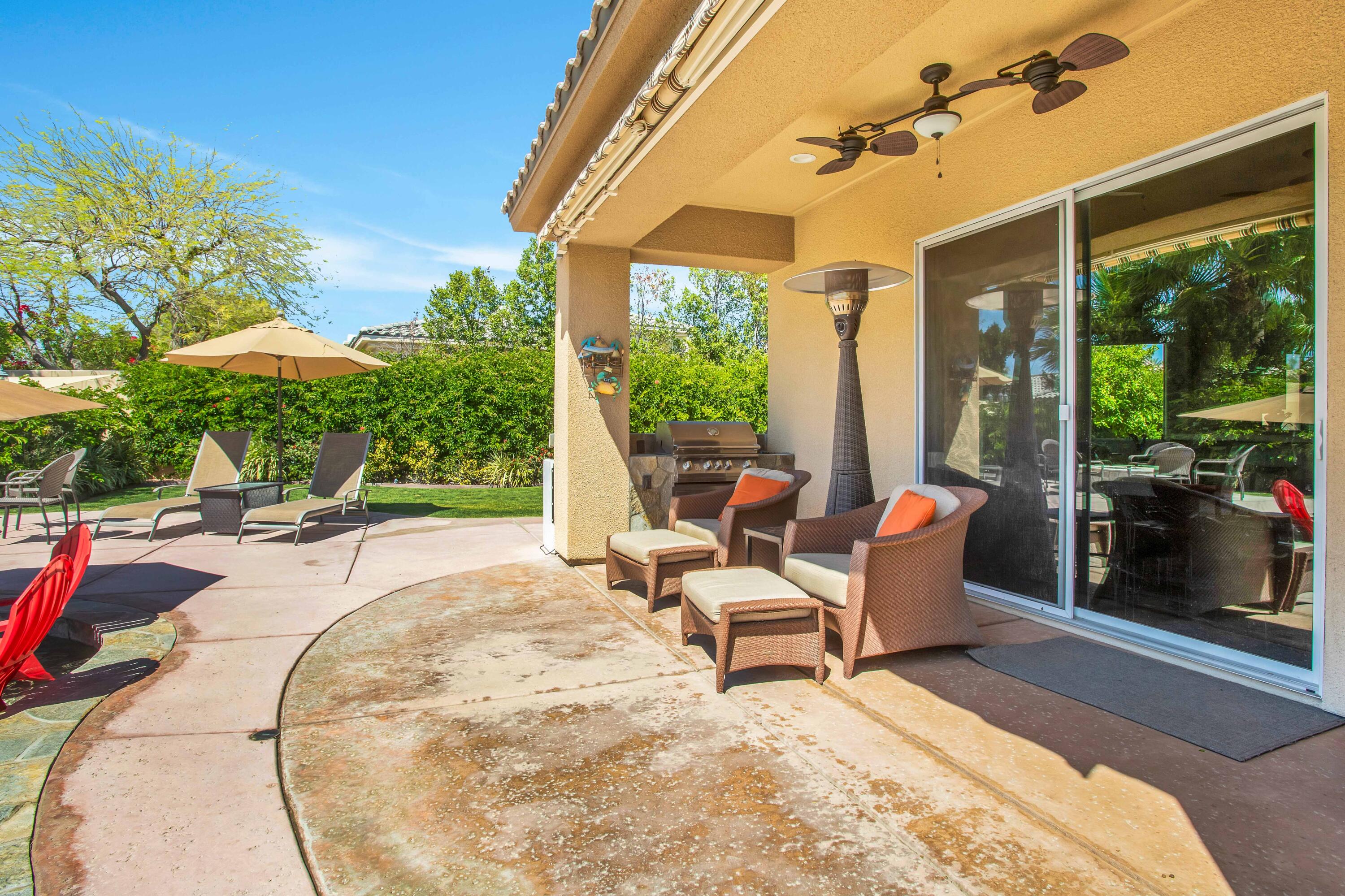 3 months minimum furnished rental available until Jan 15th, 2026. Turnkey furnished, totally remodeled, resort style, saltwater pool w/waterfall home, in super secure, quiet, gated, prestigious neighborhood, located at the end of a quiet cul de sac. Massive security gate into gorgeous courtyard entry. Open floor plan as you enter showcases high-end furnishings like Kreiss, Brown Jordan, Bernhardt, etc. Gorgeous, totally private fenced yard with 8' tall block walls! Outside area encompasses all Palm Springs in known for. Luxury pool and spa, fire pit area, built in BBQ and bar area, plus of course the requisite tangelo and Meyers lemon fruit trees. Inside is equipped for the professional chef or entertainer with every imaginable item a gourmet cook could possibly need in this fully equipped kitchen. The open family and living rooms, plus the primary suite, all feature 55'' TV's. The 3-bedroom suites feature king size, deluxe comfort beds. The community is located mid valley and is extremely convenient to everything, wherever you want to go, and offers Pickleball, Tennis, and basketball courts. West facing rear yard has beautiful views of the San Jacinto mountains.Interested in this Listing?