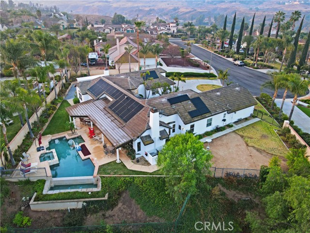 Welcome to luxury living above Citrus State Park's expansive orange groves, a 4 BR/3.5 BATH estate in Heritage Grove. This home embodies the perfect blend of luxury and comfort, offering a unique opportunity to experience upscale living in a tranquil, nature-filled setting. Entering through the private, gated courtyard, you ll be immediately captivated by the home s sophisticated horseshoe-shaped floor plan. Vaulted ceilings and engineered hardwood floors lead you through beautifully designed spaces, highlighted by custom paint and meticulous craftsmanship. A pool room ideal for entertaining or relaxing with family., opens seamlessly to the formal dining area with picture windows looking out onto the outside oasis. The chef s kitchen is a culinary dream, offering a large island, high-end appliances, and a spacious walk-in pantry. Adjacent to the kitchen, a butler s pantry adds extra storage and convenience, making meal prep a breeze. An inviting family room with gas-burning fireplace and media center adjoins the magnificent kitchen. The primary suite is nothing short of a personal retreat. A private gas-burning fireplace sets the perfect mood for relaxation, while the fully remodeled bathroom is an absolute showstopper. Featuring a luxurious copper clawfoot bathtub, a custom "roll-in" shower, quartz countertops, and exquisite copper sinks, this bathroom also boasts cabinets crafted from reclaimed wood sourced from a Montana beef ranch creating a perfect blend of rustic charm and high-end elegance. The outdoor living space features a saltwater vanishing edge pebble-bottom pool and spa, heated by solar panels for eco-friendly enjoyment. The outdoor island kitchen with a built-in grill and beverage cooler provides a perfect setting for al fresco dining and gatherings, while the mature palm trees surrounding the property enhance the sense of tranquility. This property offers ample storage space in both garages and an oversized RV parking area, complete with dual dump stations for added convenience. The home is also powered by 60 solar panels, complemented by two Tesla Powerwall2 lithium batteries, ensuring energy efficiency and sustainability. For those seeking a slower, more peaceful pace of life, this property is a rare find. Enjoy the serene, country atmosphere while remaining just a short drive from all the conveniences of city living. This is more than just a house it s a lifestyle. Don t miss the opportunity to call this spectacular property your own.Interested in this Listing?