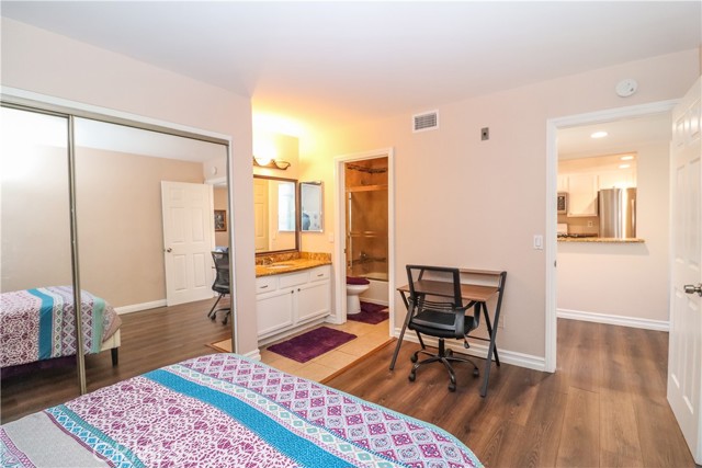 Welcome to this charming 2-bedroom, 2-bathroom condo in Riverside, California, just a short walk from the University of California, Riverside (UCR)! Located on the first floor, this well-maintained home features beautiful wood-like flooring throughout. As you step inside, you'll immediately appreciate the spacious open layout, where the living and dining areas seamlessly connect to the modern kitchen. The kitchen boasts granite countertops, newer appliances, and a fresh, updated feel. Both primary bedrooms are identical in size, each offering large mirrored closets and a private en-suite bathroom. The bathrooms include granite countertops, a separate toilet area, and a tiled shower/bathtub combo with sliding glass doors. Enjoy the benefits of new windows throughout and a large private patio, perfect for entertaining or relaxing outdoors. Don't miss out on this fantastic opportunity schedule your showing today!Interested in this Listing?