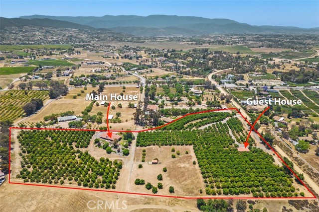 Exquisite Temecula Wine Country Estate with Dual Residences. Nestled in the heart of Temecula s renowned Wine Country, this stunning 12+ acre estate offers a rare blend of luxury and tranquility, featuring two beautifully maintained residences and a certified organic citrus grove. Main Residence: This timeless, single-story home spans 3,173 sq. ft. and showcases an open floorplan that bathes in natural light and offers breathtaking views. The spacious living room, adorned with a cozy fireplace, flows seamlessly into a formal dining area and a family room complete with a second fireplace and wet bar. The chef s kitchen is a culinary delight, featuring a walk-in pantry, built-in desk area, and breakfast room. The inviting primary suite serves as a serene retreat, boasting its own fireplace, an expansive closet, and direct access to the backyard. The luxurious primary bath offers ample counter space, a makeup vanity, a walk-in shower, and a jetted tub with picturesque views of the tranquil property. Additionally, there are two well-appointed bedrooms, one with an ensuite bath. The large laundry room includes a sink, skylights, abundant storage, and comes with a washer and dryer. Outdoor living is equally delightful, with spaces perfect for enjoying morning coffee with sunrise or an evening glass of wine while taking in stunning sunsets. The property s organic citrus grove adds a unique touch of peace and serenity. Guest Residence: The 1,051 sq. ft. guest house offers one bedroom and 1.5 baths, ideal for visitors or extended family. Additional Features: Total combined square footage for both homes: 4,224 sq. ft. Professionally managed Certified Organic Citrus Grove Two separate water meters, two electric meters, and two septic systems Main house utilizes propane; guest house is all electric. Low taxes and NO HOA. Conveniently located near Temecula s premier wineries, shopping, schools, historic Old Town Temecula, Pechanga Resort, and the I-15 freeway. This exceptional property offers both seclusion and easy access to local amenities.Interested in this Listing?