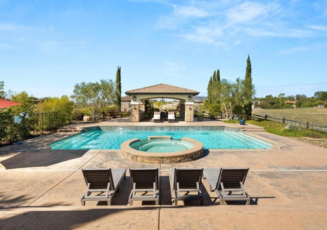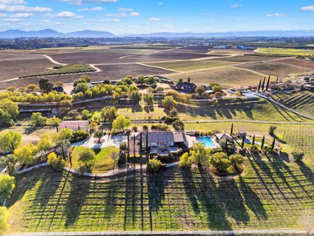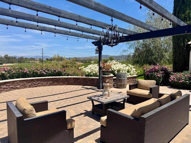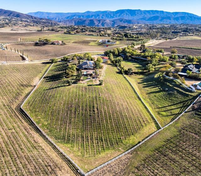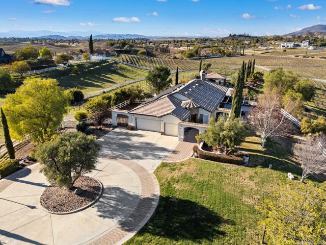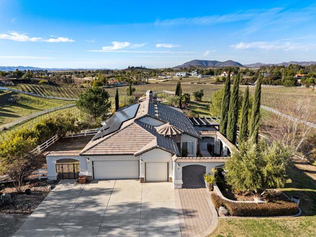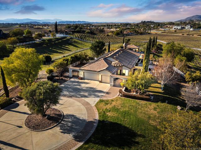 $136,000 Price Drop!! Come experience wine country living at its finest with this breathtaking Wine Country Luxury Vineyard Estate spanning 5.39-acres. Perfectly perched on a bluff in the heart of Temecula Wine Country. Surrounded by walkable award-winning wineries, rolling hills, and stunning sunset views, this exclusive retreat offers an unparalleled blend of elegance and tranquility. Step inside this beautifully designed 3-bedroom, 2-bathroom home, where an open-concept floor plan welcomes you with refined finishes and effortless indoor-outdoor flow. The gourmet chef s kitchen, complete with top-tier appliances and an oversized island. This home is perfect for entertaining, a small private wedding, fun get togethers or enjoying a glass of your own estate-grown Cabernet Sauvignon. Outside you will find a sprawling covered patio with a grand stone fireplace for unforgettable evenings, overlooking your very own 3800 Cabernet Sauvignon vines, a resort-style 40,000-gallon pool, and spa along with a fully covered outdoor living room complete with built in bbq. A private vineyard-side studio offers endless possibilities art retreat, meditation room among the vines, or office while the 40x50 barn with a climate-controlled "wine room" adds to the estate s exceptional amenities. Equipped with solar power and agricultural water rates, this estate is as sustainable as it is stunning. Wake up to hot air balloons floating overhead, sip wine by sunset, and embrace the magic of vineyard living in this one of a kind dream property.Interested in this Listing?