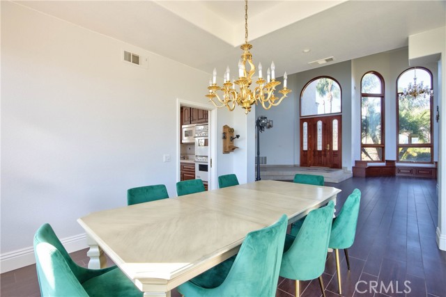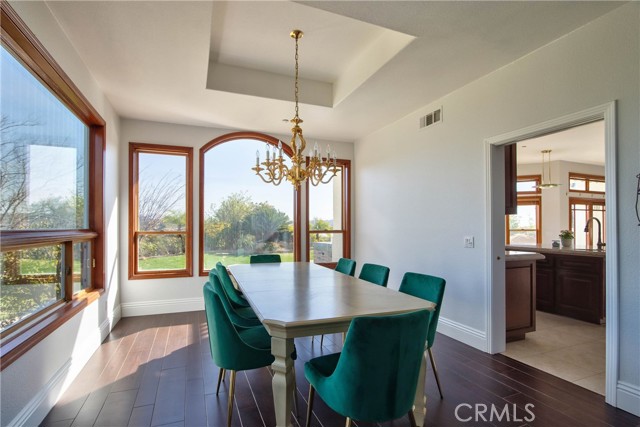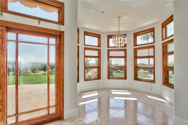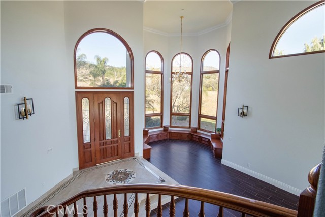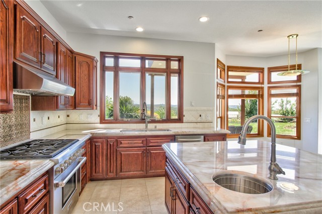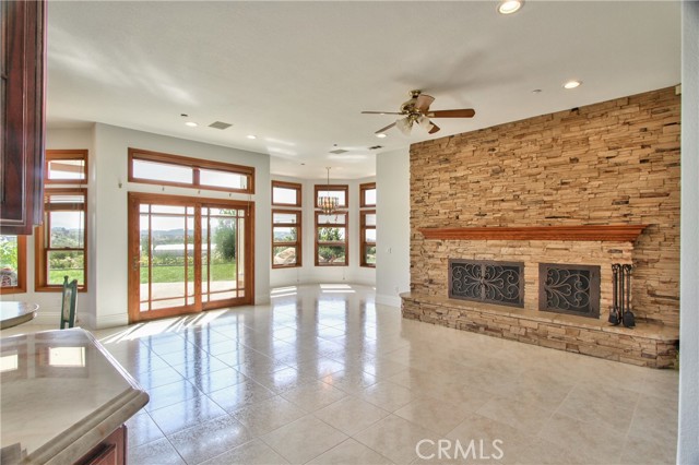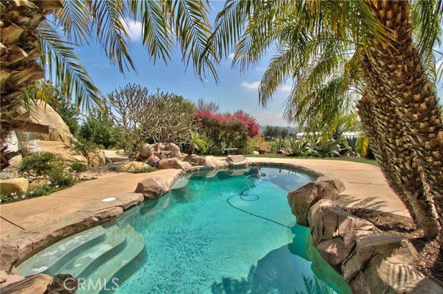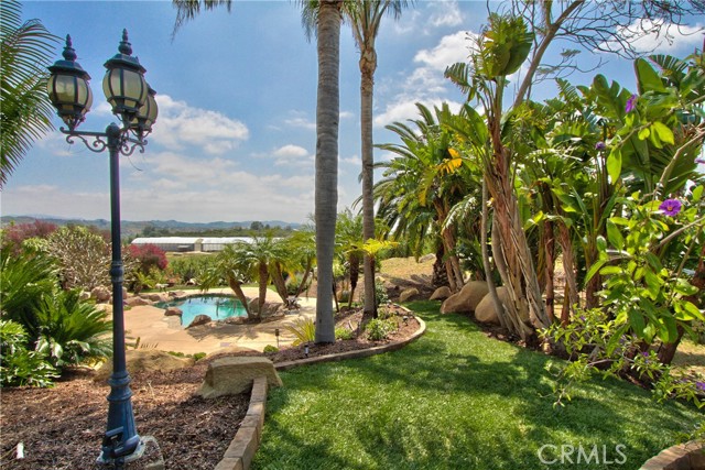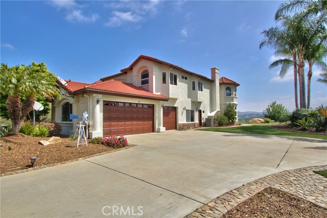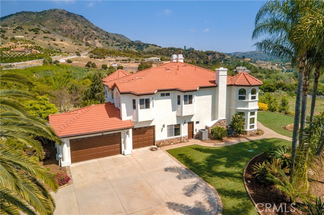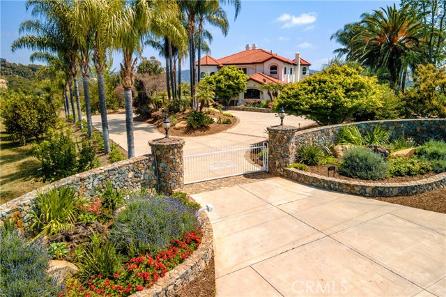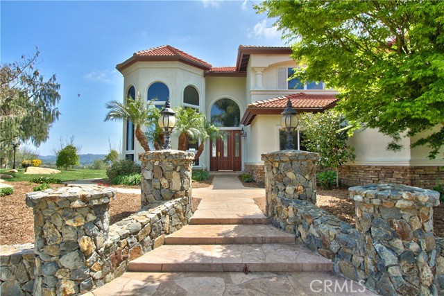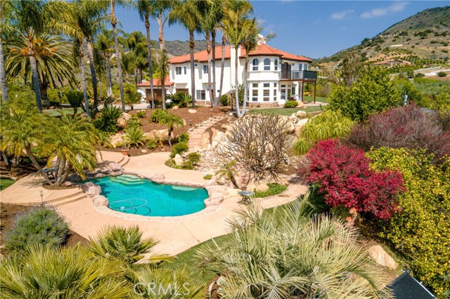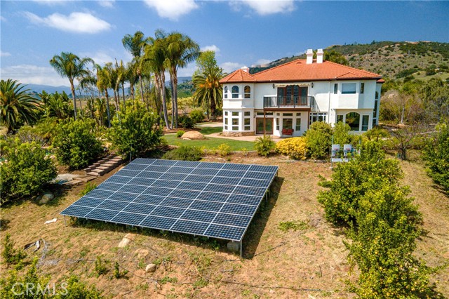 Beautiful Mediterranean villa with panoramic view located on 8+, almost flat acres (perfect for a new vineyard). 5-bedroom 3-bathroom 3 car oversized attached garage. Viking and Wolfe stainless appliances, beautiful onyx counter tops, kitchen has great open concept with adjoining family room with fireplace and breakfast nook. Crystal chandeliers, ornate marble fireplace in living room and formal dining room. Total of 3 woodburning fireplaces in the home all wood burning. Primary bedroom with fireplace, private balcony with awning. Spa bathroom with walk-in closet. 4 bedrooms upstairs one downstairs. Beautiful mature landscaping. Stunning pool area. Plenty of room for a guest house, ADU, RV Garage or shop. Open areas around the property will accommodate full size tennis court. Three sides of the property are fenced, automated entry gate with call box. De Luz Ranchos HOA. Solar is paid for.Interested in this Listing?