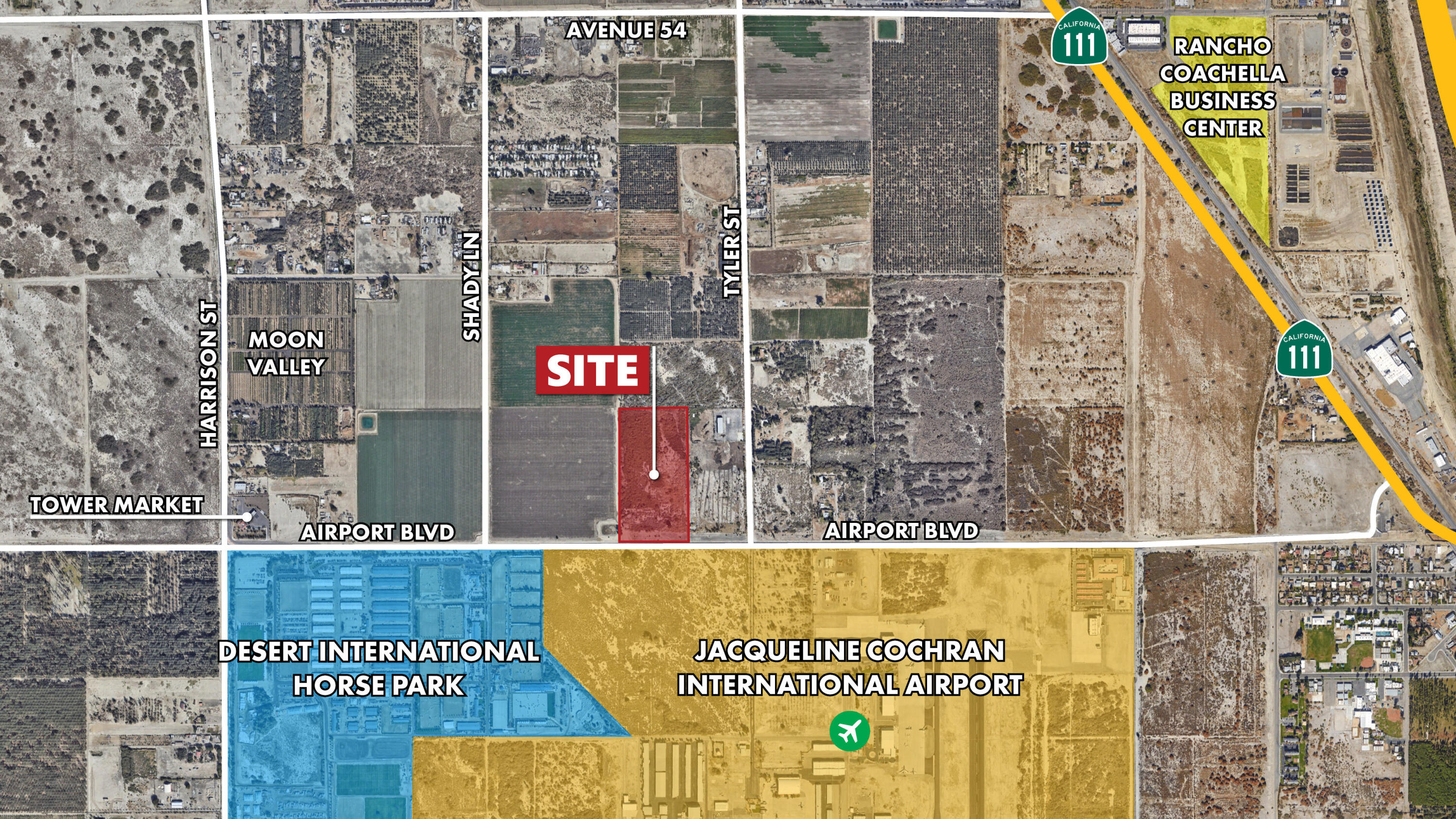 Conceptual plans for 392,880 SF industrial building and 300,110 SF state-of-the-art four building master-planned industrial project with dock high loading & large yards (see page 3). Utilities in street. Approx. 13,800 cars/day on Hwy 111. New interchange at Airport Blvd & Expressway 86. Three miles to The Thermal Club, a private high end race track. Close to the acclaimed Desert International Horse Park. Across from Jacqueline Cochran Regional Airport, with 43,500 aircraft operations in 2023. Jacqueline Cochran Regional Airport is currently exploring the possibility of adding commercial airservice and cargo service to the facility.Interested in this Listing?
