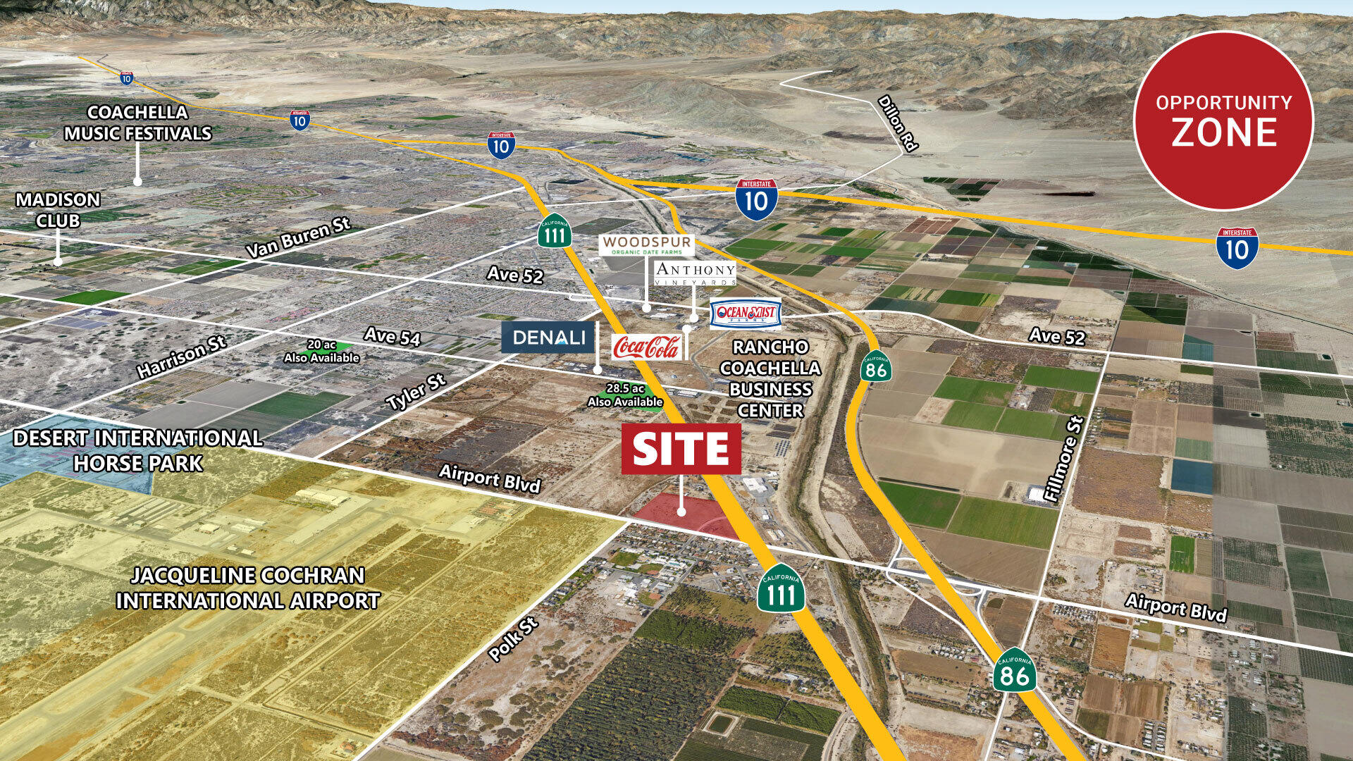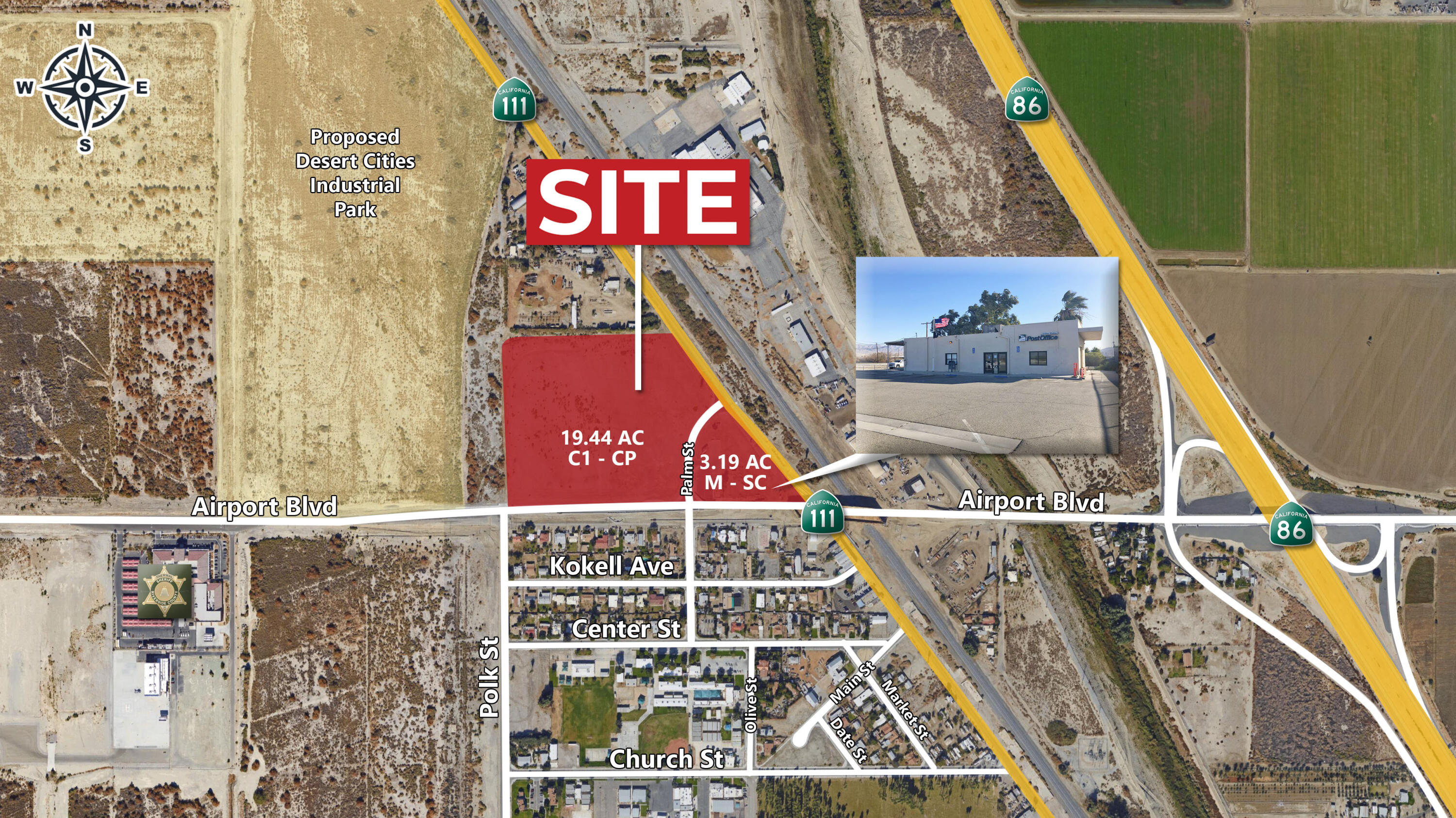 Utilities to the Site. Commercial and industrial zoning. Approx. 13,800 cars per day on Hwy 111. New overpass at Airport Blvd & Highway 111. Prime intersection at Hwy 111 and Airport Blvd. New interchange at Airport Blvd & Expwy 86. Three miles to The Thermal Club, private high end race track. Close to the acclaimed Desert International Horse Park. Includes post office lease. Lease expires 6/30/27. Close to entrance of Jacqueline Cochran Regional Airport. Do Not Disturb Tenants.Interested in this Listing?