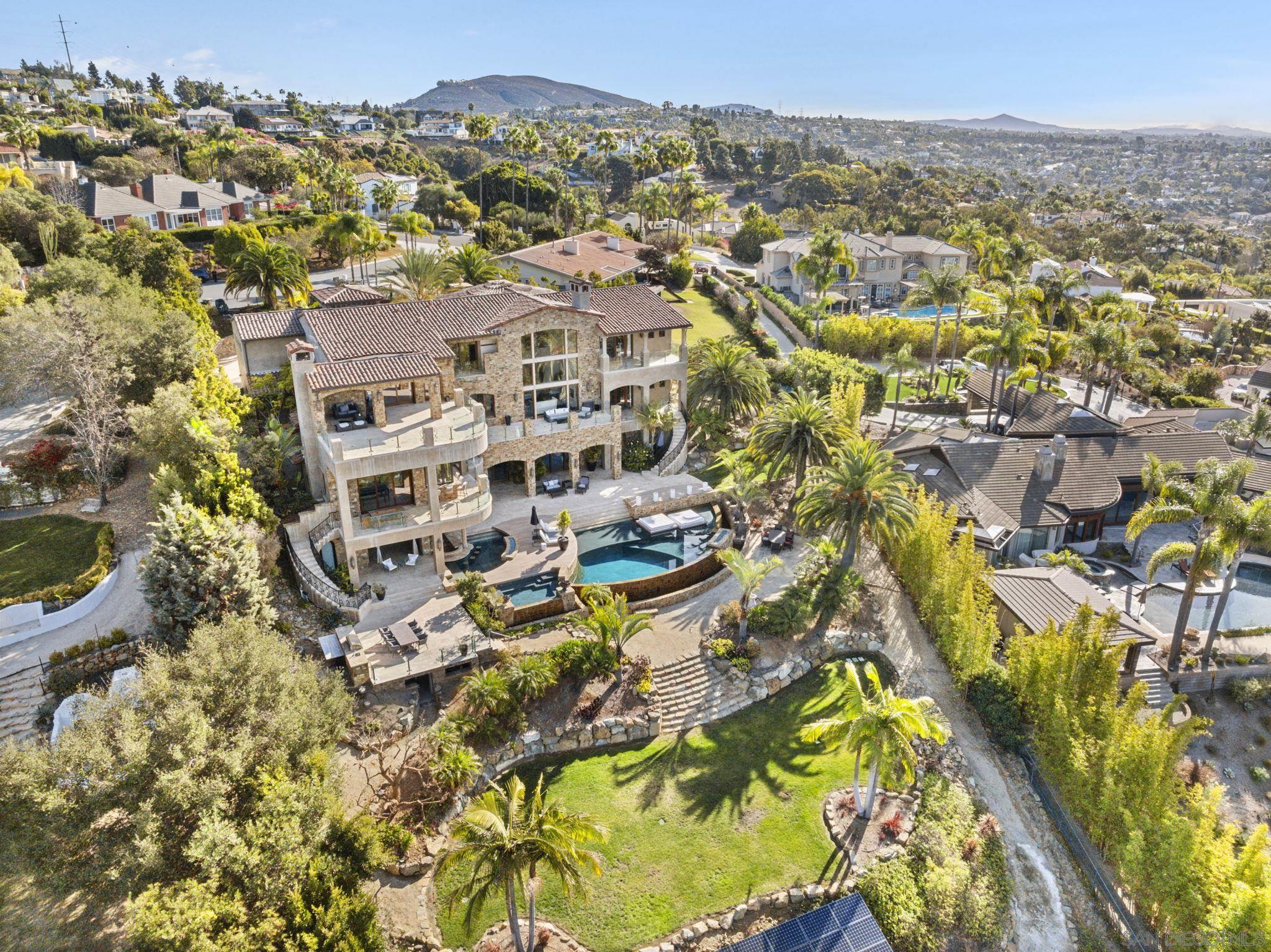 This Mediterranean estate sits on a tranquil one-acre cul-de-sac with breathtaking-unobstructed 180-degree views of the ocean, lagoon, and the iconic La Costa Resort and Spa golf course. An architectural masterpiece, this multi-level residence boasts 5 luxurious bedrooms and 9 lavish bathrooms, with approximately 12,000 square feet of indoor and outdoor living space designed for seamless entertainment and relaxation. The details of this home are meticulously curated to perfection. Custom-made Albertini windows and doors from Italy allow for a seamless blend of indoor/outdoor living, with main areas featuring pocketed sliding doors that open to panoramic vistas. Exquisite craftsmanship is evident throughout, from hand-carved stone fireplaces to bespoke light fixtures, including a stunning, hand-blown Murano glass chandelier imported from Venice, Italy. The heart of the home host a massive chef s kitchen, thoughtfully designed for entertaining. Outside, a cabana with full chefs kitchen, BBQ island, two resort-style pools including a swim up bar and integrated pool beds with separate oversized jacuzzi, and multiple terraces create a private oasis for entertainment or relaxation. Additional amenities include an elevator for convenience, 250 gallon aquarium, and a private entry gate that ensures the utmost privacy and exclusivity.Interested in this Listing?