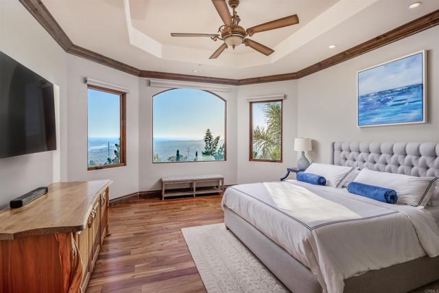 Unrivaled craftsmanship of a 2011-built Italian-Mediterranean estate showcasing a 180-degree lagoon and ocean view within one of Carlsbad s most desired neighborhoods. Designed by Alex Friehauf, this residence blends artisanal craftsmanship with modern sophistication in an open-concept sanctuary where 15-foot pocket doors dissolve boundaries between refined interiors and 1,450 square feet of covered view decks, perfect for hosting with the backdrop of a vibrant Pacific sunset. Floor-to-ceiling 8-foot windows frame endless vistas of Batiquitos Lagoon, La Costa Resort, and distant Catalina and San Clemente Islands, accentuated by custom hardwood doors, tumbled travertine tiles, and bespoke wrought iron railings. First floor primary bedroom and an open floorplan that bathes every room in natural light, with a smooth Santa Barbara finish exuding timeless allure. The chef s kitchen, an entertainer s dream, boasts designer appliances, a prep kitchen, butler s pantry and numerous custom cabinetry improvements. Outside, a solar-heated saltwater pool and spa, multiple entertainment areas that are complimented by drought-friendly landscaping, a thriving fruit orchard (passion fruit, peach, mango, fig, orange, plum, avocado, lemon), a new vegetable garden, and a greenhouse. A Buddha fountain and front waterfall whisper tranquility, while a terraced lot city-approved for an ADU or potential tennis/sport court offers additional possibilities. The primary suite indulges with hardwood floors, expansive walk-in closet with custom cabinetry, a soaking tub, newer steam shower and sauna. Recent improvements include a whole-house filtration system, Sonos surround sound, Leutron LED lighting system, custom window shades, three-zone HVAC, tankless water heaters, and solar electric system for unmatched efficiency. CAT6 wiring and a new security system keep you connected and secure. Storage is extraordinary, with a 3.5-car garage, utility toy garage, all with epoxy floors and additional under-house storage. The pinnacle of modern luxury. Ready for its next visionary owner to cherish North County s most iconic views.Interested in this Listing?