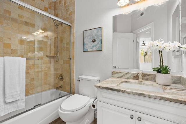 RARE CARLSBAD VILLAGE CORNER UNIT ONE BLOCK FROM THE BEACH! This gorgeous 2 bedroom 2.5 bathroom townhome is just steps from the sand and in the vibrant heart of Carlsbad Village. This spacious light and bright townhome has an open-concept living space featuring crown molding, wide plank laminate wood flooring and a seamless flow between the kitchen, dining, and living areas. The modern, remodeled kitchen boasts granite countertops, stainless steel appliances, and white cabinetry, designed for entertaining and the living room features a cozy fireplace. Step outside to your private balcony and enjoy the ocean breeze! The primary suite is a private retreat with a walk-in closet and an beautiful en-suite bathroom complete a custom oversized shower and updated vanity with dual sinks. There is also a spacious secondary bedroom with an upgraded bathroom. This secured building offers peace of mind and the unit includes dedicated gated parking with two spots and additional storage in the garage. Village By The Sea is a highly desirable condo community with a fitness area, spa and recreation center. With Carlsbad s pristine beaches, boutique shops, top-rated restaurants, highly rated schools and the Coaster Station just a short stroll away, this stunning home is the pinnacle of coastal living.Interested in this Listing?