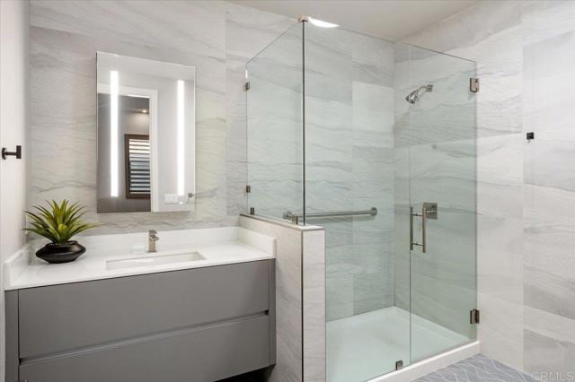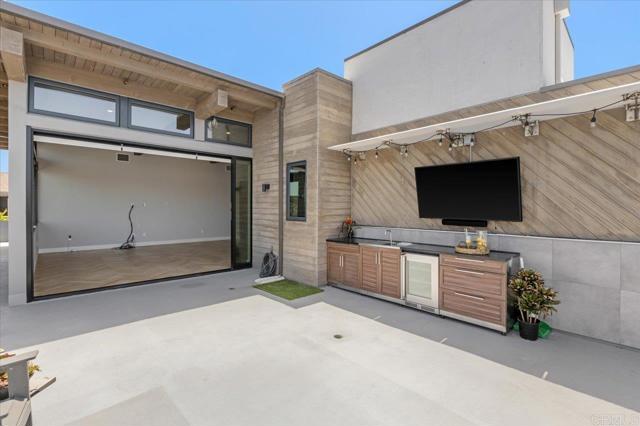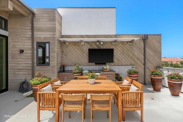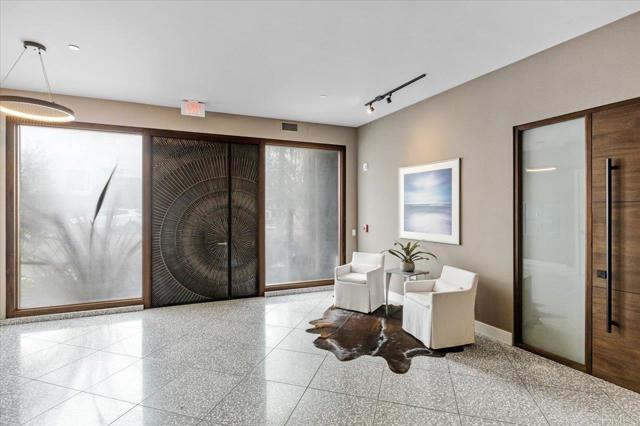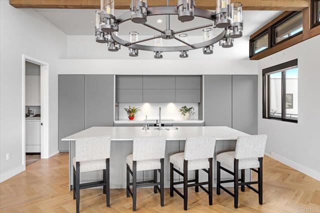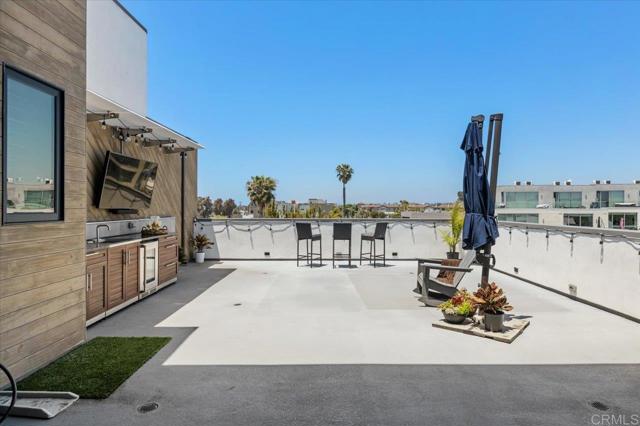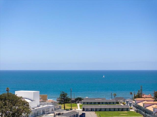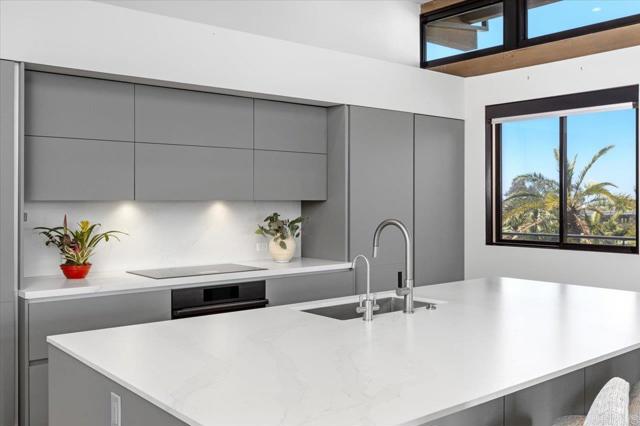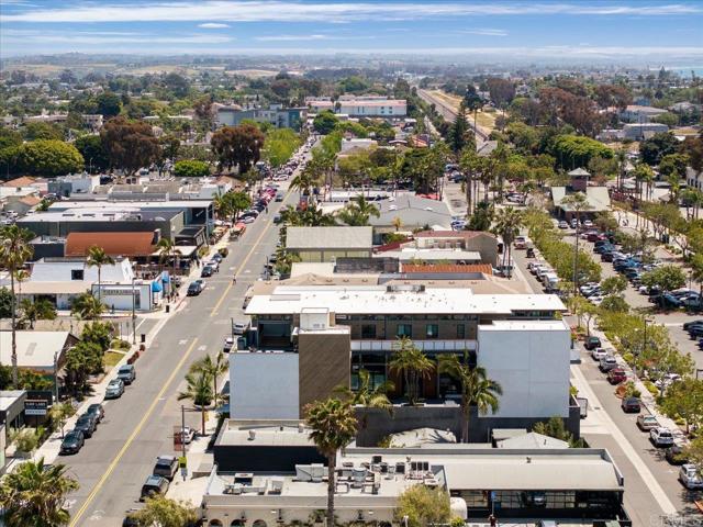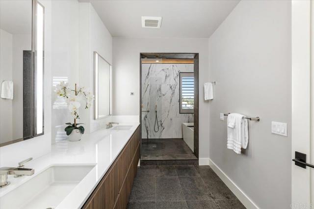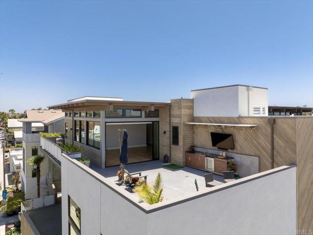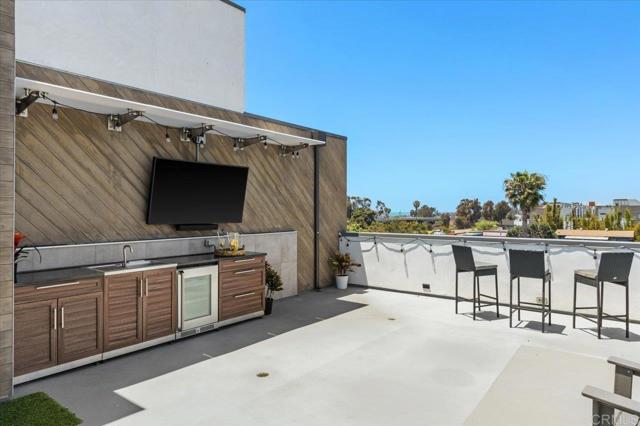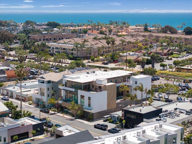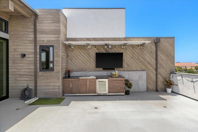Enjoy a peek of the Ocean from this single level condo, on the top floor. Living Room opens to a large Outside Private Patio, complete with wall mounted TV, and counter area with sink, frig, storage and more. Built in 2021, this third-floor stunner blends contemporary luxury with architectural character featuring exposed beams, soaring 12-foot ceilings, striking 9-foot African Mahogany doors, Fire Sprinkler System and large windows outfitted with remote-controlled shades. Herringbone white oak floors flow throughout the open-concept layout, creating an elegant yet relaxed coastal vibe. Step inside through your semi-private elevator entrance and discover a sanctuary where no expense has been spared. The European-style kitchen showcases a large island with an Insta Hot & Cold faucet, hidden refrigerator and freezer, commercial-grade dishwasher, and more. The island offers casual seating and ample counter space, while the adjacent laundry room adds convenience. Custom floating shelves line the hallway that leads to two spacious primary suites, each with its own luxurious bathroom. One of the bedroom closets is extra-long and may accommodate a hidden desk or additional storage. Open the wall of windows to seamlessly blend your great room with the outdoor patio an entertainer s dream complete with a TV, sink, refrigerator, and storage counter. From top-tier finishes to thoughtfully integrated smart features, every detail reflects timeless sophistication and modern convenience. The secured garage includes a private storage room, surfboard storage, and even a full bathroom with a shower. Two assigned parking spaces add ease to daily life though with everything just steps away, you may find yourself leaving the car behind. Located in the heart of Carlsbad Village, this residence places you moments from award-winning restaurants, charming cafs, boutique shopping, farmers markets, wine bars, and the sparkling Pacific Ocean. Whether starting your morning with a beachside stroll or ending your evening at a rooftop cocktail bar, everything you desire is within walking distance. Enjoy all the perks of a vibrant downtown lifestyle without sacrificing comfort or privacy. This exclusive residence offers a rare sense of seclusion within a secure, beautifully maintained building your private haven in the center of it all. Whether as a full-time residence or a weekend retreat, this is the ultimate staycation lifestyle.