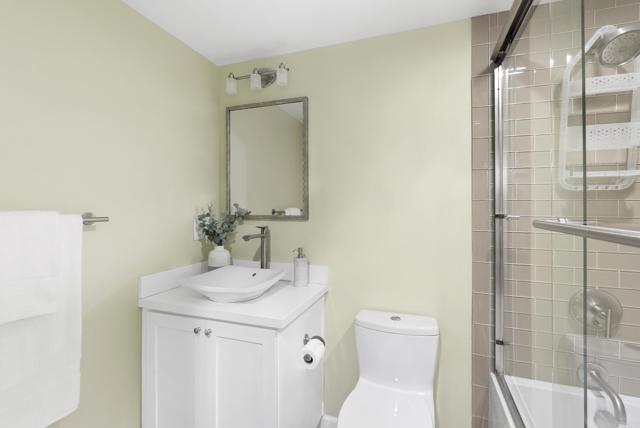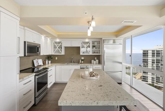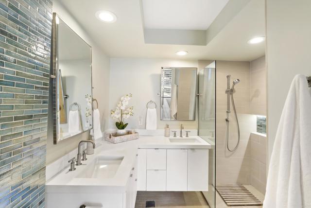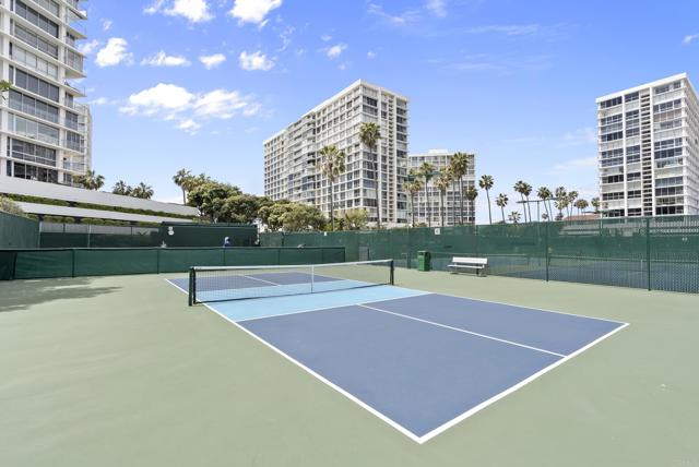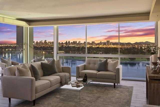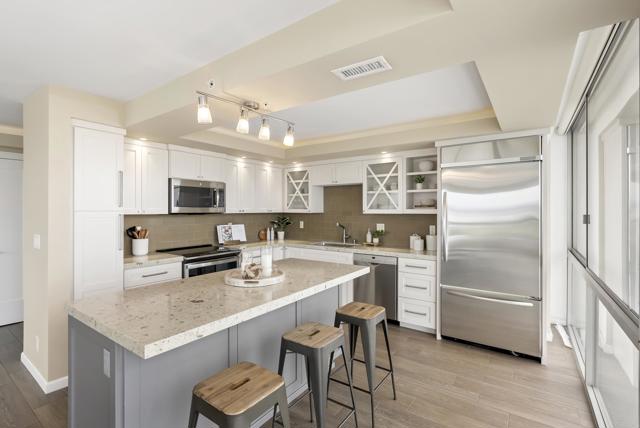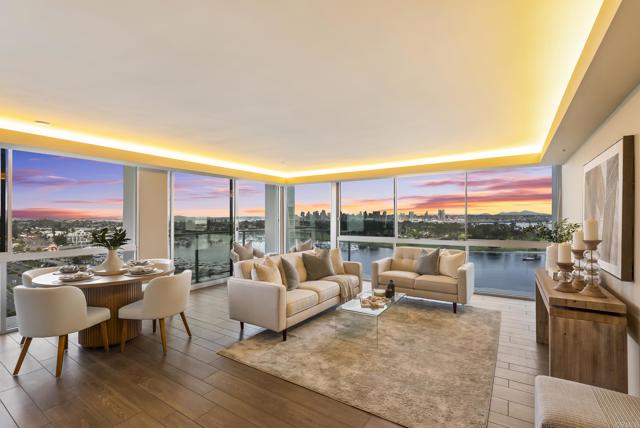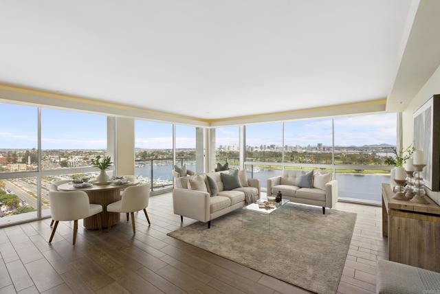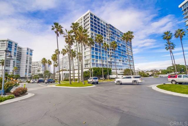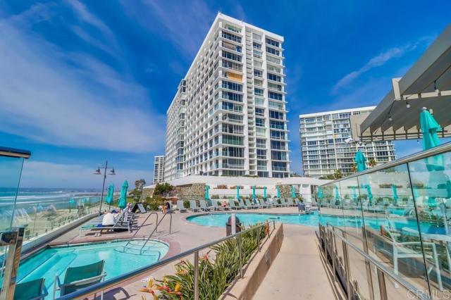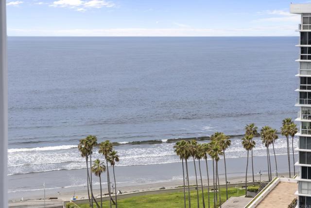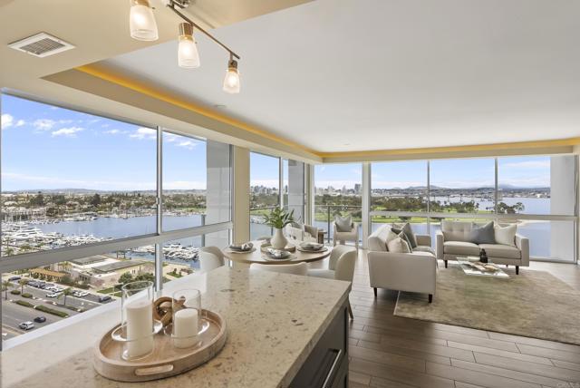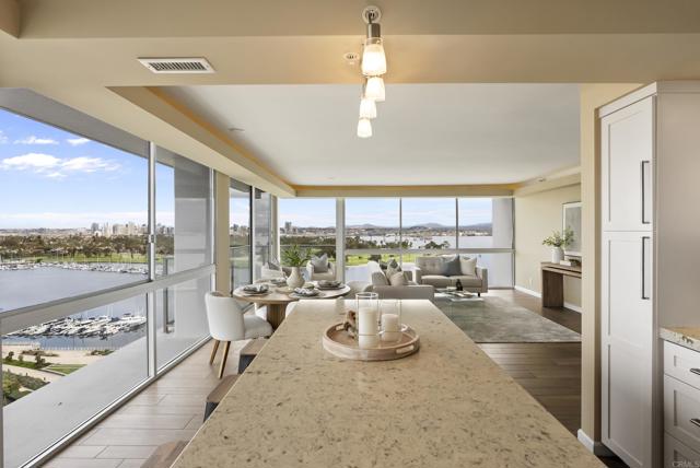A Generational Opportunity Certain to Inspire. Welcome to this stunning 15th-floor corner unit in the highly sought-after El Encanto tower at Coronado Shores. This beautifully appointed 2-bedroom, 2-bathroom condo offers 180 degree breathtaking northern OCEAN AND BAY VIEWS. Unit 1504 has been fully and thoughtfully renovated with classic and timeless elegance throughout. List of renovations available upon request. The gorgeous chef s kitchen combines elegant design with breathtaking views. Crisp white cabinetry complemented by a soft gray island base, creating a harmonious coastal palette. The kitchen features high-end stainless steel appliances, along with sleek quartz countertops that offer ample prep space. Glass-front upper cabinets and open shelving provide a touch of charm and display functionality. With bar seating at the oversized island and natural light pouring in from floor-to-ceiling windows, this kitchen is as inviting as it is functional perfect for entertaining while taking in the stunning coastal scenery. The living room features expansive floor-to-ceiling windows adorned with custom motorized roller shades, inviting in natural light while offering privacy at the touch of a button. The open-concept layout creates a seamless flexible flow between the living and dining areas perfect for entertaining or unwinding as you take in serene sunsets. Both bathrooms have been beautifully remodeled, with the primary bath exuding spa-like sophistication. A soothing neutral palette, clean lines, and white cabinetry set a refined tone, complemented by expansive mirrored vanities. The luxurious walk-in shower is appointed with oversized tile, a frameless glass enclosure, and a stunning ribbon of ocean-hued mosaic tile that infuses coastal charm with contemporary elegance. Dual vanities and generous counter space ensure the space is as practical as it is stylish. Additional conveniences include a stackable washer and dryer within the unit, as well as TWO side-by-side covered PARKING SPACES. Residents enjoy resort-style amenities including 24-hour security, oceanfront pools, tennis courts, a fitness center, and direct beach access offering the ultimate Coronado lifestyle.