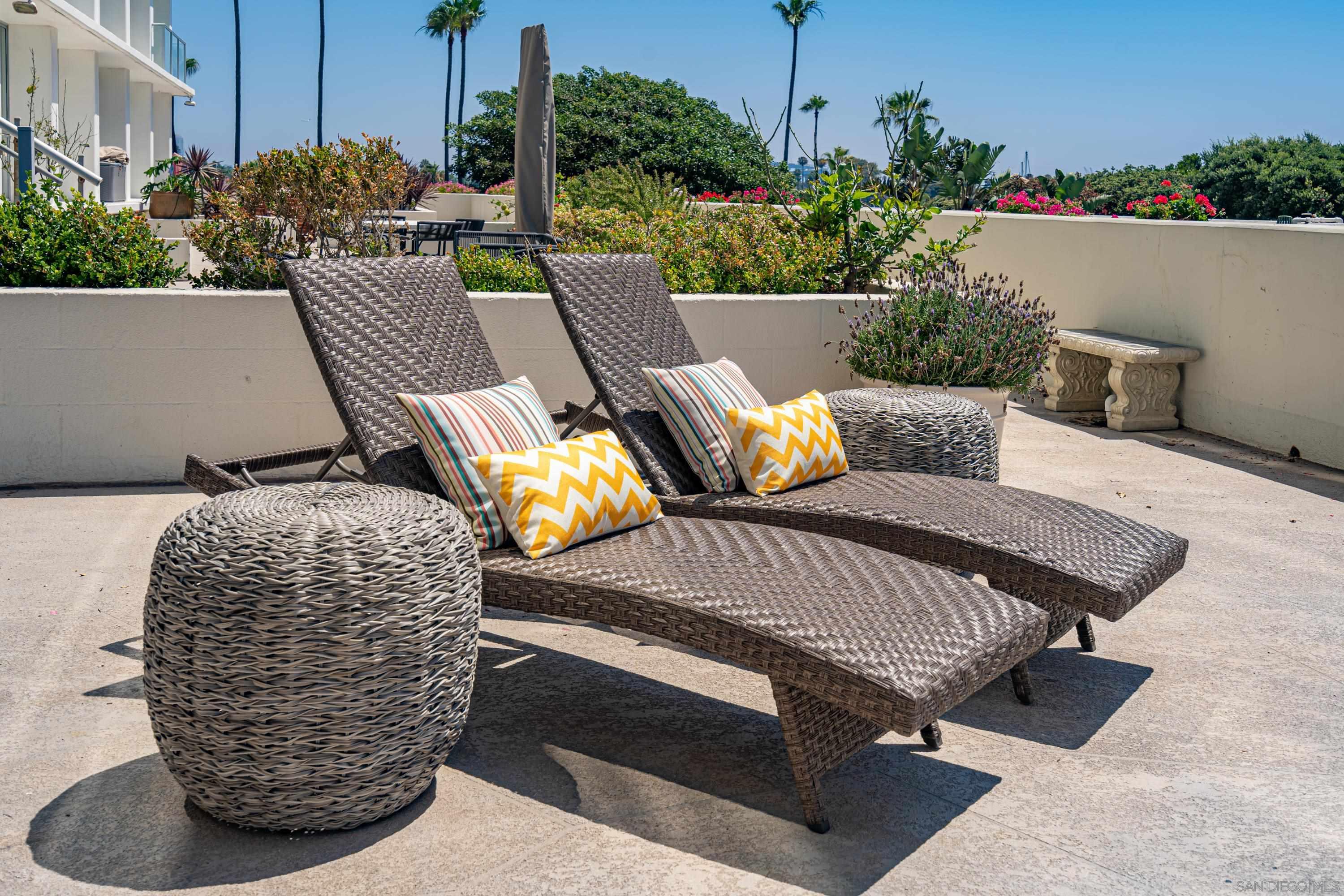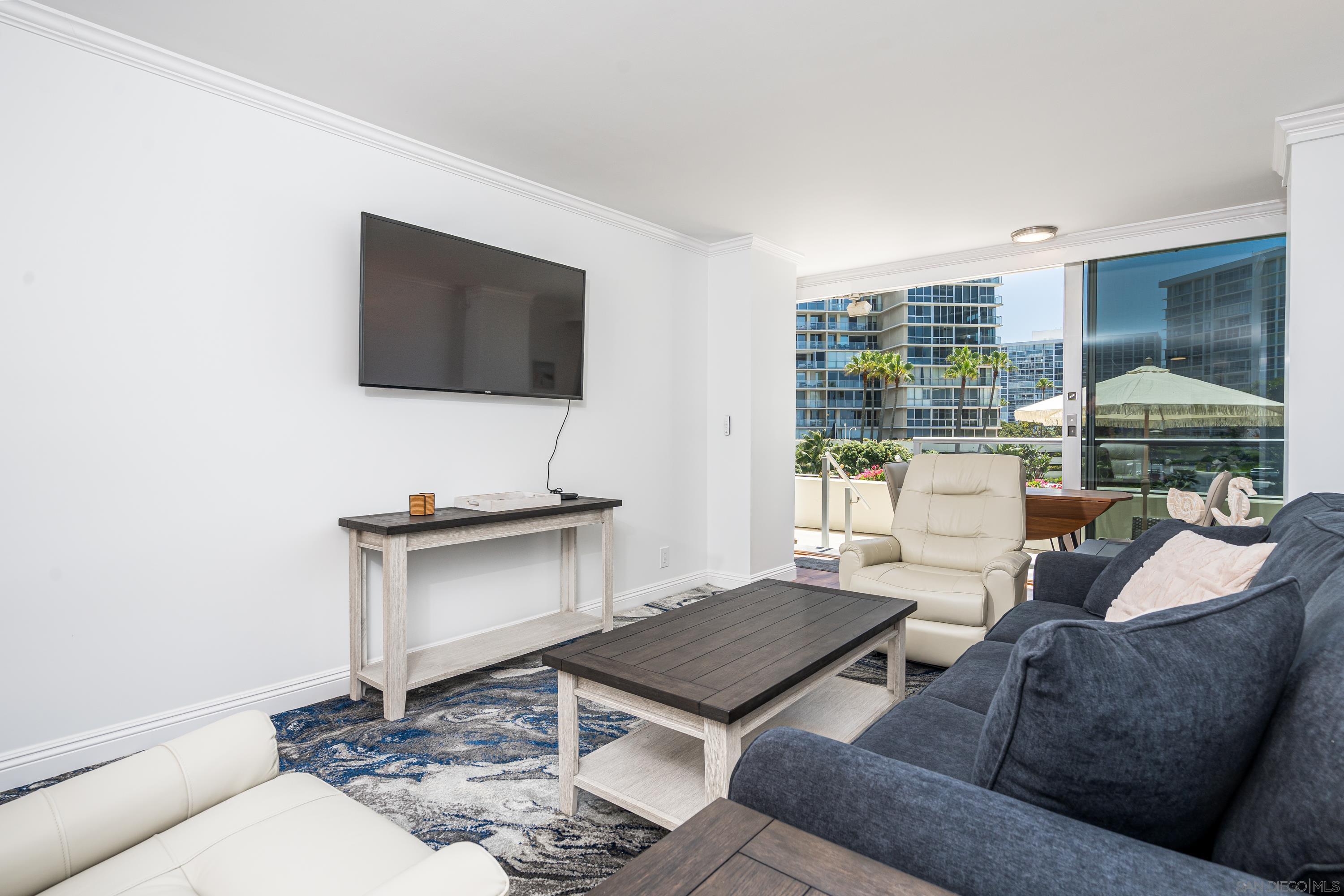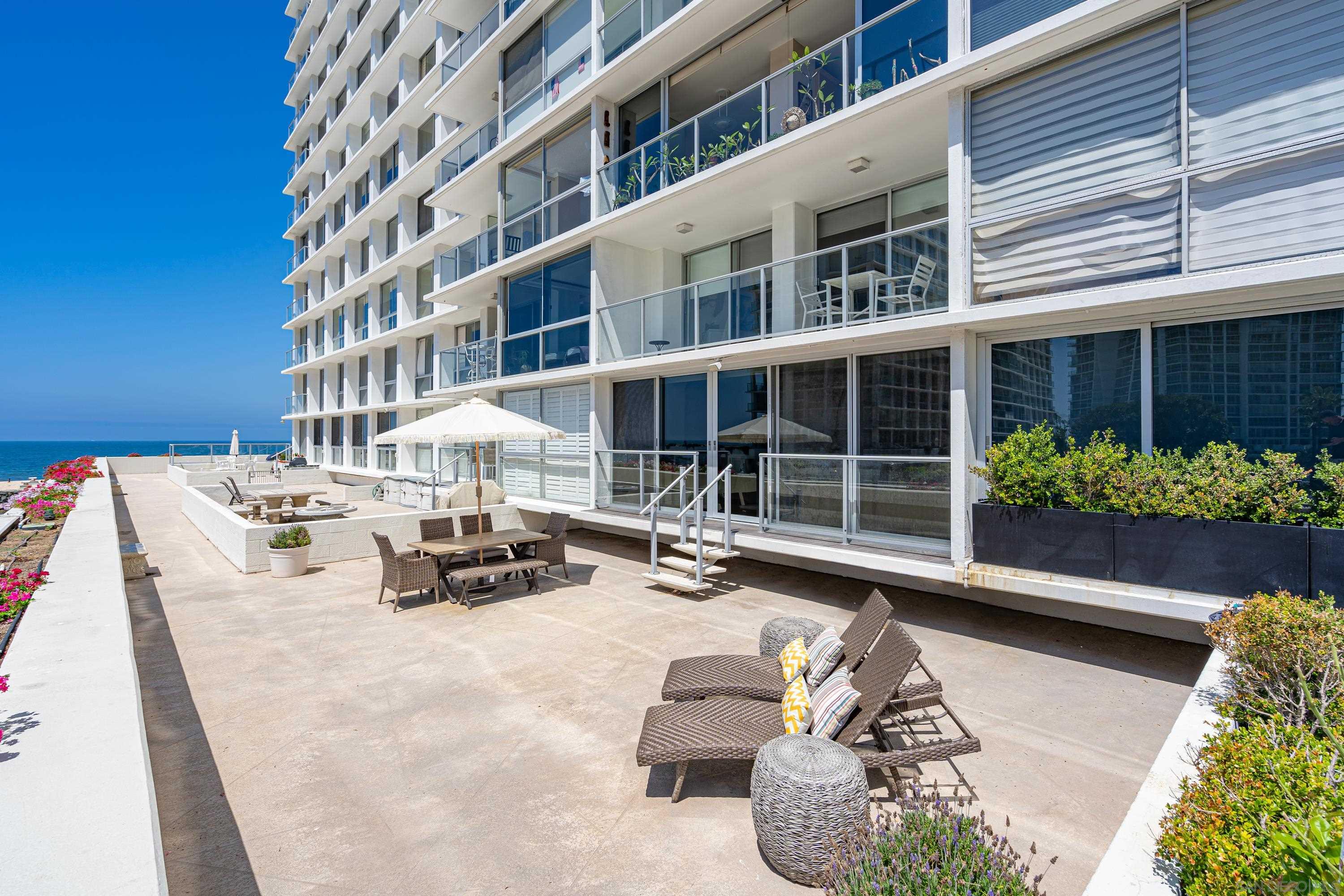 Lovely newly remodeled 1 bedroom, 1 bath terrace unit with ocean views at the luxurious Coronado Shores. The exclusive use terrace has bay/ocean views, patio dining table/chairs and 2 chaise lounges for relaxing. The living room has comfy queen sofa sleeper, bedroom has king size bed, all new doors, flooring and lighting. Quartz kitchen countertops, new stainless steel appliances. Enjoy ocean breezes on the terrace while dining or relaxing! Includes one covered garage parking space. Coronado Shores offers many amenities including 4 pools, lighted tennis courts, beach club, gym and security.Interested in this Listing?