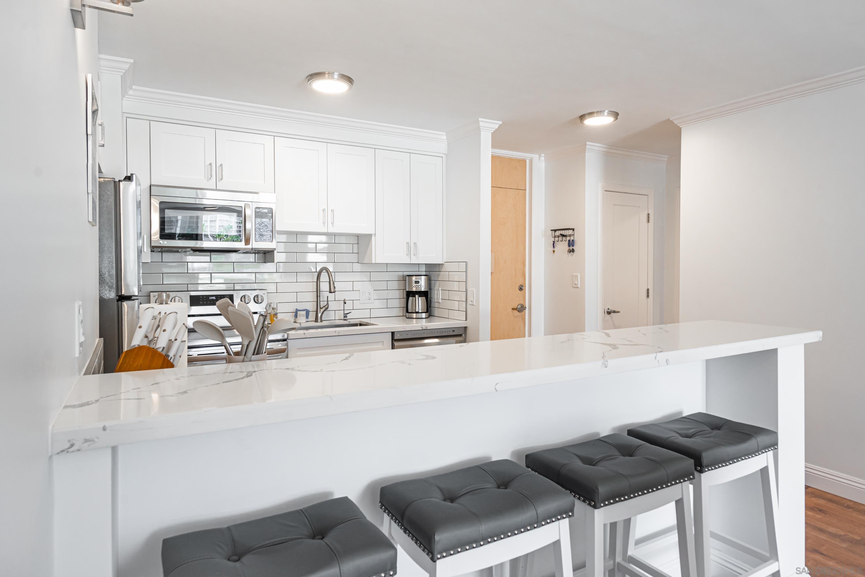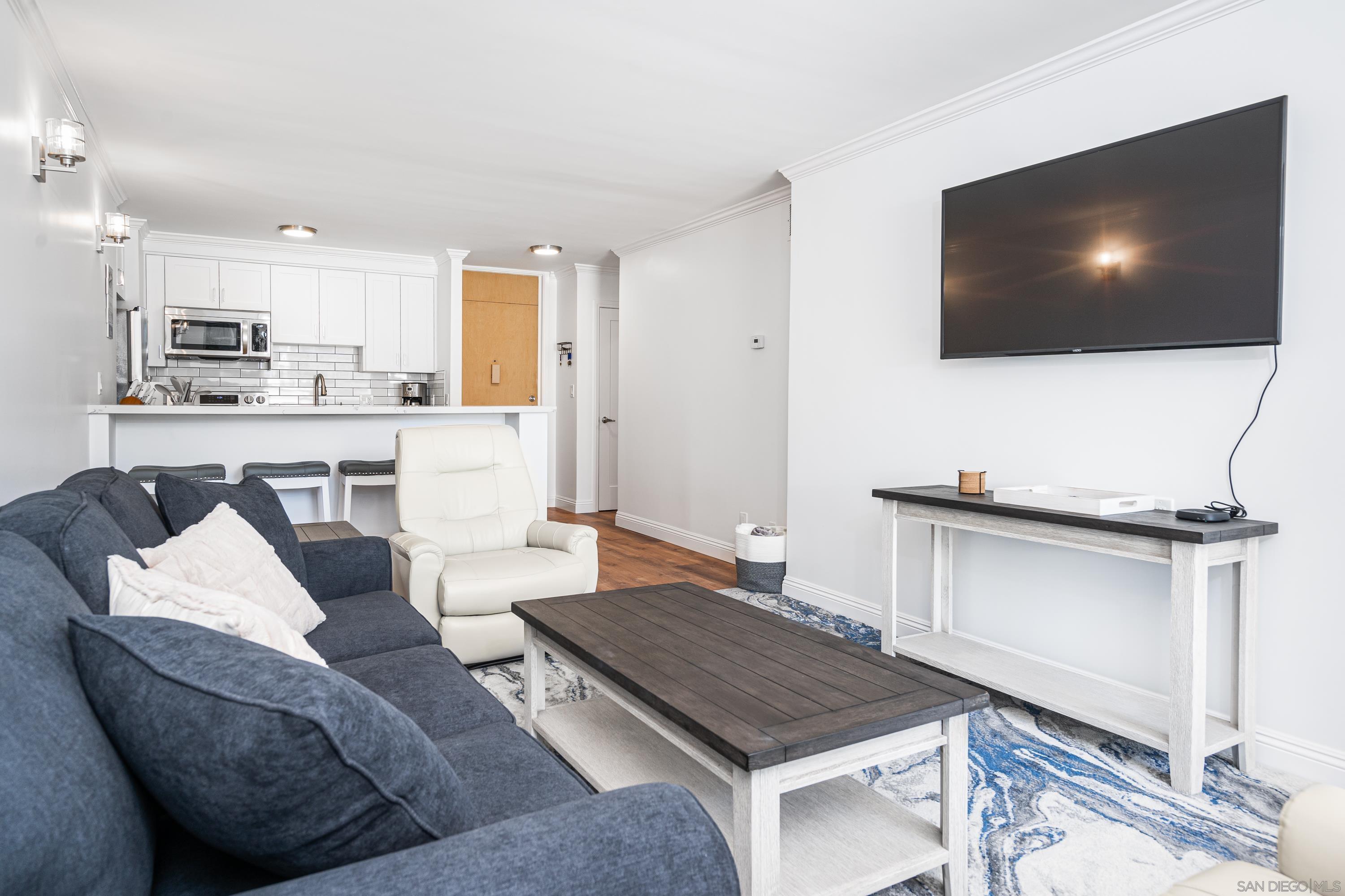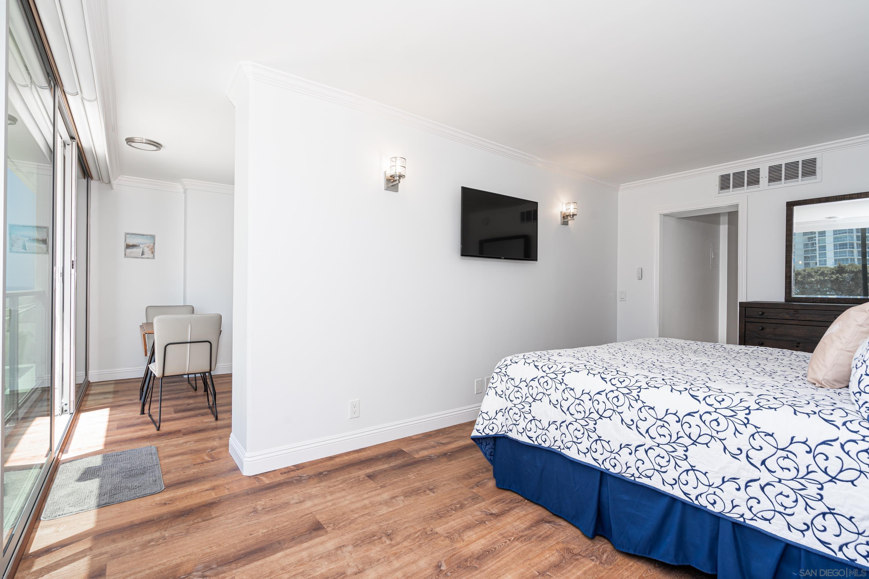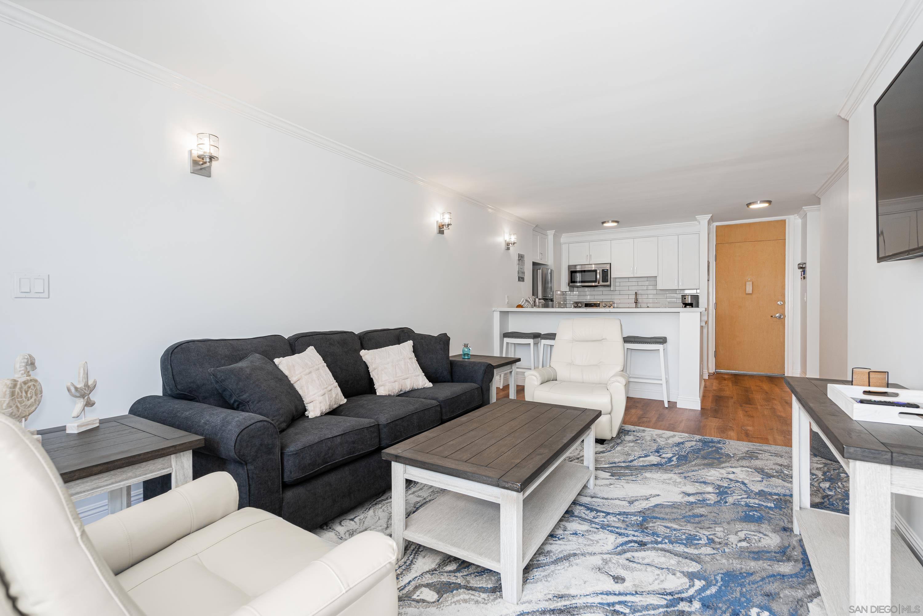 Lovely newly remodeled 1 bedroom, 1 bath terrace unit with ocean views at the luxurious Coronado Shores. The exclusive use terrace has bay/ocean views, patio dining table/chairs and 2 chaise lounges for relaxing. The living room has comfy queen sofa sleeper, bedroom has king size bed, all new doors, flooring and lighting. Quartz kitchen countertops, new stainless steel appliances. Enjoy ocean breezes on the terrace while dining or relaxing! Includes one covered garage parking space. Coronado Shores offers many amenities including 4 pools, lighted tennis courts, beach club, gym and security.Interested in this Listing?