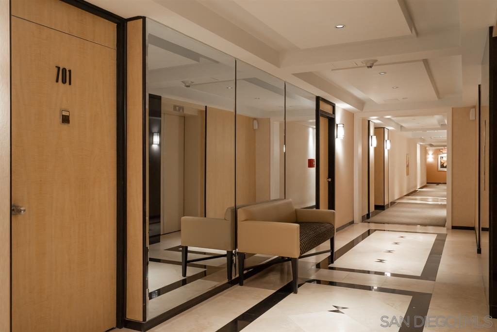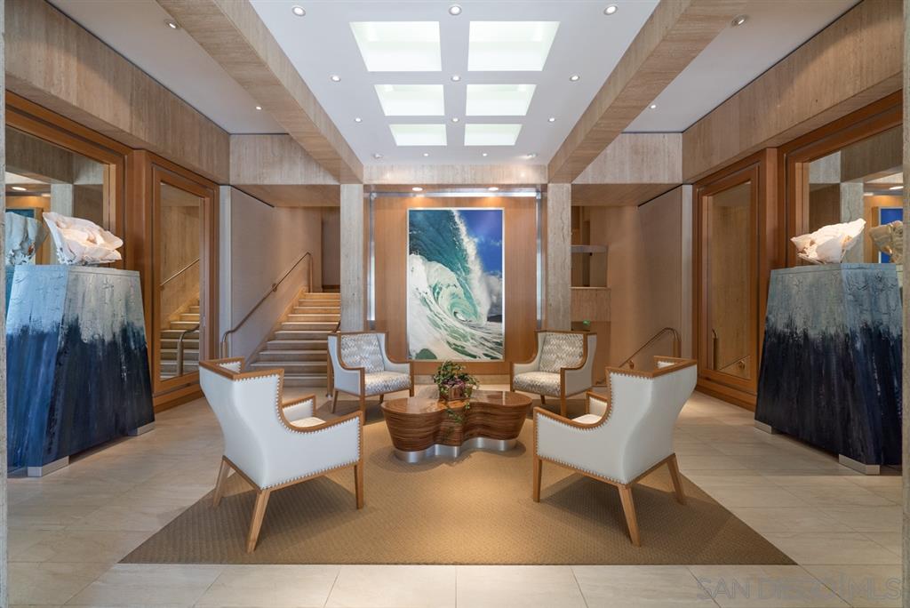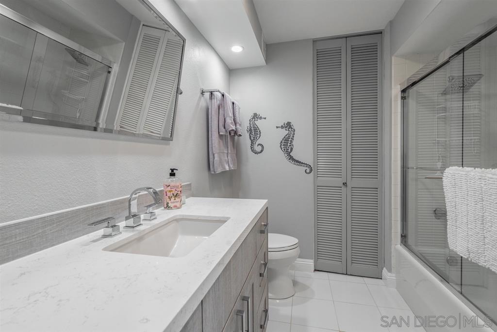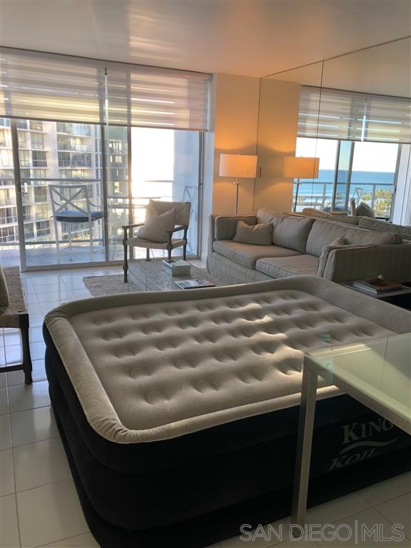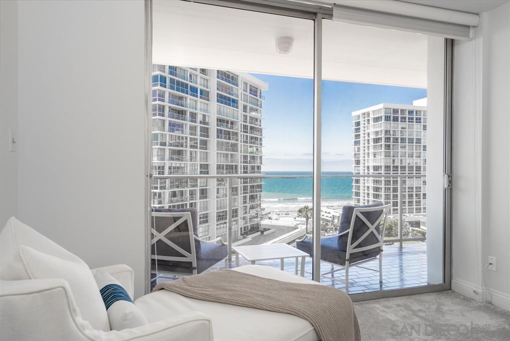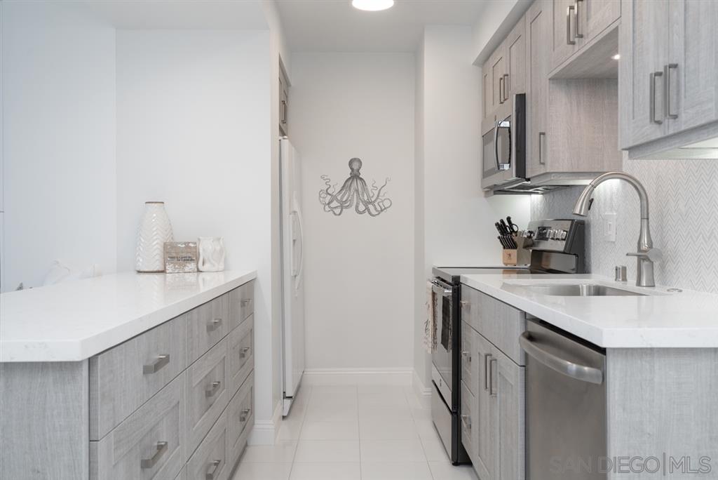 Come to our Beach Retreat and enjoy the sounds and sights of the sea at Coronado Shores. The living room offers muted greys, sand and whites much like driftwood. Get comfortable on the couch watching TV (55") and enjoying the ocean view at the same time. One living room wall is mirrored to offer a more expansive view of the beach. White tile floors are in the living room and adjacent kitchen to offset the new herringbone tile backsplash, washed grey oak cabinets and quartz countertop. Long Term too!