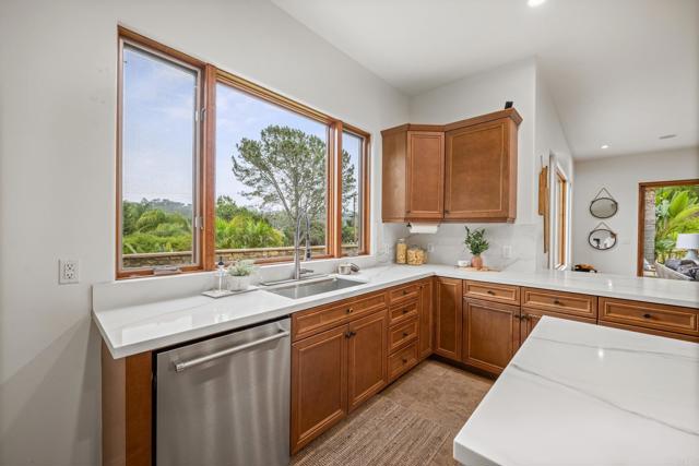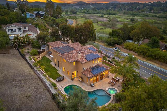 From the moment you arrive at this custom West Olivenhain estate perched above the San Elijo River Valley you ll feel the presence and charm of a truly special home. An extended paver driveway and lush tropical landscaping set the tone, blending the relaxed vibe of coastal Encinitas with refined European aesthetics. This home was designed for both luxurious living and effortless entertaining. A grand solid wood and iron front door welcomes you into the expansive interior, where natural light pours in through wood-cased windows and soaring ceilings highlight the custom craftsmanship throughout. The open floor plan offers both connection and space, ideal for families or multi-generational living. The front living room features a reimagined fireplace clad in El Dorado White Elm stone, setting a warm and elegant tone. Continue through the formal dining area and into the heart of the home a stunning great room that flows seamlessly outdoors through multiple sets of doors, creating a true indoor/outdoor entertainer s dream. The remodeled kitchen anchors the space with stainless steel appliances, a gas range with statement hood, custom cabinetry, Oppulence Quartz countertops, a walk-in pantry, and a cozy breakfast nook. The adjoining family room, complete with a second fireplace, offers views of the lush backyard oasis. Step outside and be transported to your favorite tropical destination. The resort-style yard features a saltwater Pebble Tec pool and spa, a custom stone fireplace, built-in BBQ island, terraced tropical gardens, and paver walkways all illuminated by upgraded solar-powered landscape lighting. With owned solar for the home and pool, energy efficiency meets luxury. Upstairs, the spacious primary suite feels like a personal retreat, featuring custom wood shutters, wood-cased windows, a private balcony overlooking the preserve, an oversized walk-in closet, and a spa-style bath with dual sinks and a steam shower. Additional upstairs highlights include a junior suite, two secondary bedrooms with a shared bath, and a large fifth en-suite bedroom with a private entrance perfect for a guest suite, ADU, office, or studio. Additional features include a three-car garage with custom wood doors, epoxy flooring, and built-in cabinetry, as well as storage sheds, a tile roof, solid wood interior doors, 3-zone AC, and more. This is an exceptional opportunity to own a one-of-a-kind luxury home in one of Encinitas most sought-after communities.Interested in this Listing?